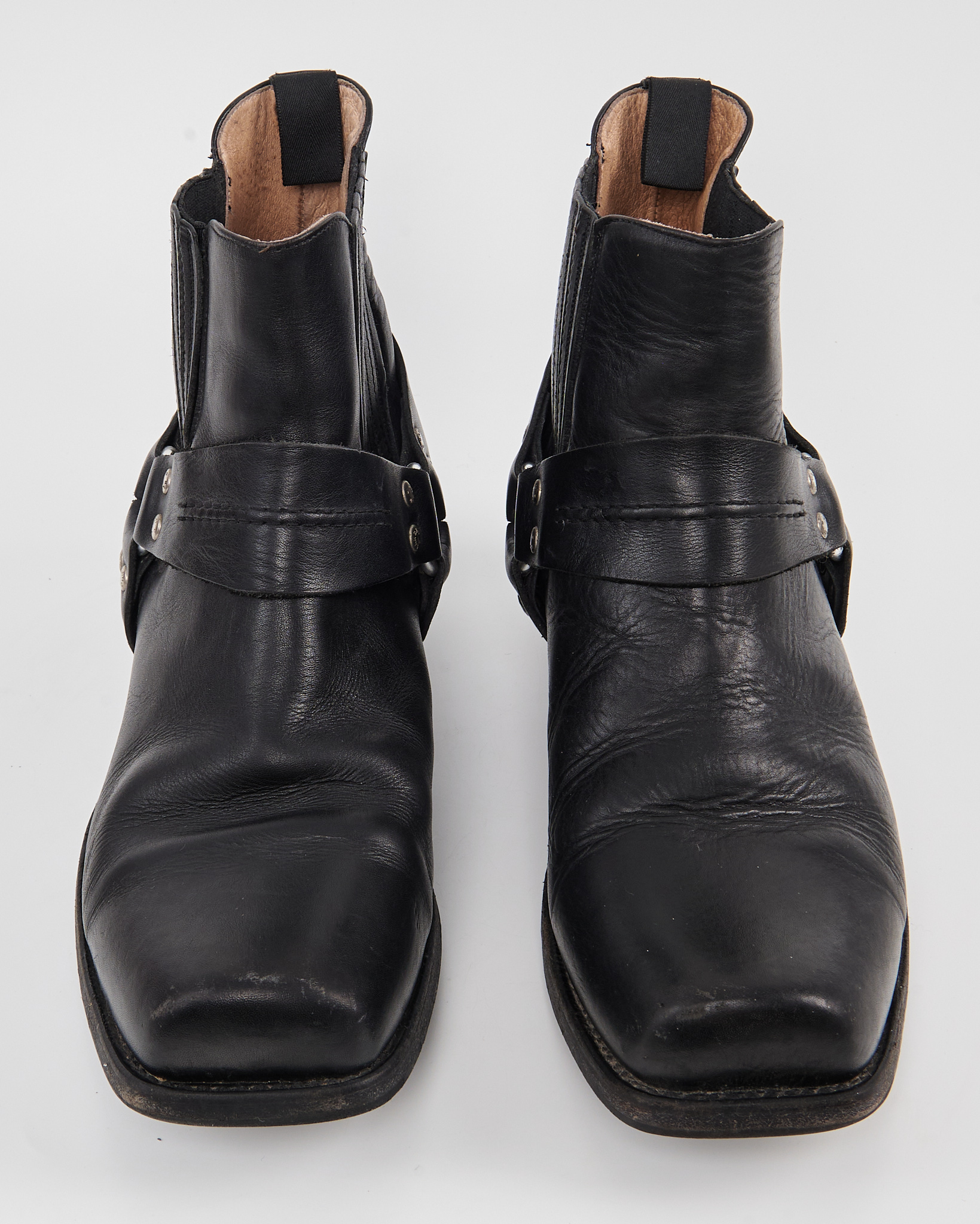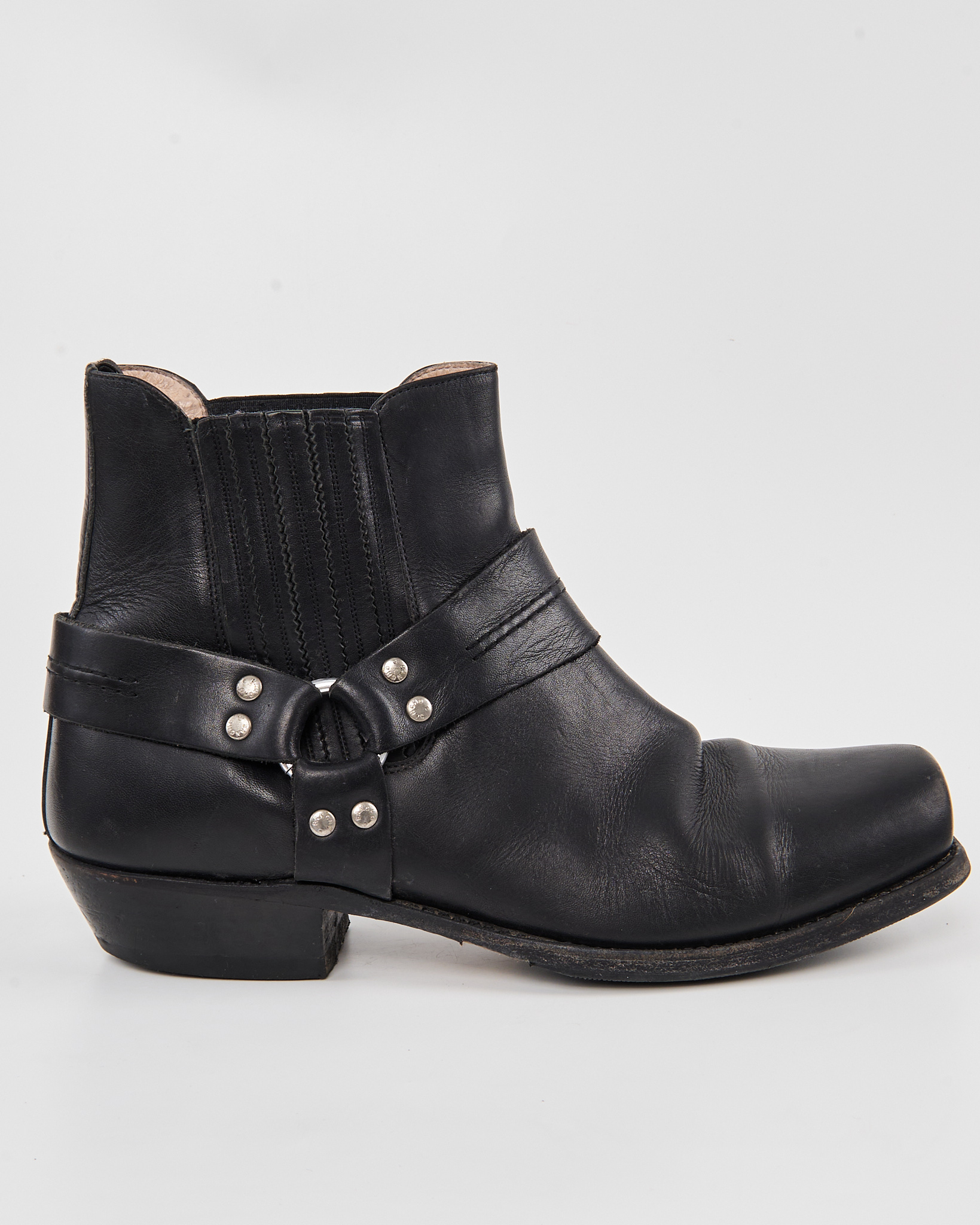Кожаные казаки Sancho с характерной патиной. Посадка уверенная за счёт устойчивого каблука и эластичных вставок по бокам. Декоративная портупея с металлическими заклёпками.