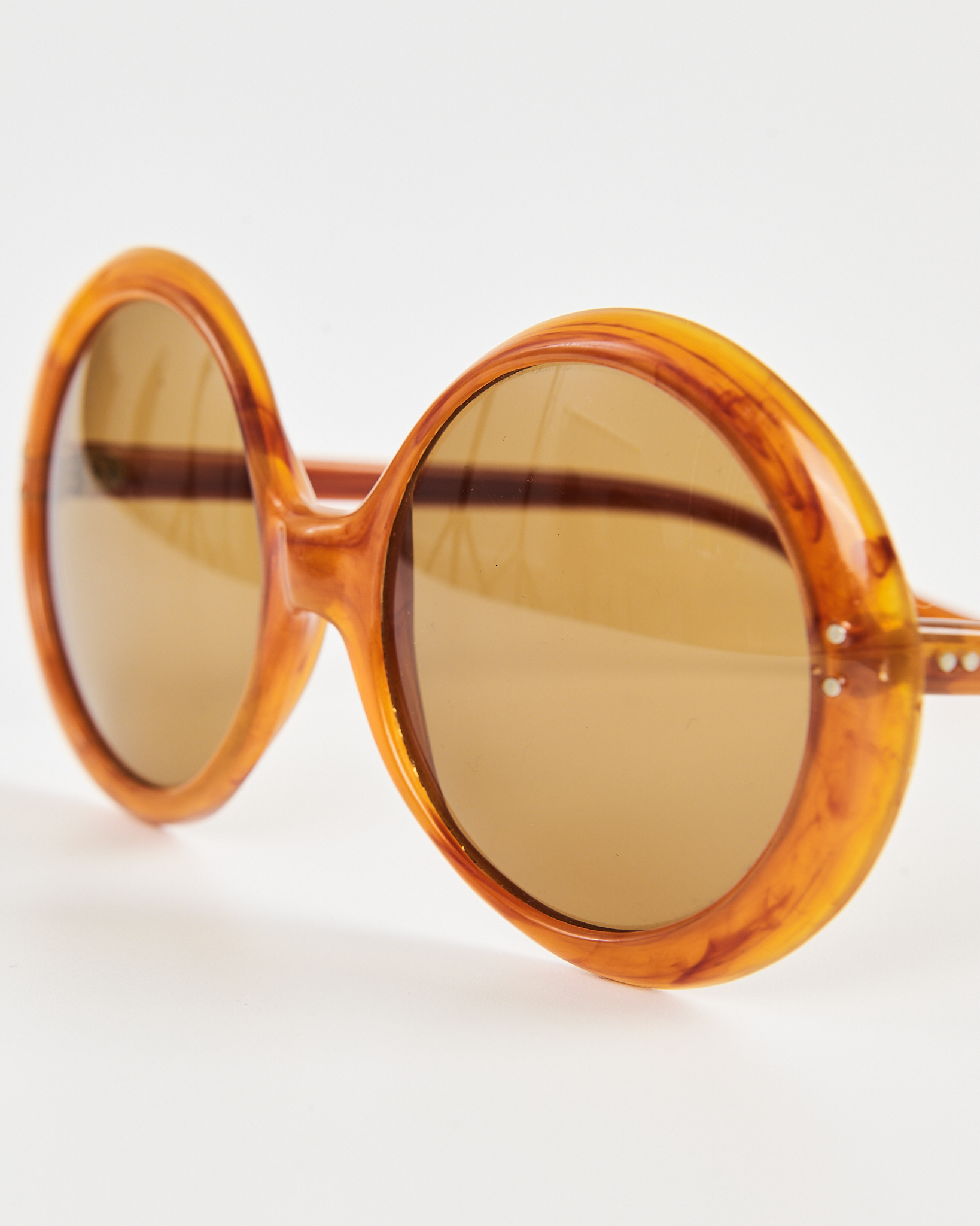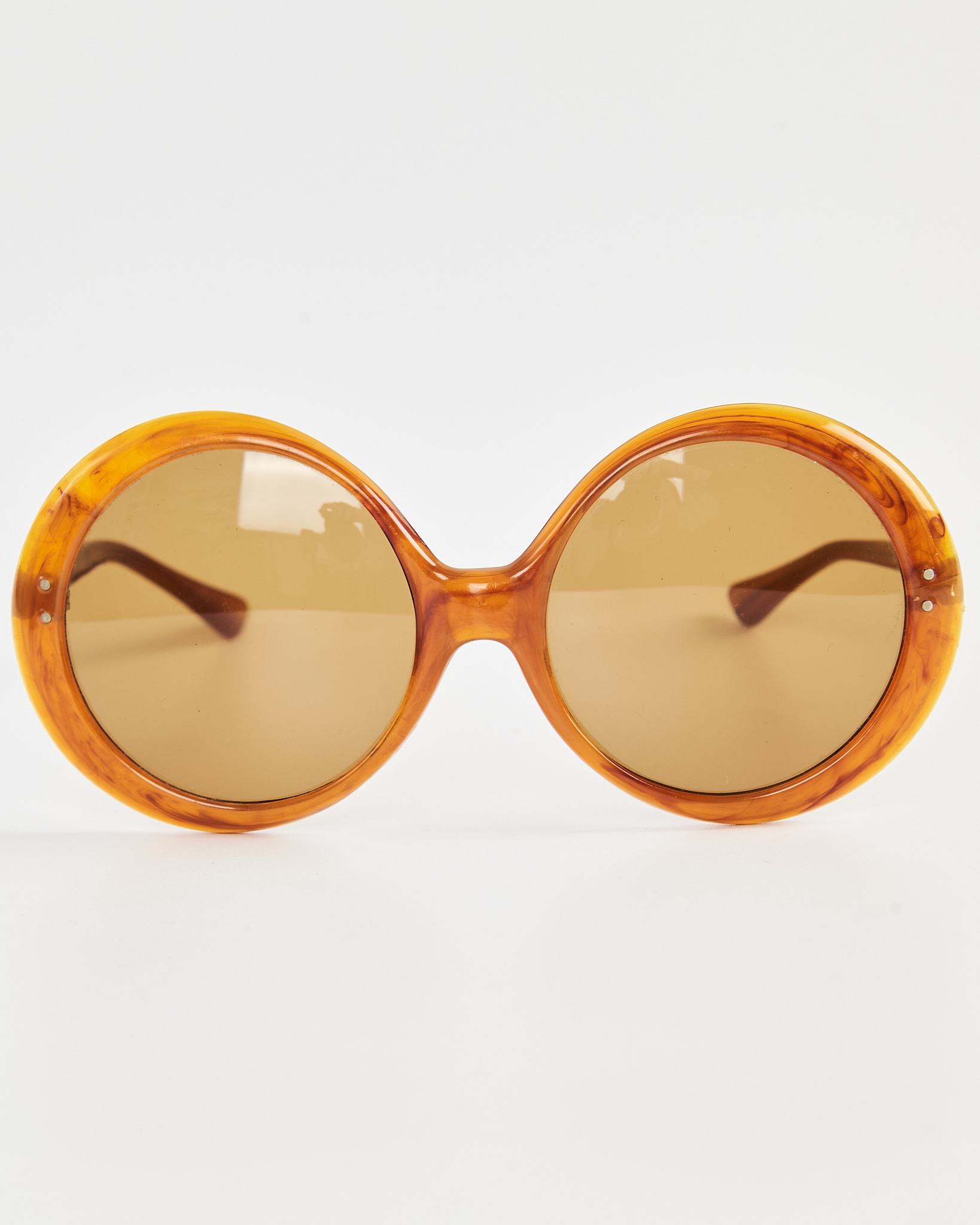 Очки с крупной круглой оправой  янтарного оттенка.  Посадка комфортная, оправа комфортно фиксируется и не давит. Тонированные линзы мягко приглушают свет.