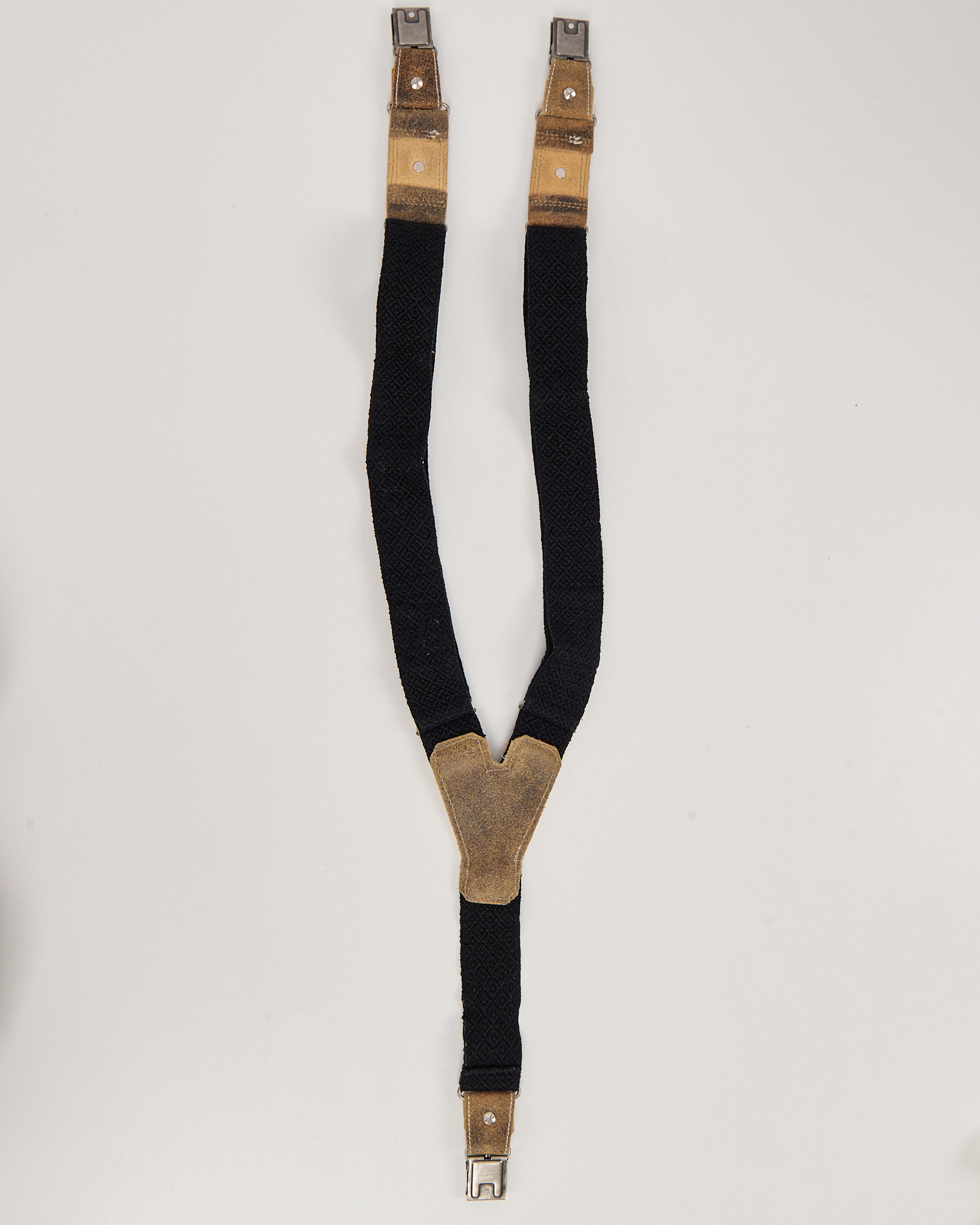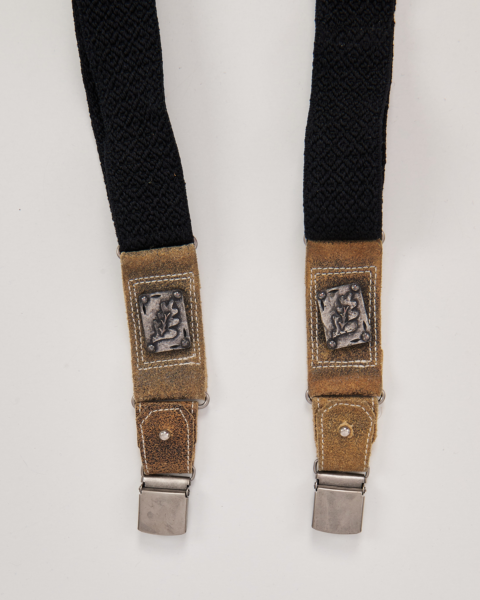 Выполнены из плотной эластичной тесьмы с кожаными вставками. Материал приятен на ощупь, держит форму. Посадка регулируется по длине. Металлические клипсы, декоративные накладки с рельефным мотивом.