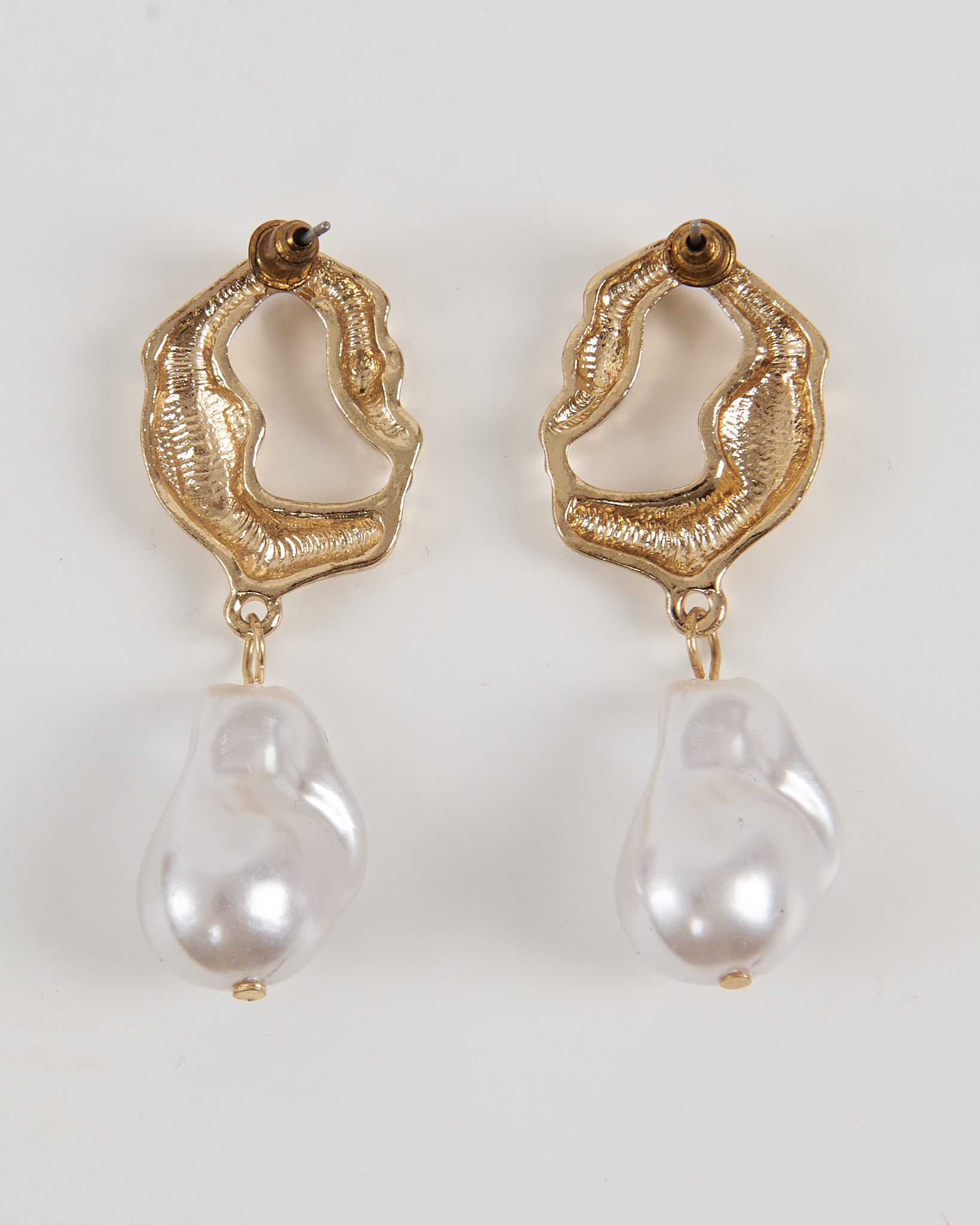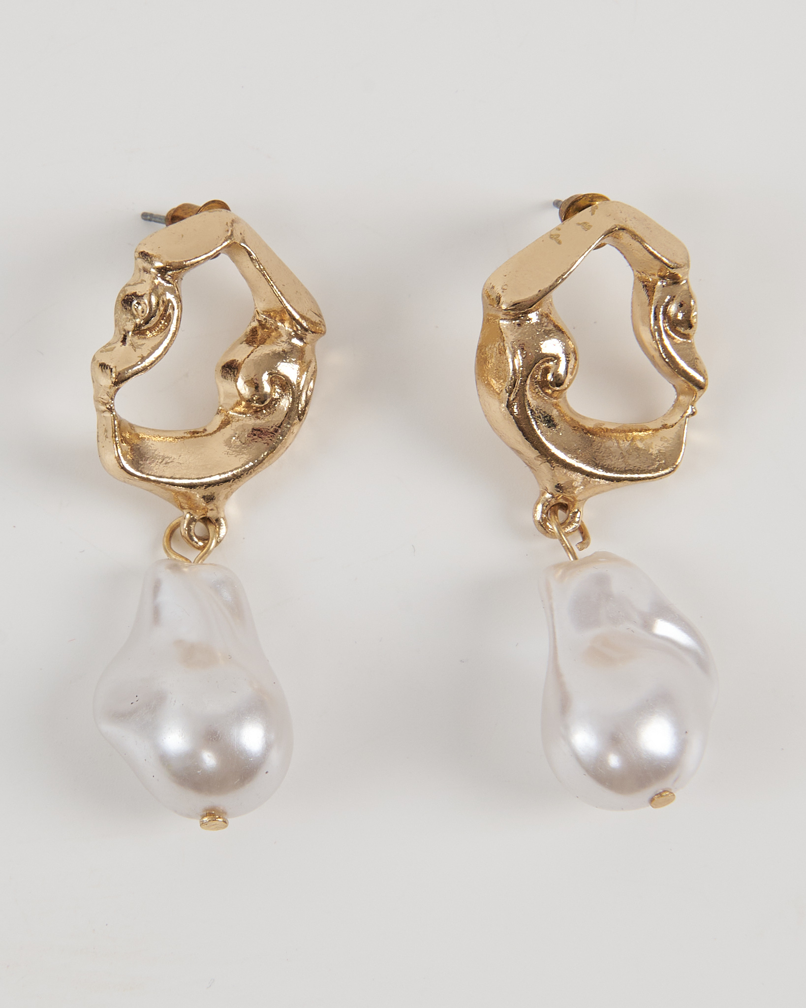 Серьги золотистого оттенка с подвесами в форме барочной жемчужины. Форма основания с плавными изгибами, удобная застежка.