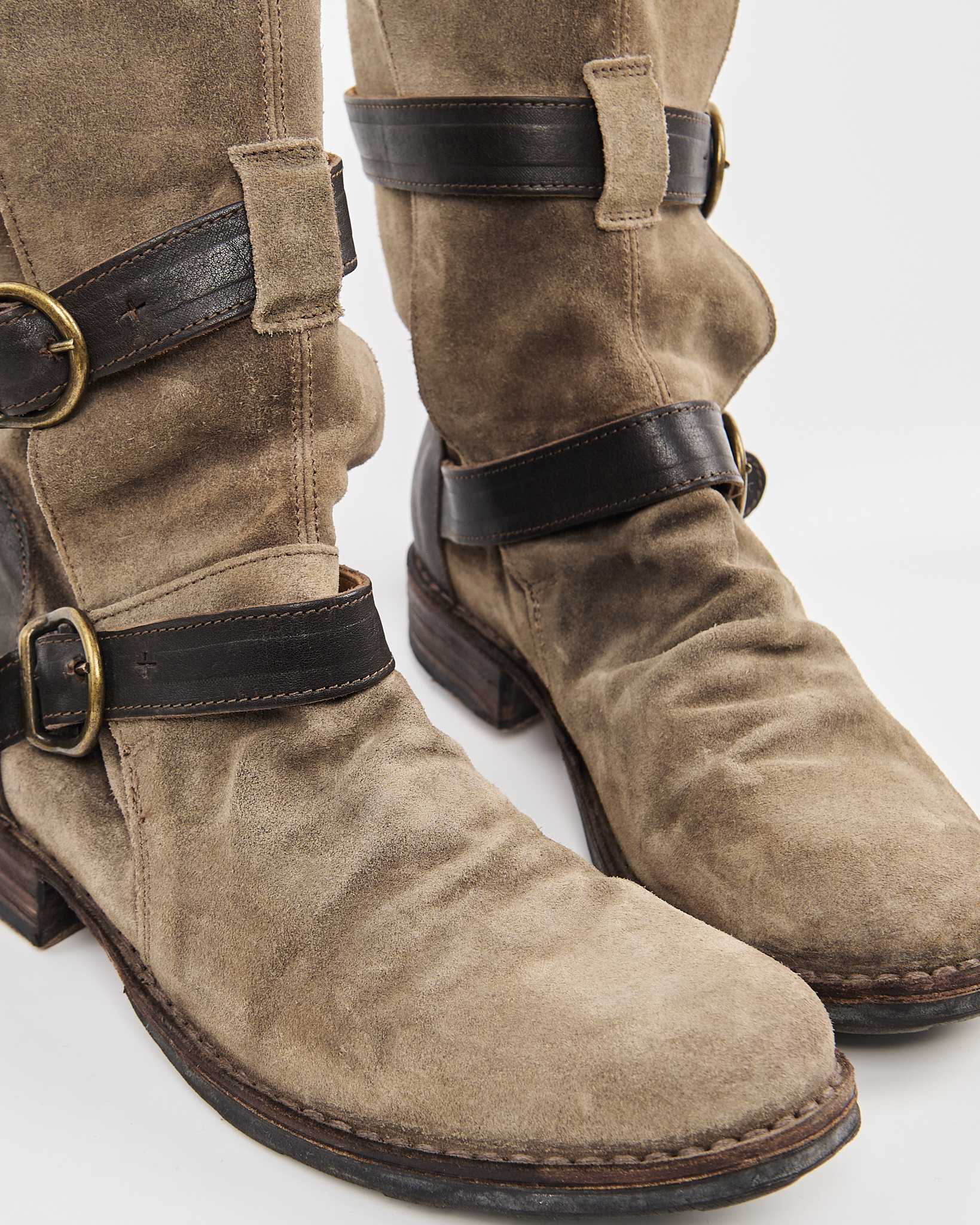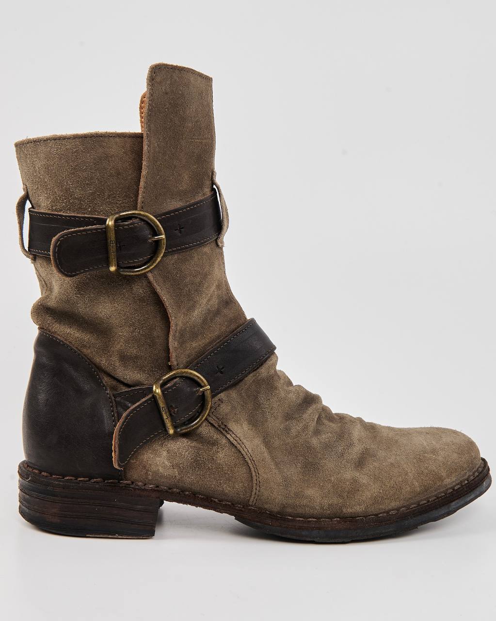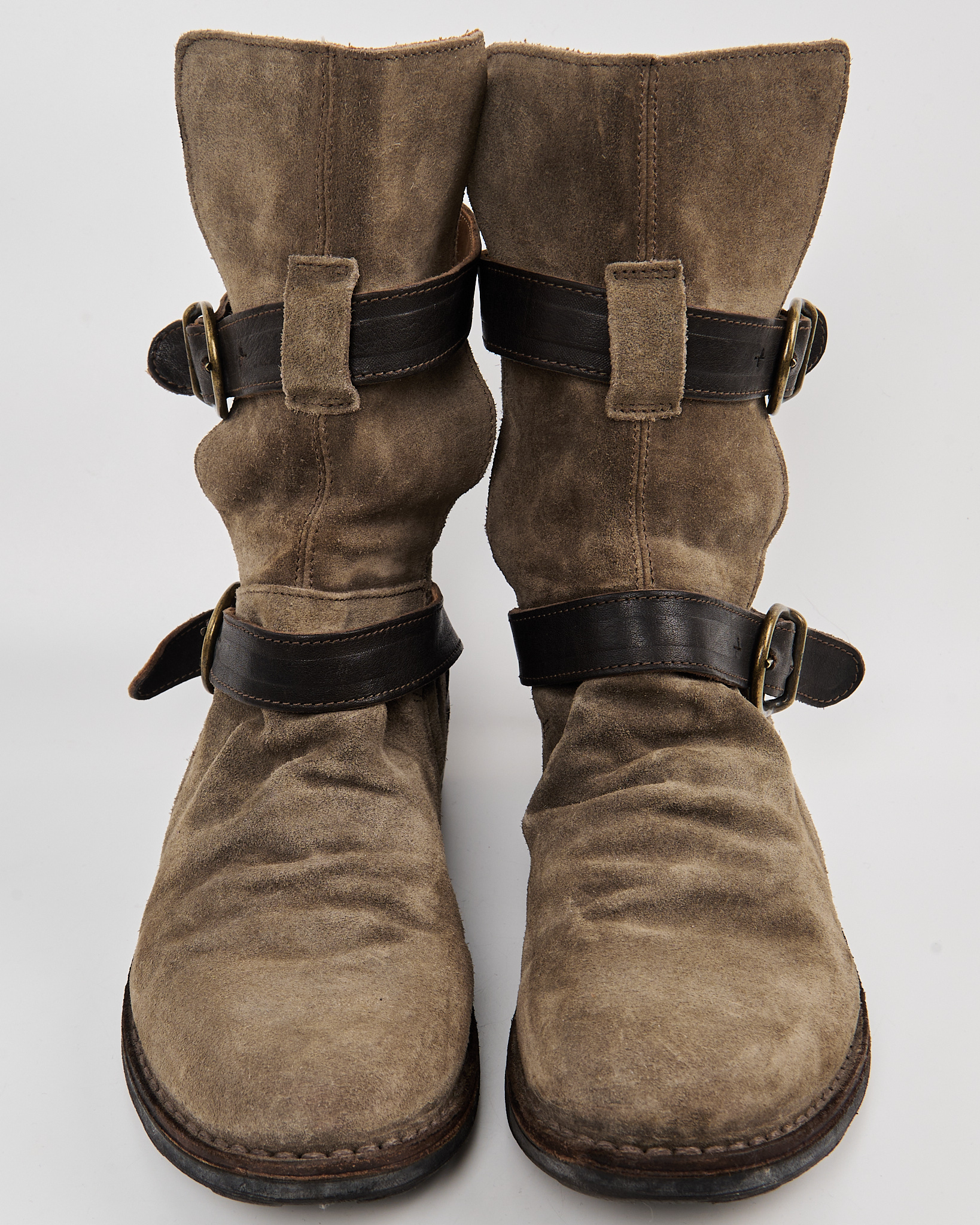 Замшевые байкерские ботинки с ремнями. Плотная натуральная замша глубокого песочного оттенка. Устойчивый каблук и комфортная высота голенища, фиксируется ремнями с массивными пряжками. Контрастные кожаные вставки и металлическая фурнитура.