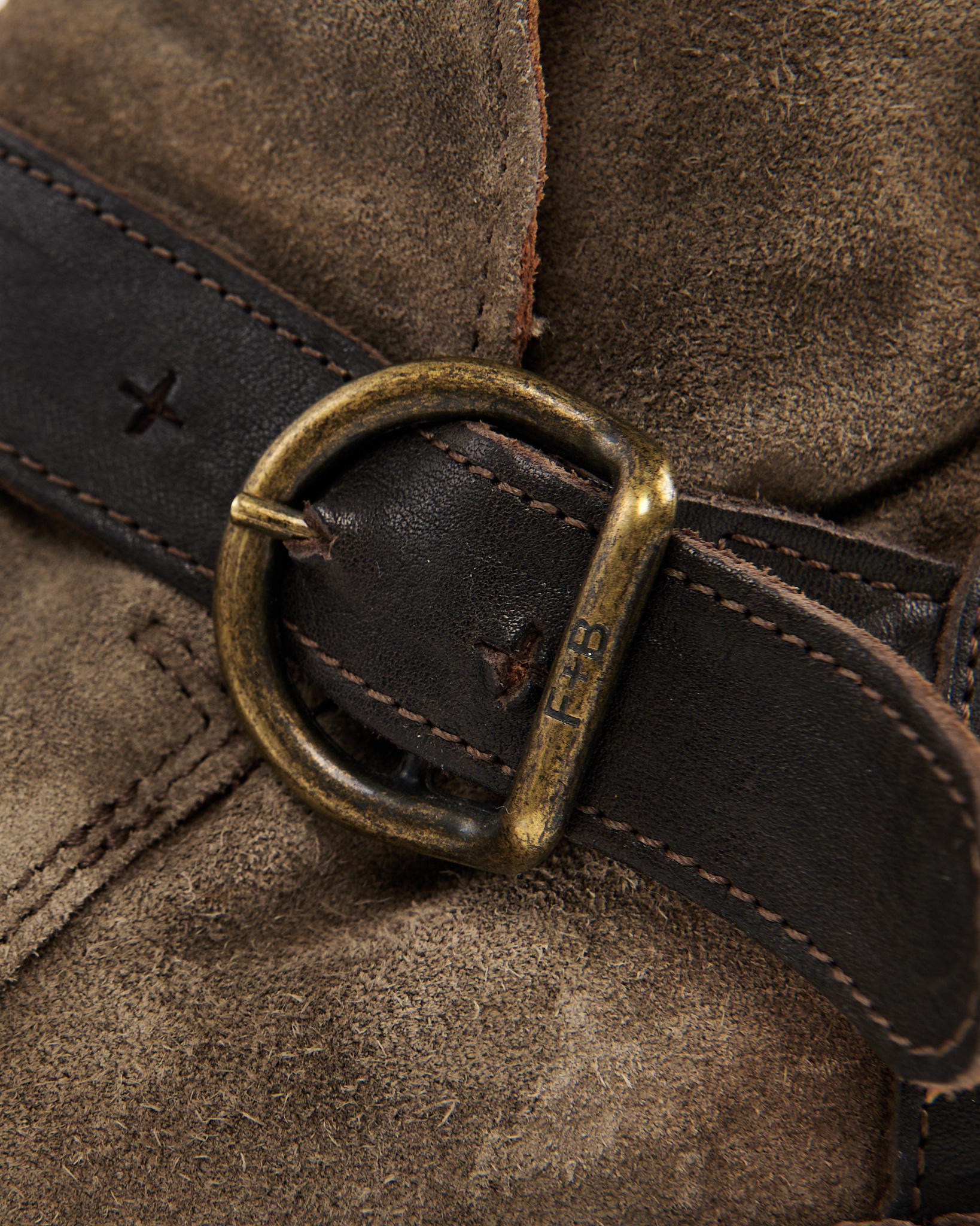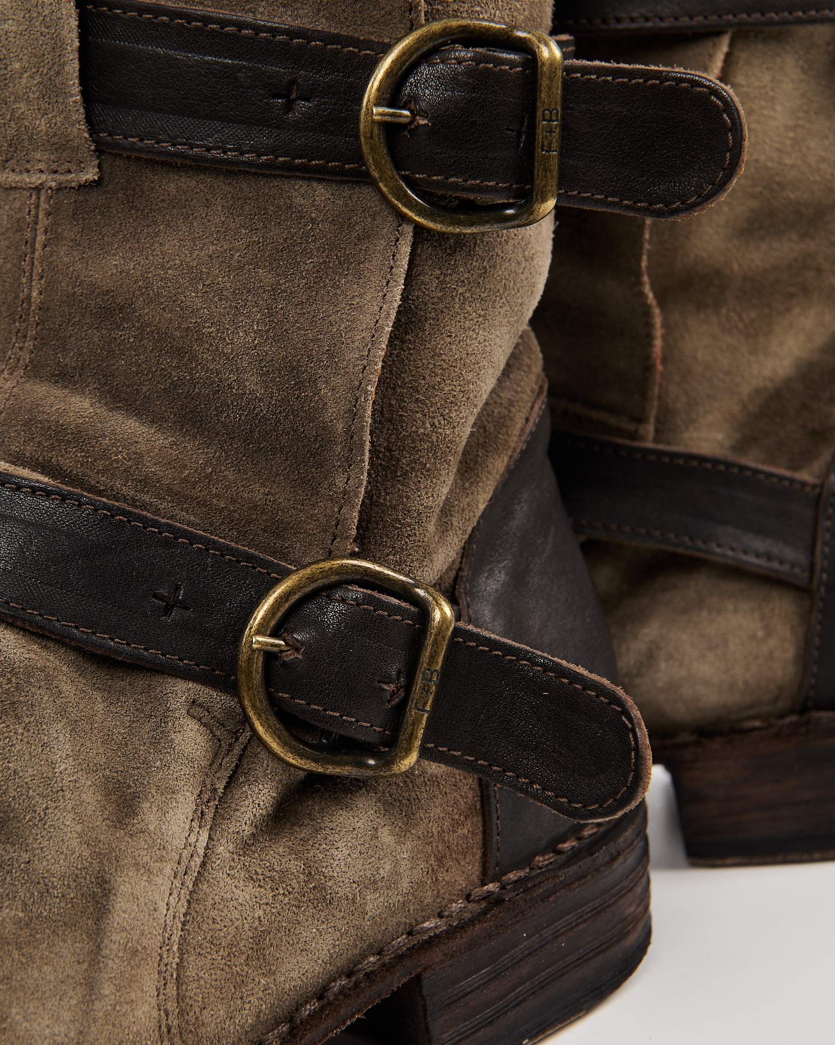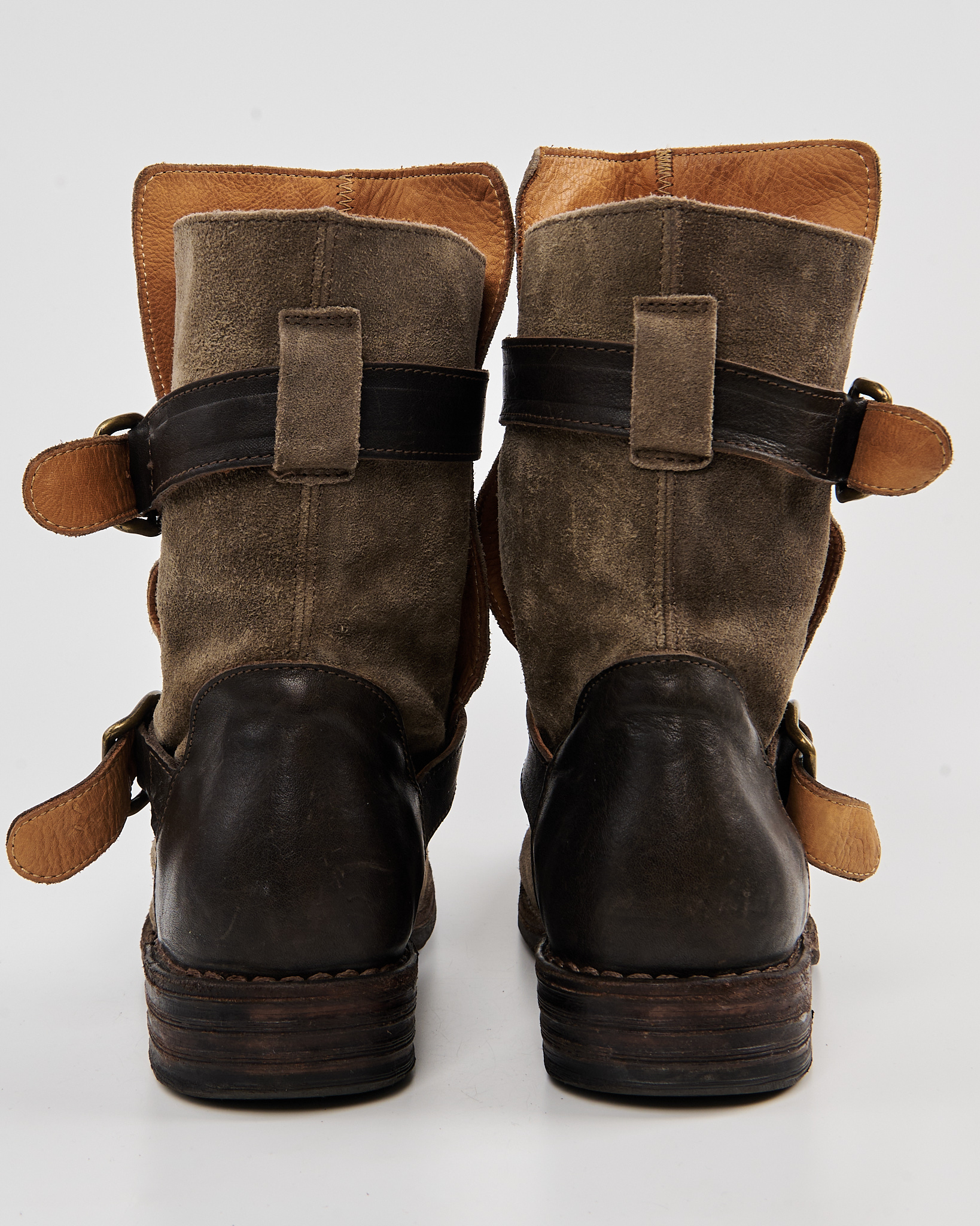 Замшевые байкерские ботинки с ремнями. Плотная натуральная замша глубокого песочного оттенка. Устойчивый каблук и комфортная высота голенища, фиксируется ремнями с массивными пряжками. Контрастные кожаные вставки и металлическая фурнитура.
