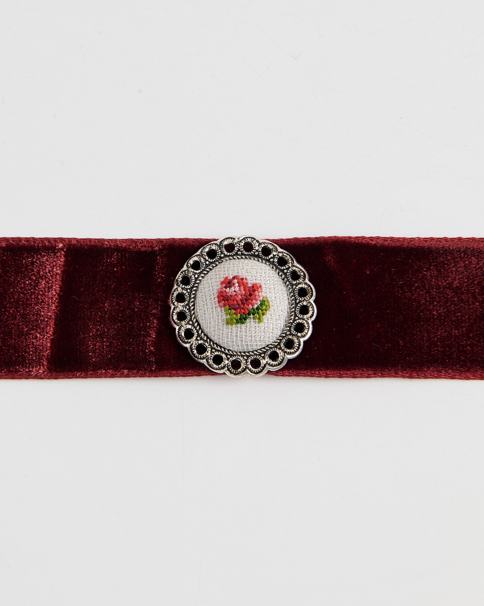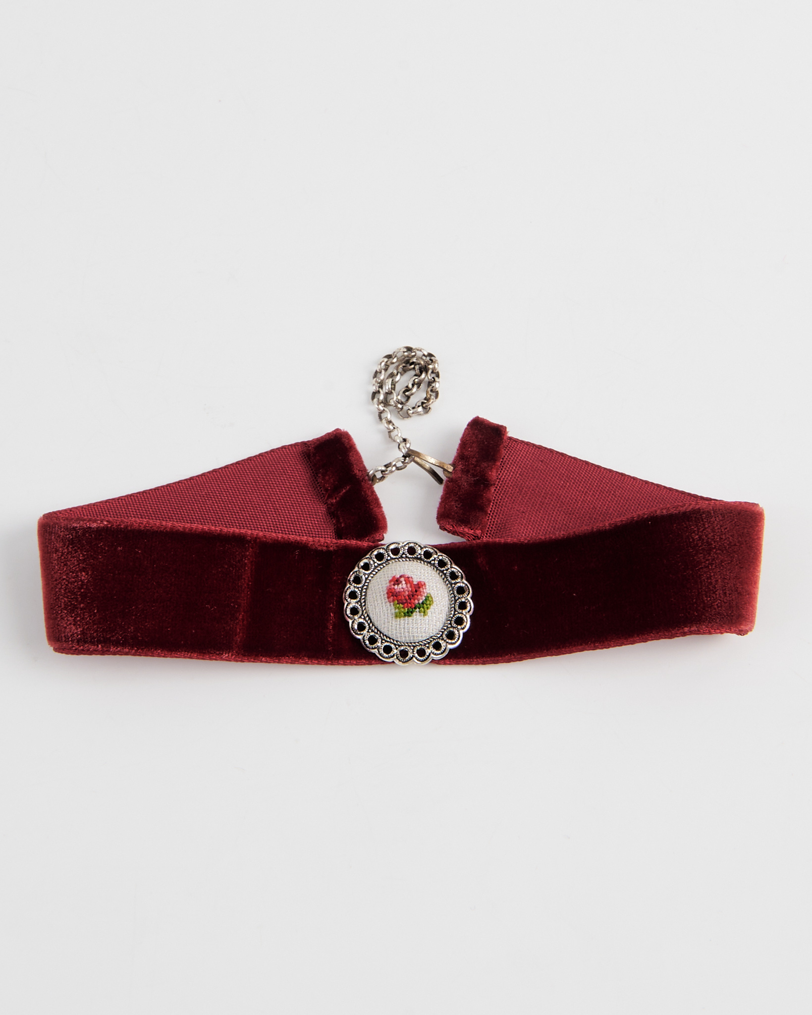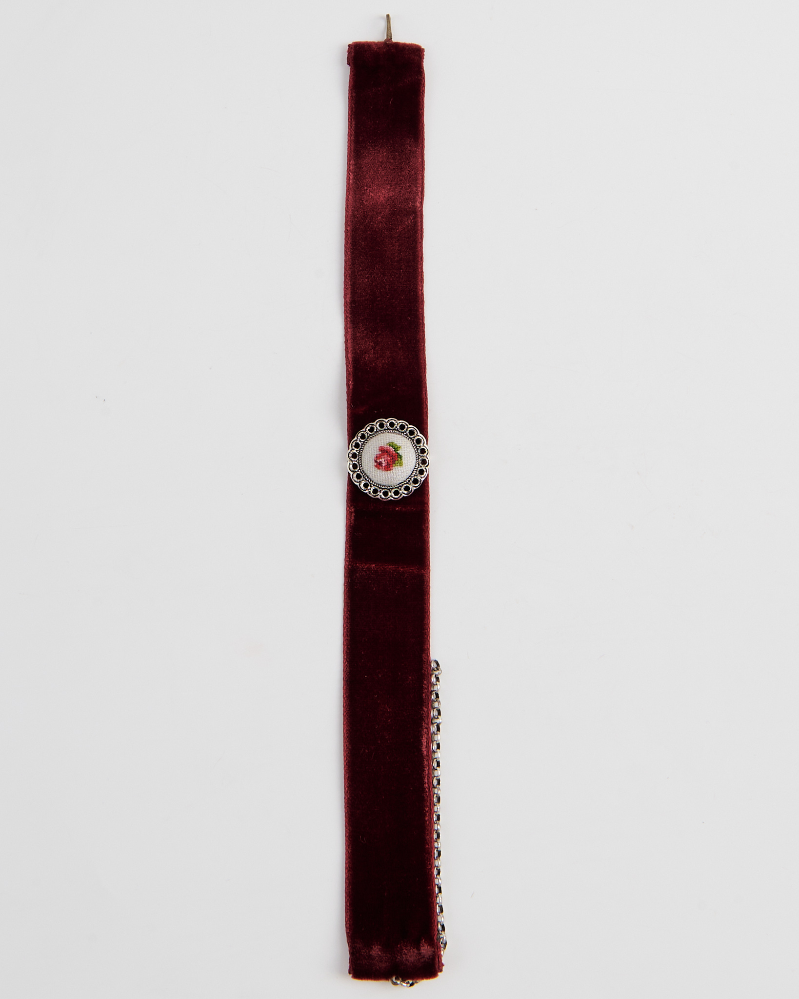 Бархатный чокер с вышитой брошью. Материал мягкий на ощупь, посадка регулируется цепочкой. Брошь с вышитым цветочным мотивом.