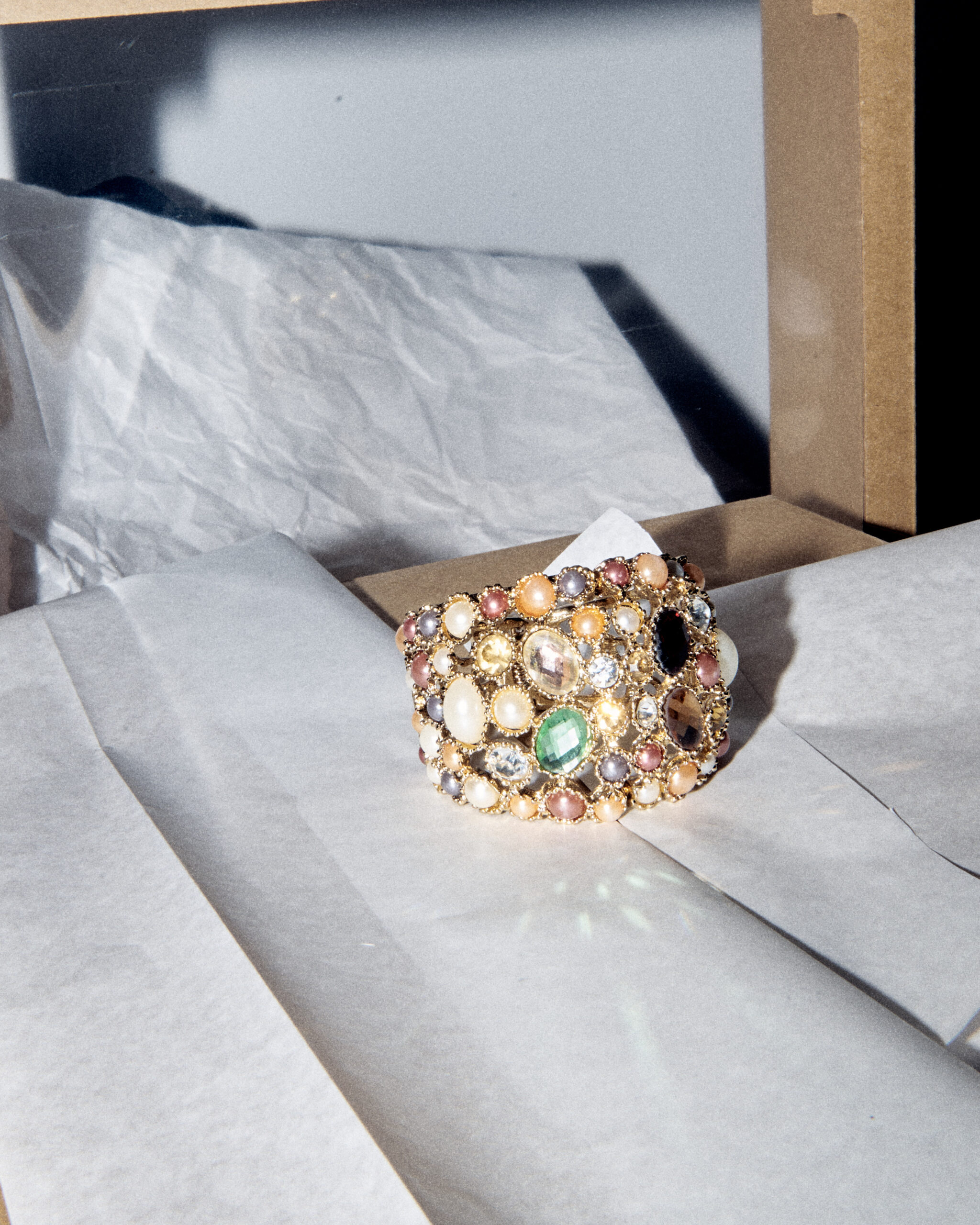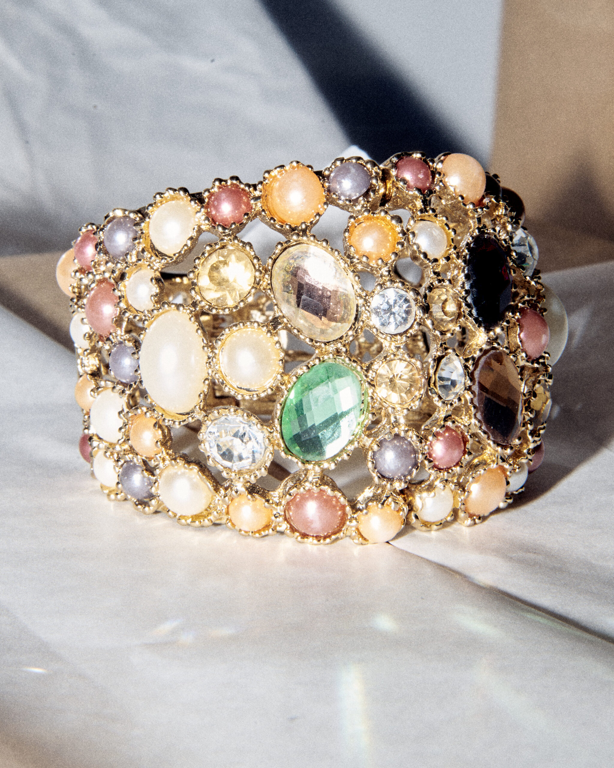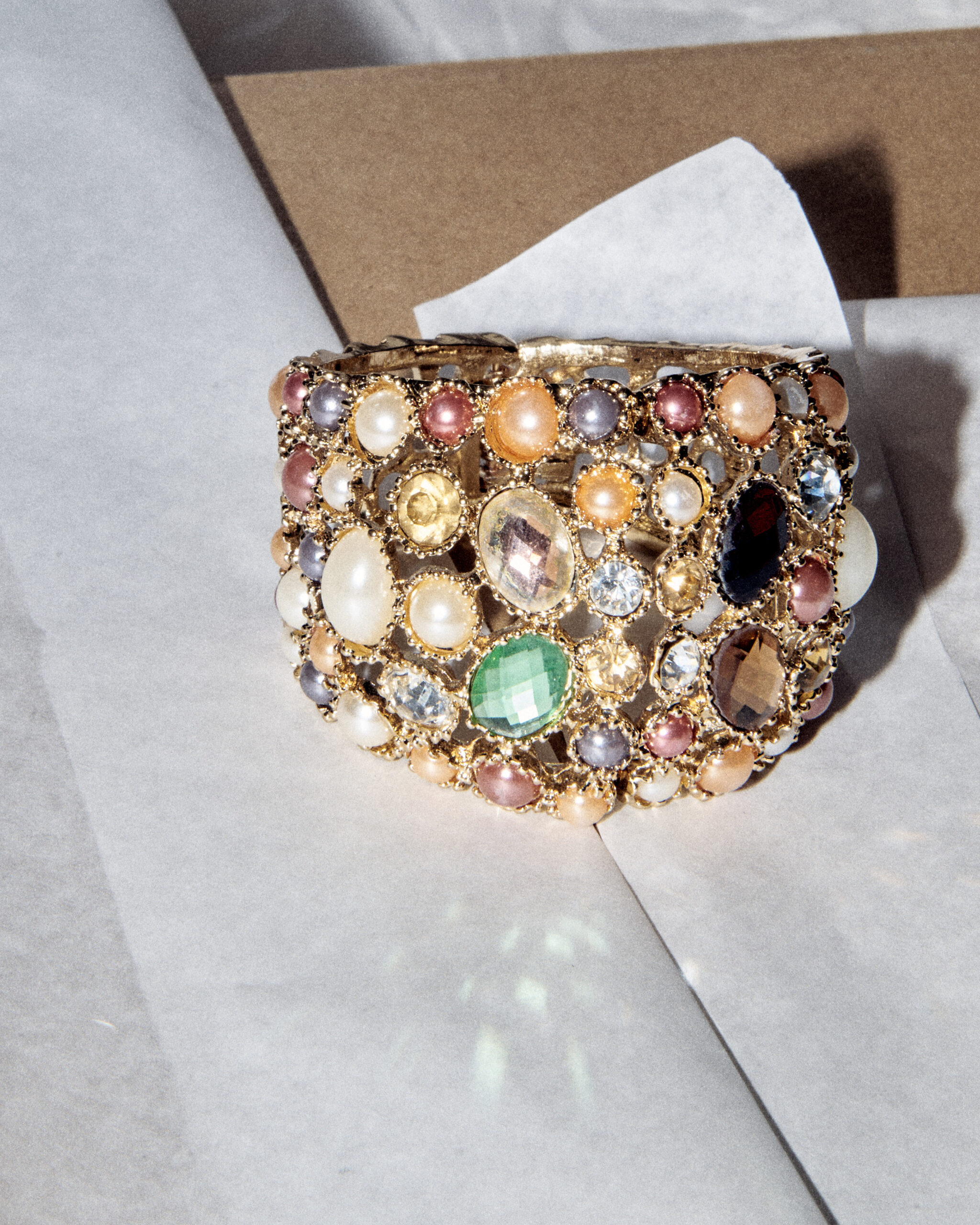 Массивный браслет-кафф с кристаллами в стиле бохо. Золотистый металл с густой россыпью разноцветных вставок и искусственного жемчуга. Удобная и практичная застёжка.