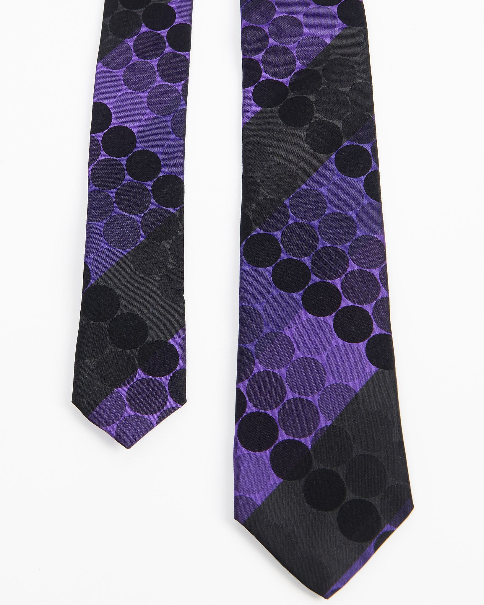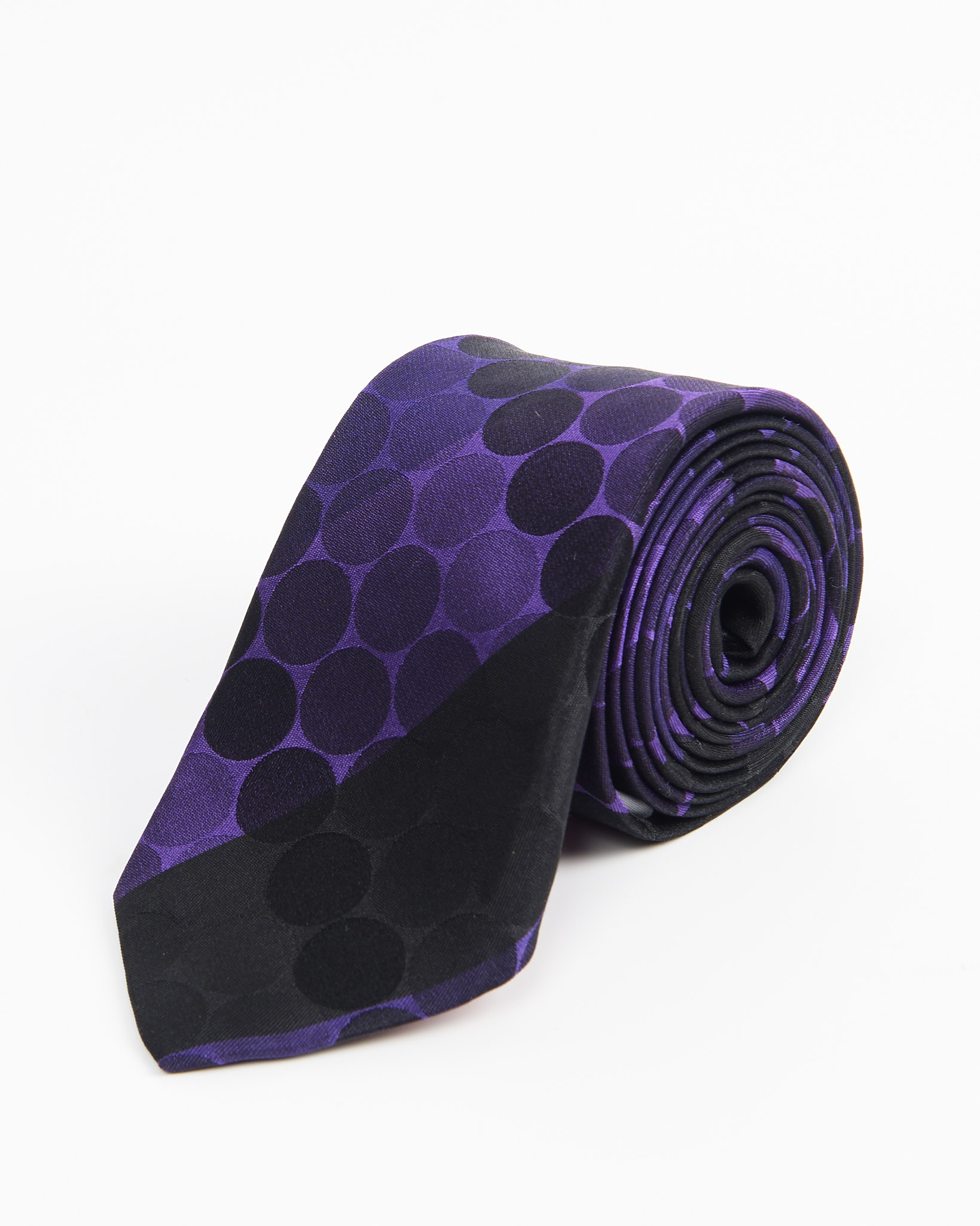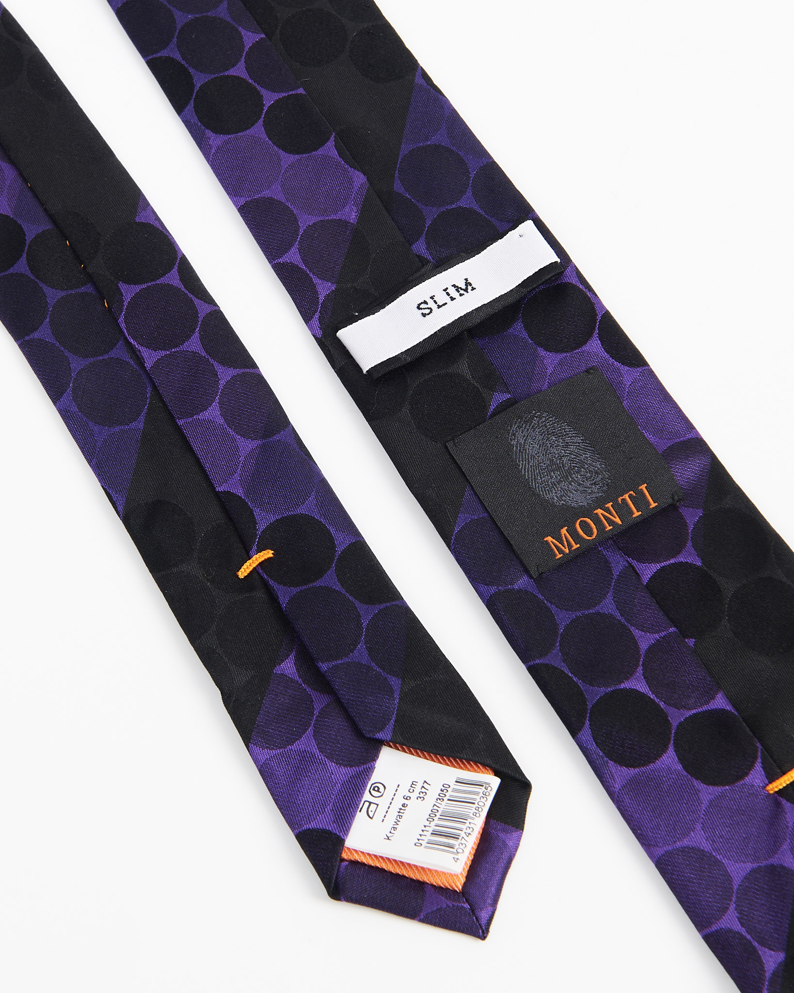 Графичный галстук Monti из 100% натурального шёлка в горох.Насыщенный фиолетовый цвет и контрастные детали с крупными черными кругами.