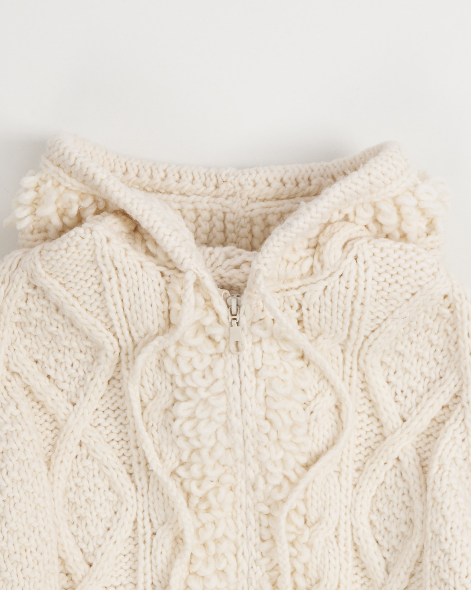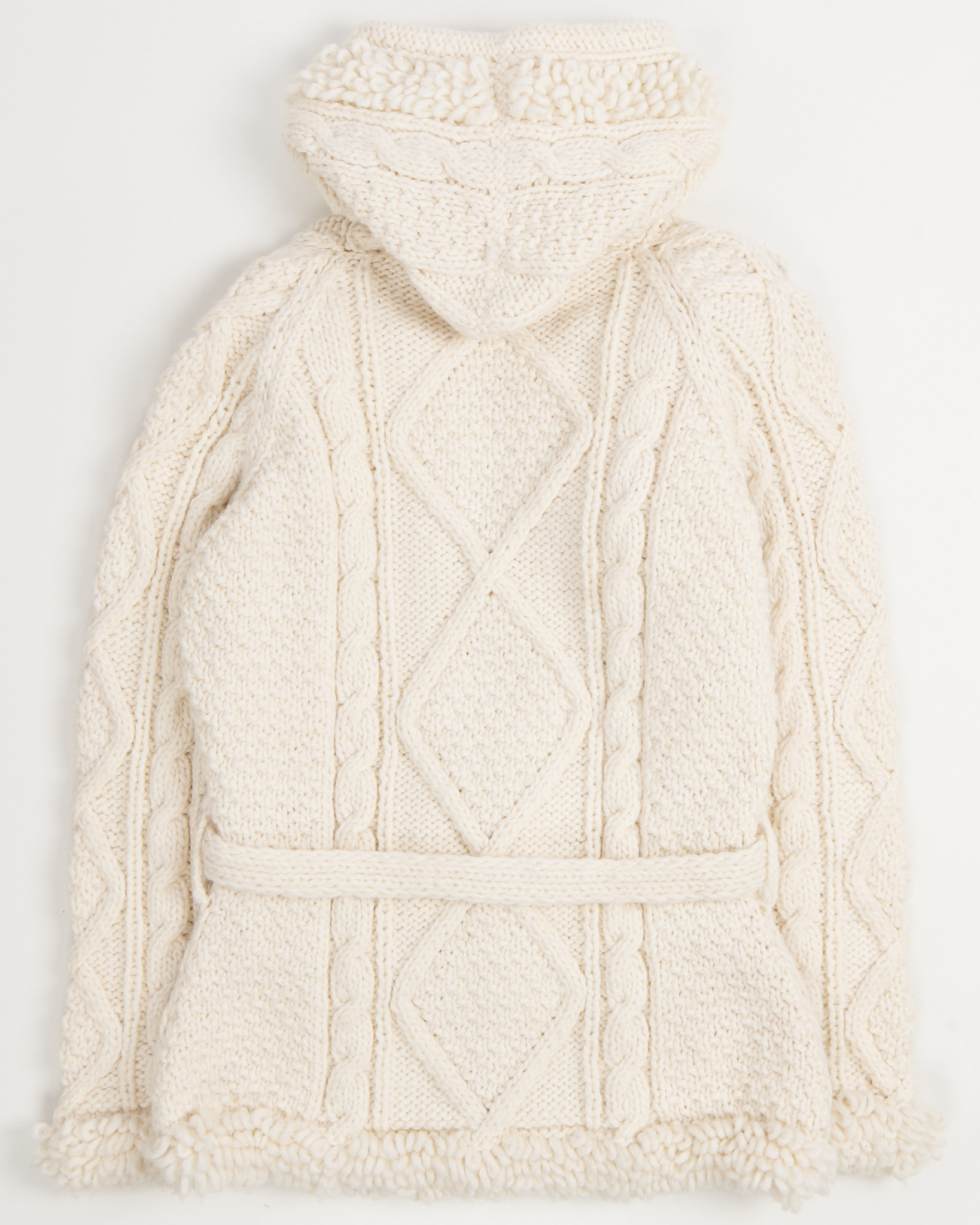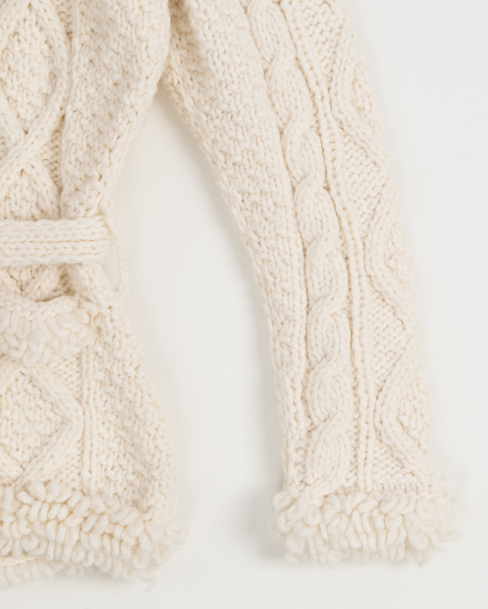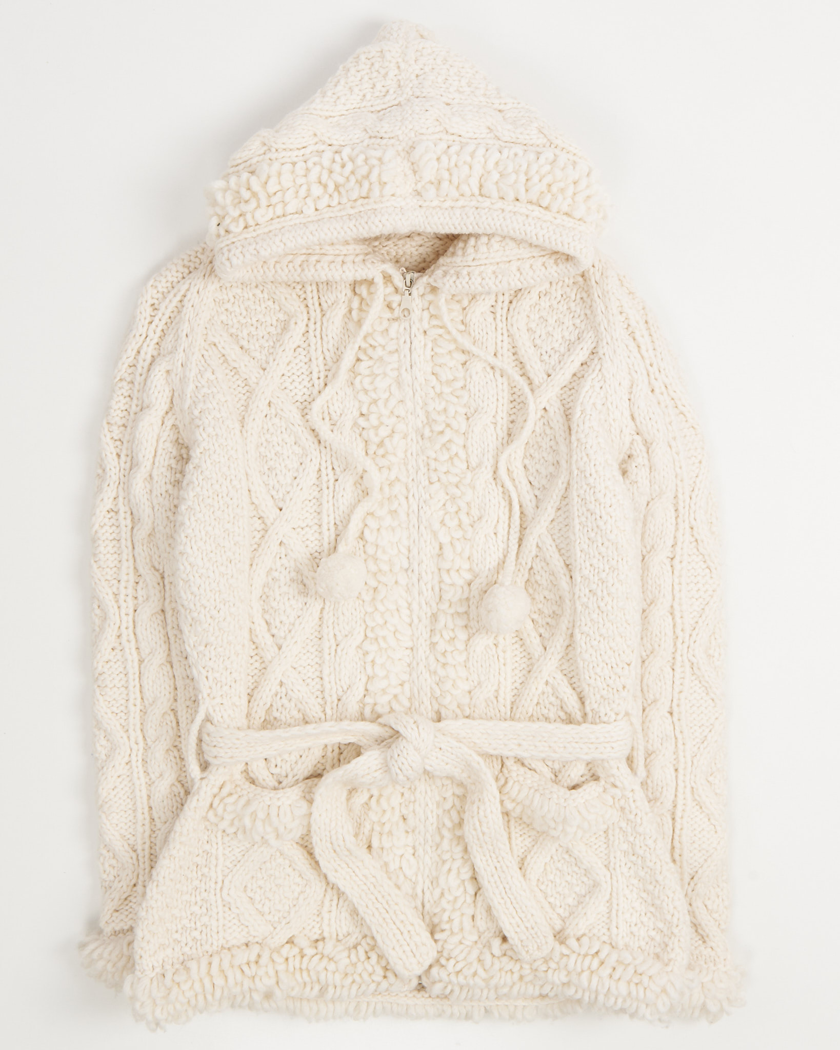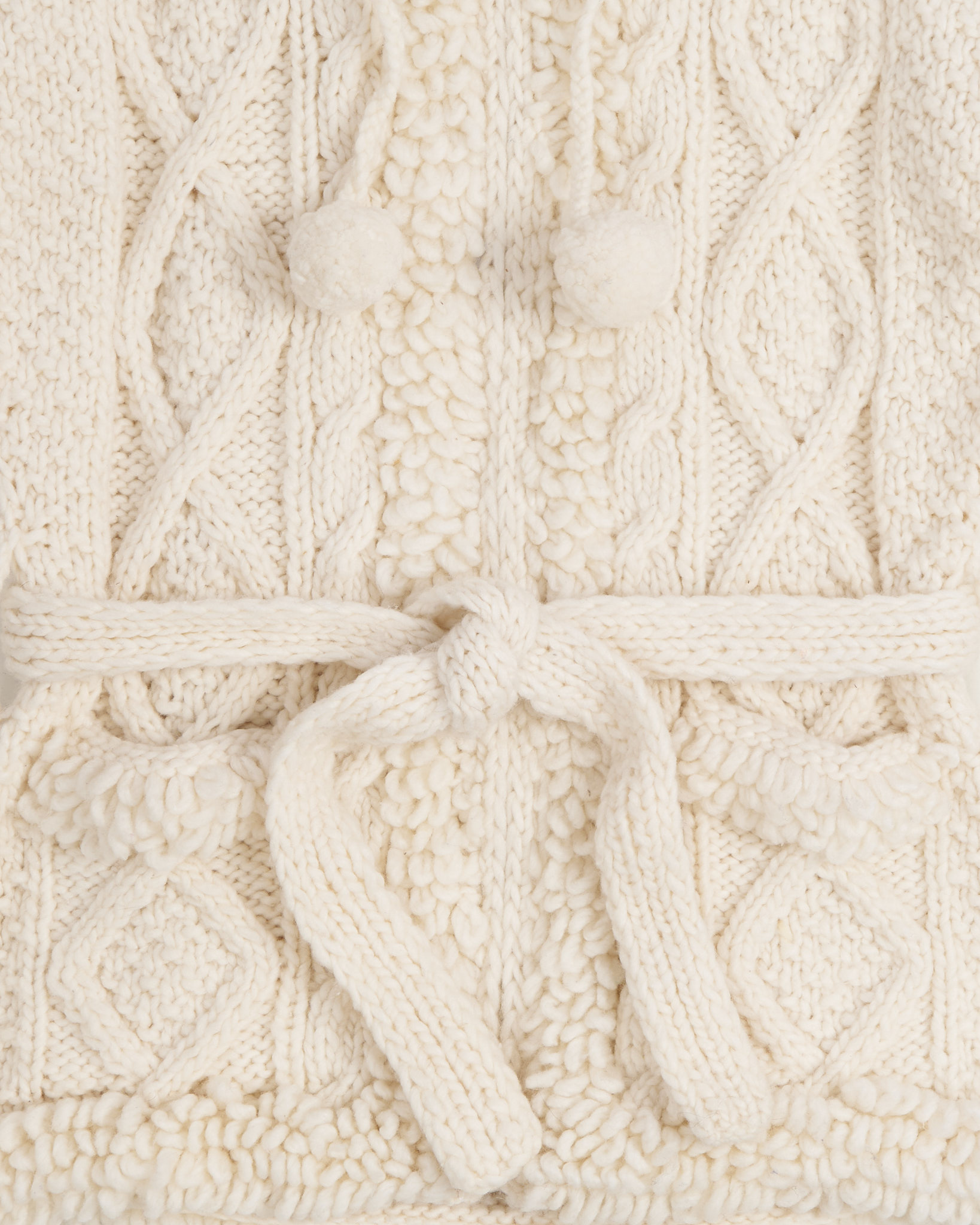 Молочный кардиган крупной вязки из 100% шерсти. Свободный крой, широкий вязаный пояс в комплекте с помощью которого, можно регулировать посадку. Манжет с объемными петлями, капюшон, функциональные карманы и акцентные завязки с помпонами.
