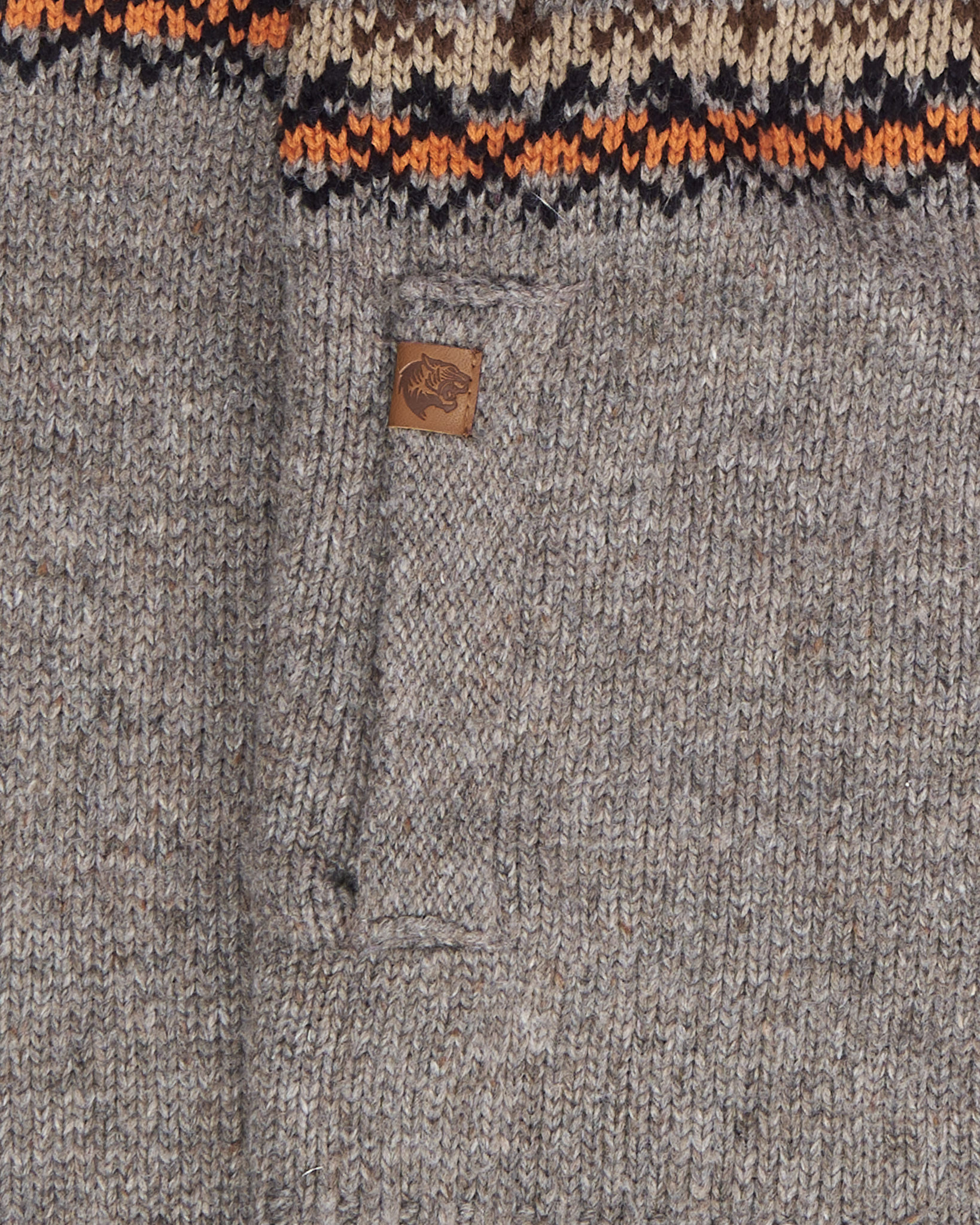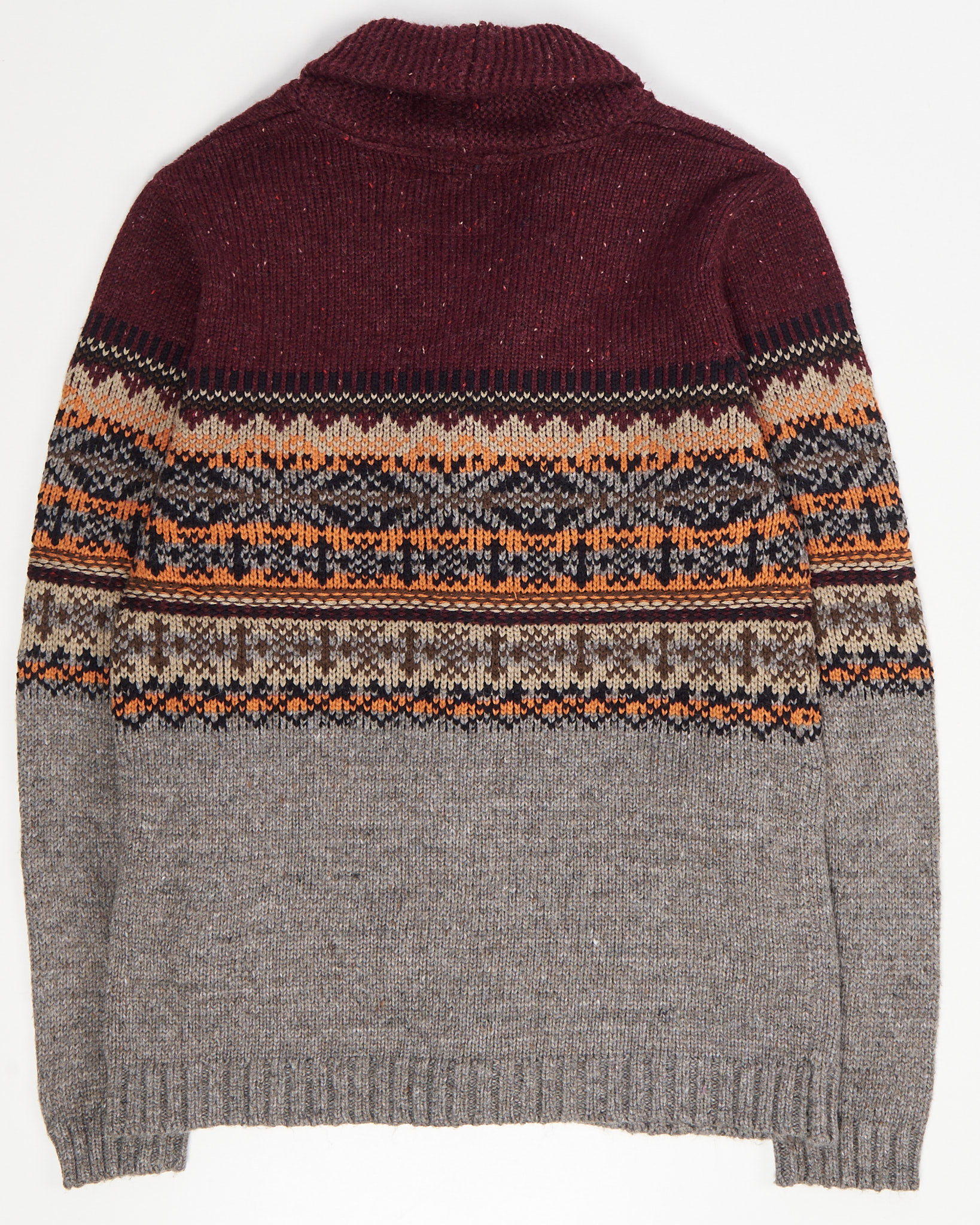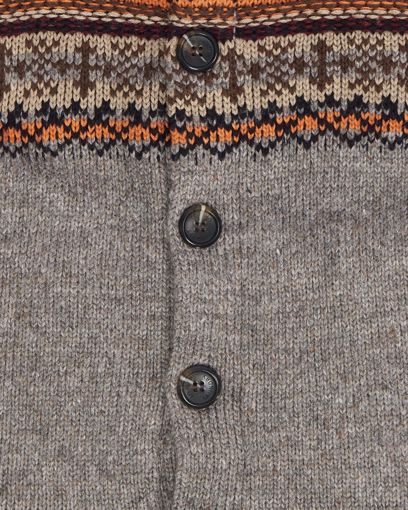 Плотная вязка с вкраплениями цвета, прямой крой, свободная посадка. Геометрический орнамент Fair Isle в теплых тонах, воротник с деревянной пуговицей.