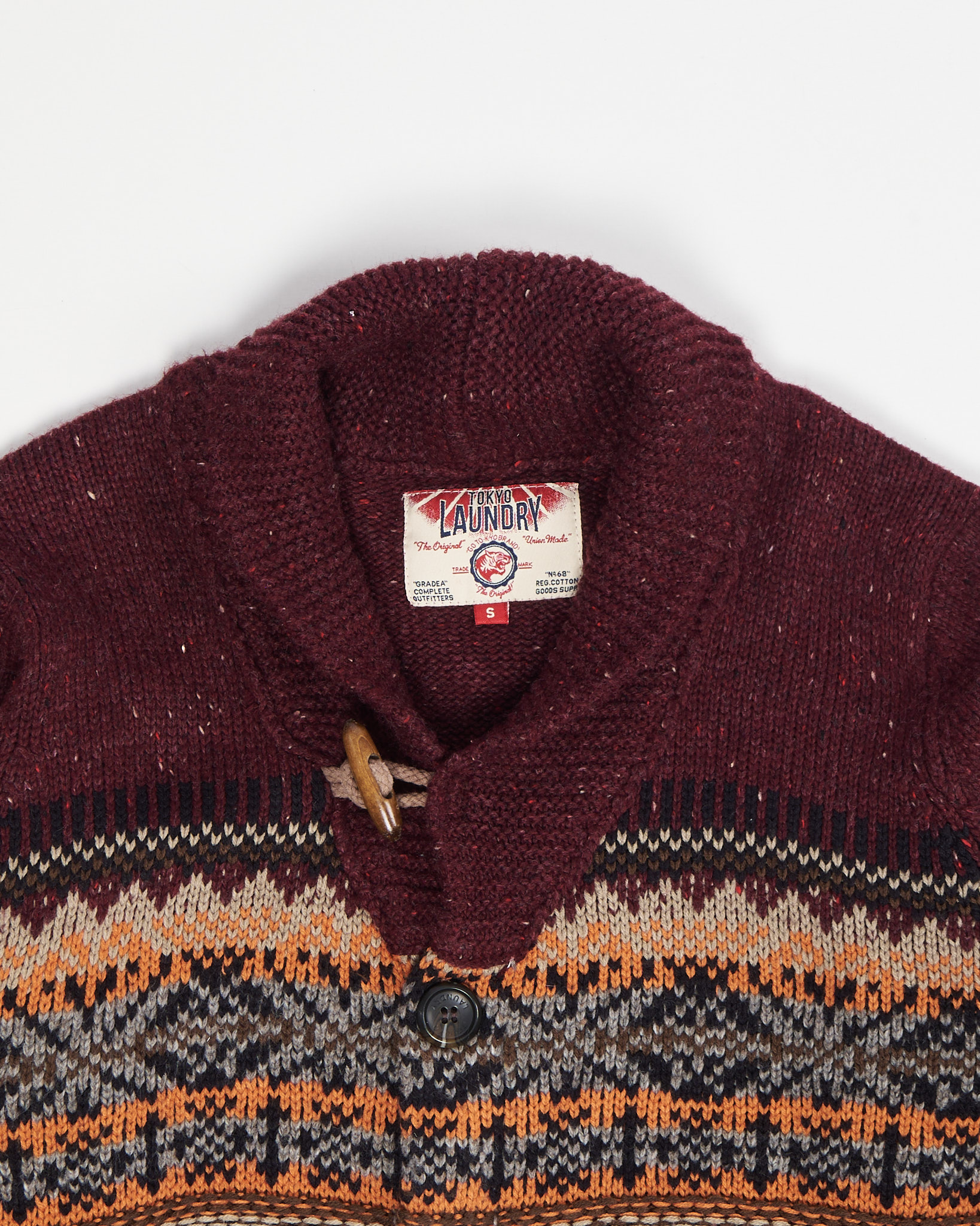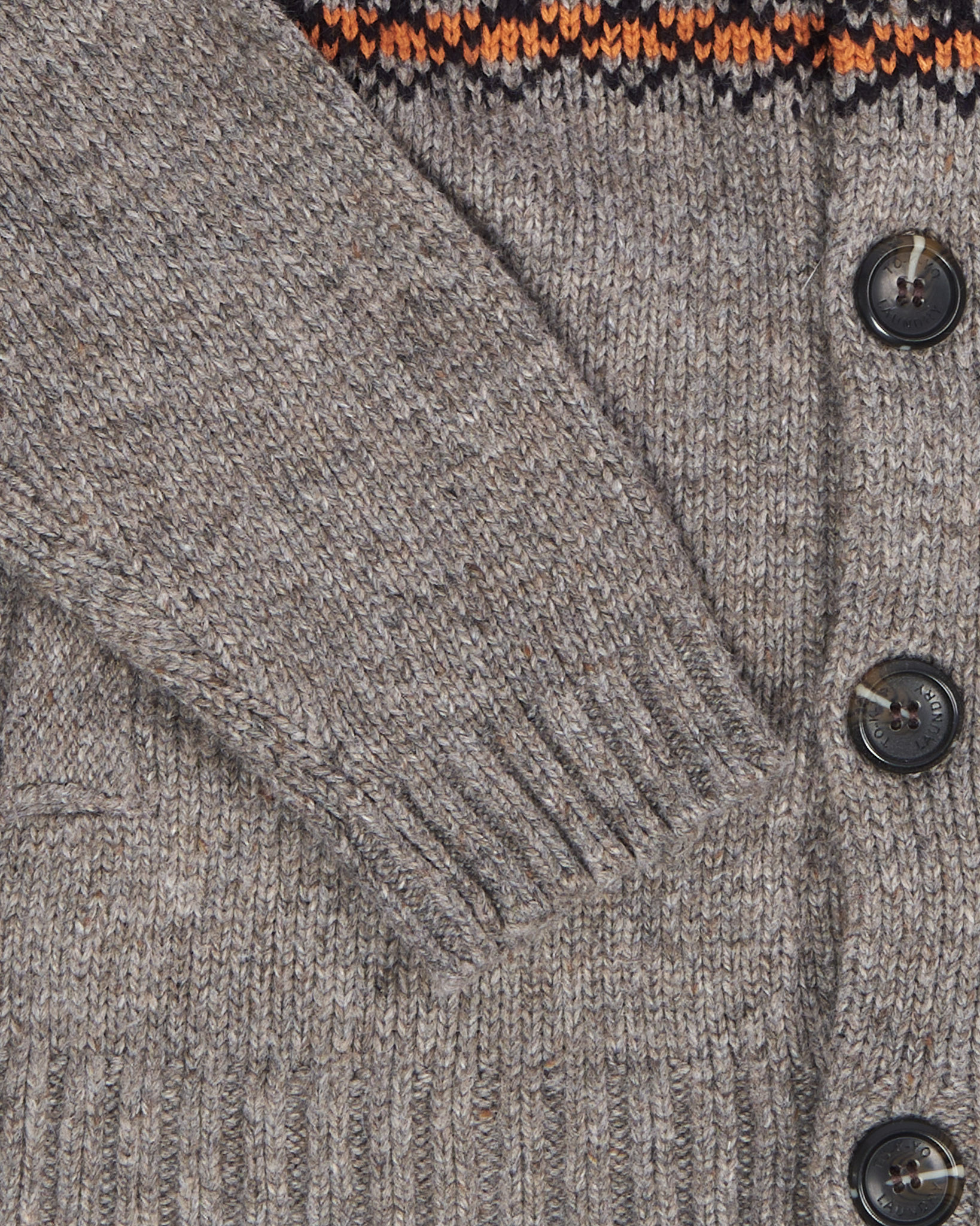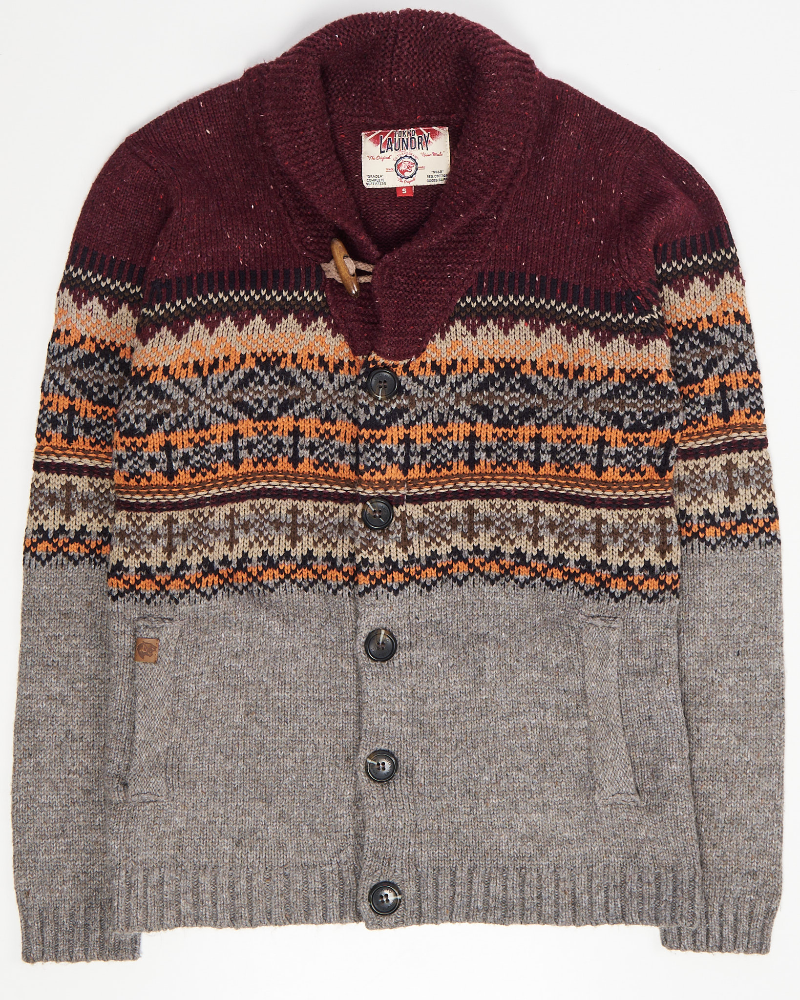 Плотная вязка с вкраплениями цвета, прямой крой, свободная посадка. Геометрический орнамент Fair Isle в теплых тонах, воротник с деревянной пуговицей.