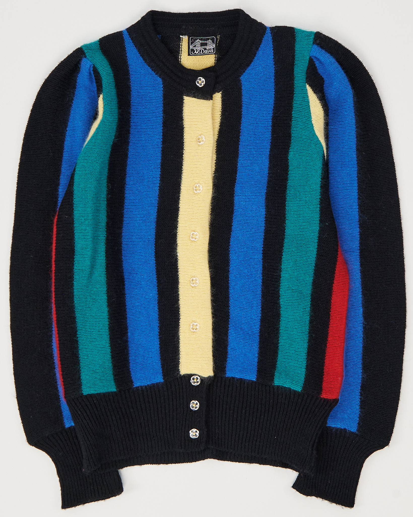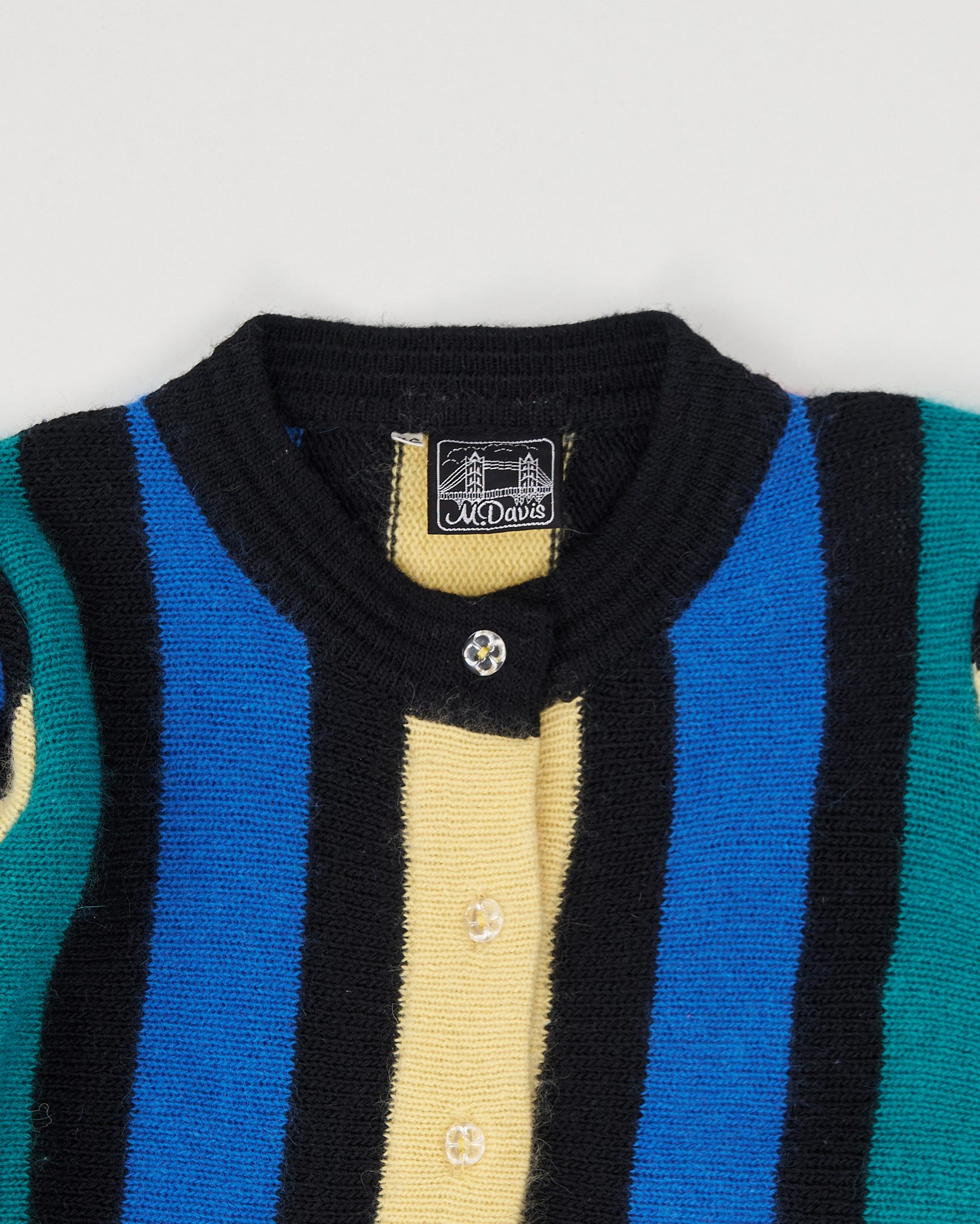 Кардиган в полоску Mc Davis из 41% шерсти. Материал приятен на ощупь, посадка прямая, линия плеча аккуратная, манжеты и низ оформлены плотной резинкой. Контрастные вертикальные полосы, редкая расцветка и фактурная вязка.