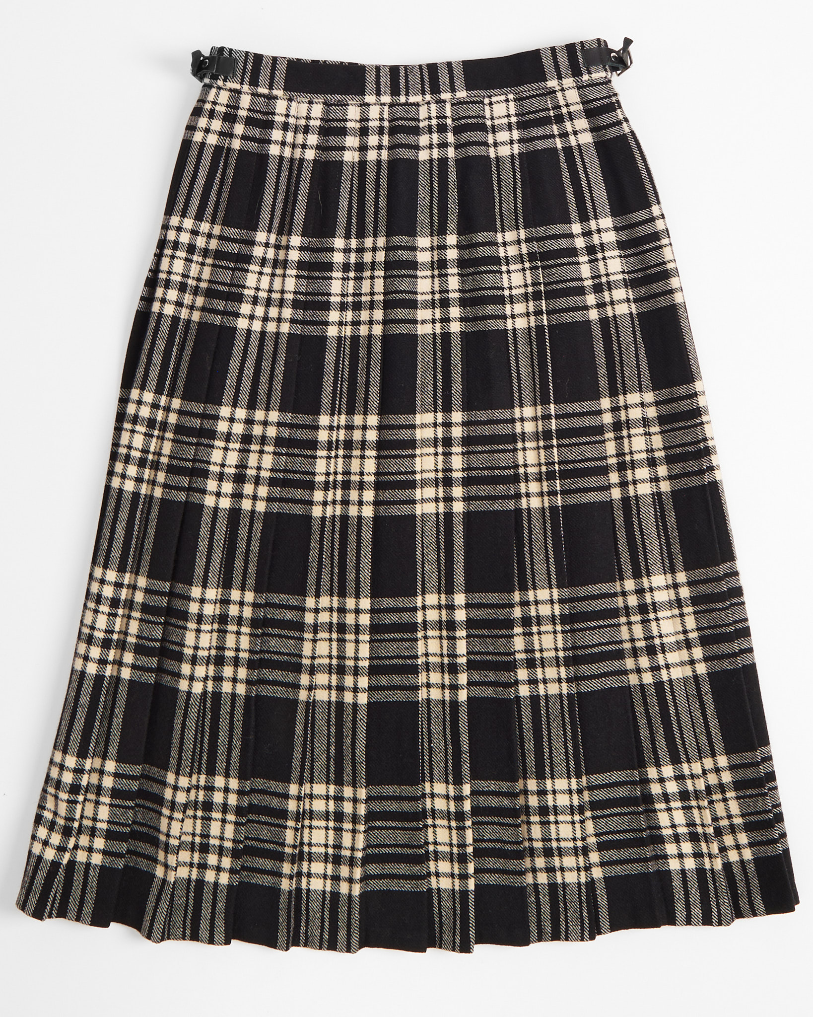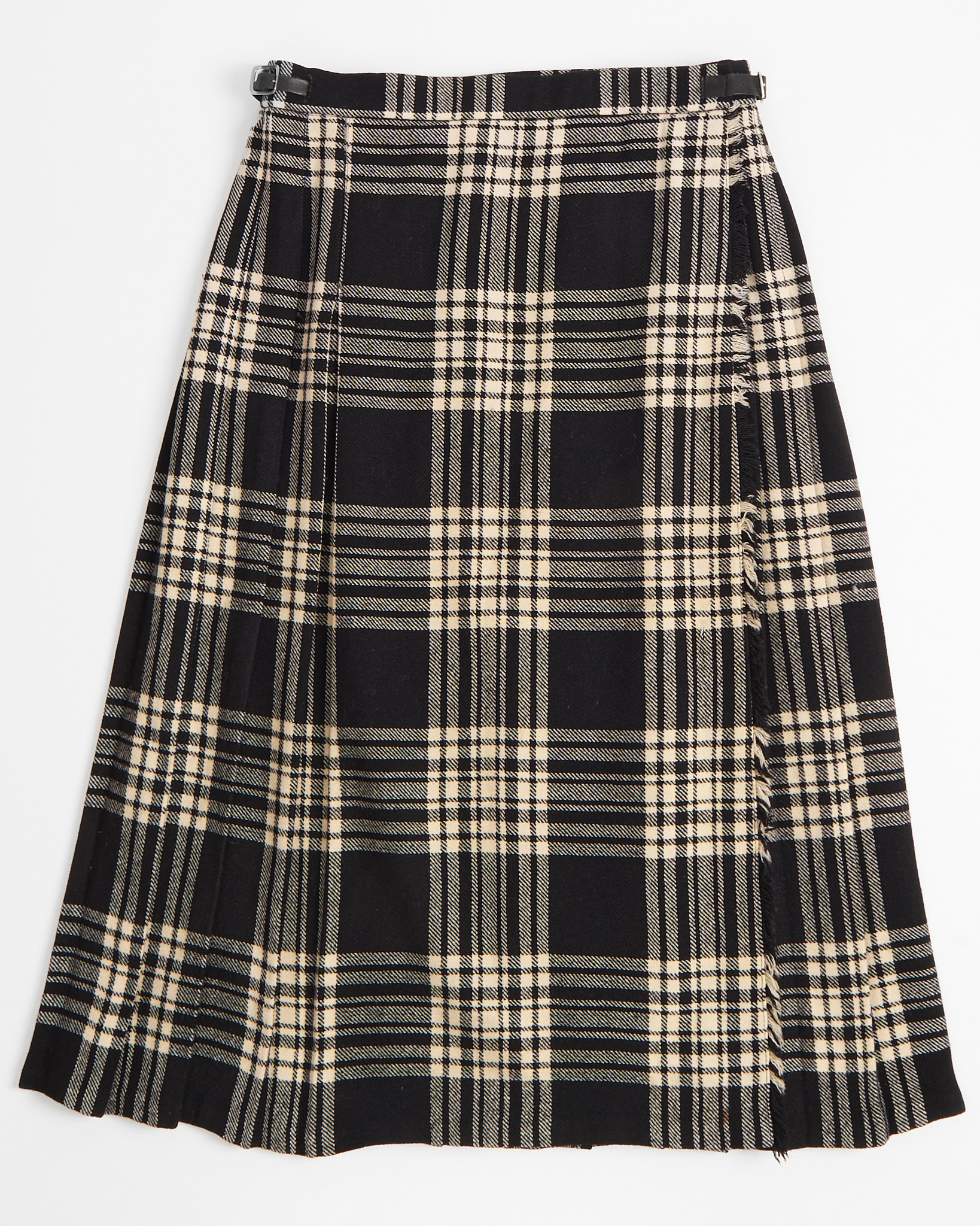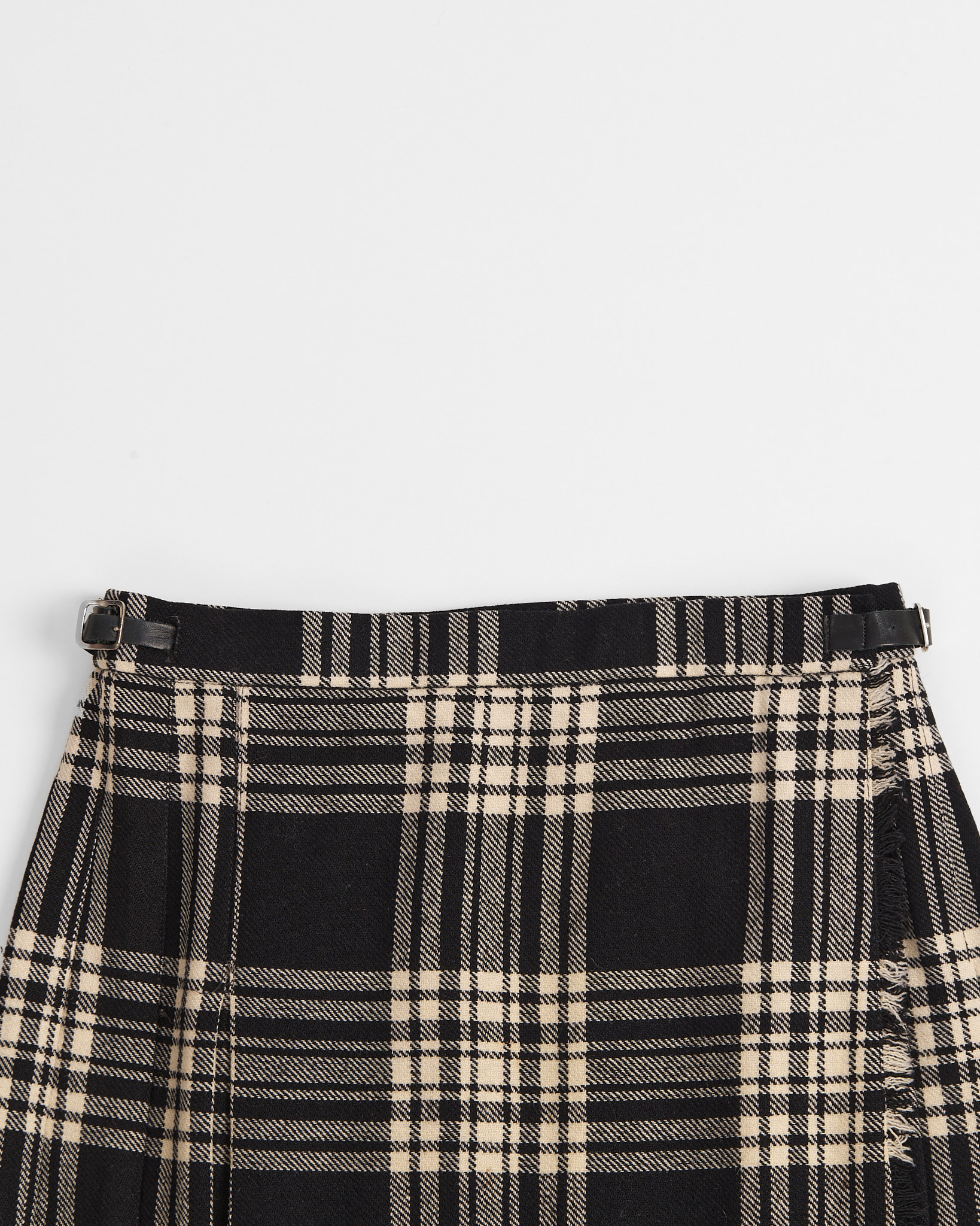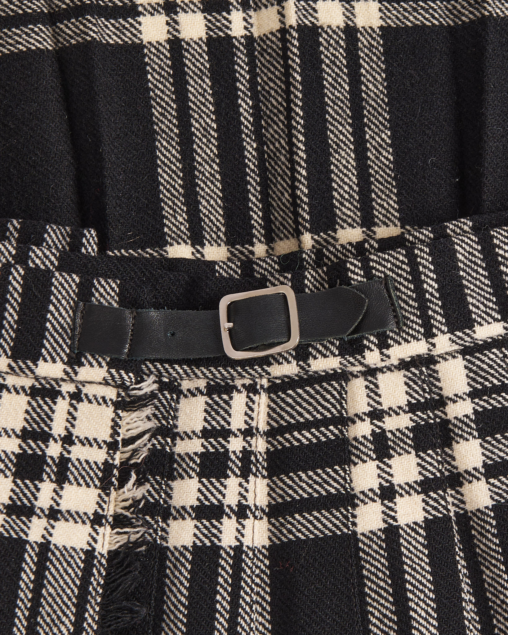 Винтажный килт из 100% woolmark. Принт клетка в черных и молочных оттенках, бахрома по краям. Кожаные ремешки с металлическими пряжками позволяют регулировать объем пояса под себя.