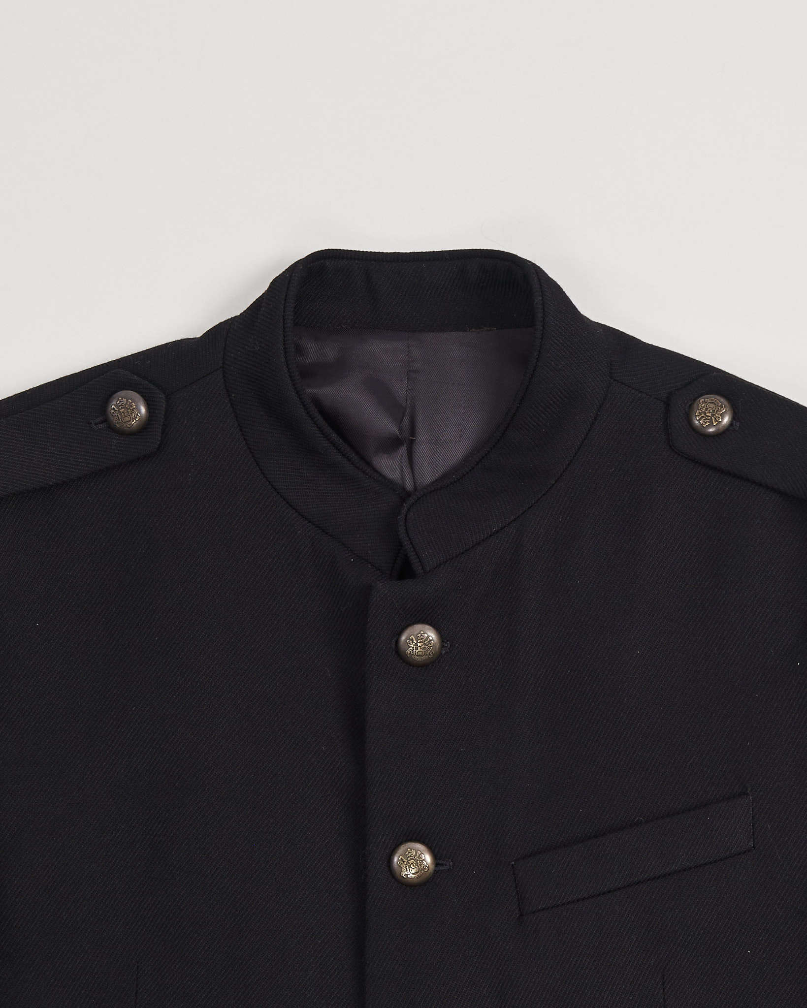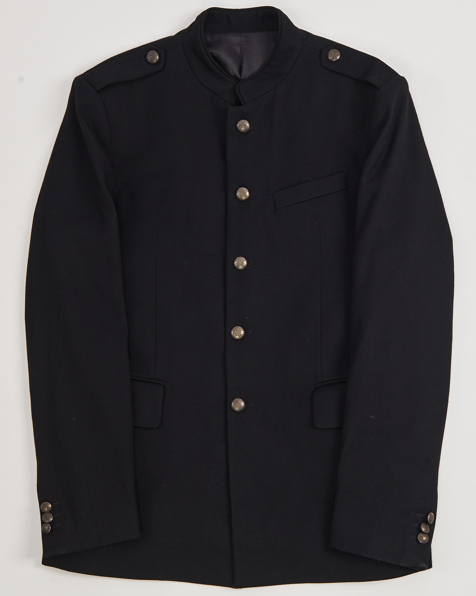 Винтажный китель в стиле милитари. Свободная посадка, акцентные лацканы, металлические пуговицы с узором, функциональные карманы по бокам.