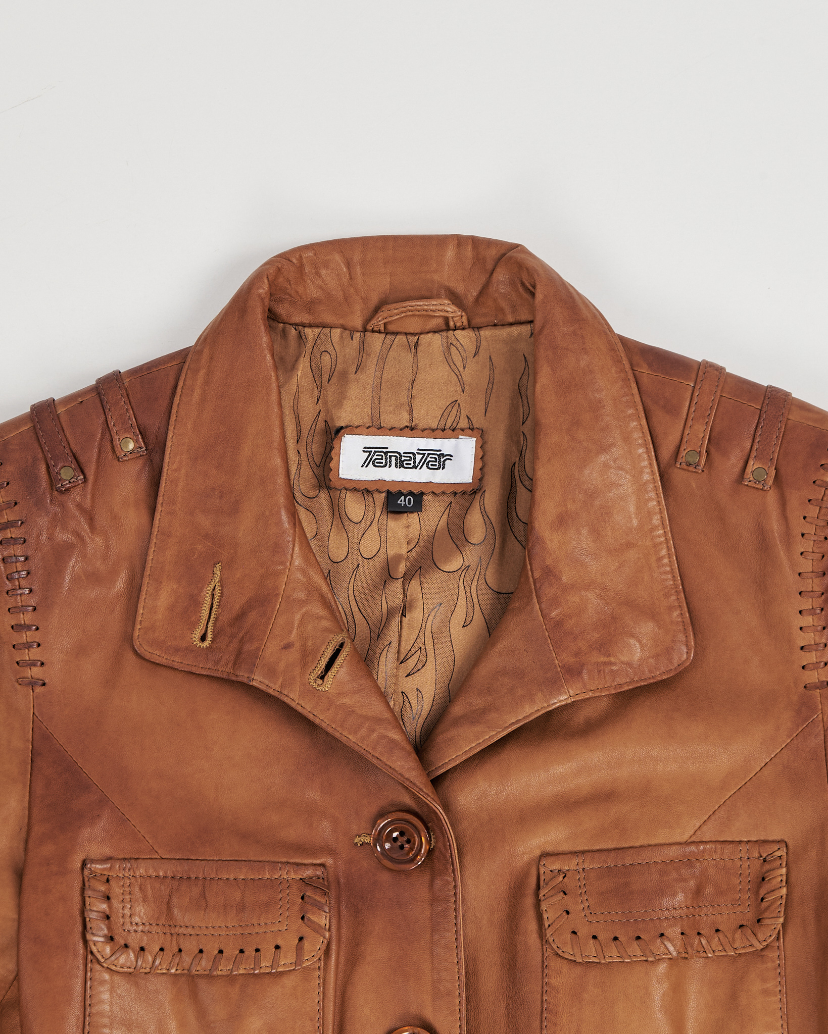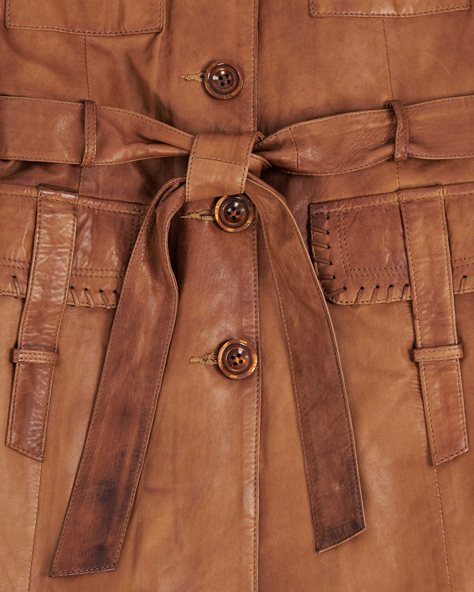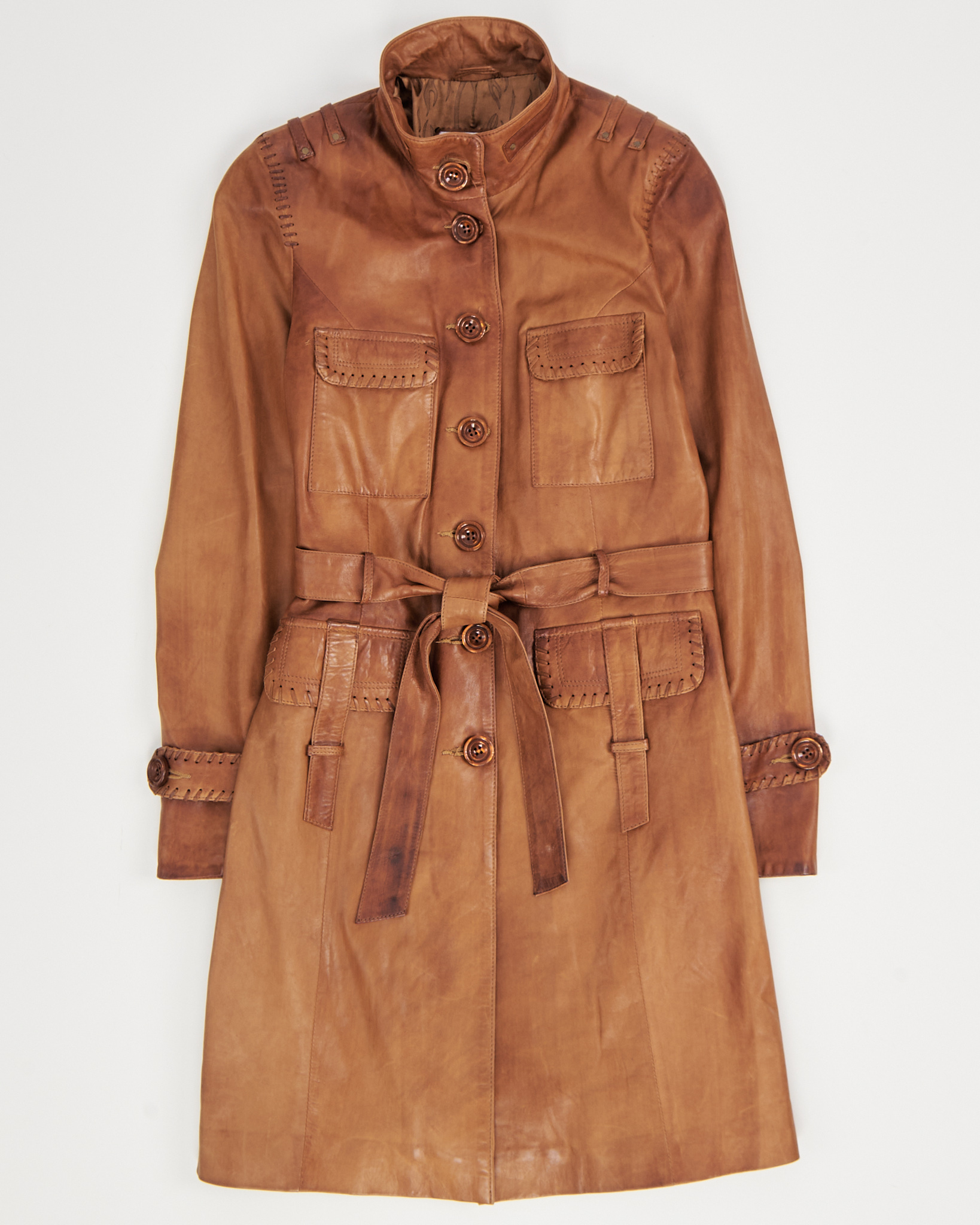 Плащ Tanavar из натуральной кожи в тёплом карамельном оттенке. Посадка прямая, пояс подчёркивает линию талии и формирует чёткий силуэт. Высокий воротник, объёмные карманы и декоративная шнуровка. Подкладка с графичным рисунком.