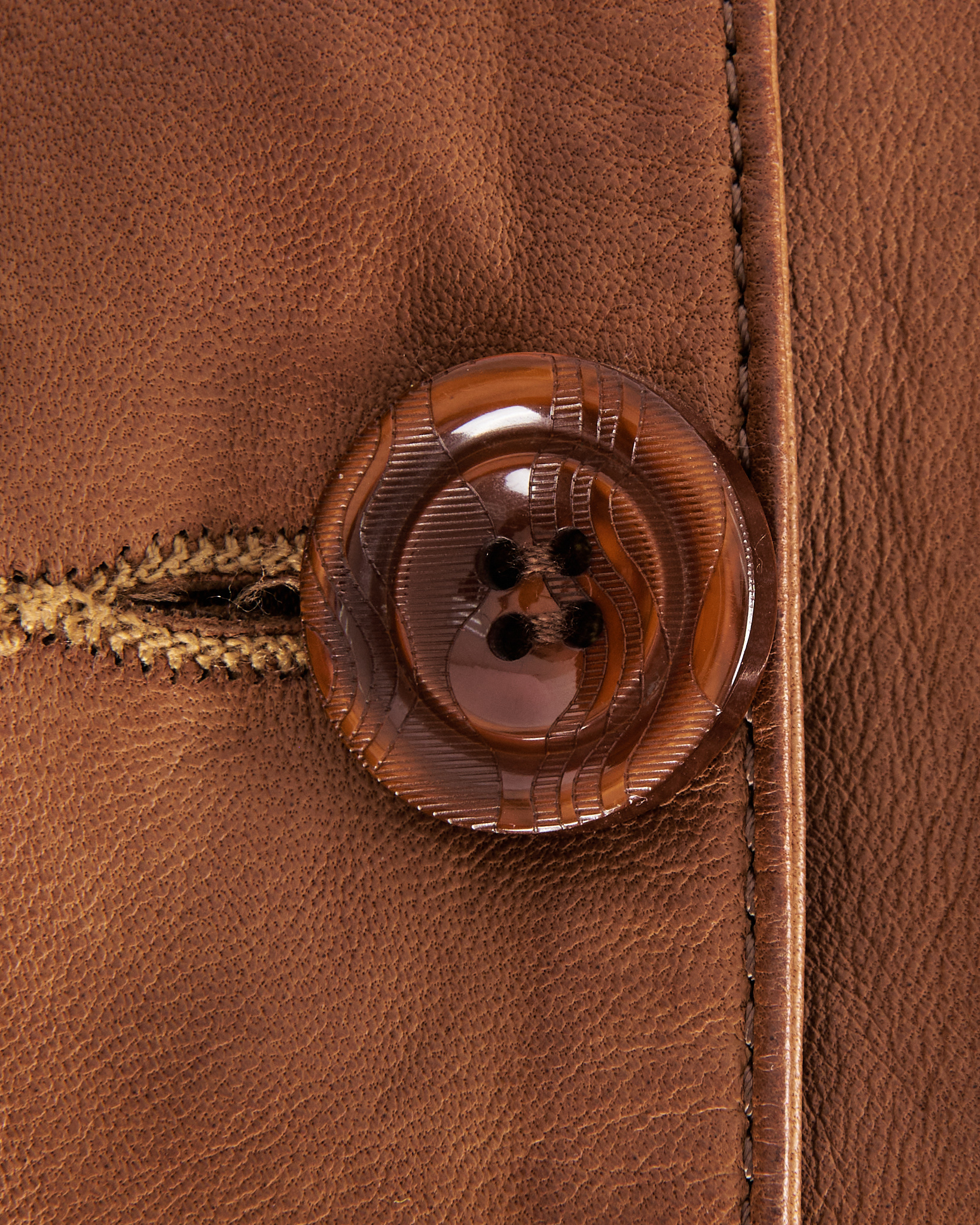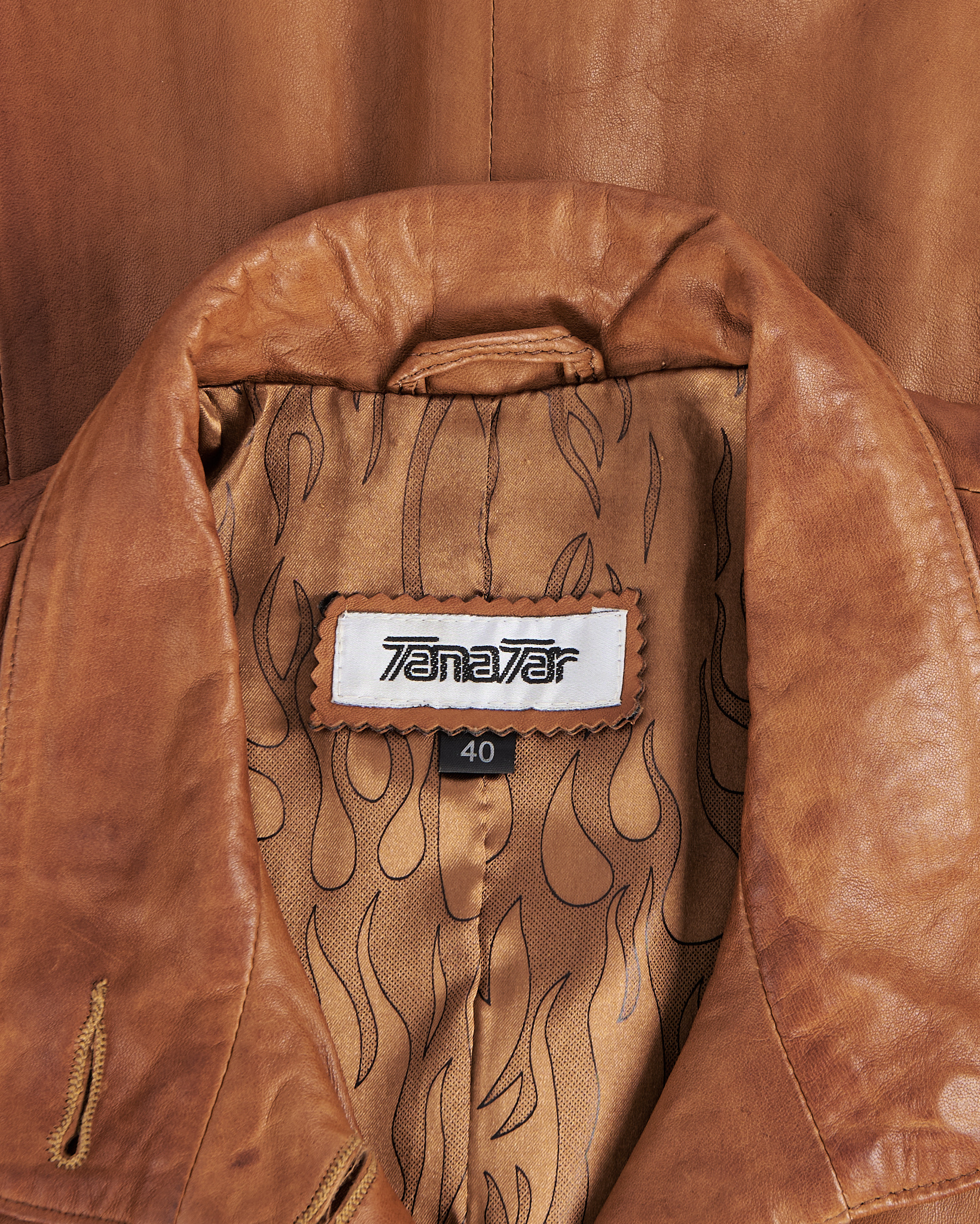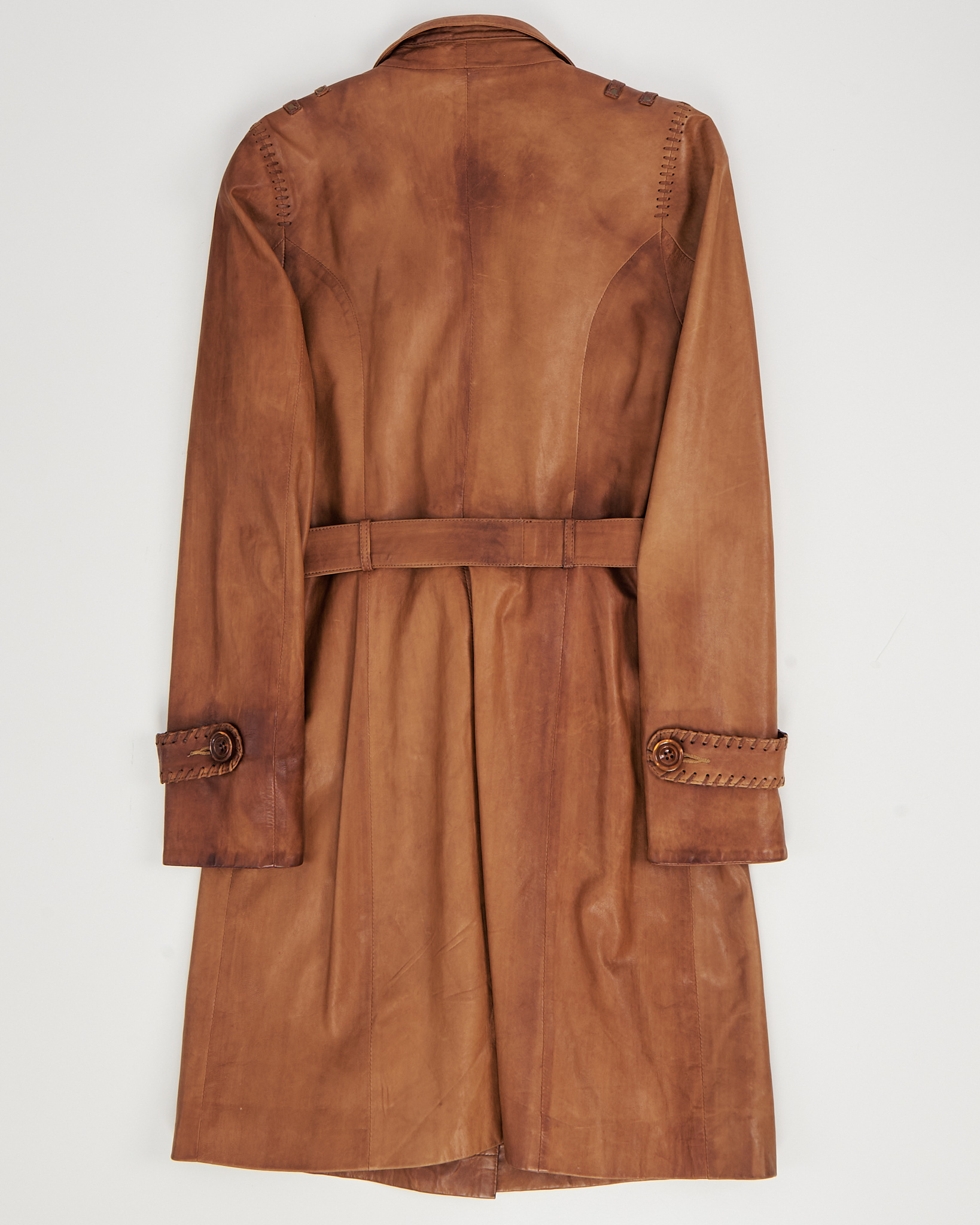 Плащ Tanavar из натуральной кожи в тёплом карамельном оттенке. Посадка прямая, пояс подчёркивает линию талии и формирует чёткий силуэт. Высокий воротник, объёмные карманы и декоративная шнуровка. Подкладка с графичным рисунком.