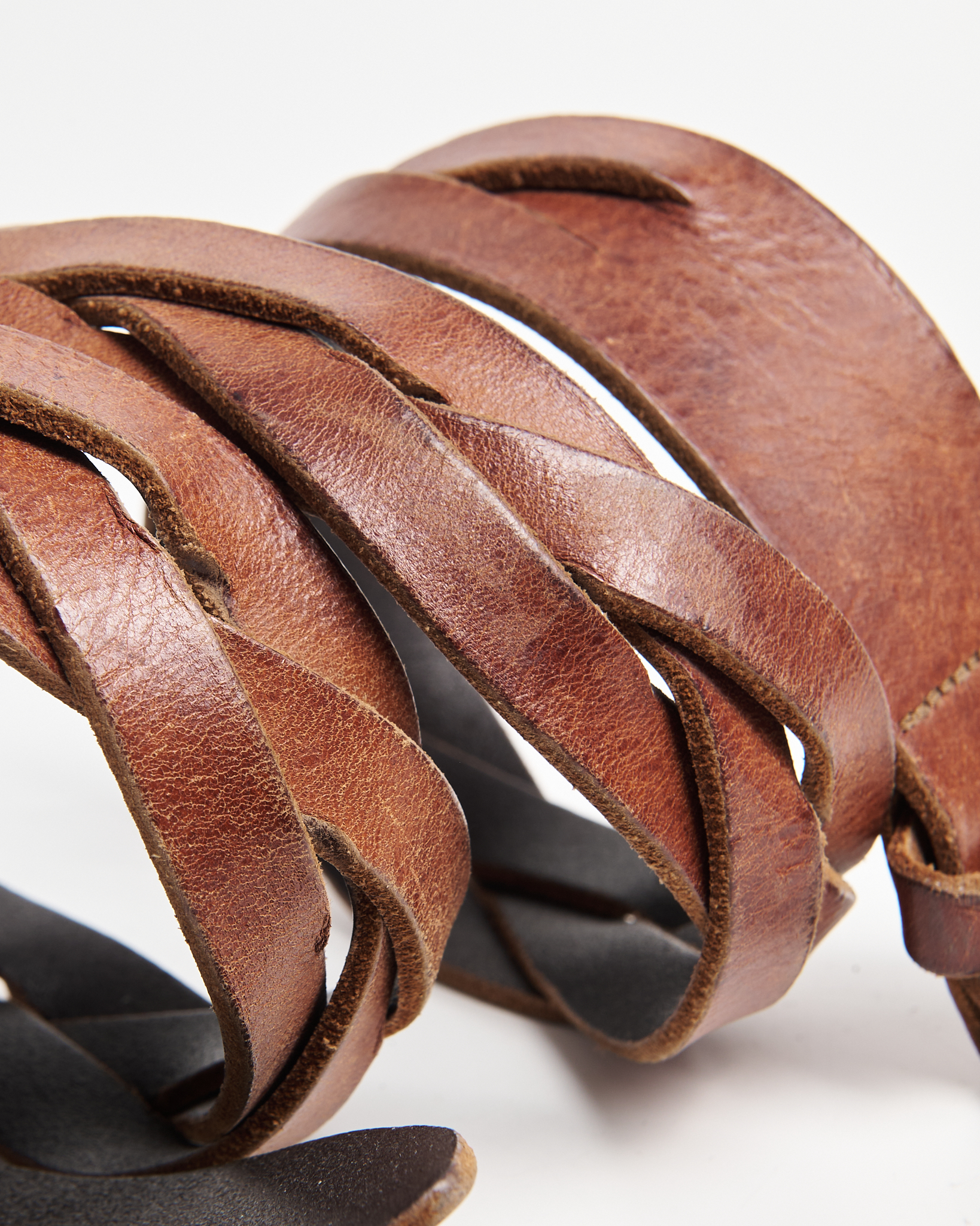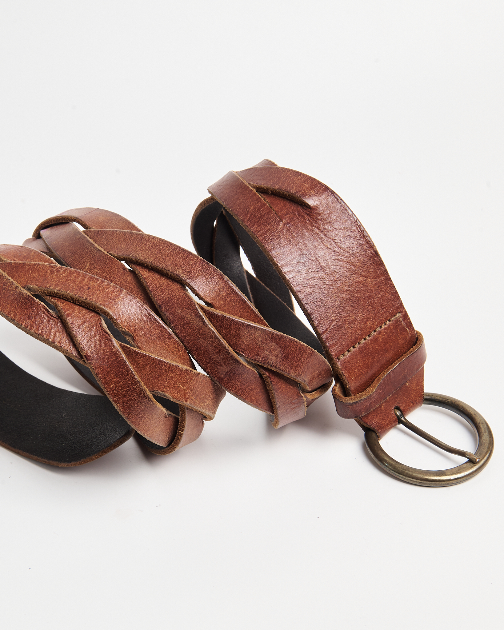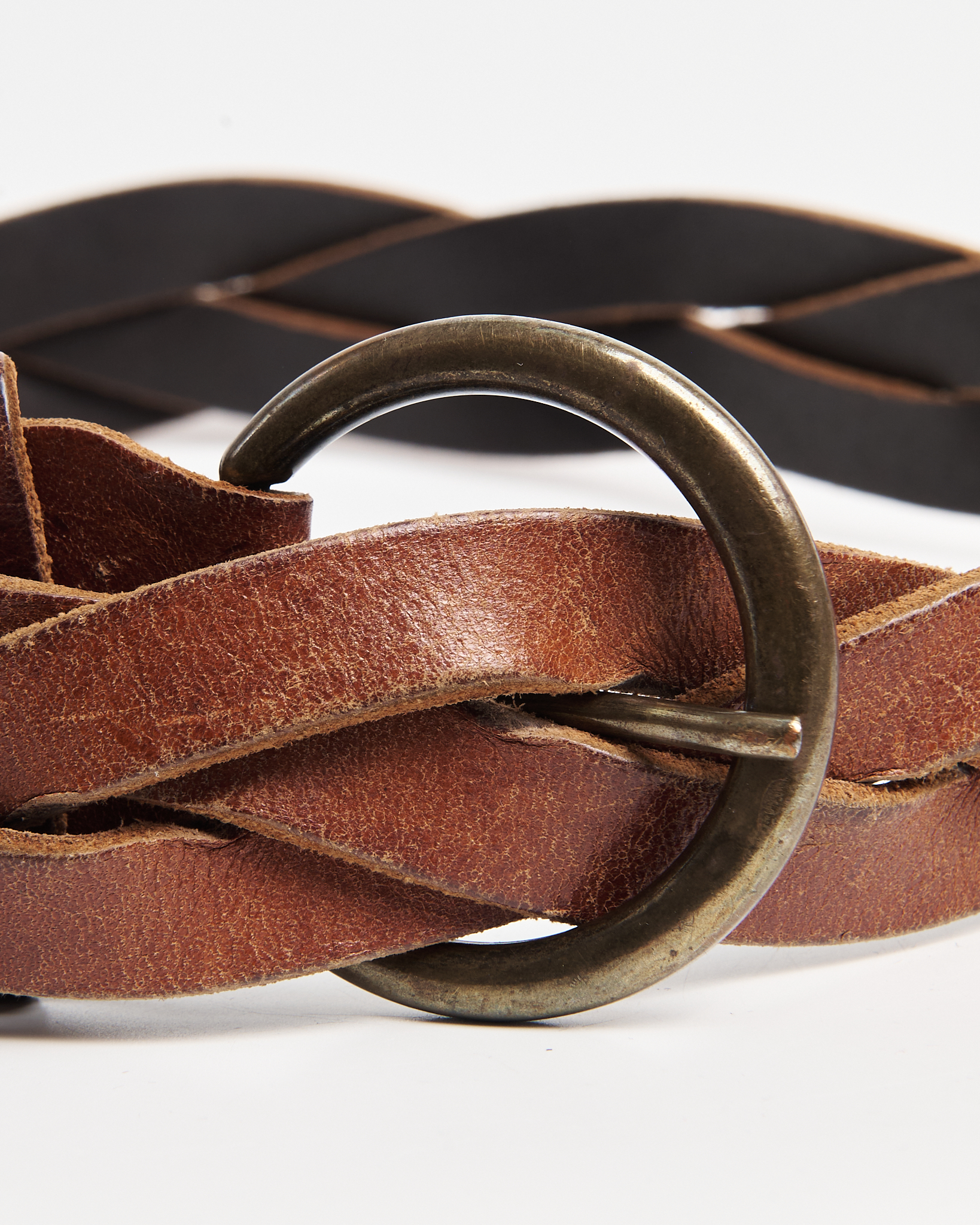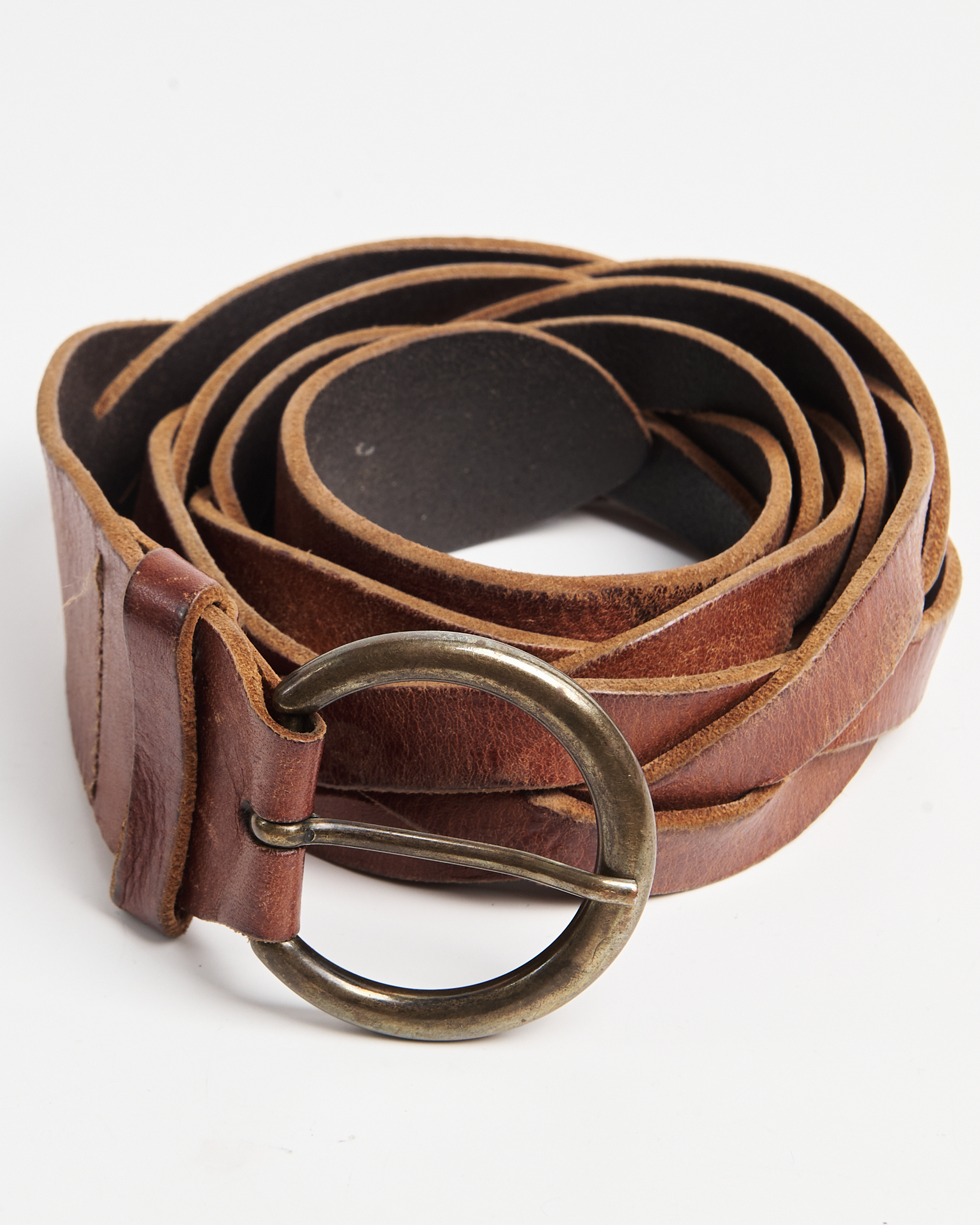 Ремень из плотной натуральной кожи глубокого коричневого оттенка. Плетёная конструкция, круглая металлическая пряжка с состаренным эффектом, надёжная фурнитура.