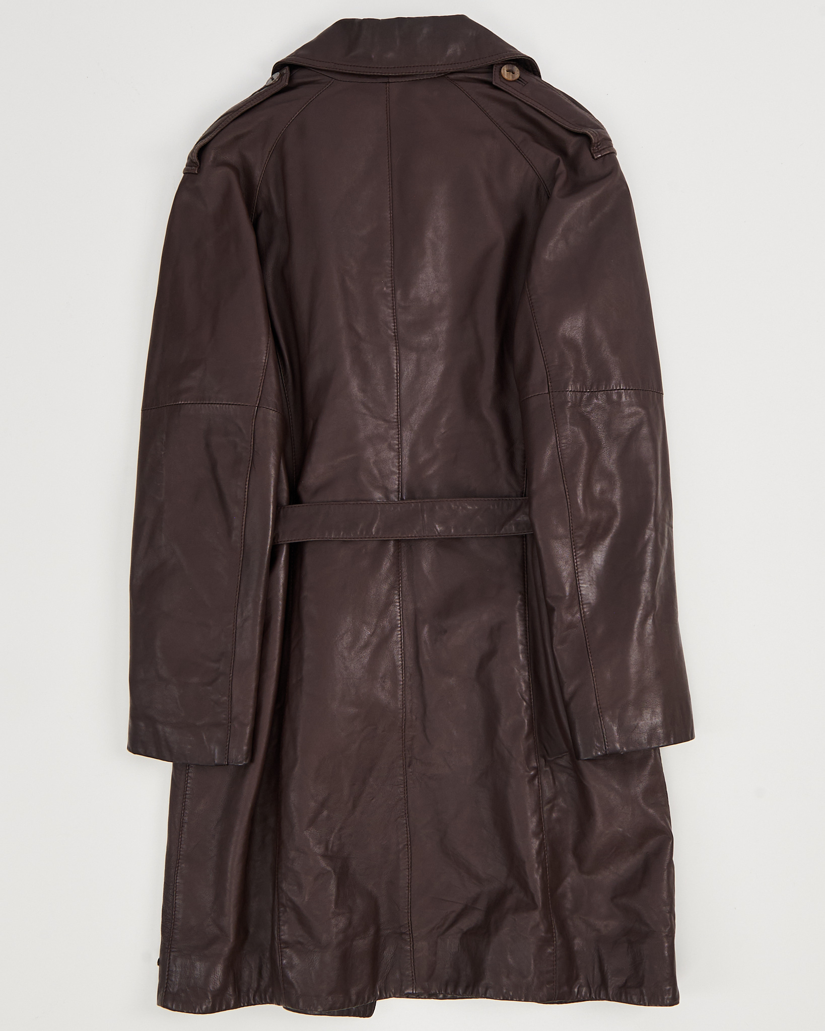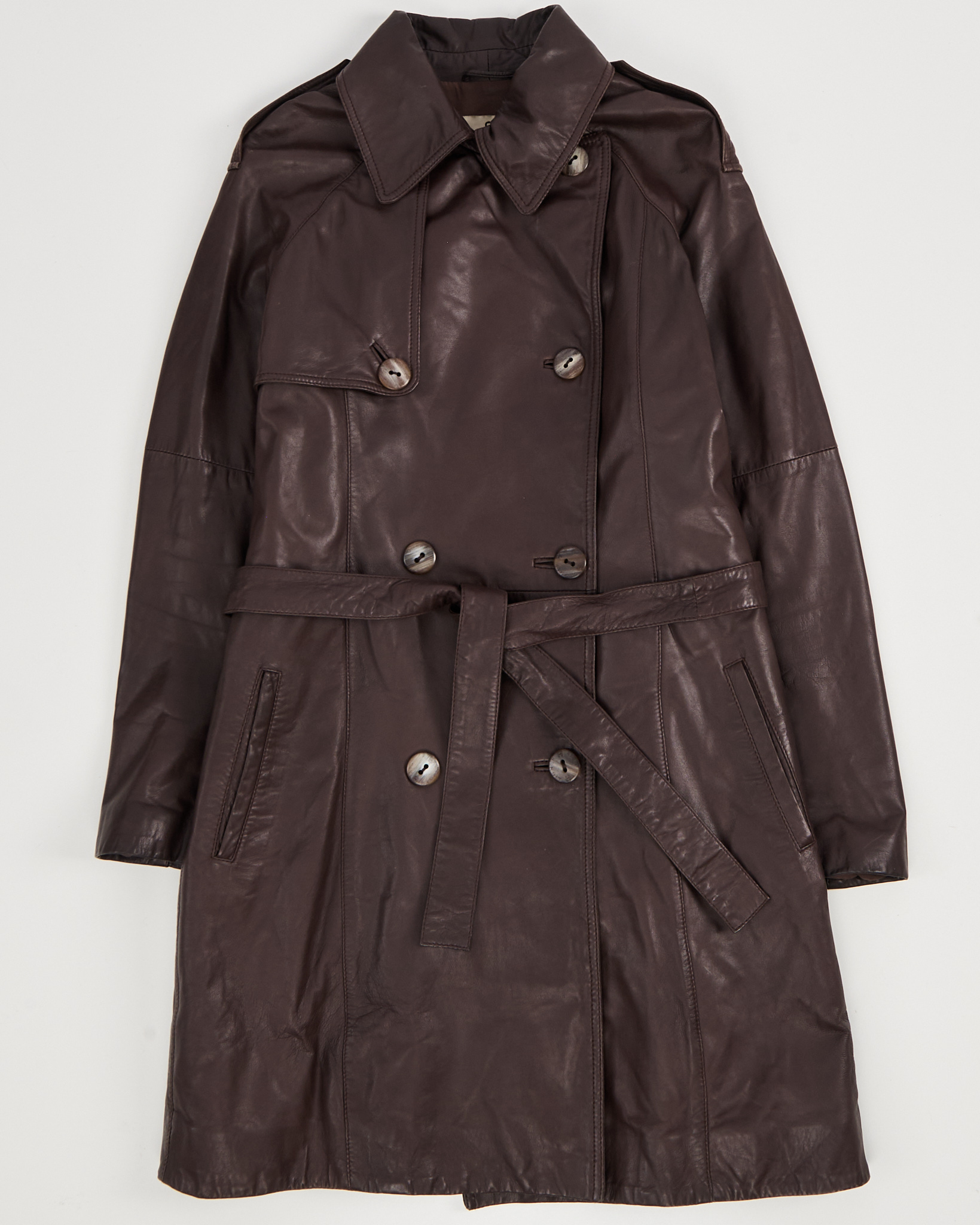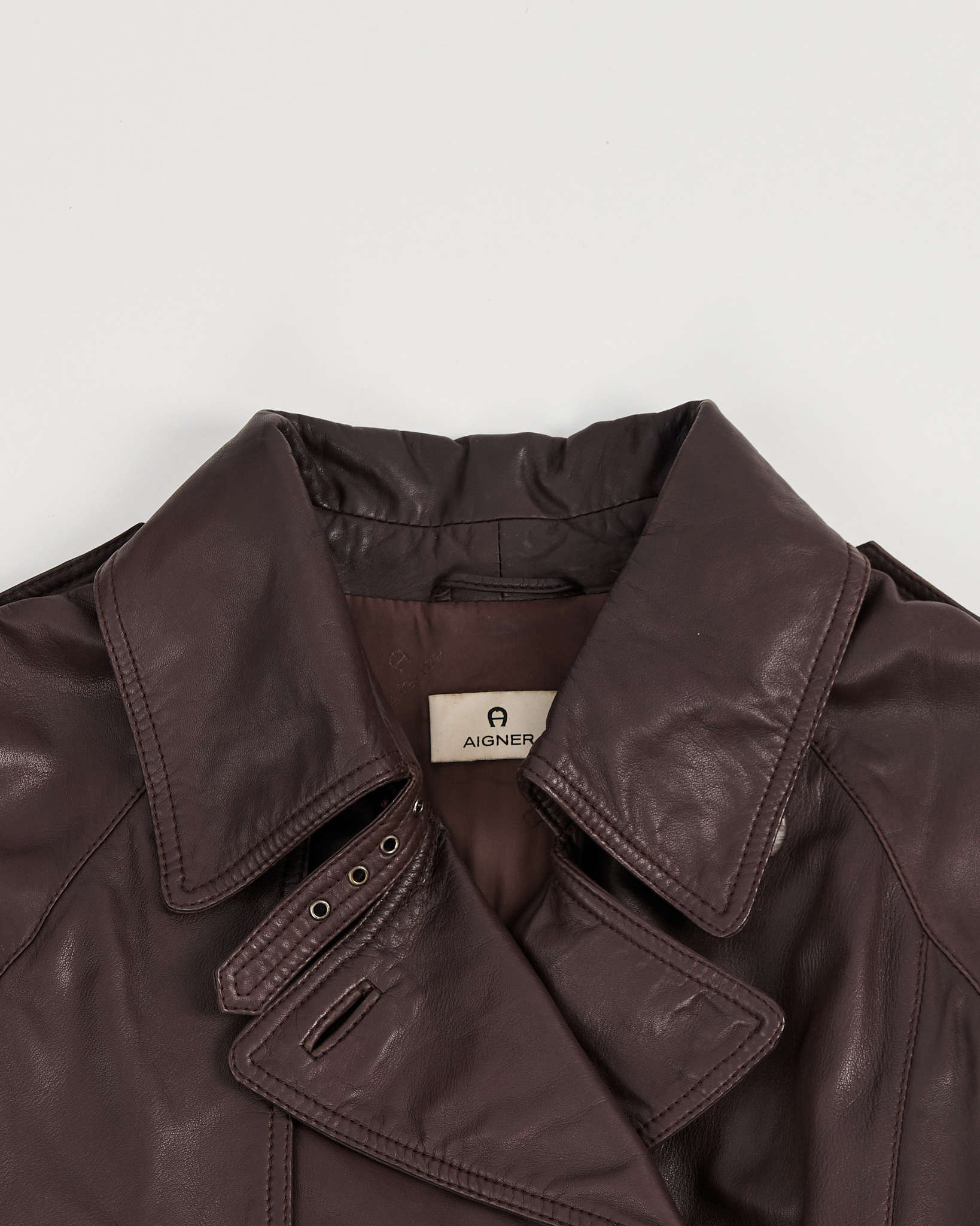 Кожаный тренч из плотной натуральной кожи глубокого шоколадного оттенка. Модель от бренда Aigner с фирменными пуговицами. Прямой крой с поясом. аккуратная посадка. Двубортная конструкция, широкий воротник и прорезные карманы.