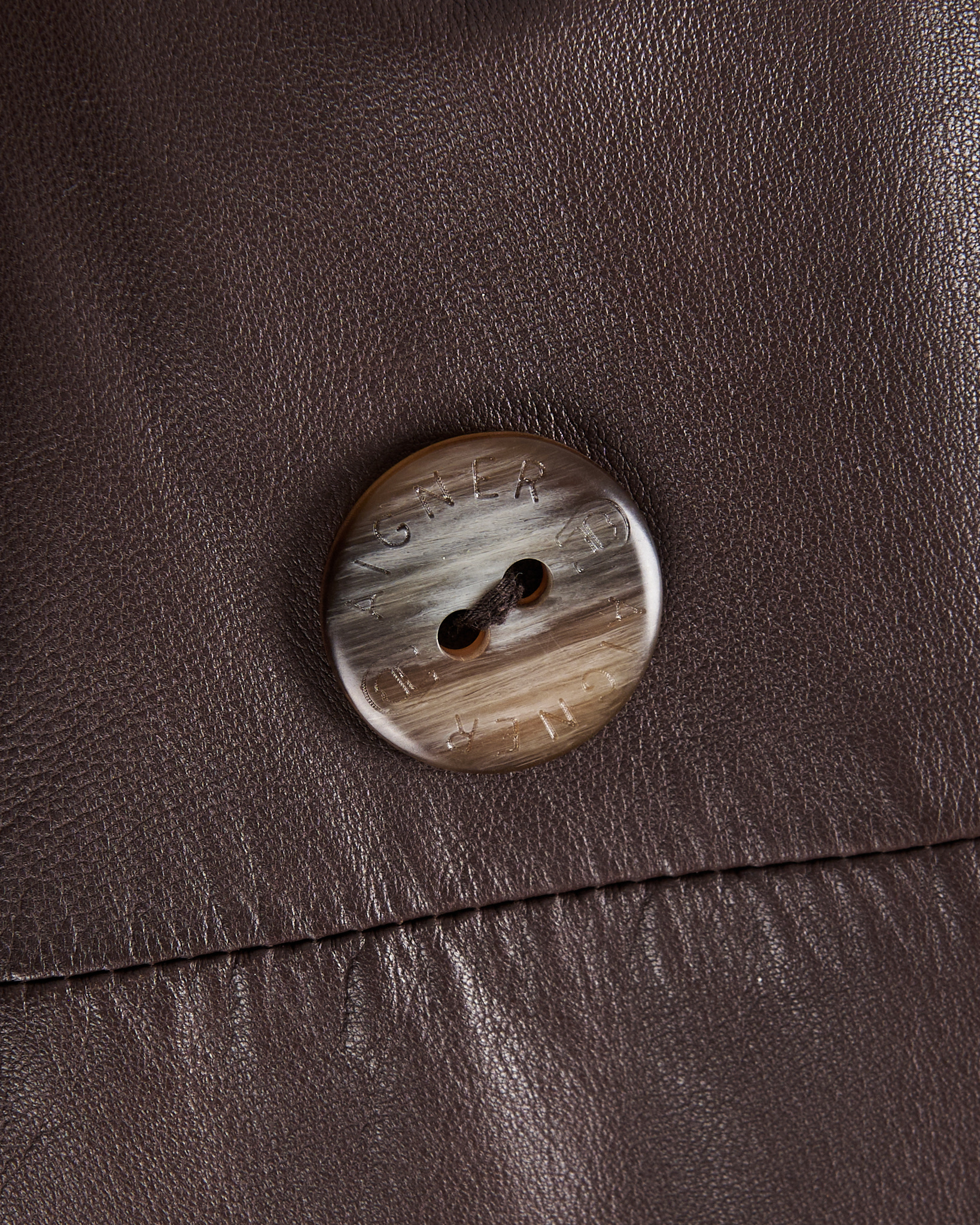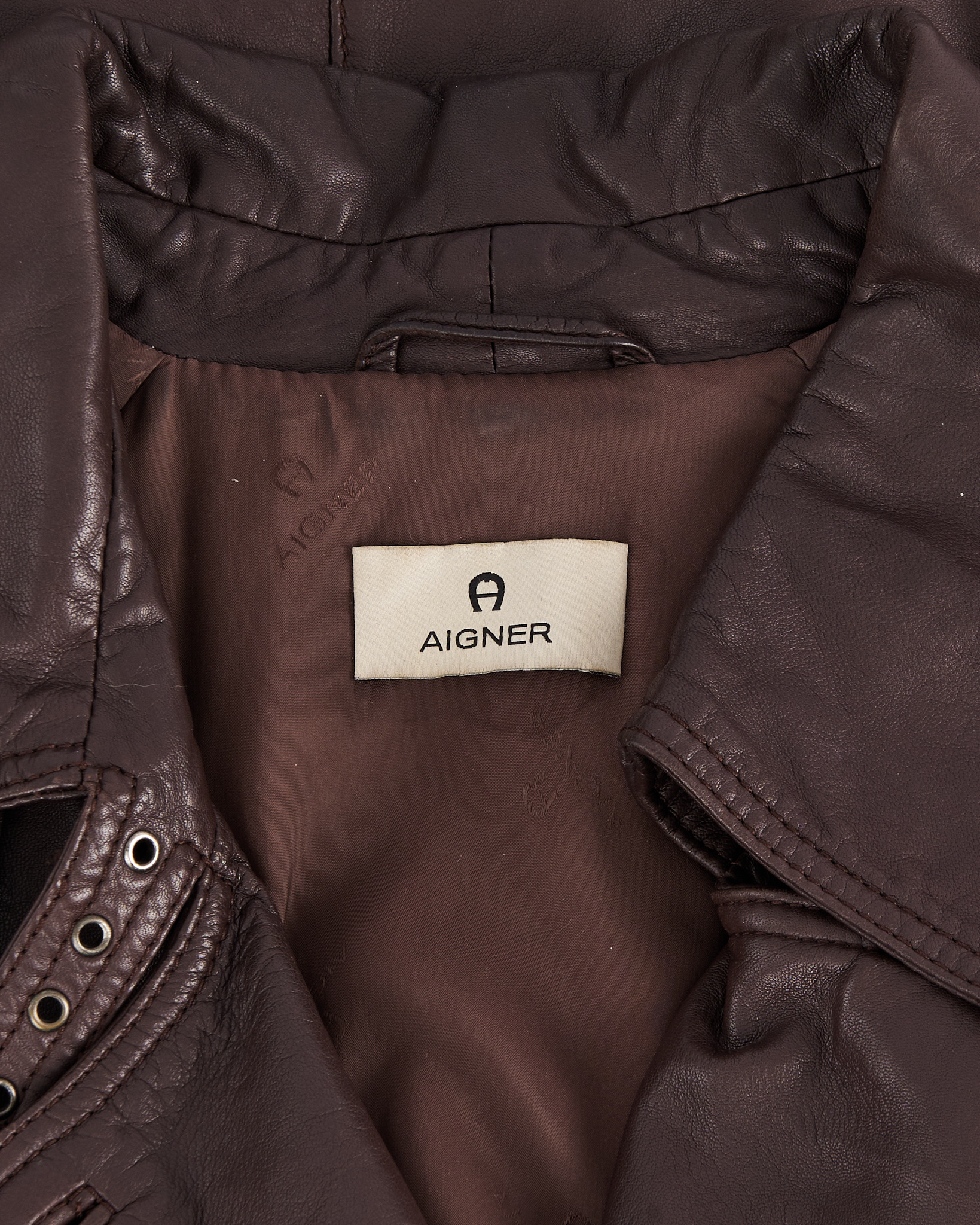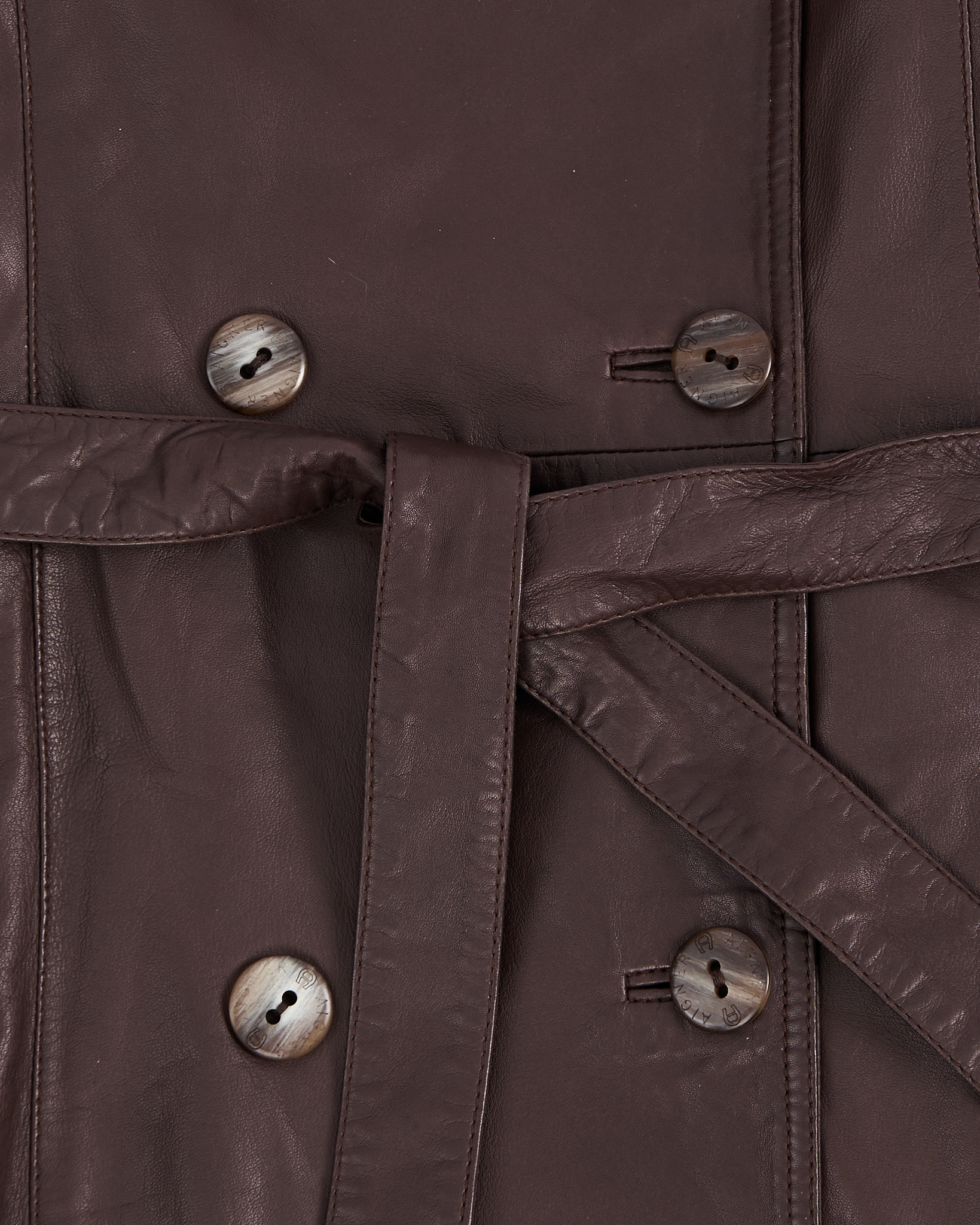 Кожаный тренч из плотной натуральной кожи глубокого шоколадного оттенка. Модель от бренда Aigner с фирменными пуговицами. Прямой крой с поясом. аккуратная посадка. Двубортная конструкция, широкий воротник и прорезные карманы.