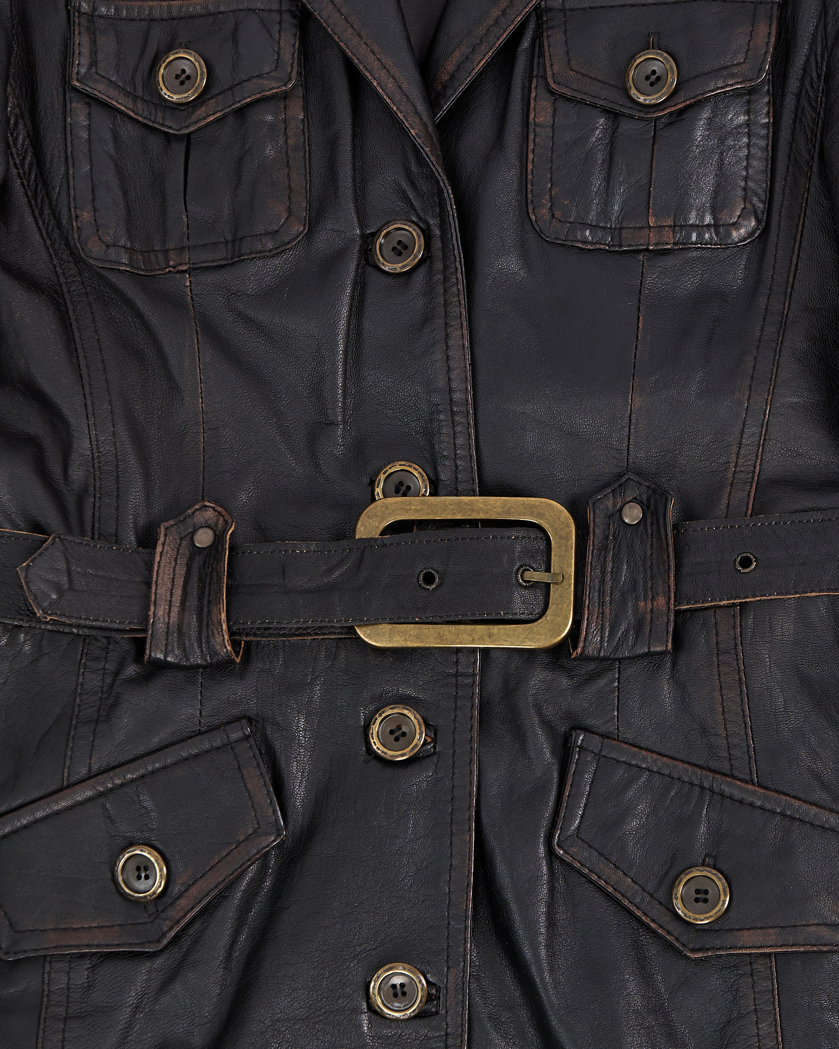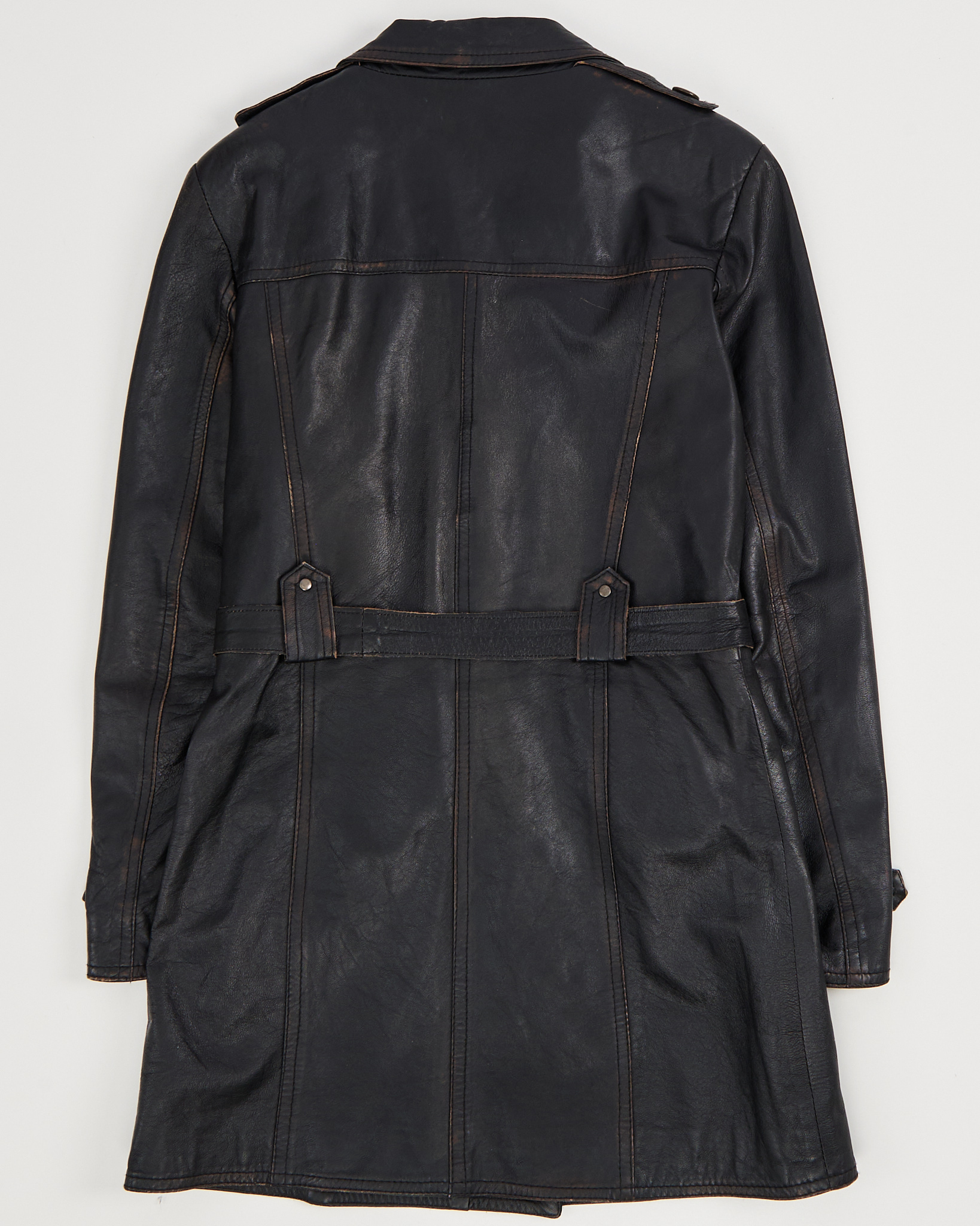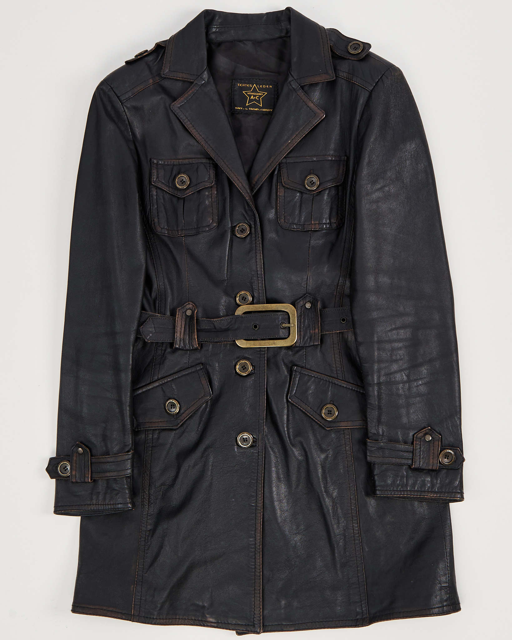 Тренч Vistagliano A+C из натуральной кожи с поясом. Плотная натуральная кожа с патиной, приталенная посадка. Пояс с массивной пряжкой позволяет регулировать объём. Качественная фурнитура, функциональные боковые карманы, фактурные швы.