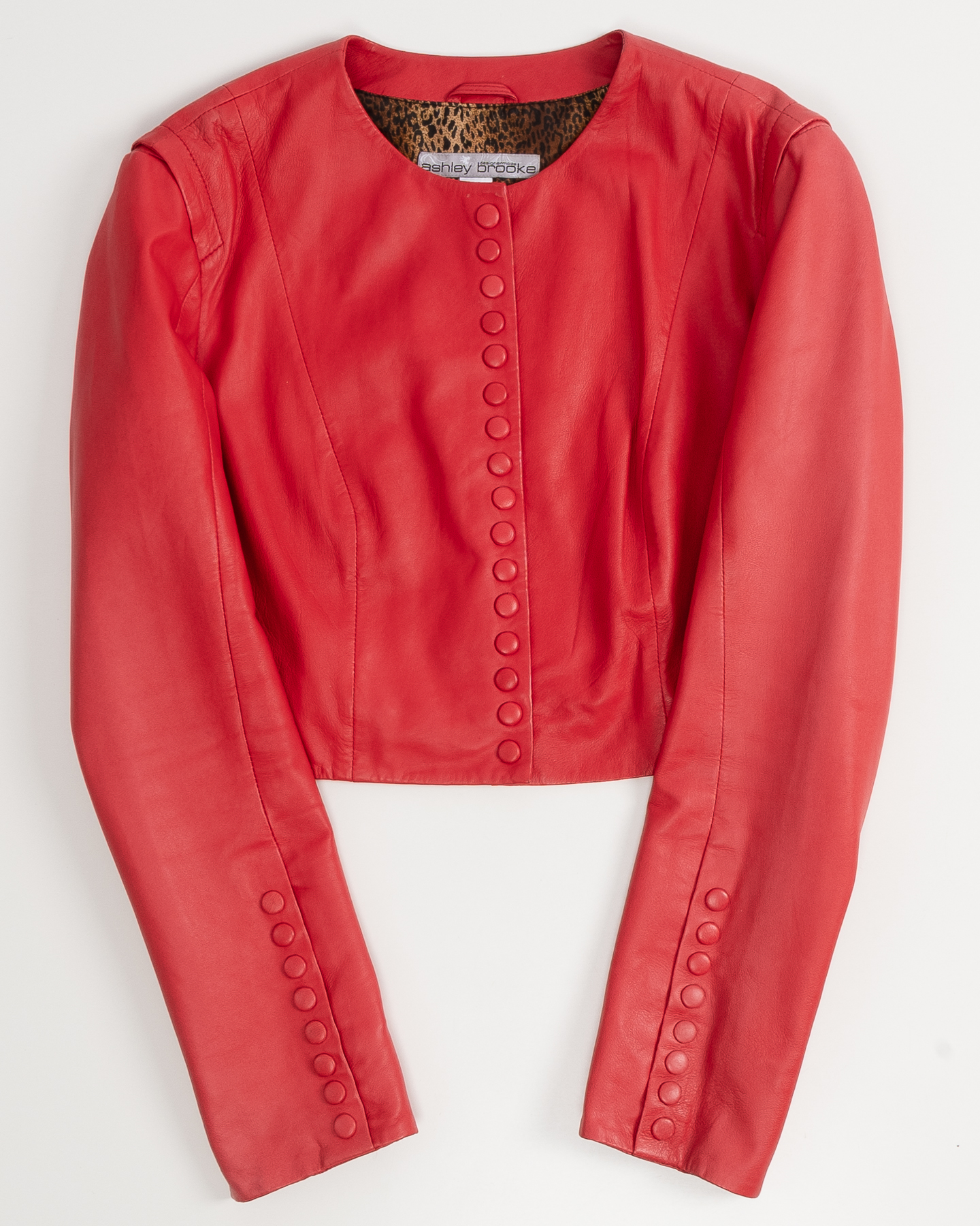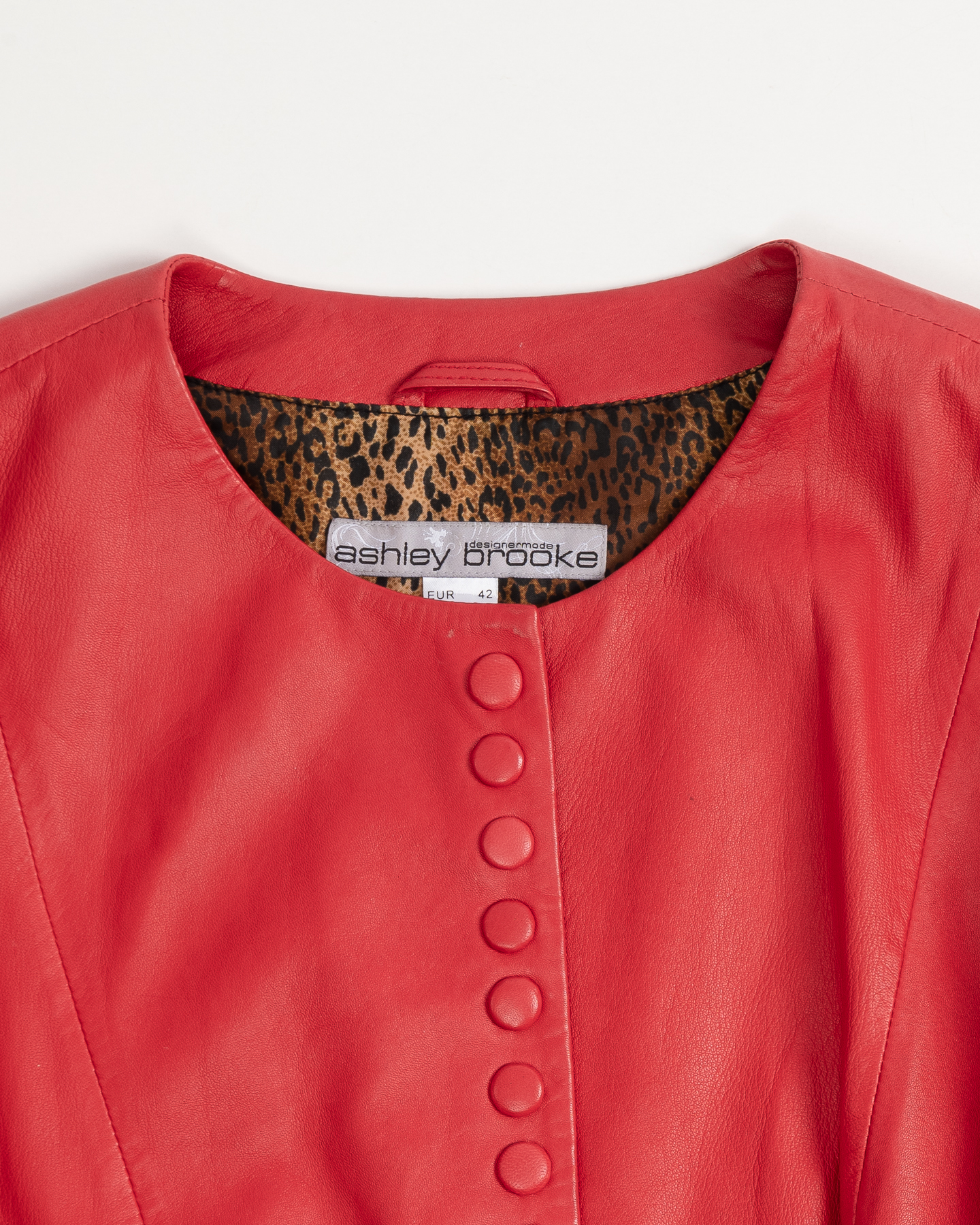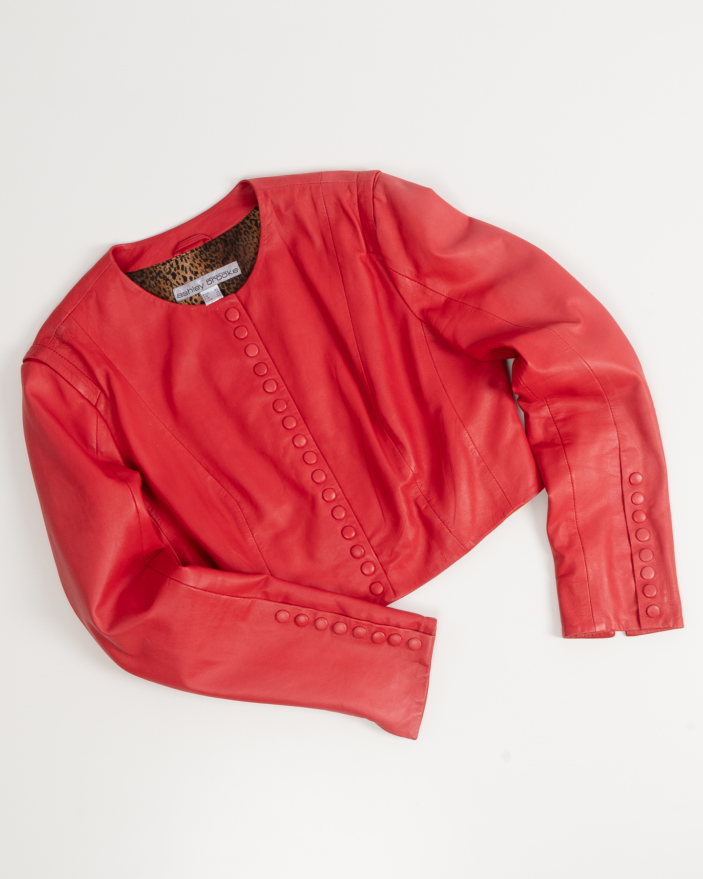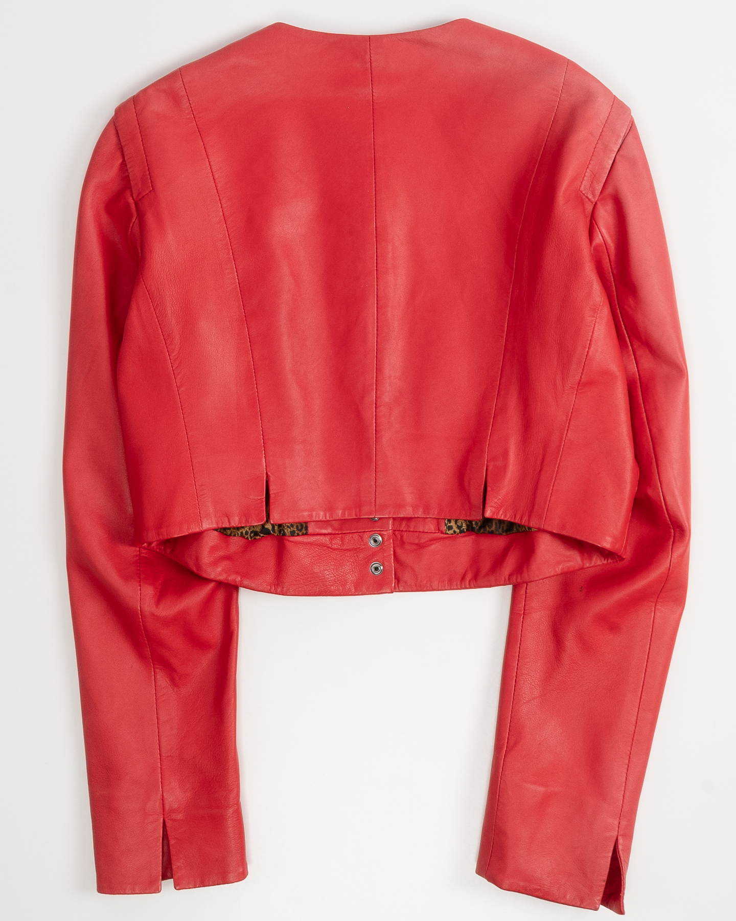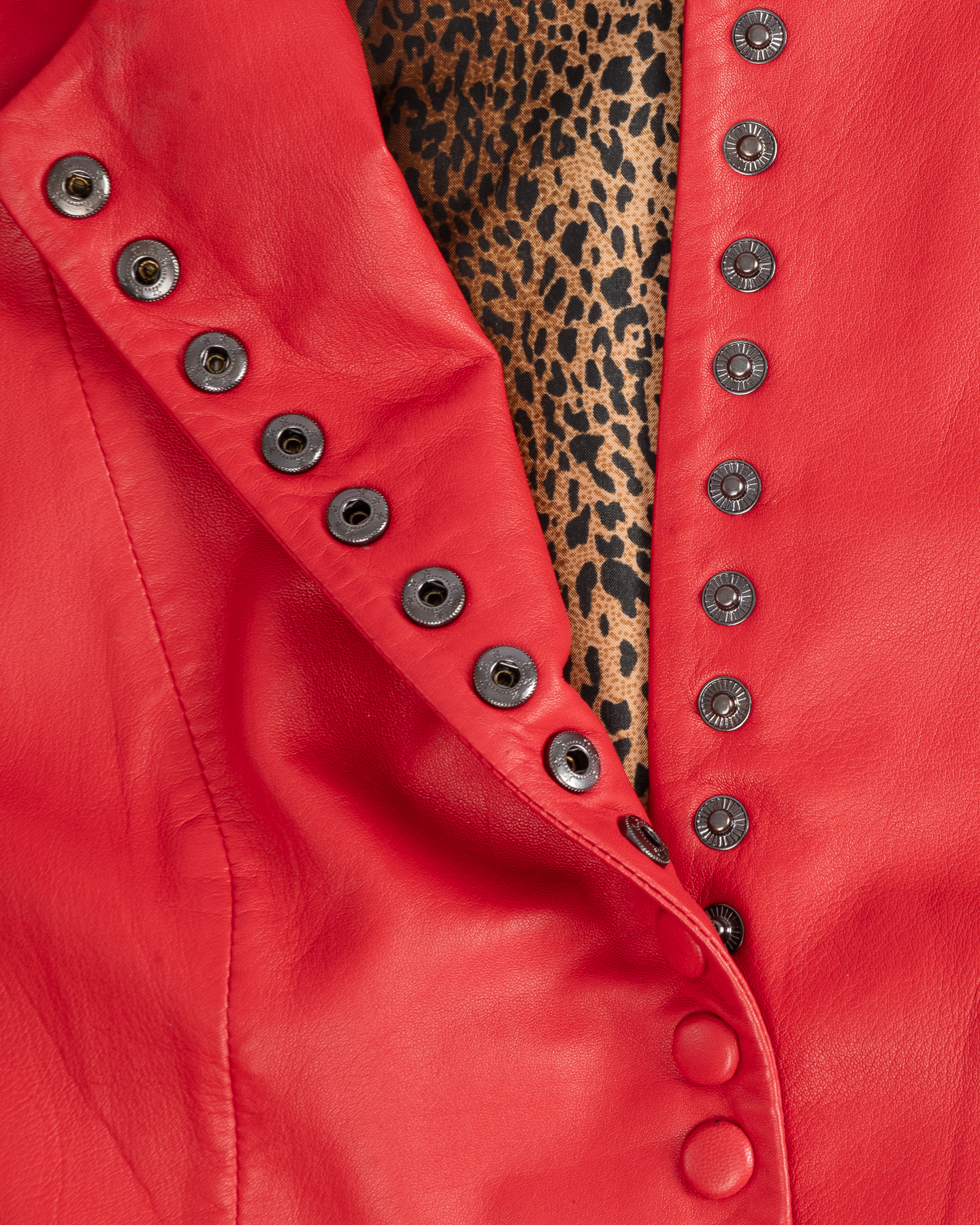 Выполнен из мягкой натуральной кожи кораллового оттенка с гладкой, слегка матовой фактурой.Внутри подкладка с анималистичным принтом.Облегающая посадка по фигуре, округлый вырез и ряд обтянутых пуговиц создают чёткий силуэт с акцентом на линии плеч.