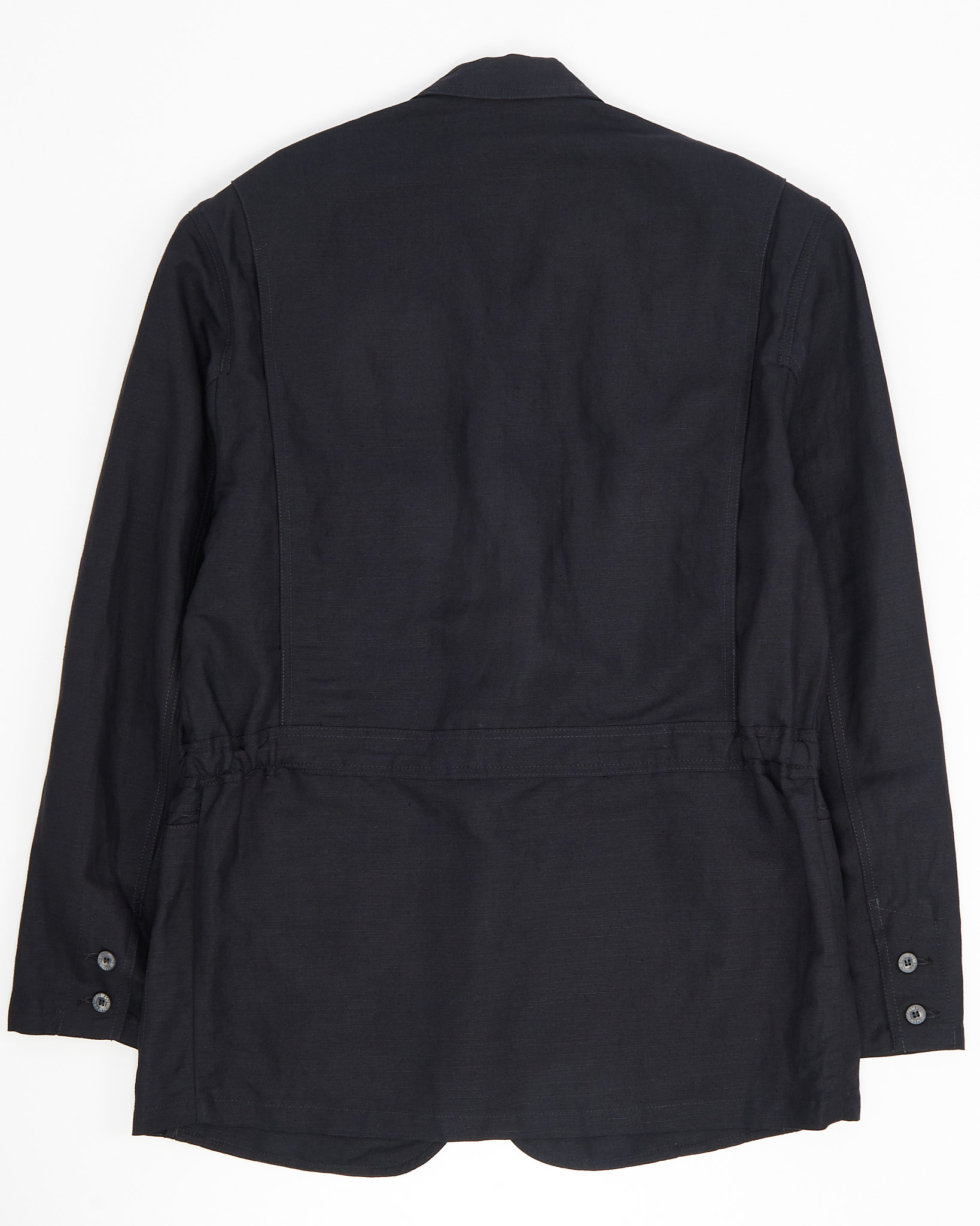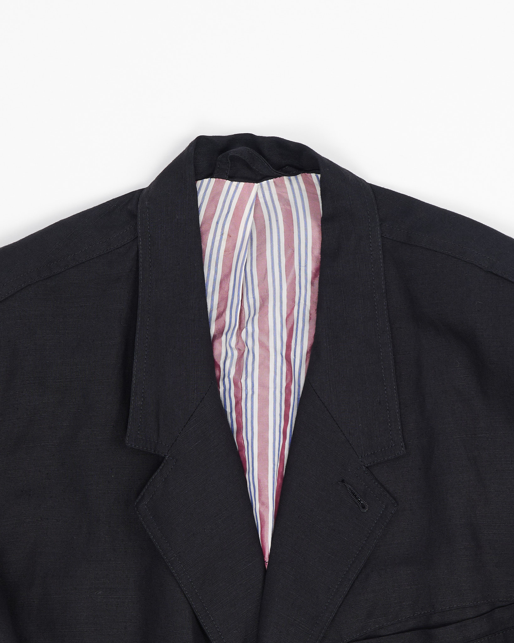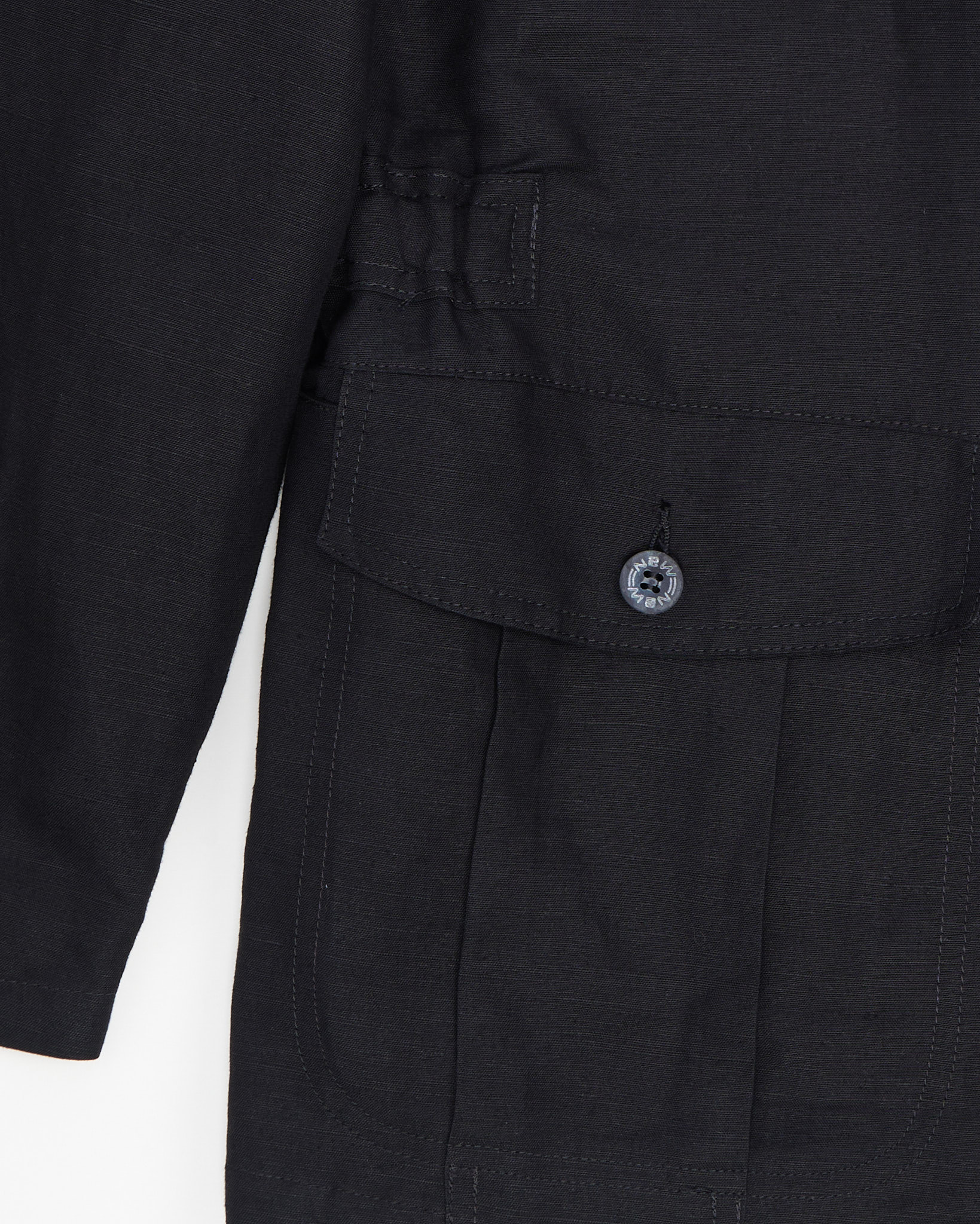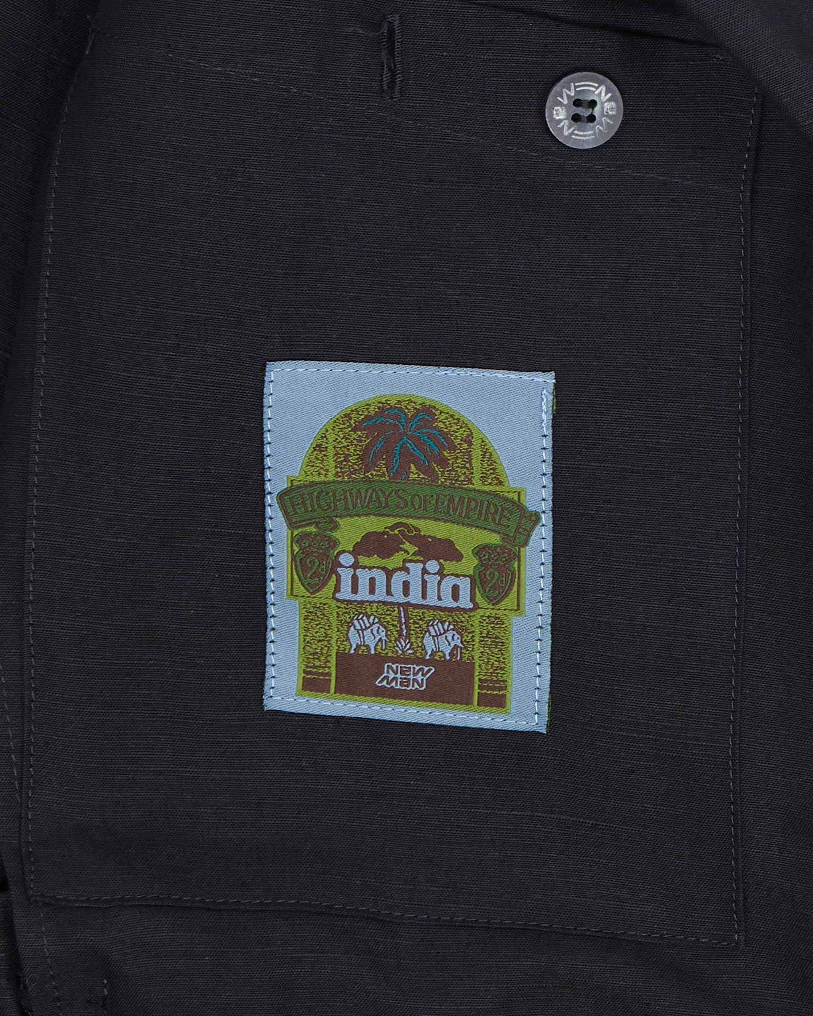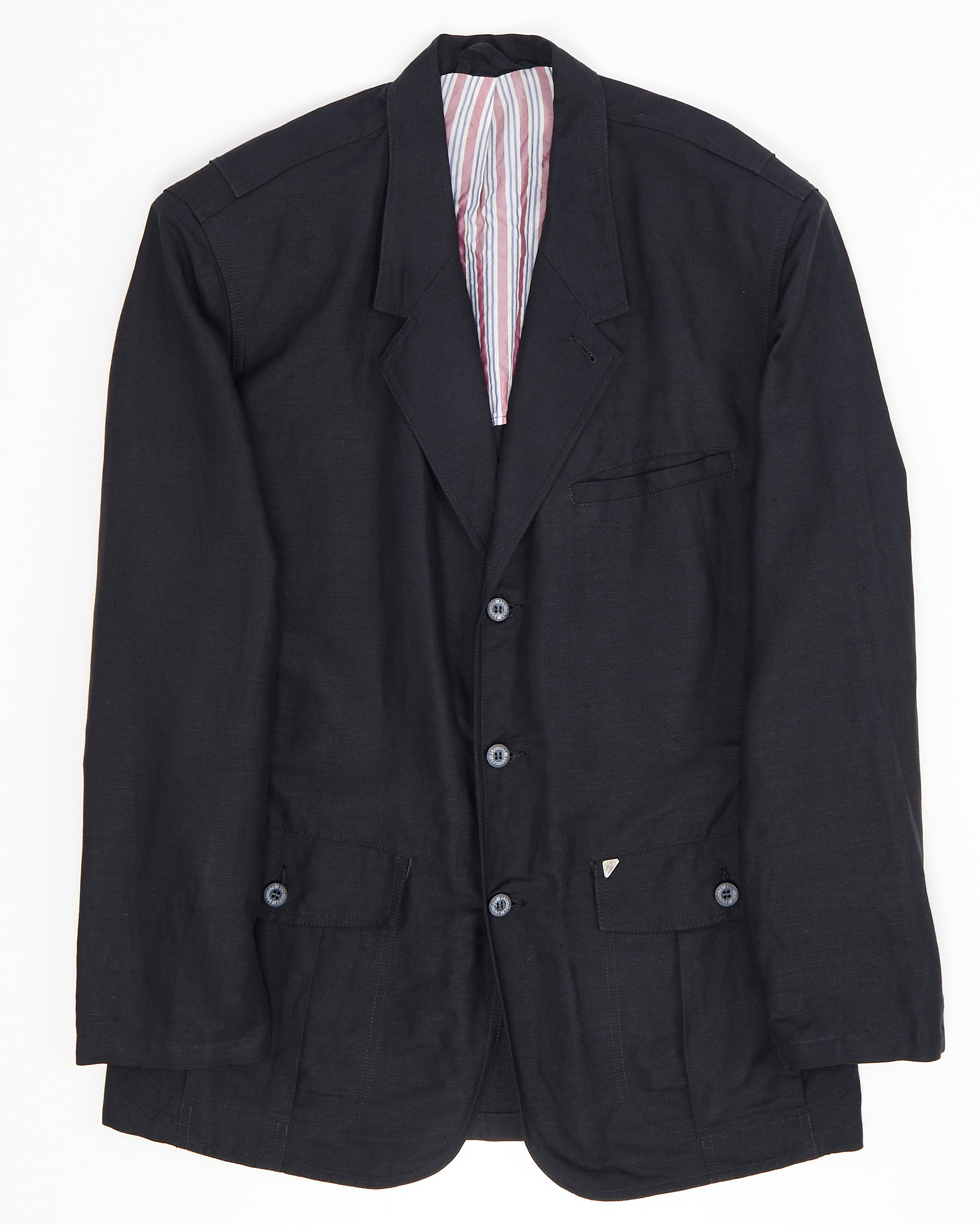 Пиджак New Man из плотного льна тёмного оттенка. Материал фактурный и приятный на ощупь, посадка свободная, силуэт прямой. Накладные карманы с клапанами и крупные пуговицы, внутри контрастная подкладка в полоску и фирменная нашивка India. Сделано во Франции.