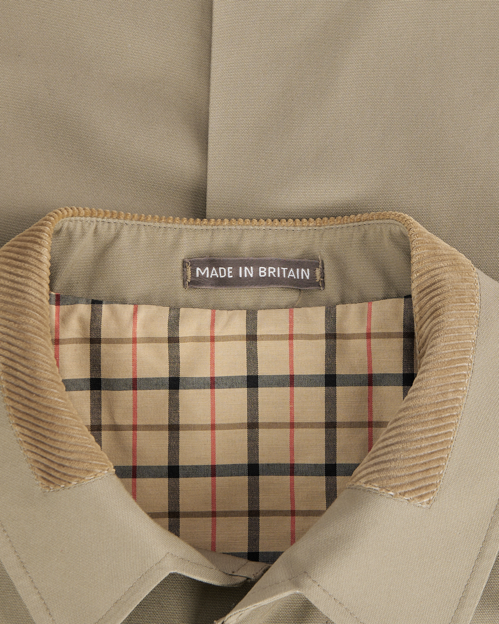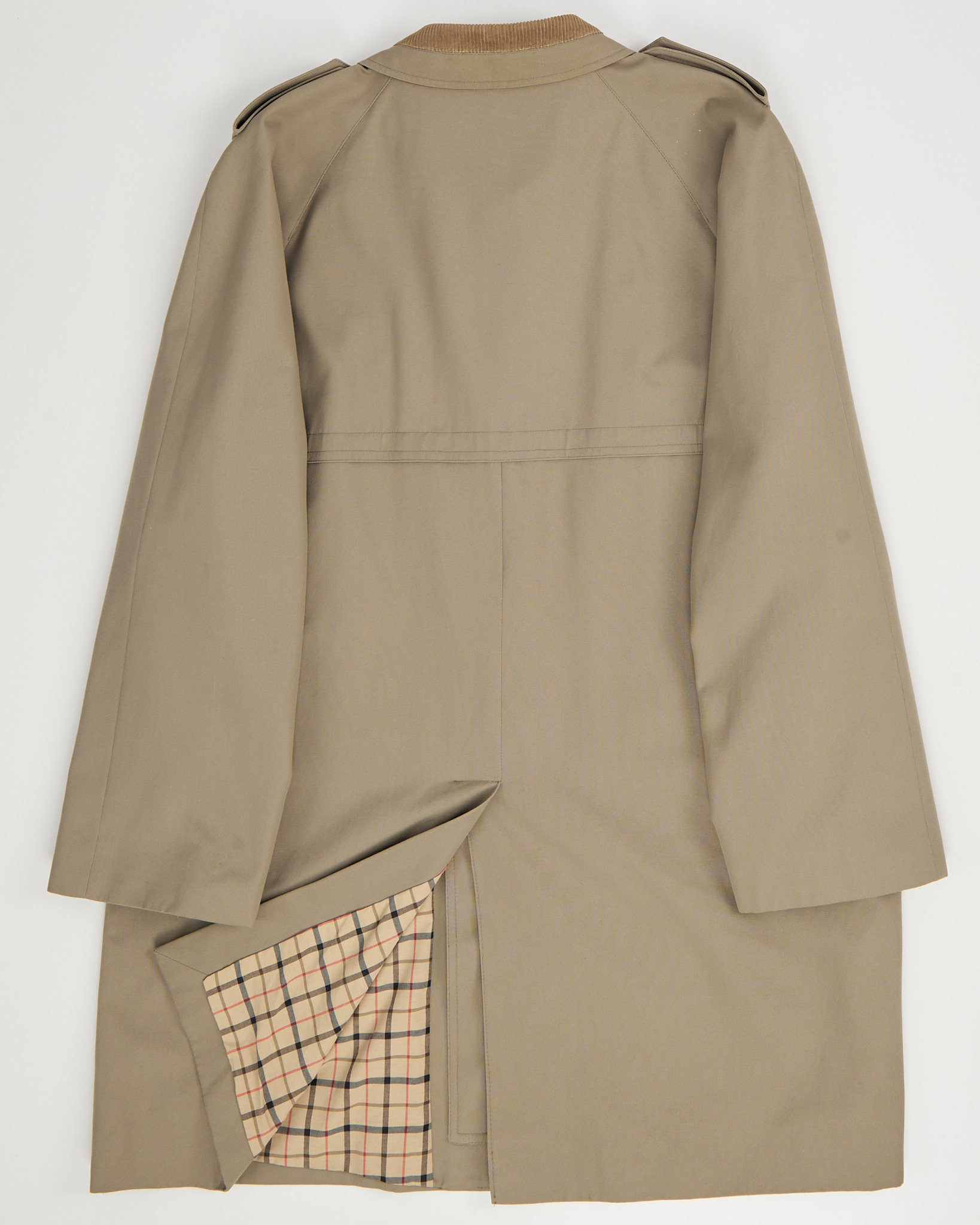 Плащ из плотной хлопковой ткани оливкового оттенка. Посадка свободная, силуэт прямой и аккуратный. Внутри контрастная подкладка в клетку, воротник из вельвета и крупные карманы.