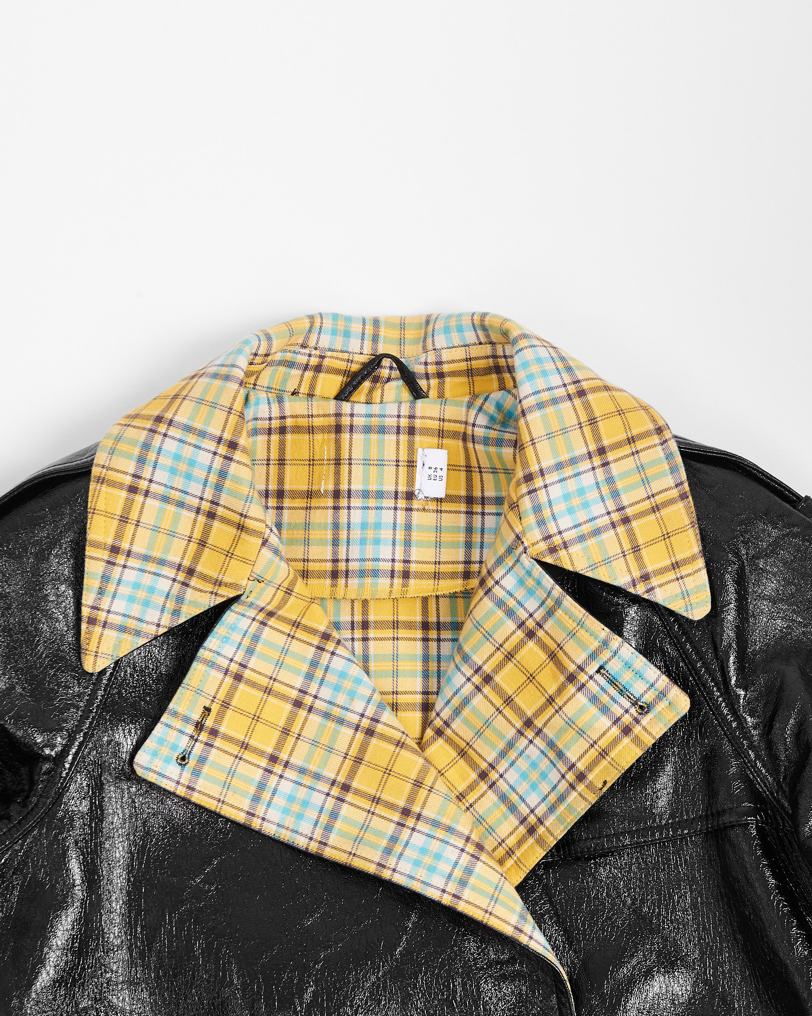 Фактурный винтажный плащ с контрастным воротником. Искусственная кожа с жатым эффектом, прямой фасон, широкий пояс в комплекте позволяет легко регулировать объем в талии. Контрастный воротник в желтую клетку, акцентные лацканы и функциональные карманы по бокам.