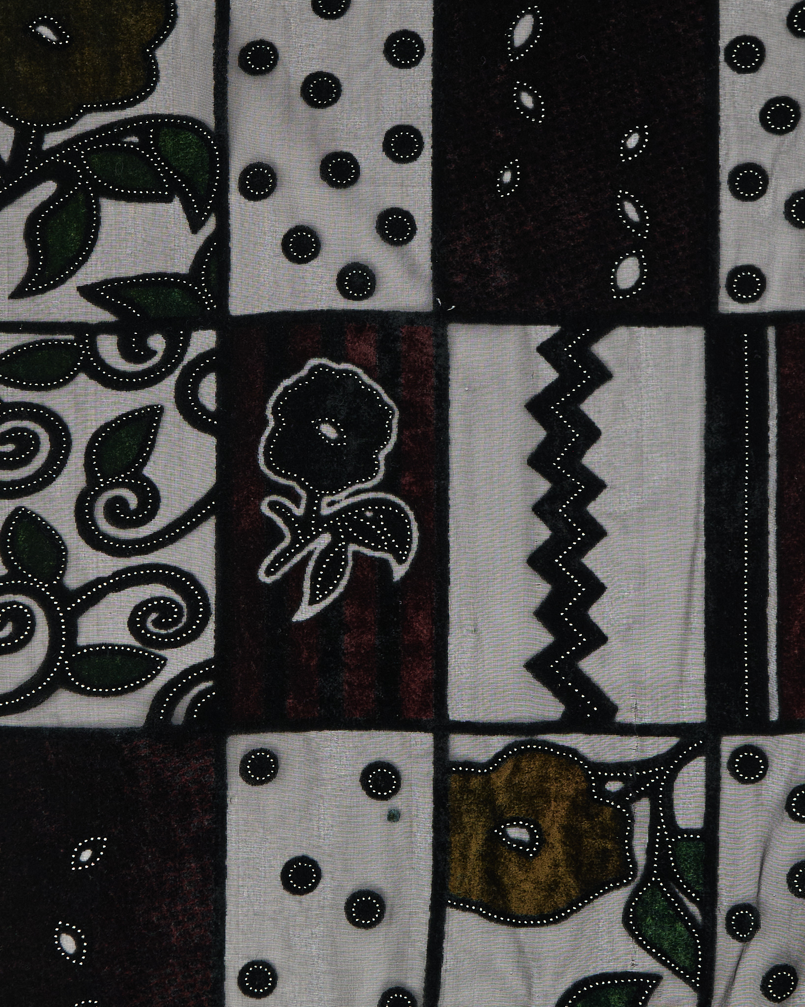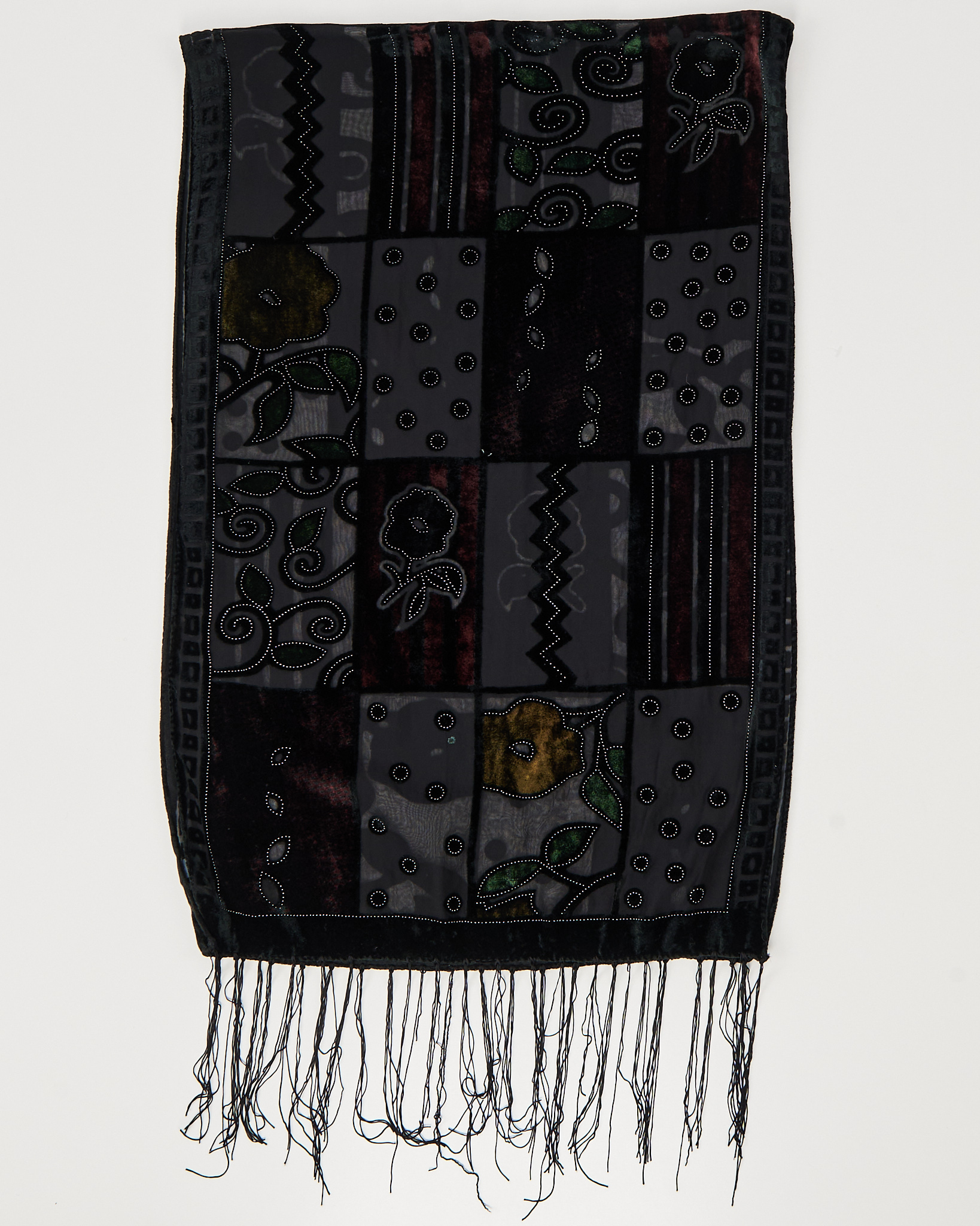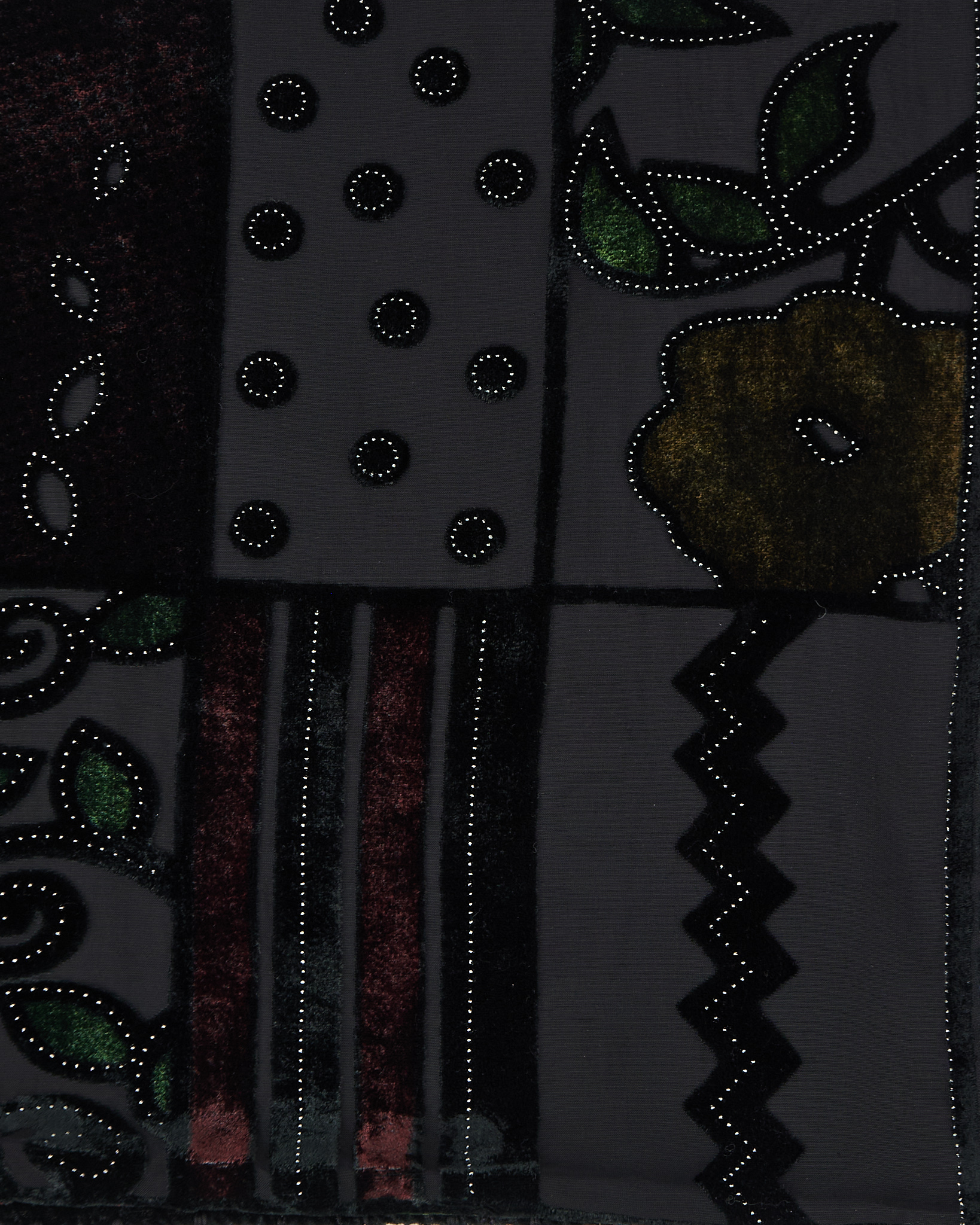 Платок из шелка и вискозы с графичным орнаментом в глубоких тёмных оттенках. Детали рисунка и контраст фактур придают акцент.