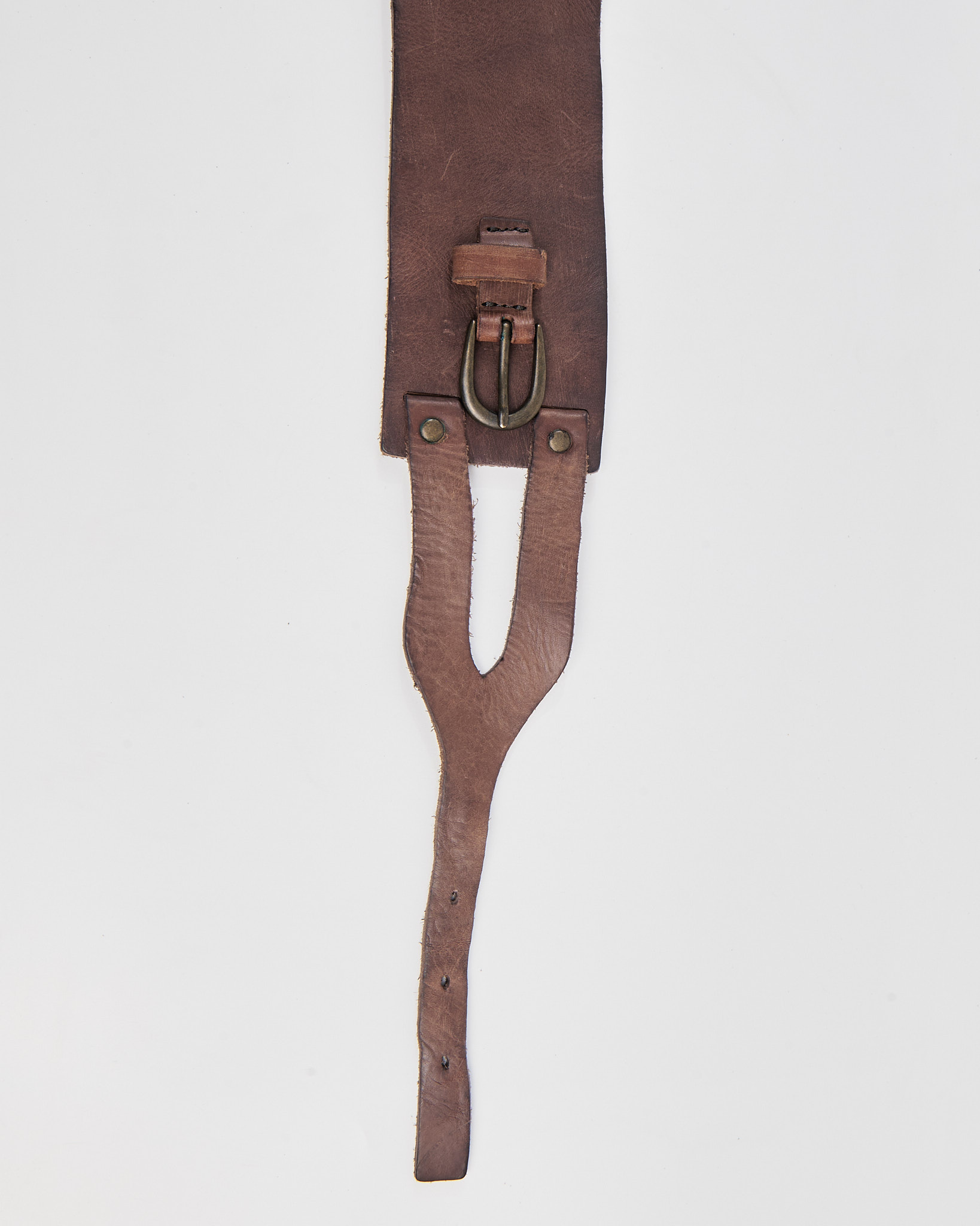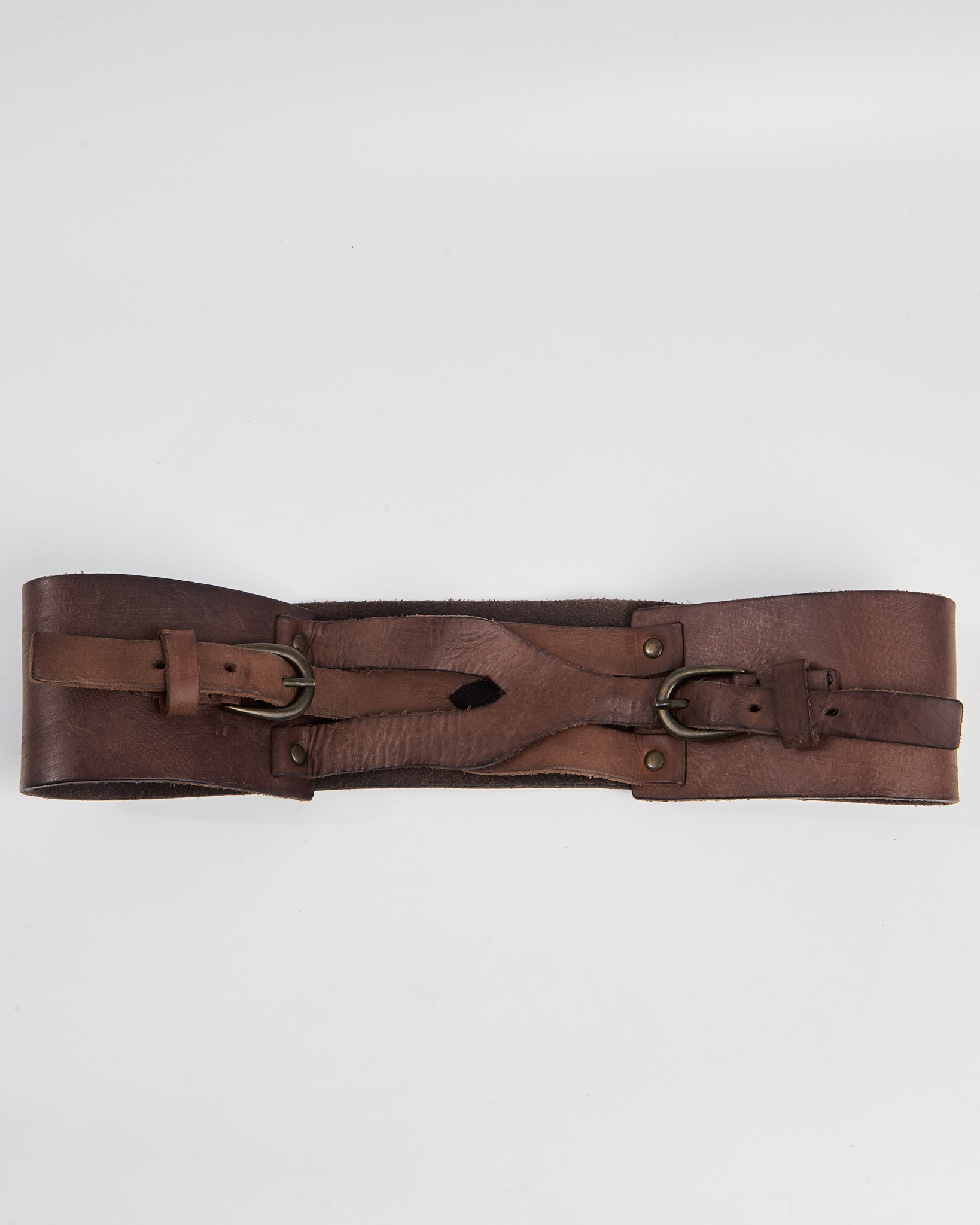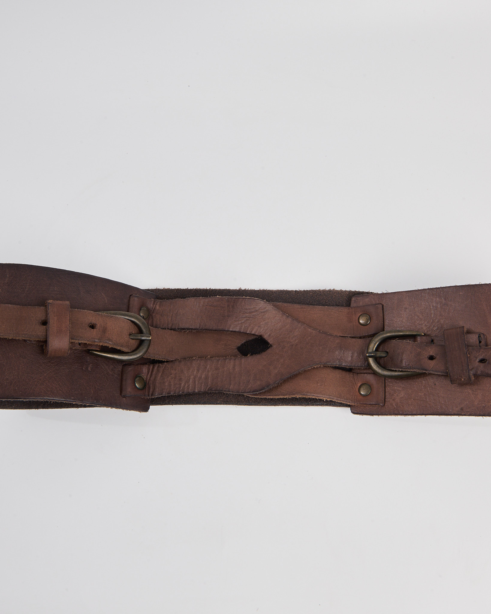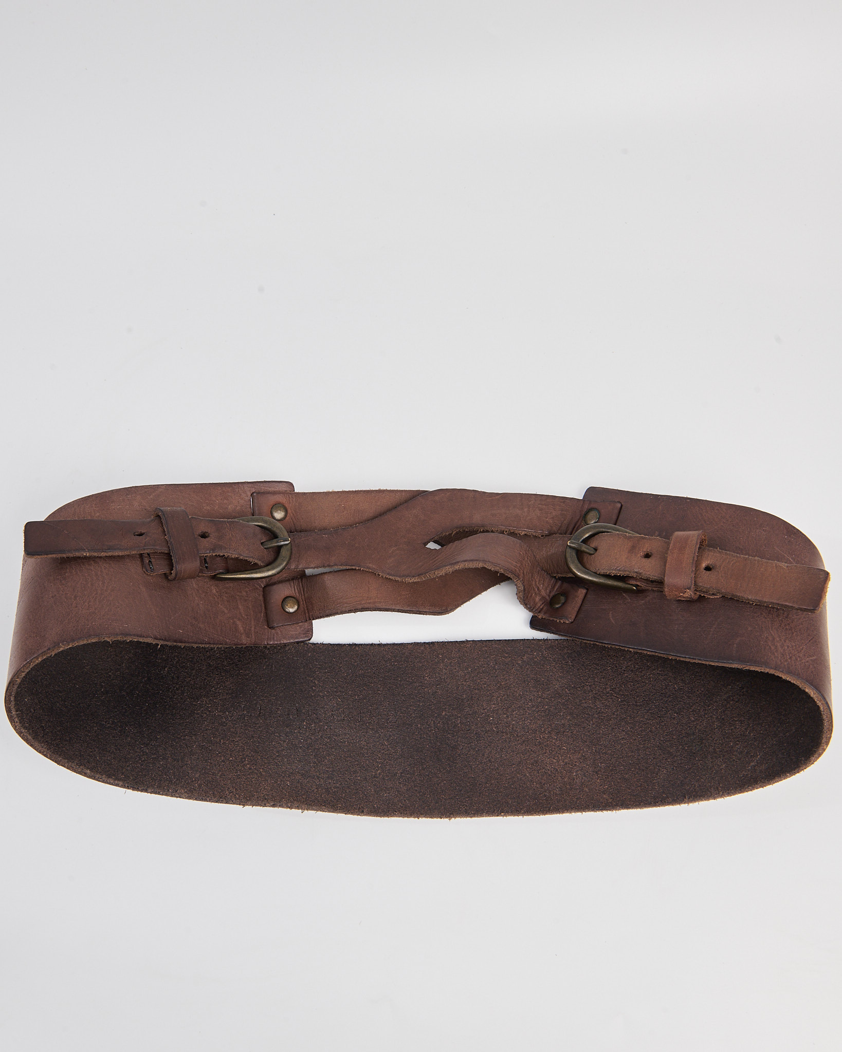 Широкий кожаный пояс с двойной пряжкой. Пояс из плотной натуральной кожи, металлические пряжки с патиной, асимметричная форма центральной части.
