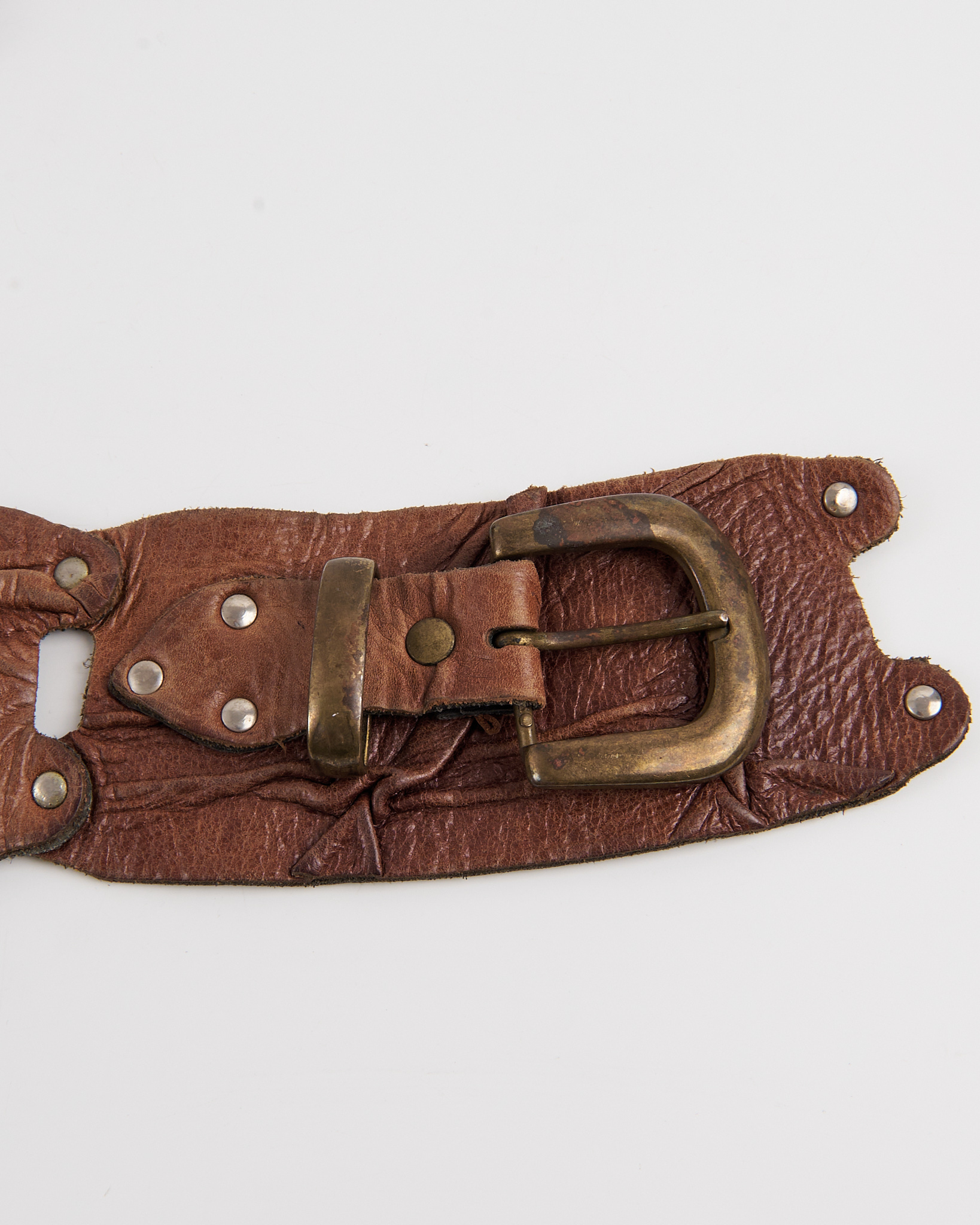 Ремень из плотной натуральной кожи теплого коричневого оттенка. Ремень плотно фиксируется на талии и формирует выразительную линию силуэта. Металлическая пряжка с эффектом состаренного металла и декоративные заклепки.