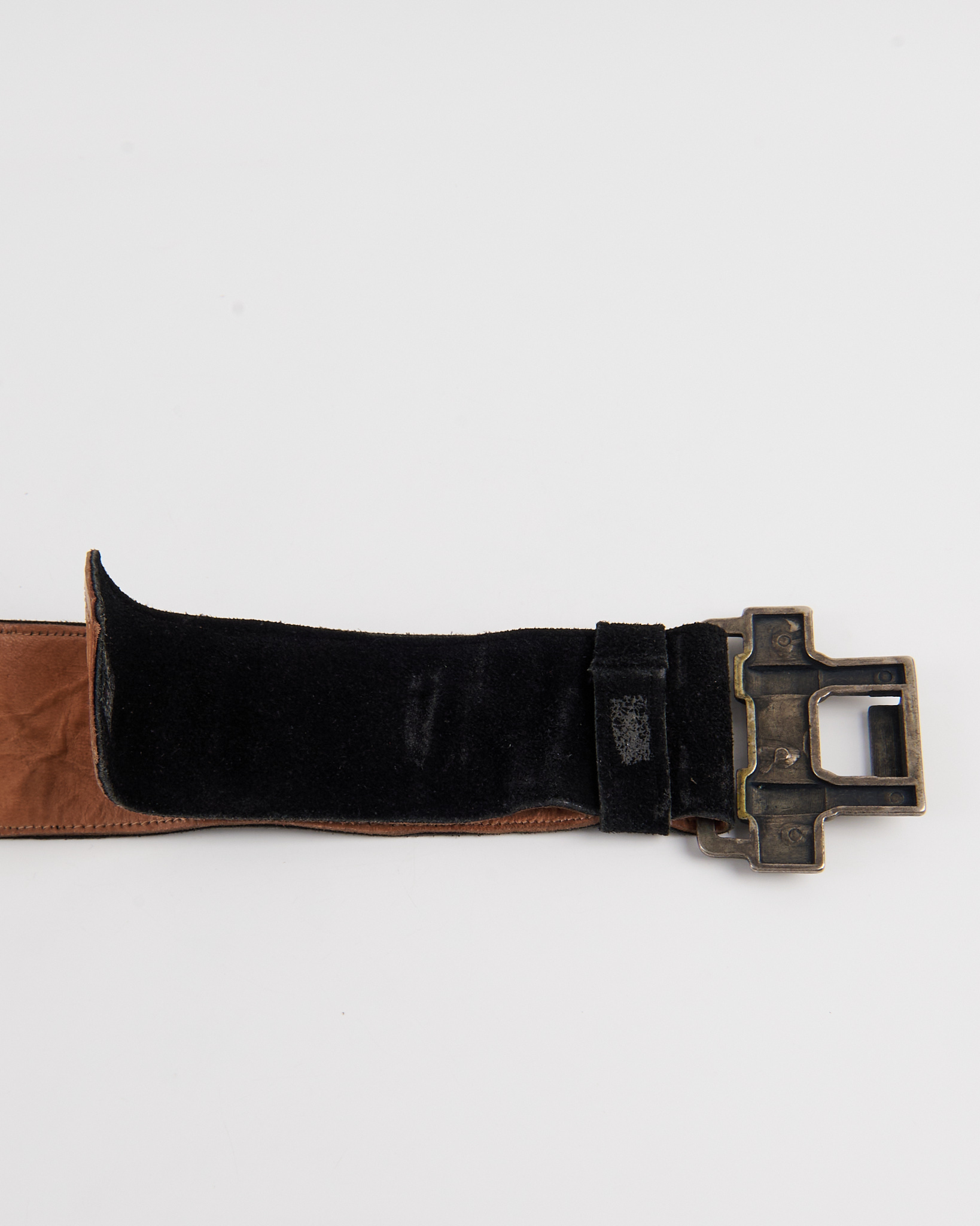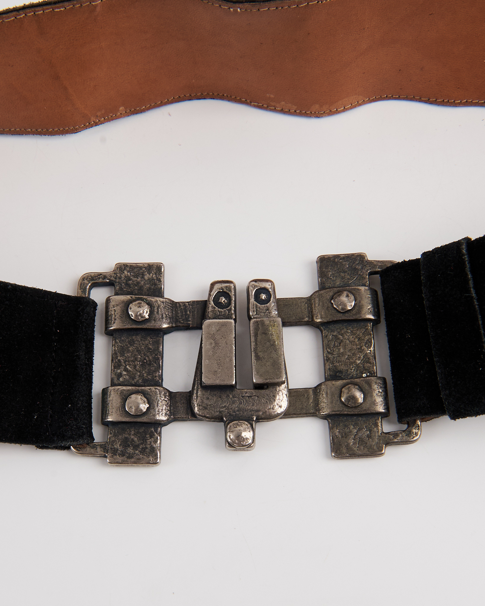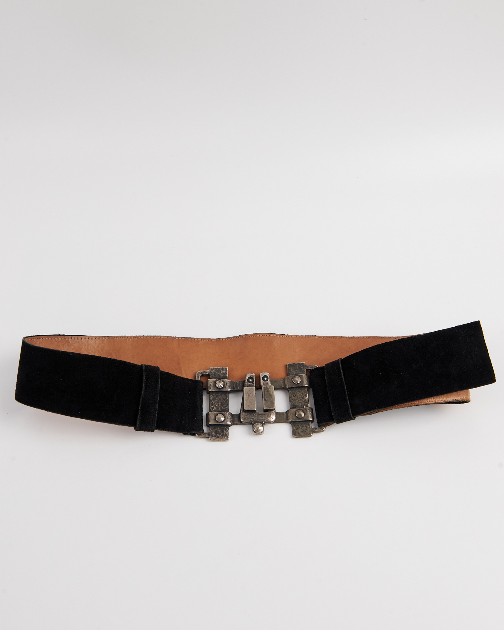 Пояс из натуральной замши с металлической пряжкой. Широкий пояс уверенно сидит на талии, массивная металлическая пряжка придает акцент.