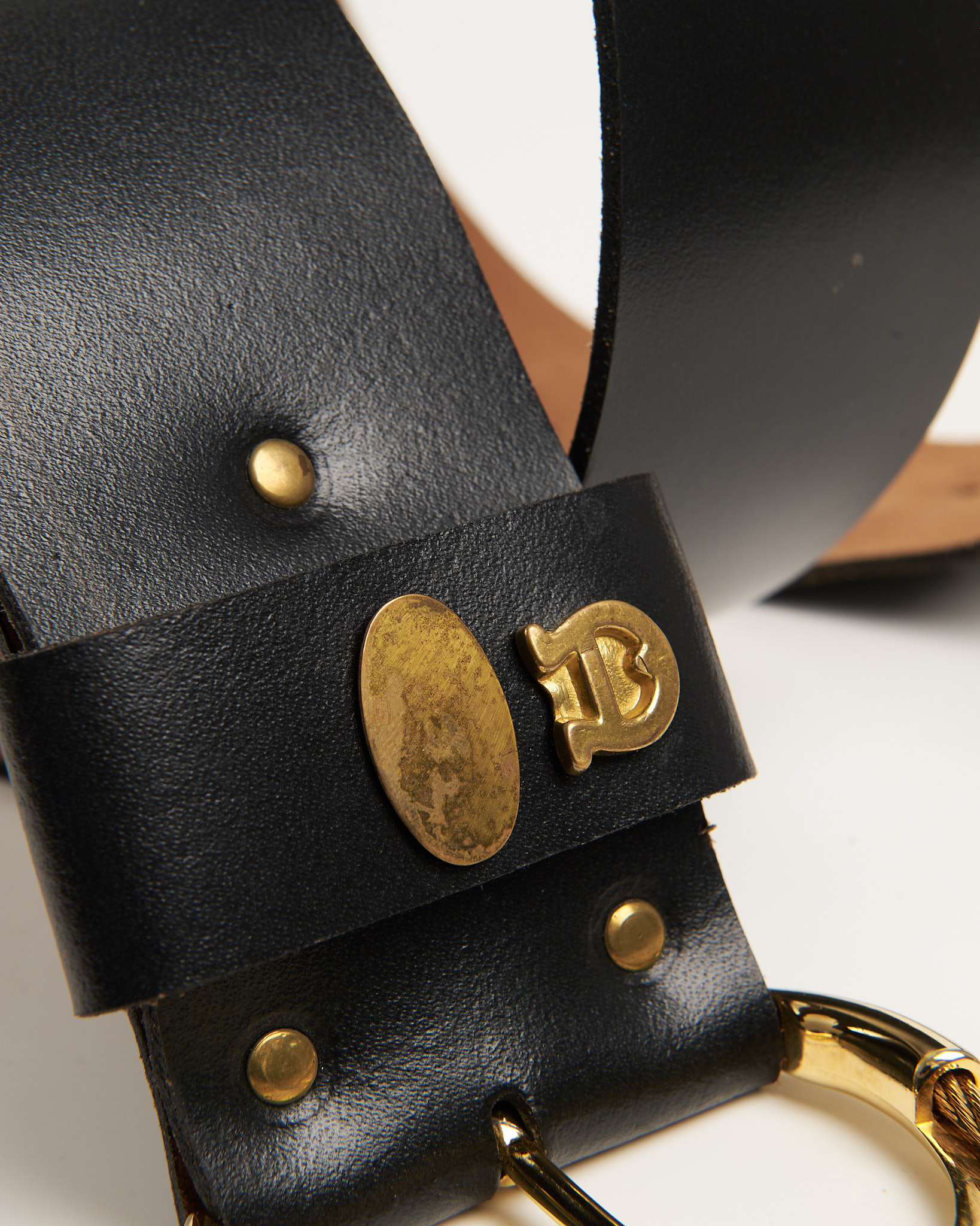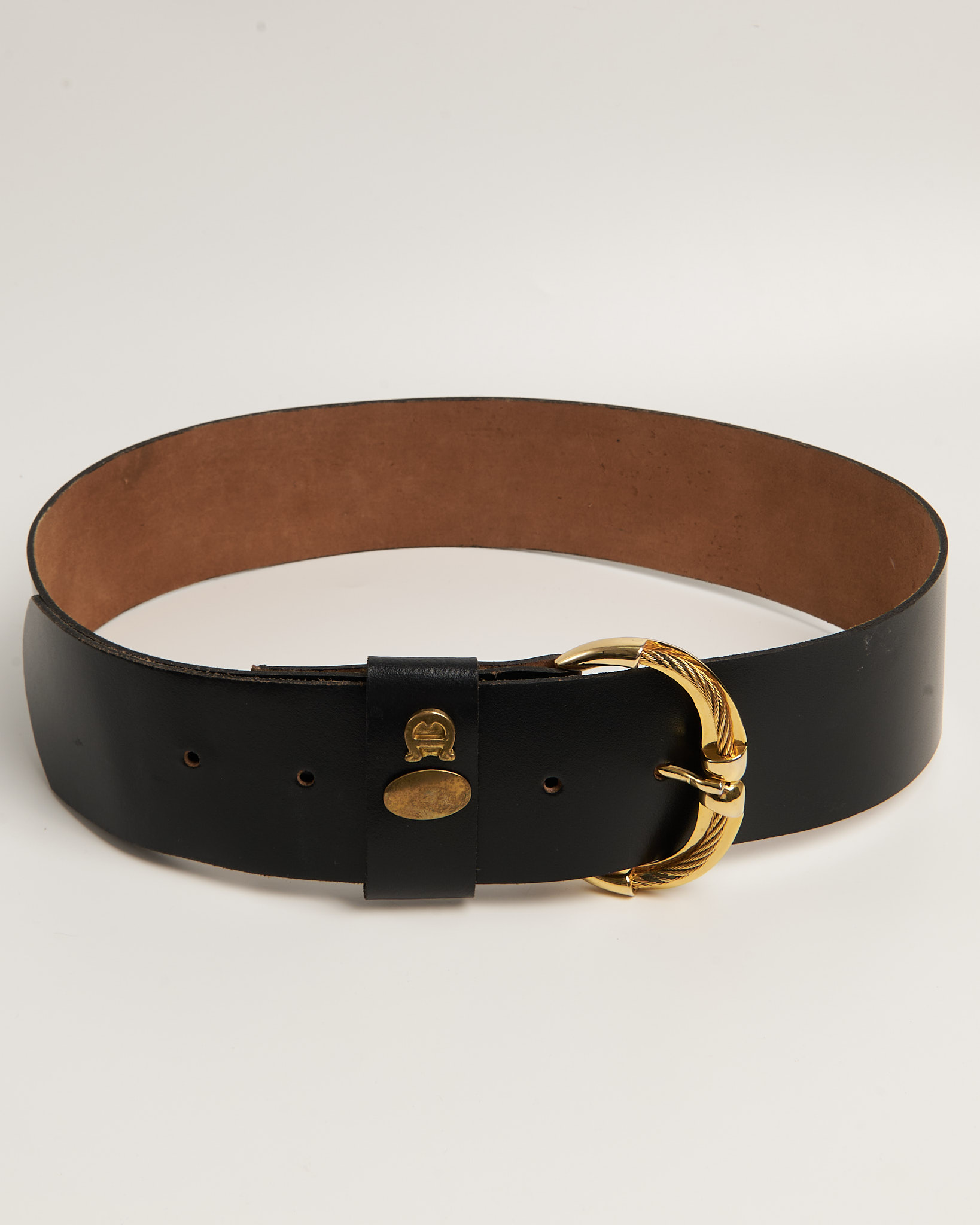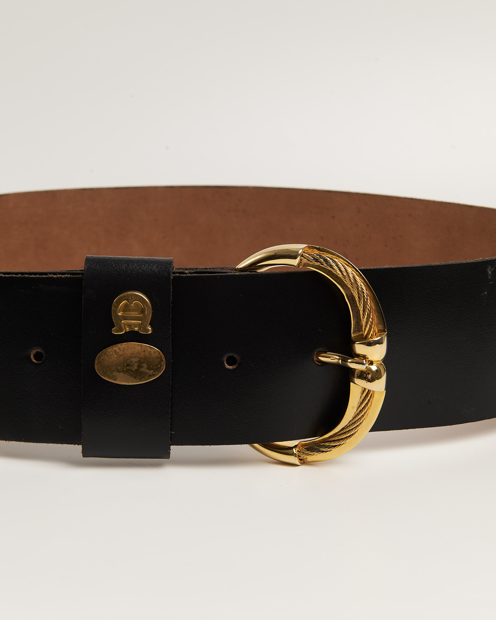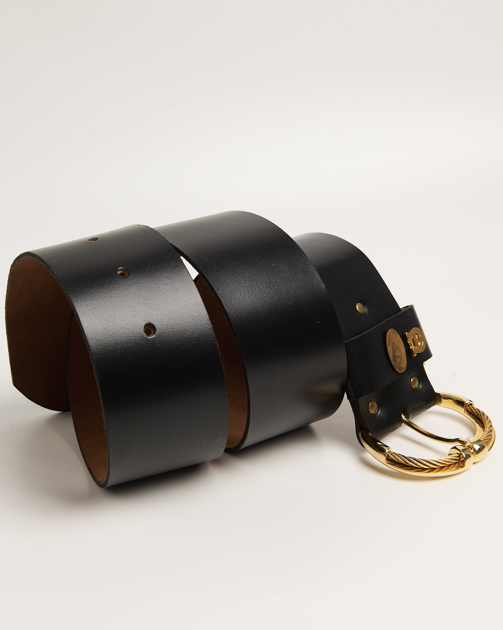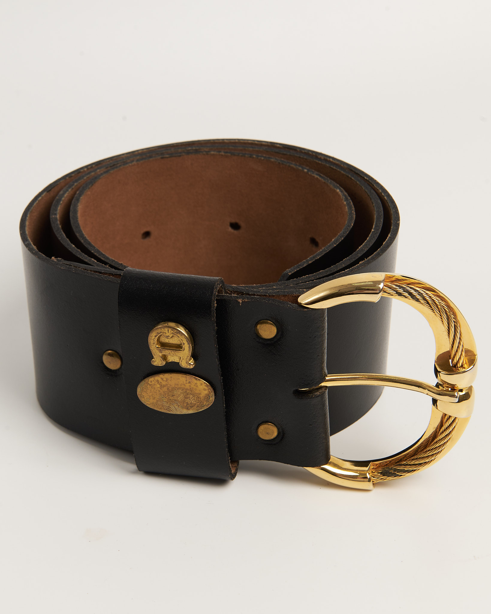 Акцентный ремень из 100% натуральной кожи. Массивная витая пряжка и металлическая накладка в виде фирменной подковы. Золотистая фурнитура с легкой патиной.