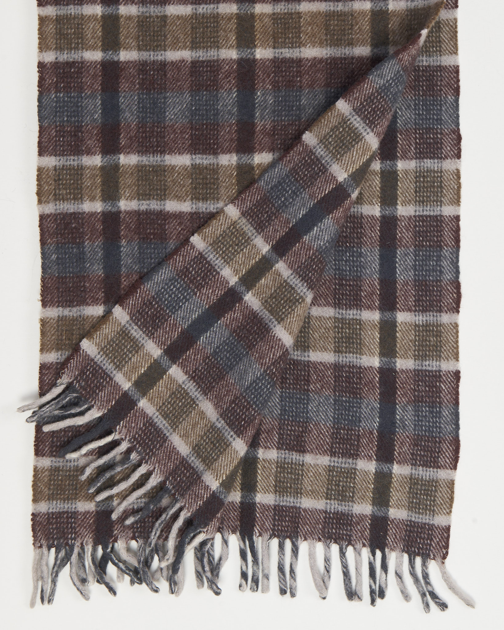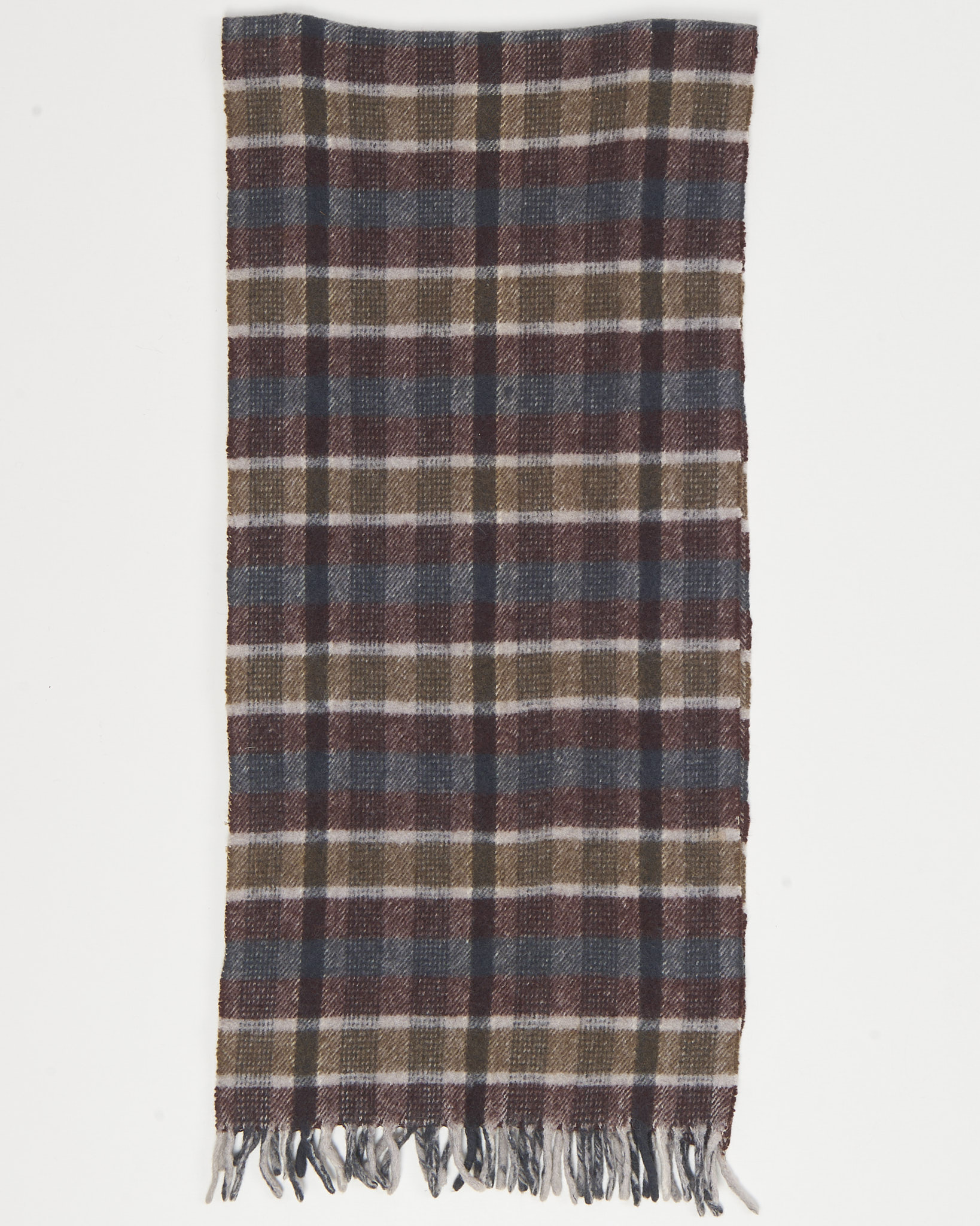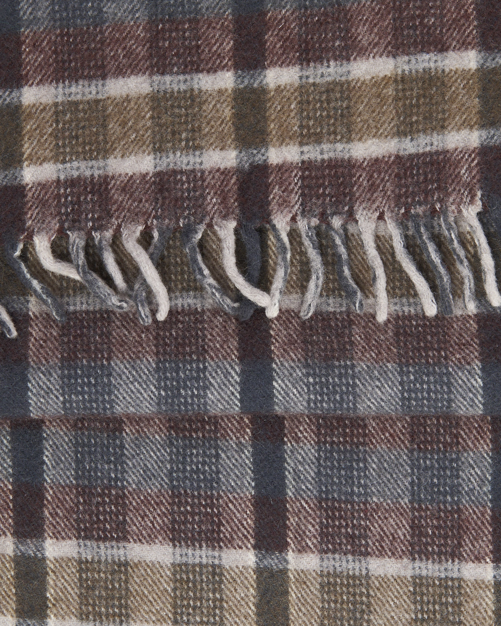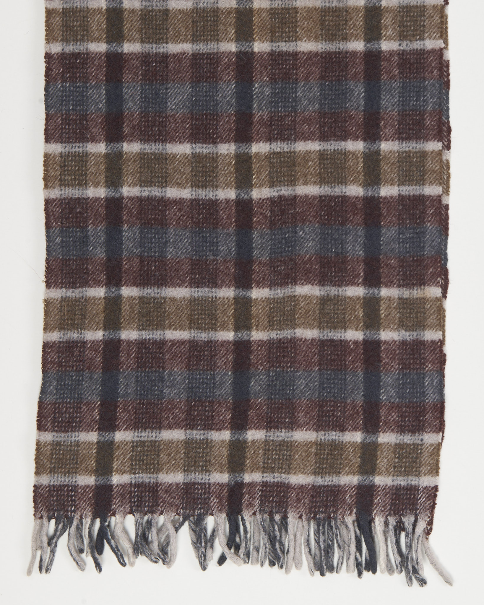 Шарф выполнен из мягкой шерсти. Принт - классическая клетка в спокойной гамме. Украшен короткой бахромой снизу