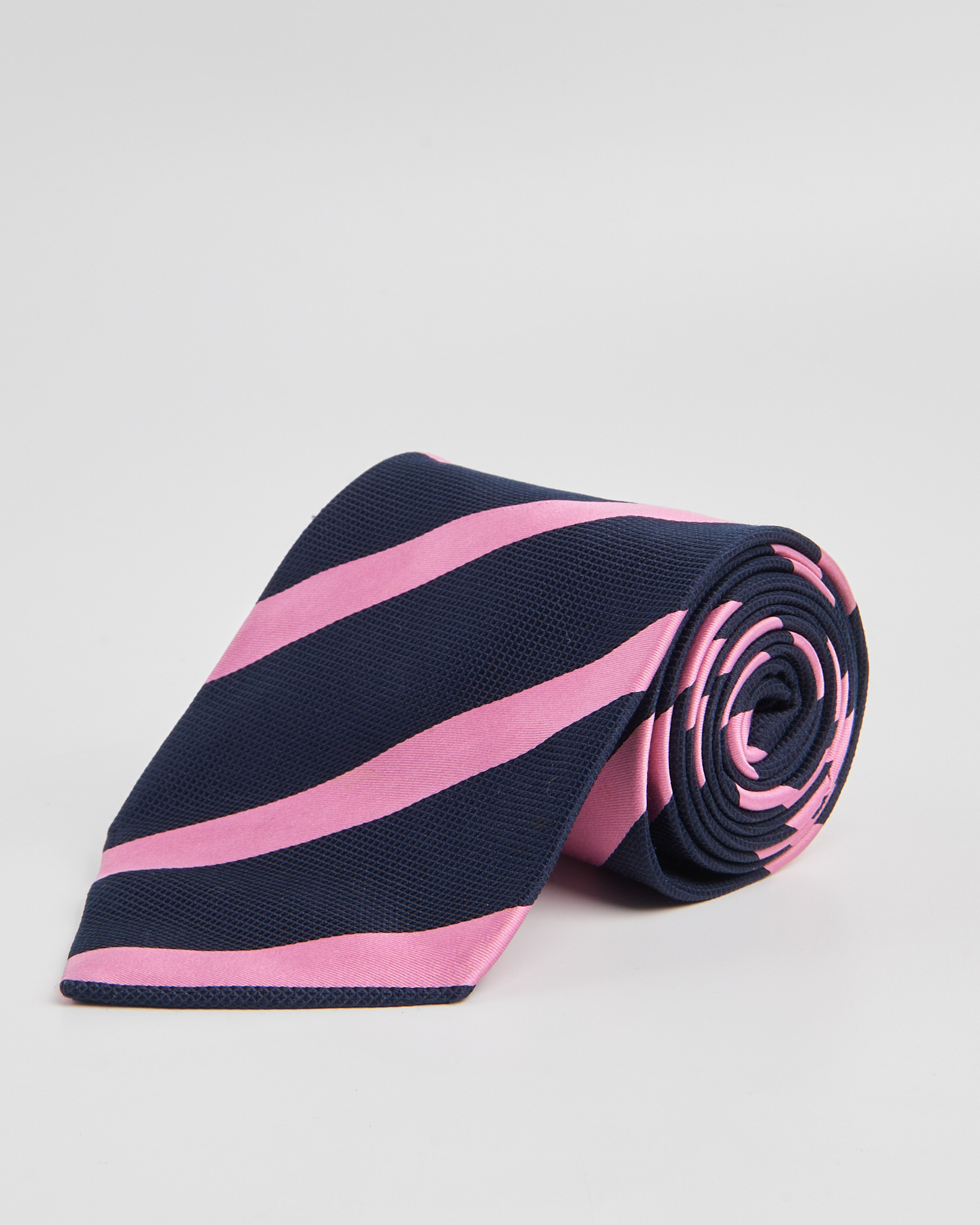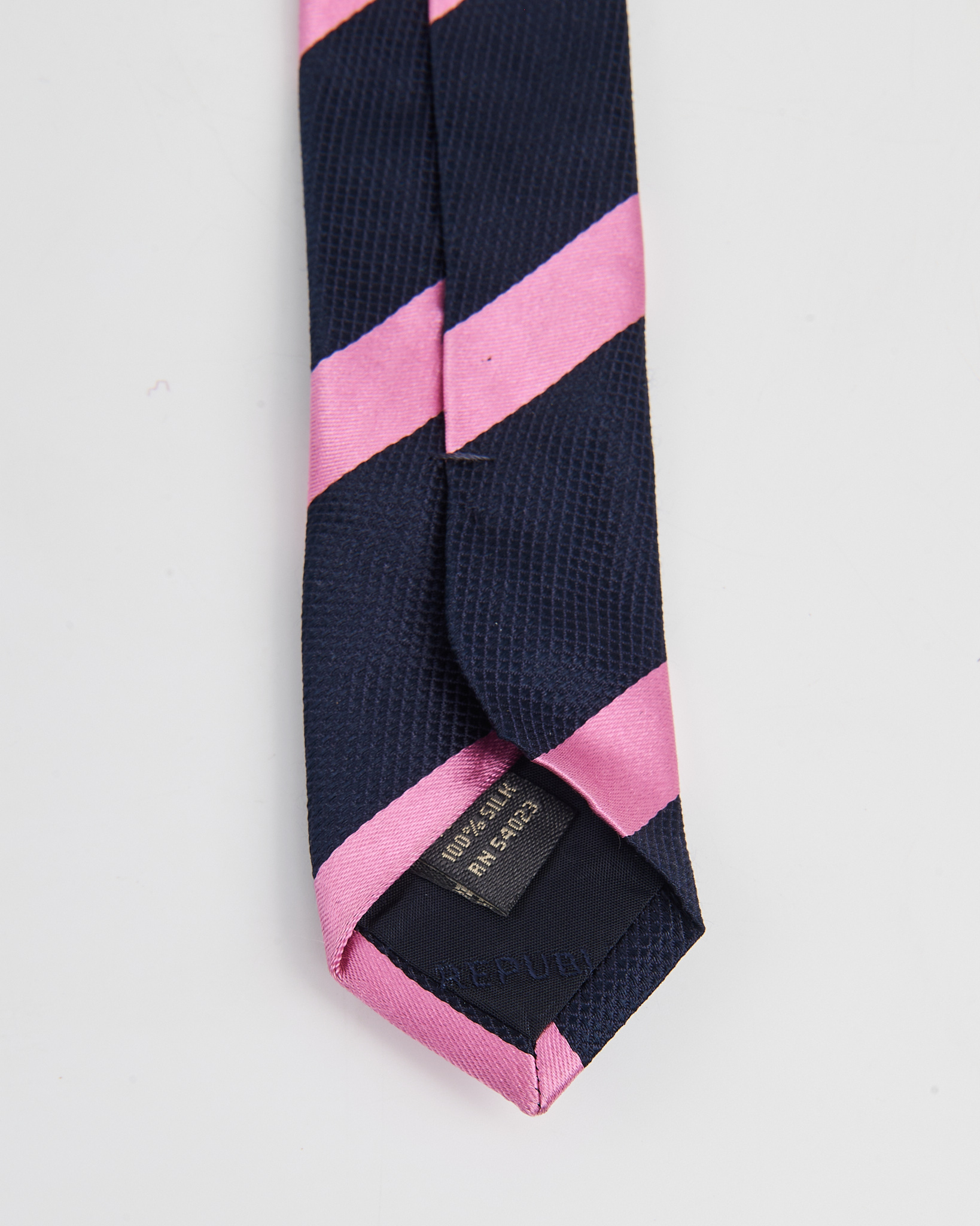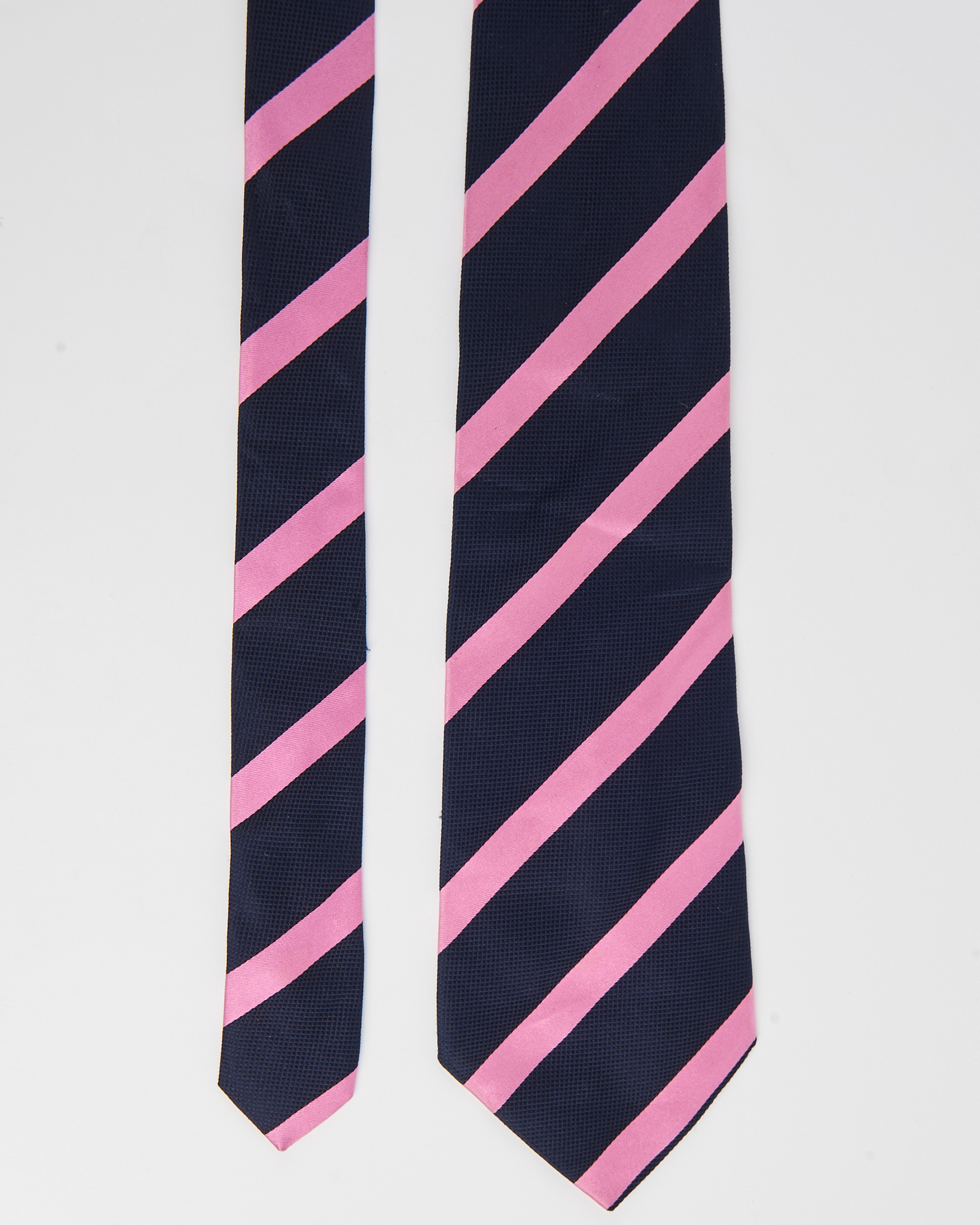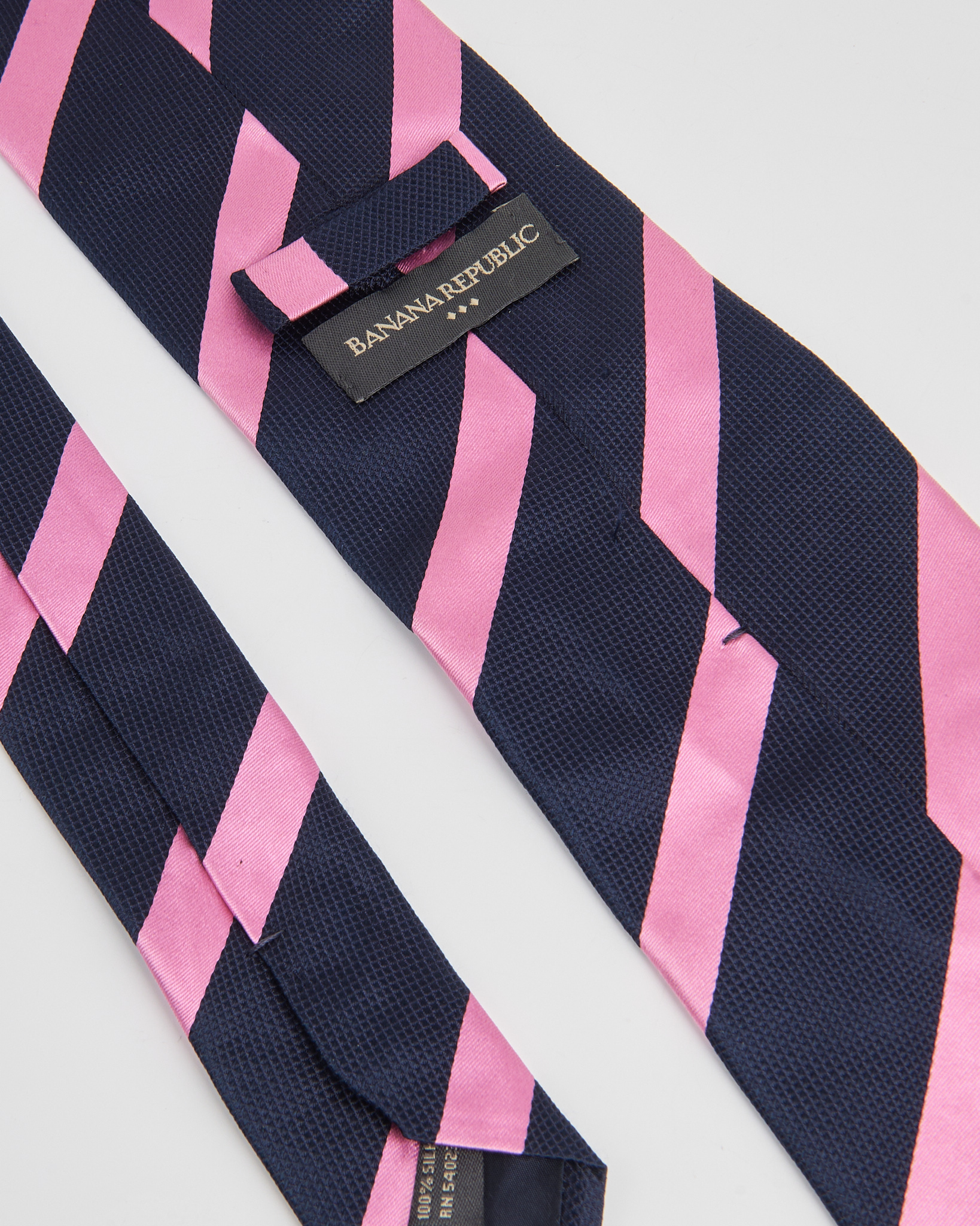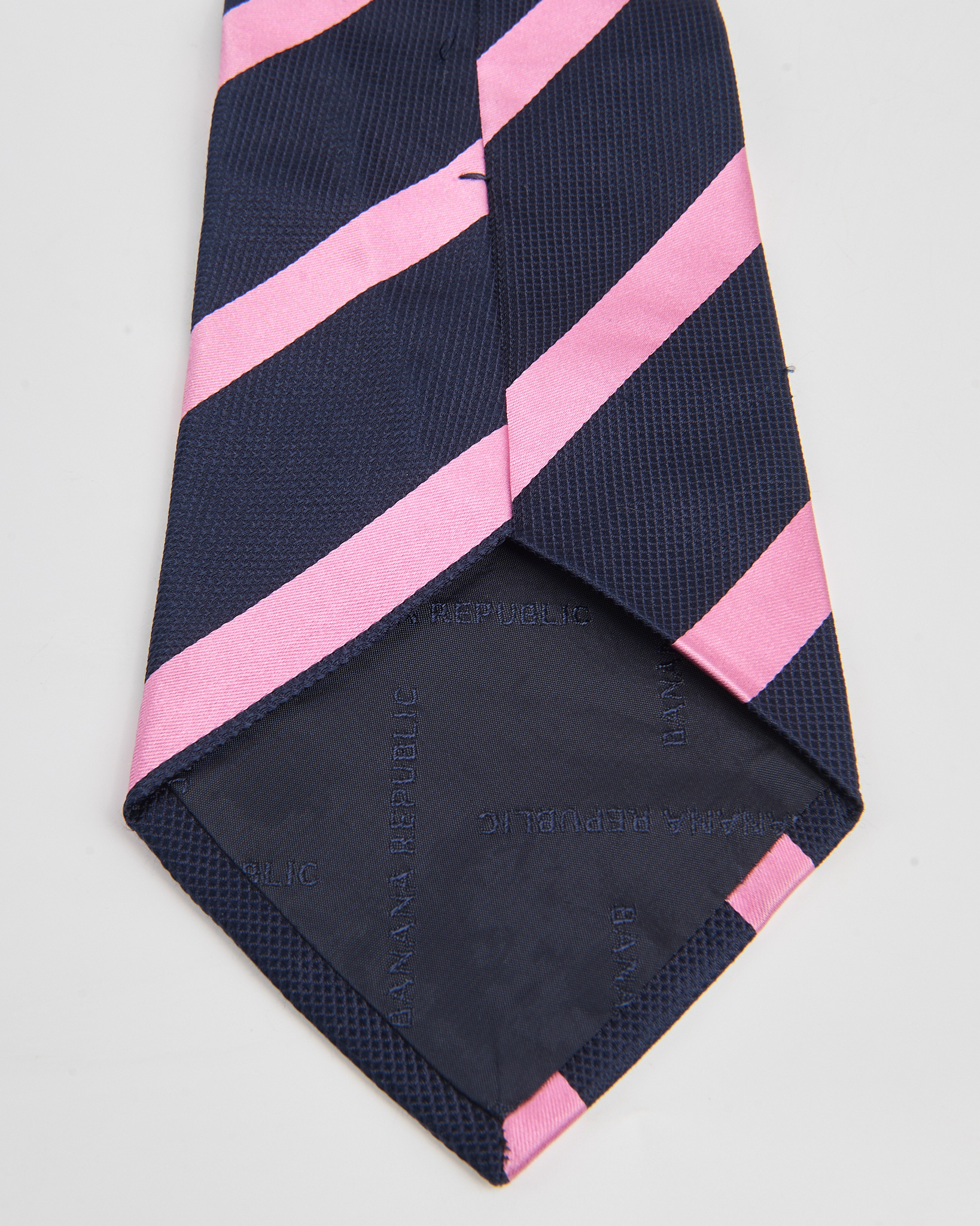 Винтажный шелковый галстук Banana Republic. Глубокий темно-синий цвет с широкими розовыми диагоналями. Фирменная подкладка с логотипом.