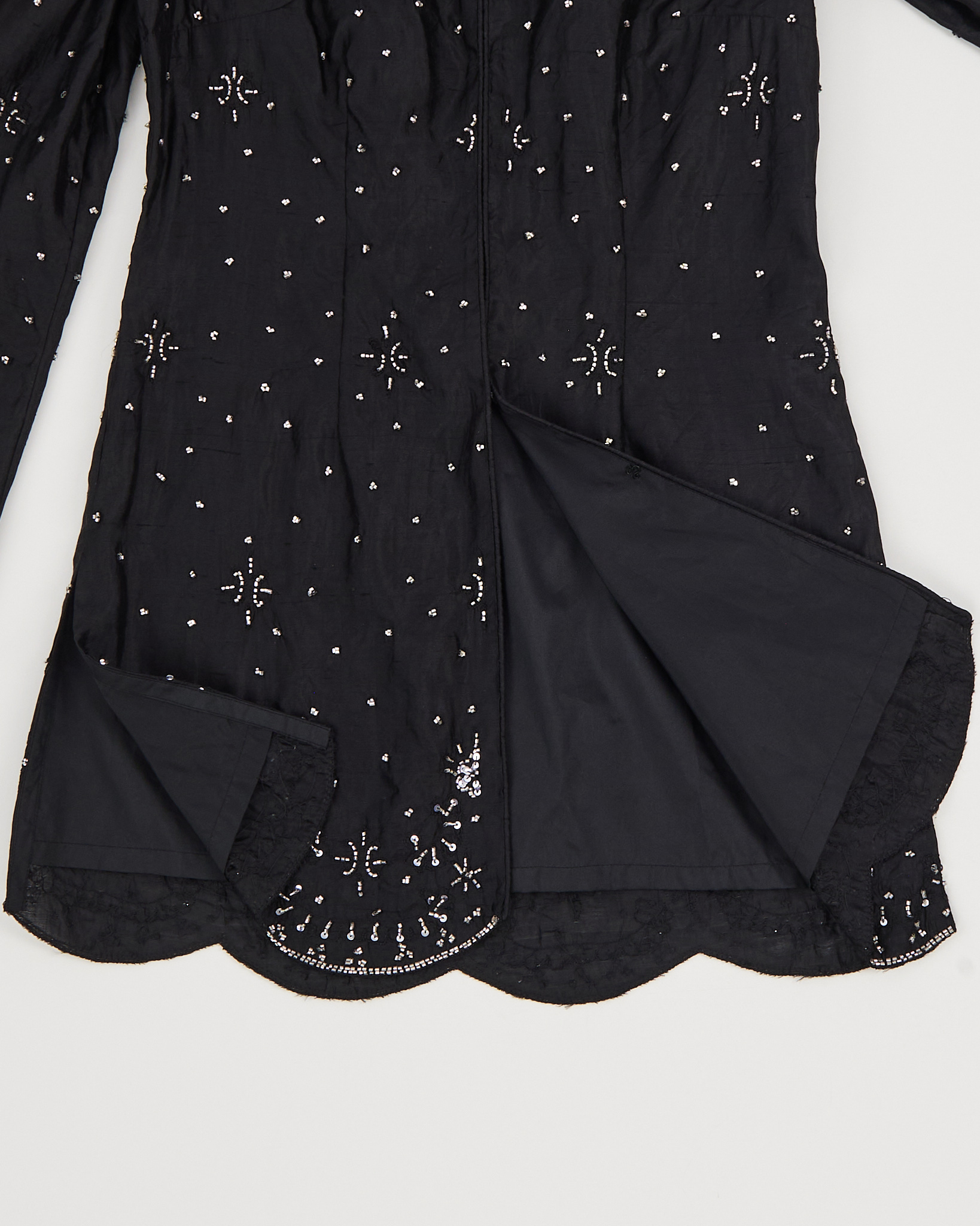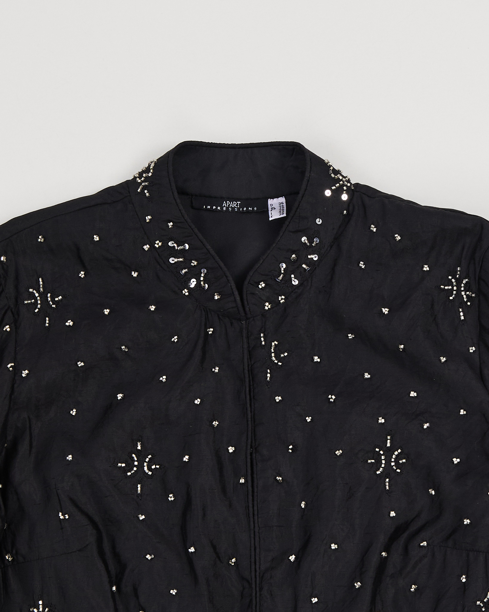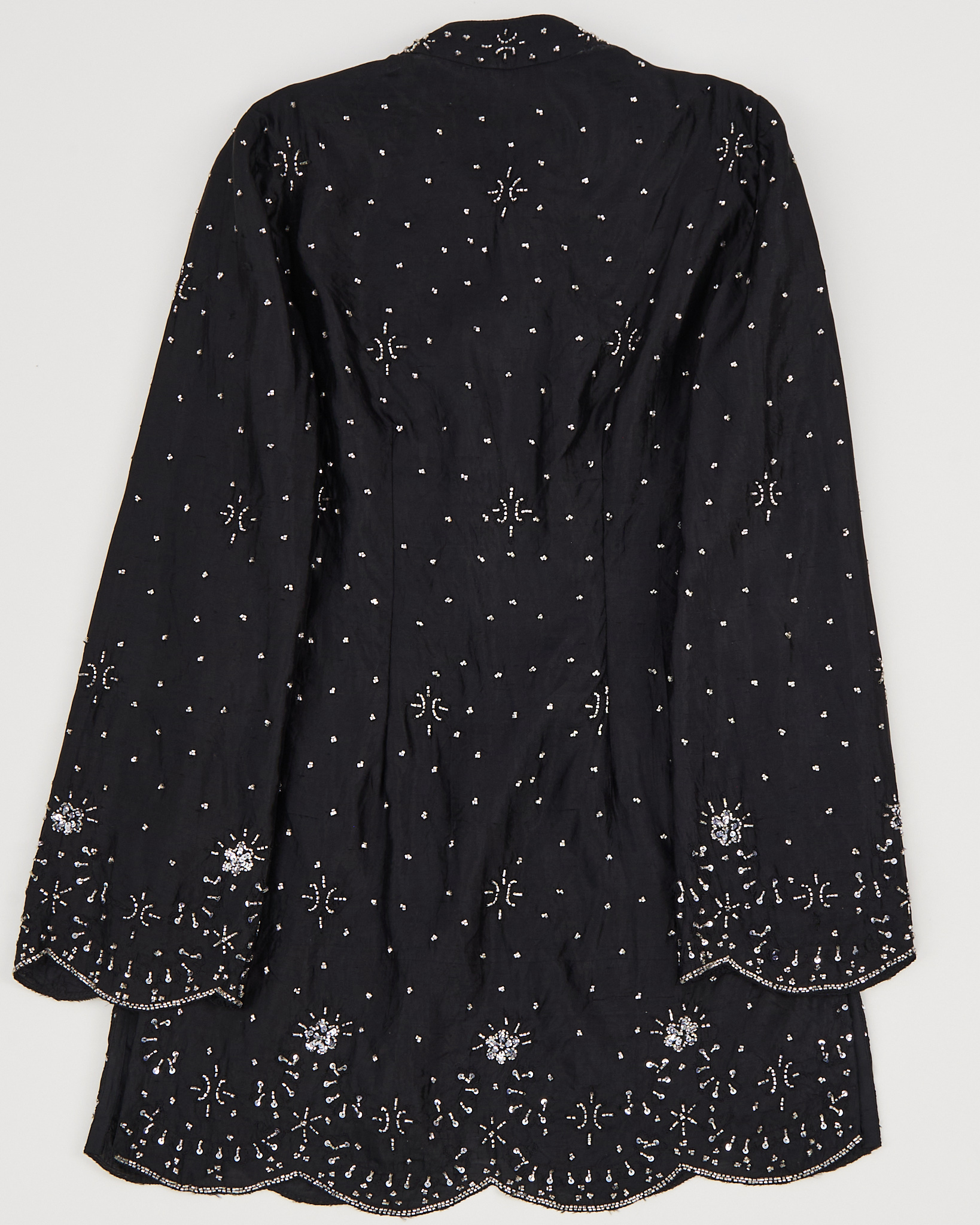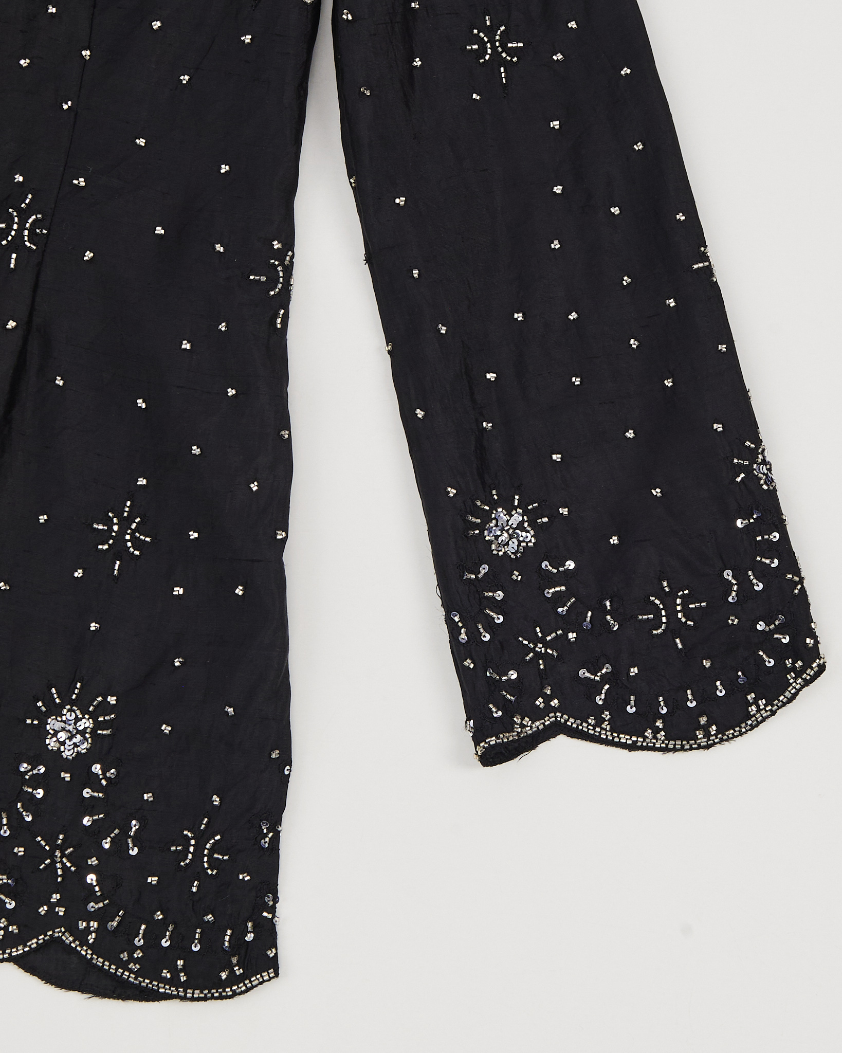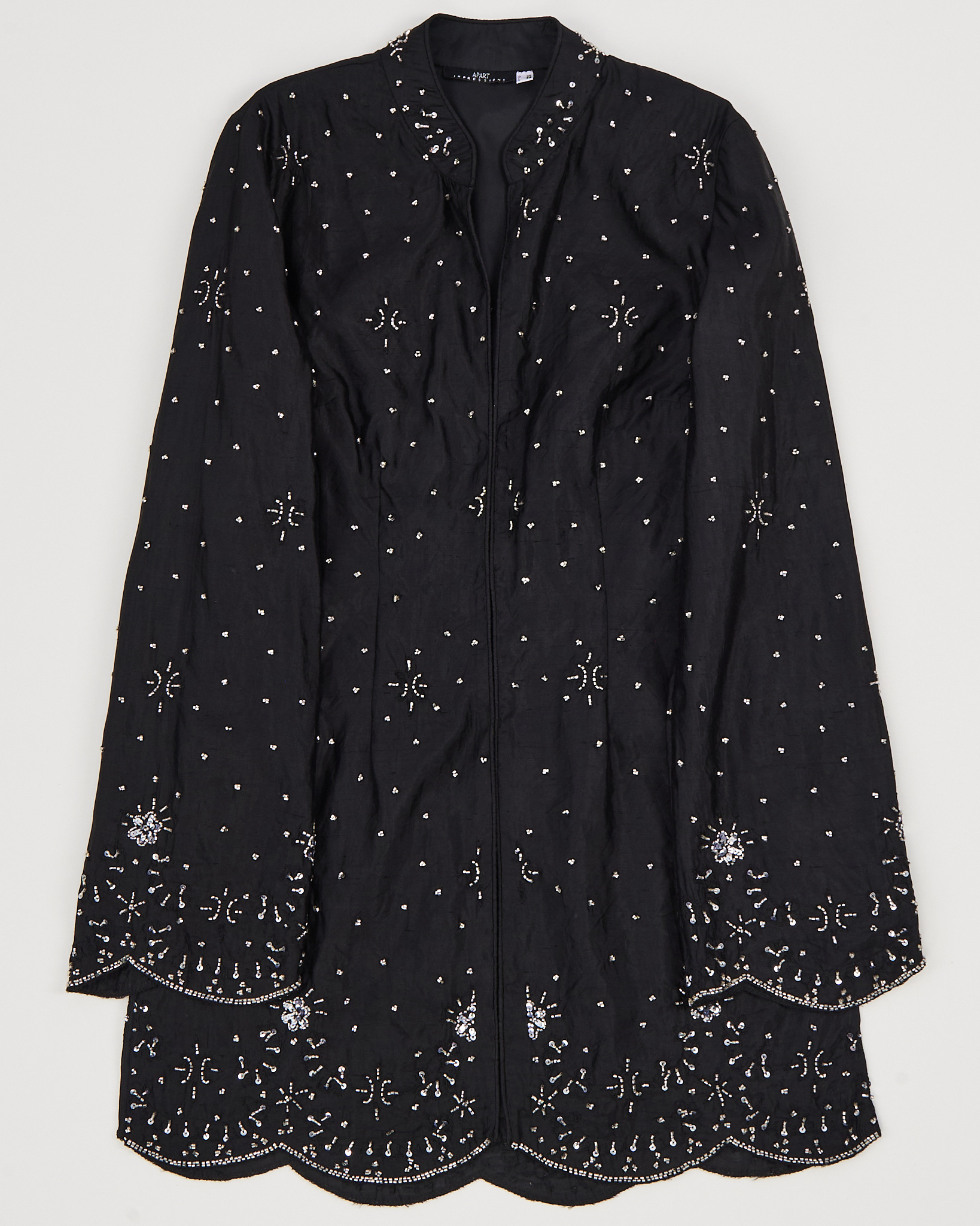 Шёлковый жакет с вышивкой бисером. Глубокий чёрный цвет и мерцающий декор, посадка свободная. Орнамент из бисера и пайеток образует сложный узор по подолу и рукавам, каждая деталь закреплена вручную.