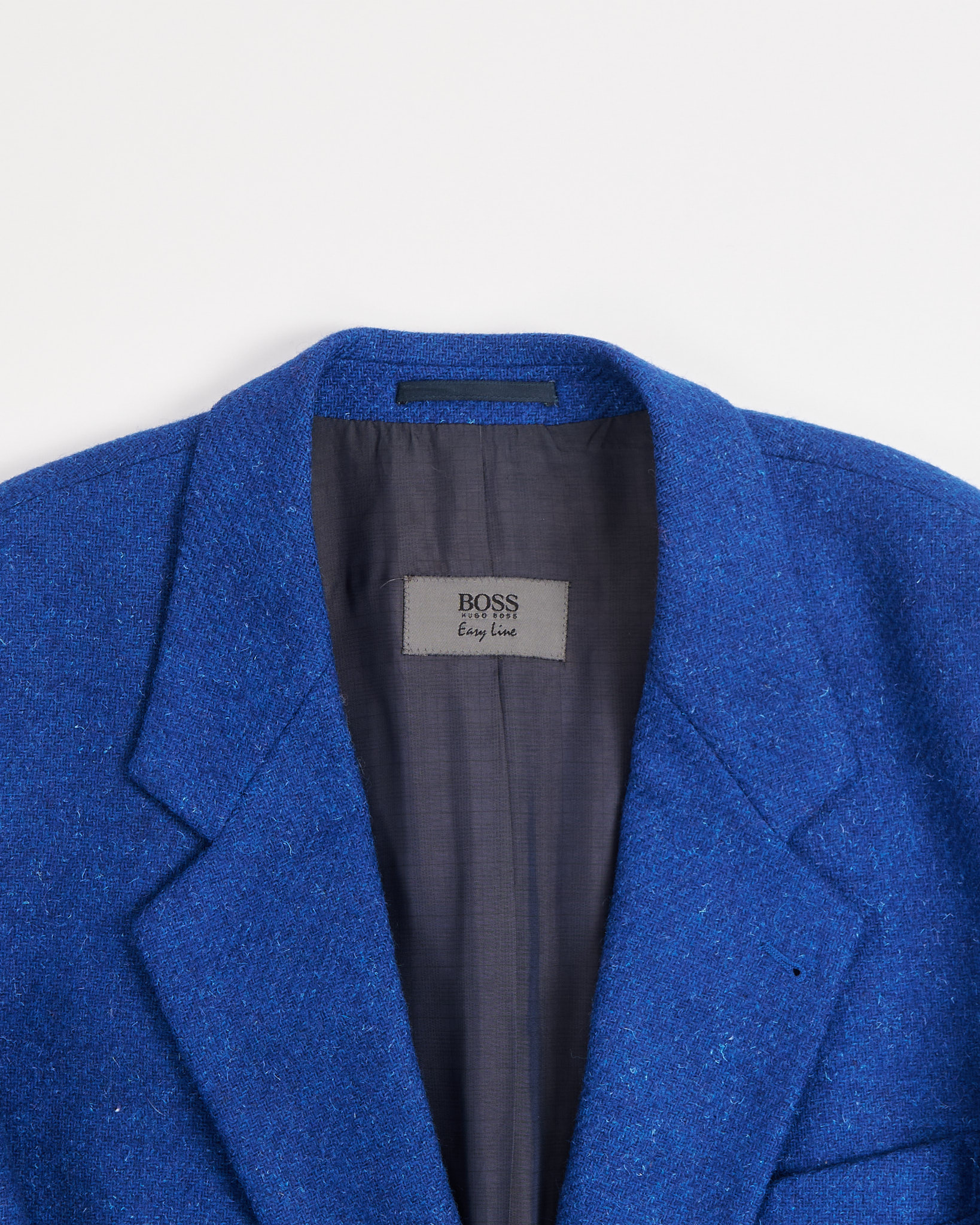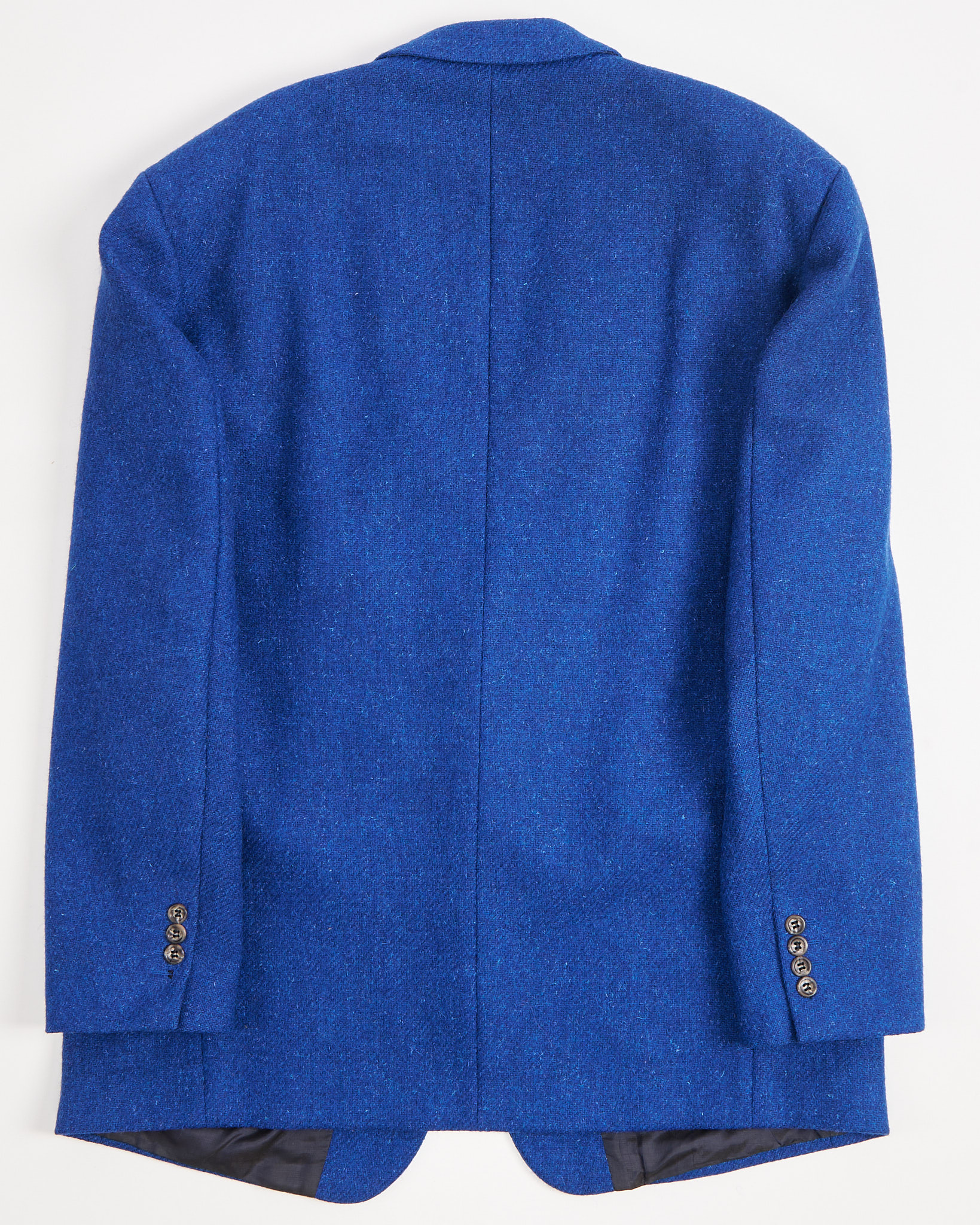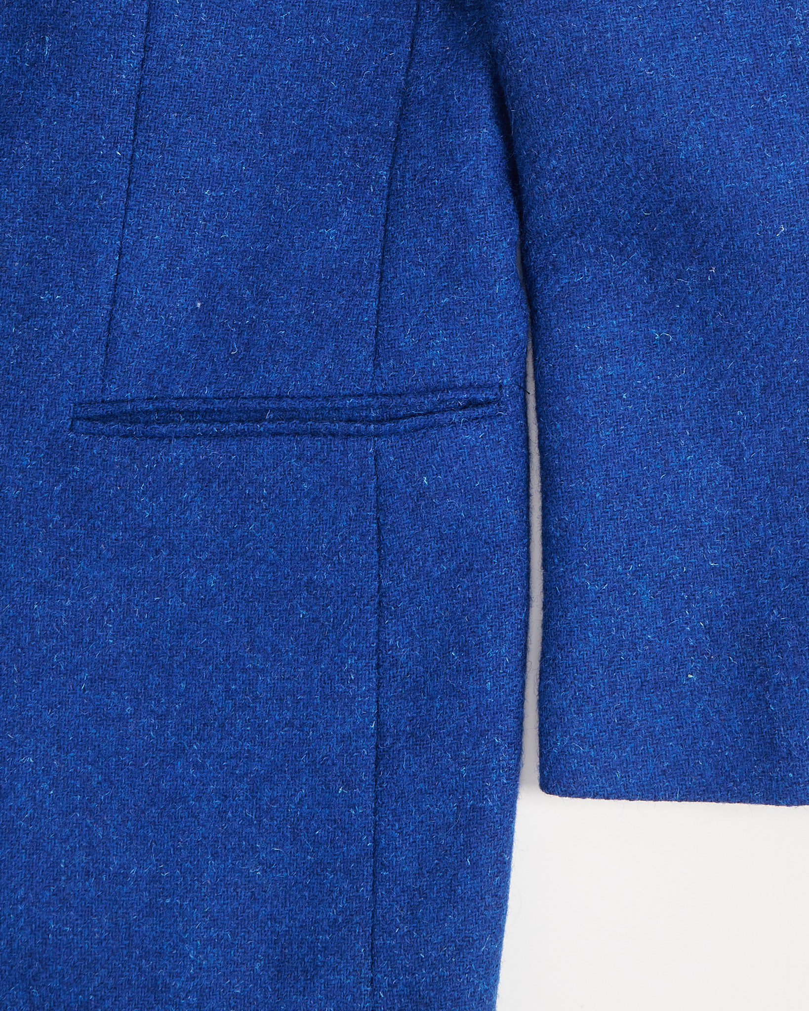 Твидовый пиджак насыщенного синего цвета, выполненный из плотной шерсти с лёгкой меланжевой фактурой. Структурированные плечи и удлинённый силуэт. Материал тёплый и приятный на ощупь, с мягким ворсом. Посадка свободная, подчёркивает пропорции.