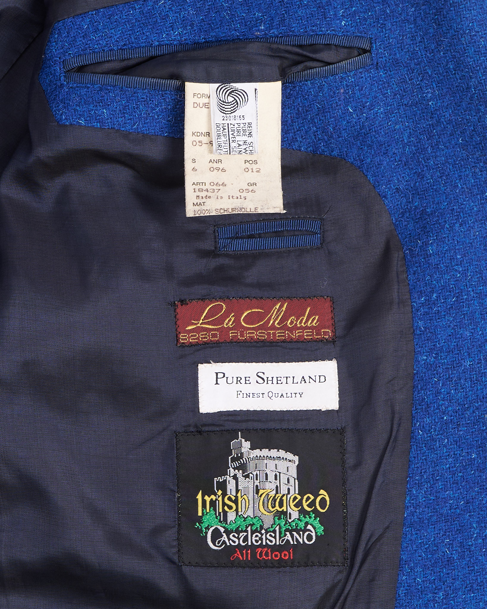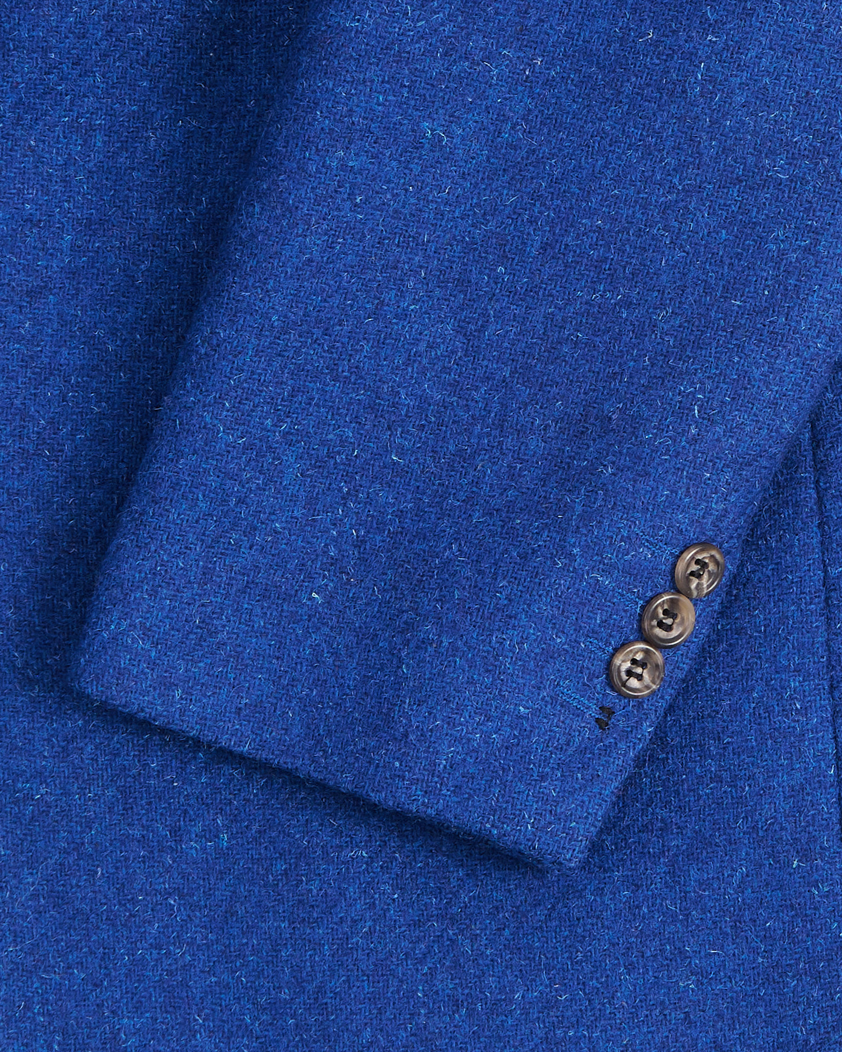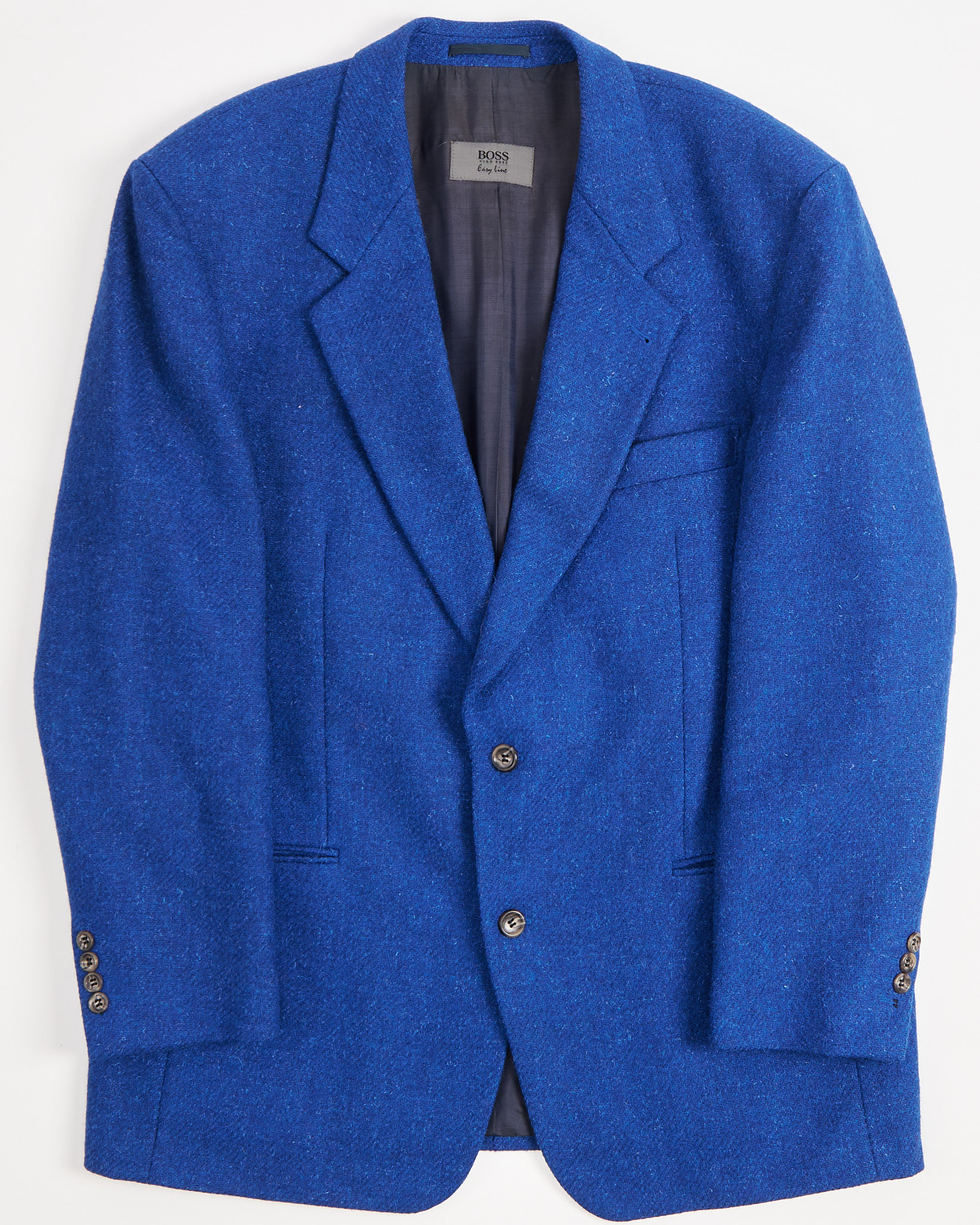 Твидовый пиджак насыщенного синего цвета, выполненный из плотной шерсти с лёгкой меланжевой фактурой. Структурированные плечи и удлинённый силуэт. Материал тёплый и приятный на ощупь, с мягким ворсом. Посадка свободная, подчёркивает пропорции.