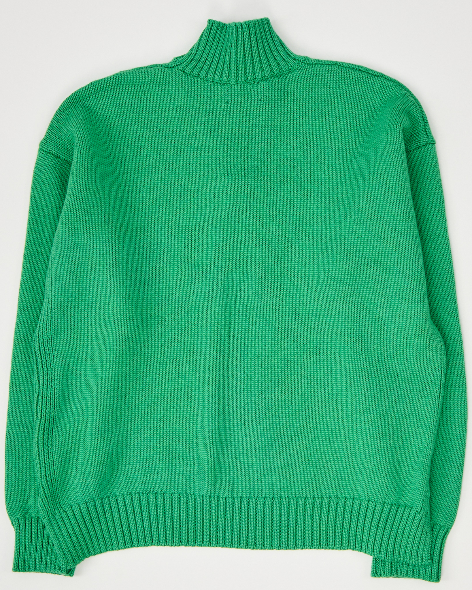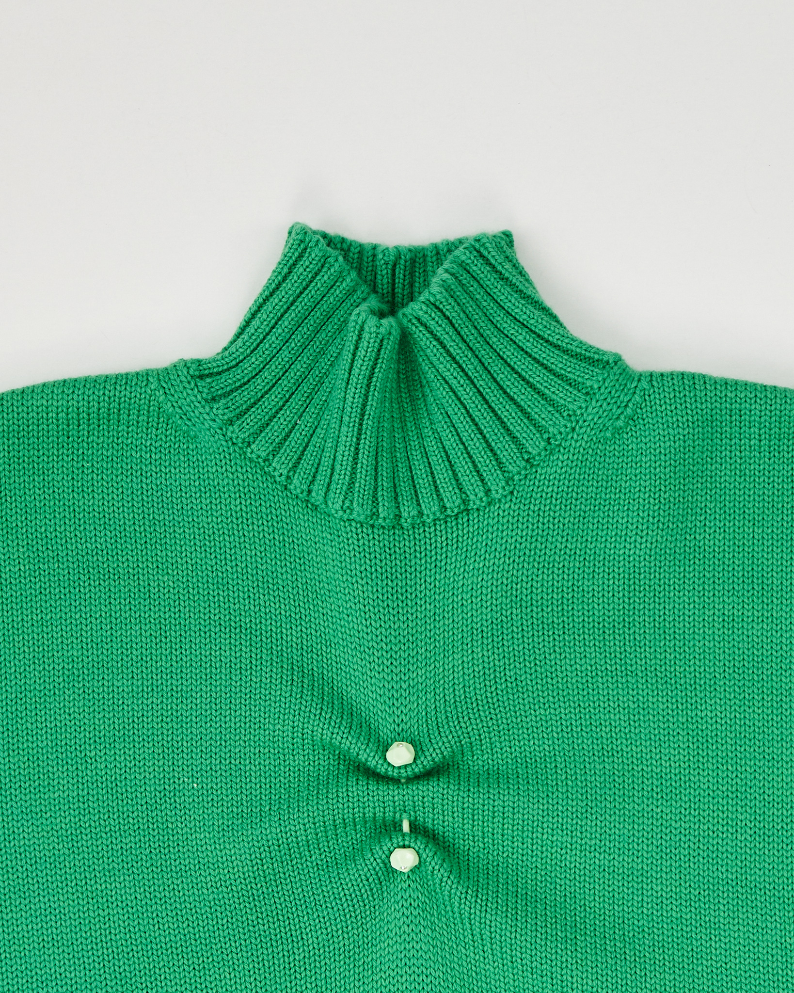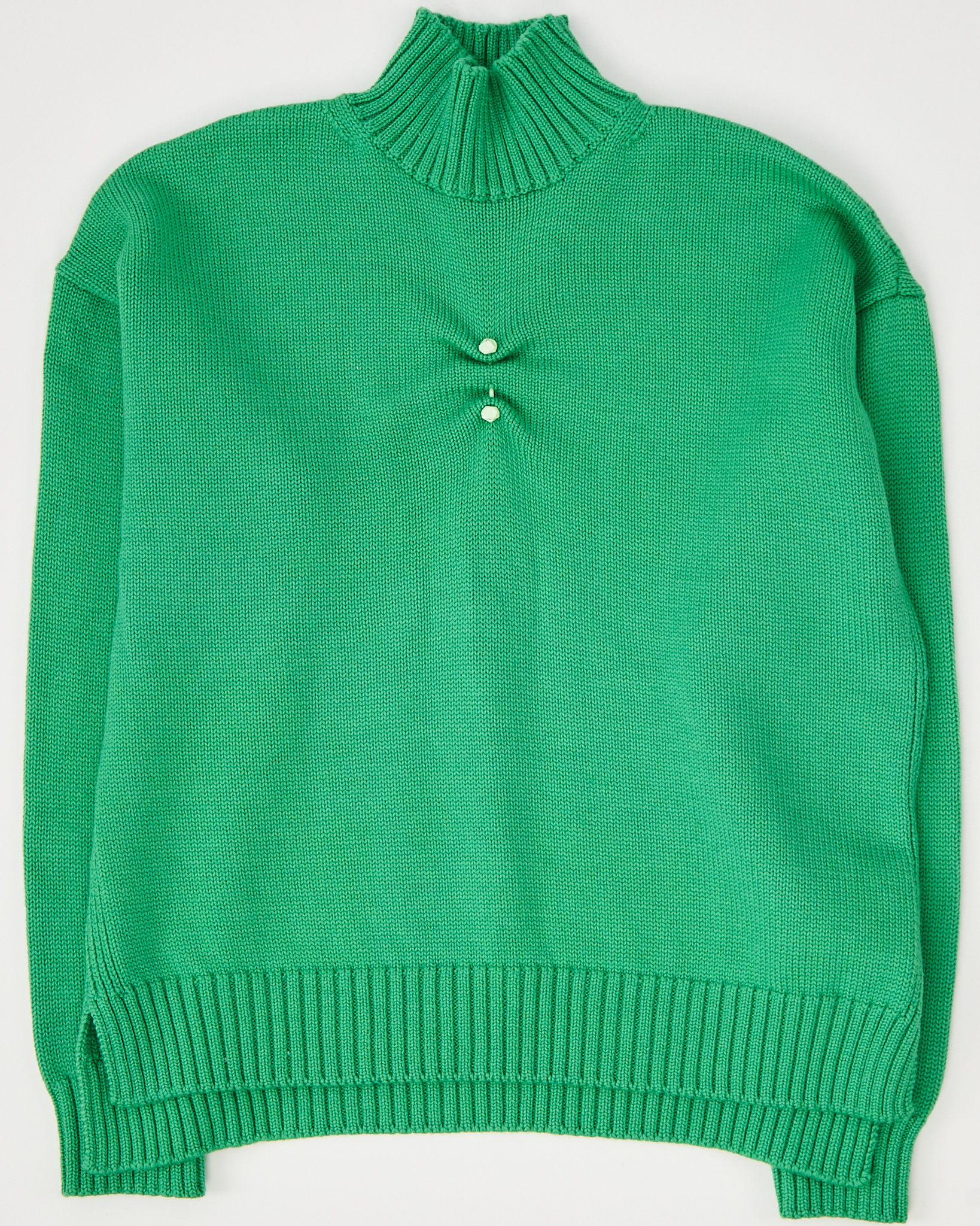 Свитер Ganni из 100% шерсти мериноса. Свободная посадка со спущенной линией плеч. Высокий ворот с рельефной резинкой. Декоративная планка с небольшими пуговицами на груди.