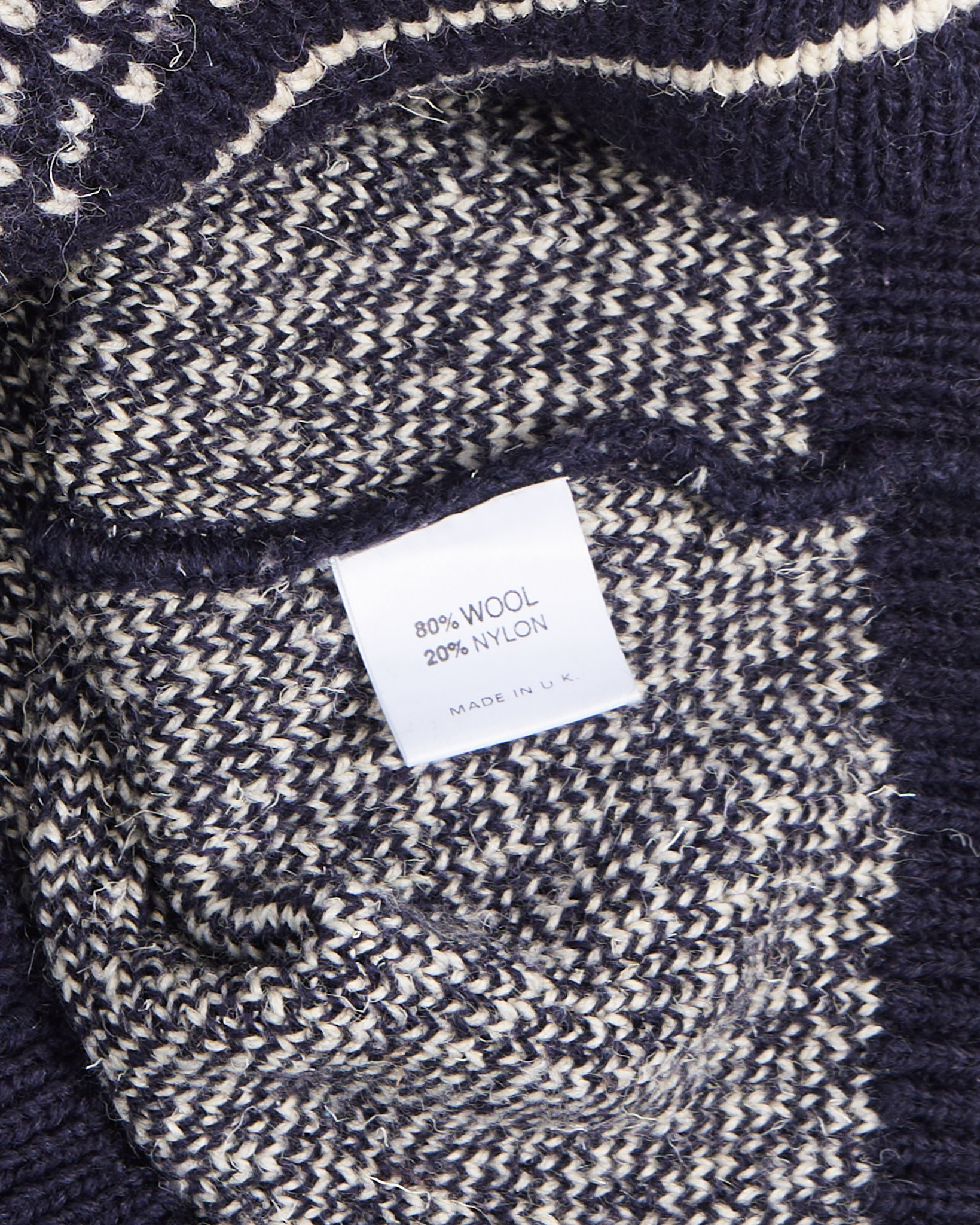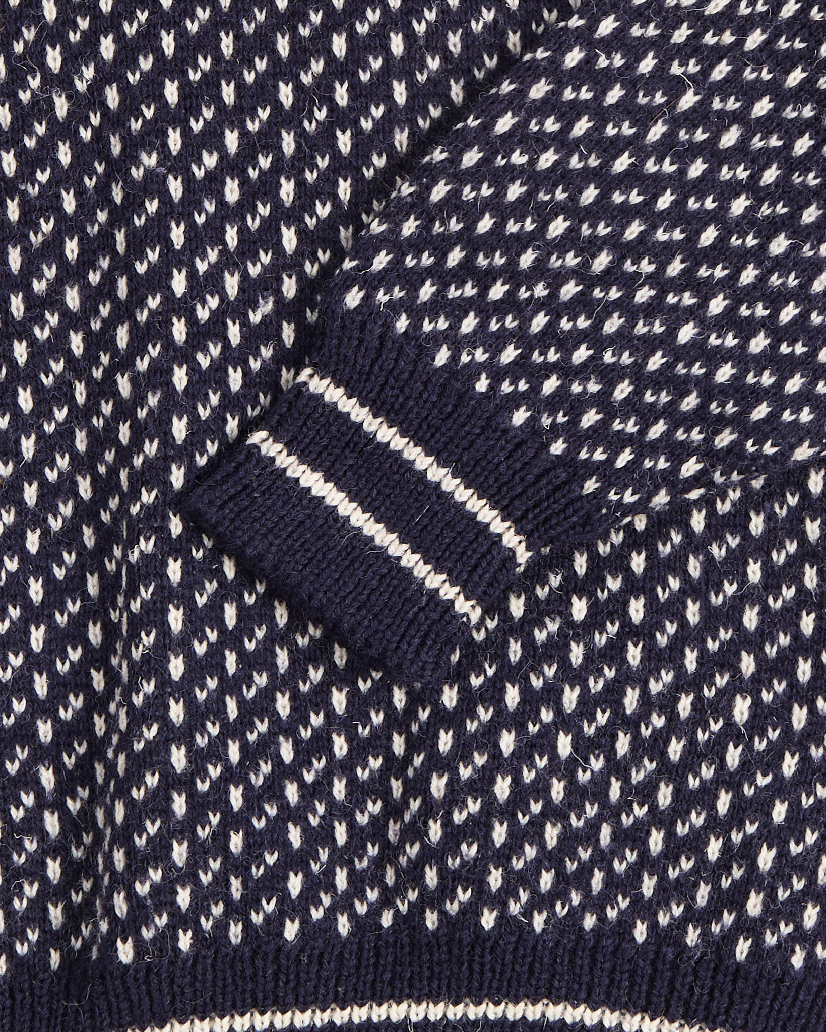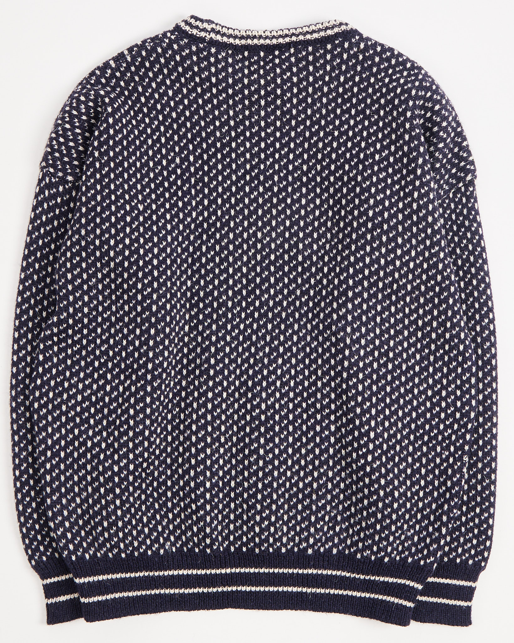 Свитер выполнен из плотной шерсти в мелком двухцветном жаккарде. Материал тёплый, немного колючий, с характерной фактурой. Посадка свободная, с пониженной линией плеч и объёмом по груди.