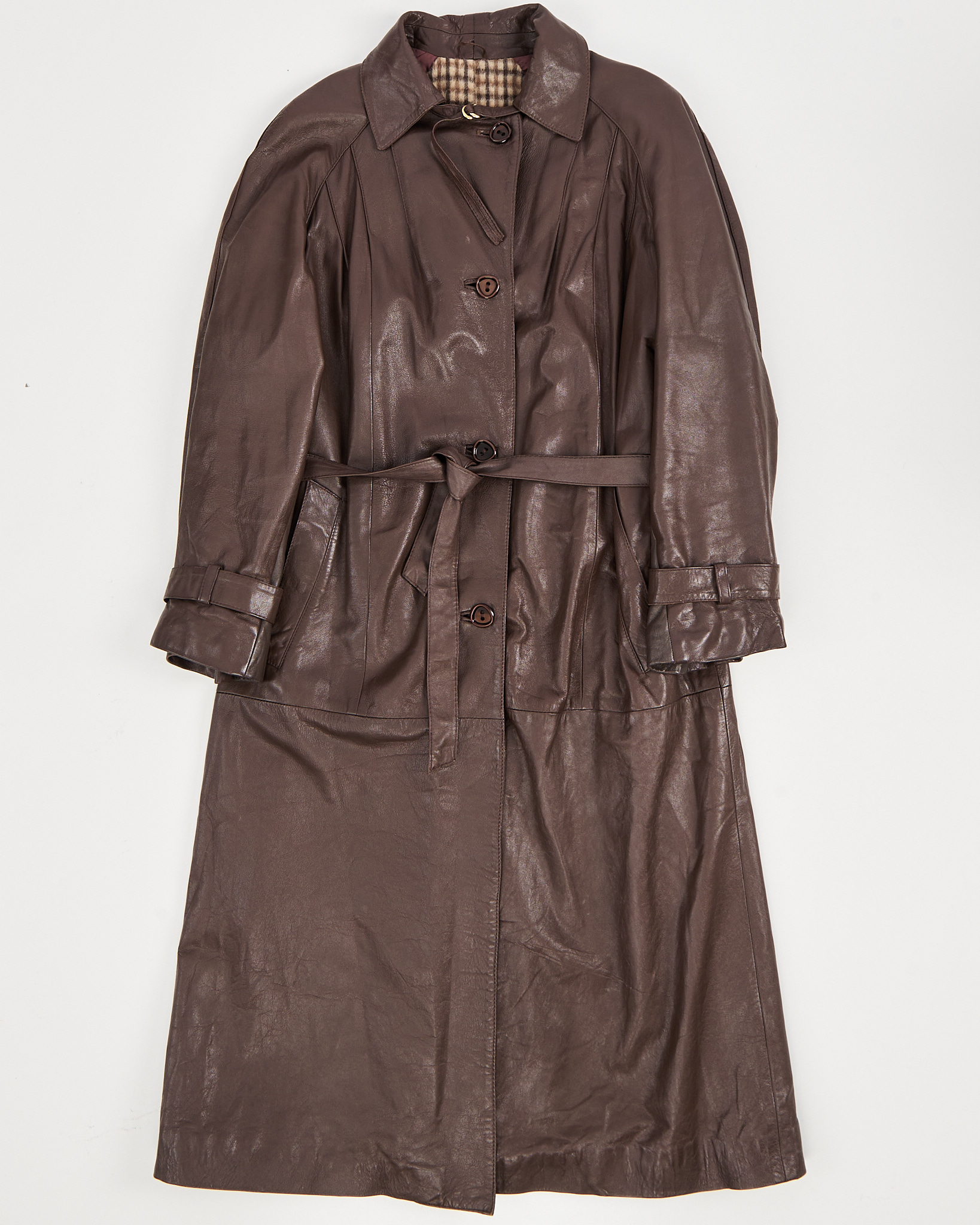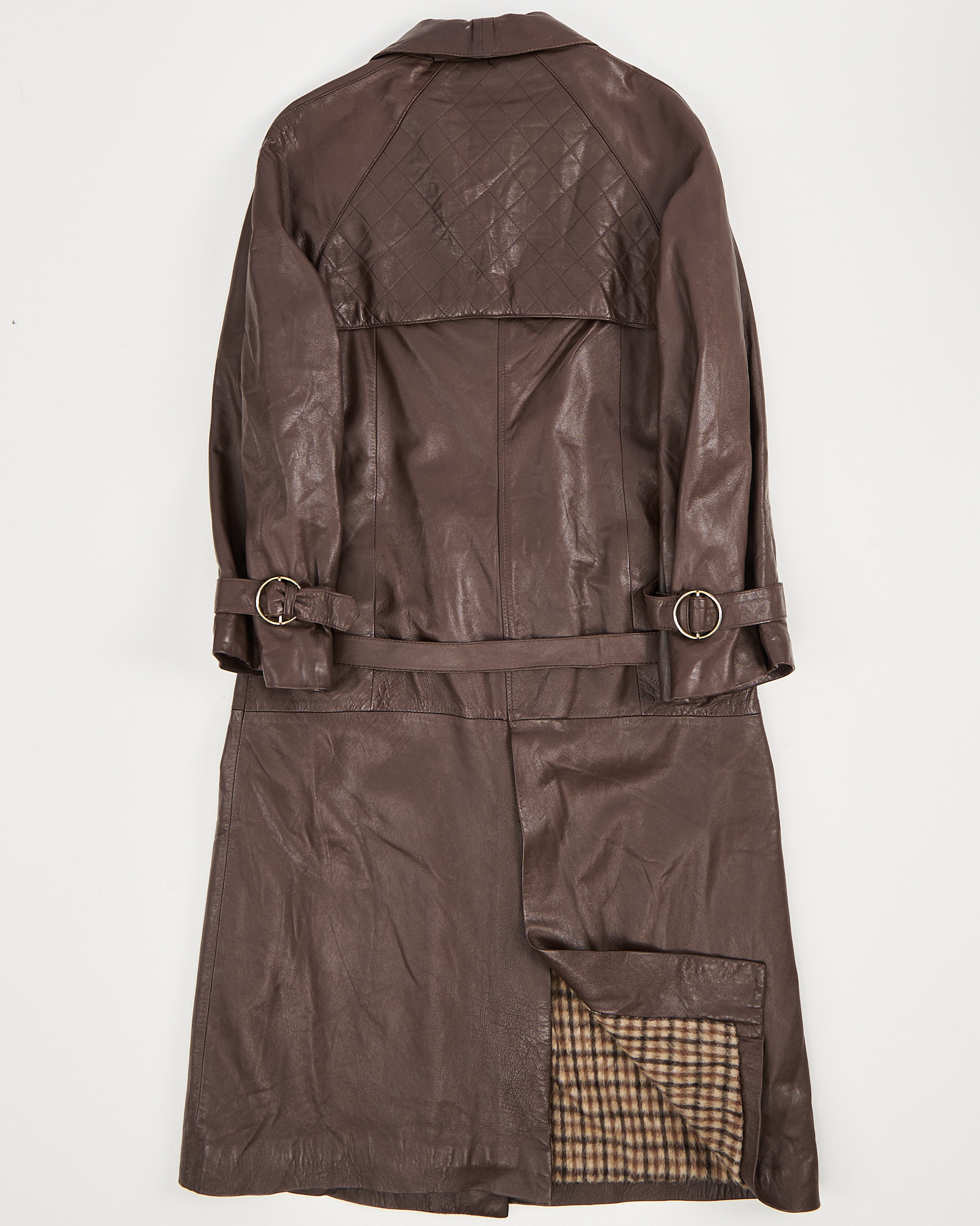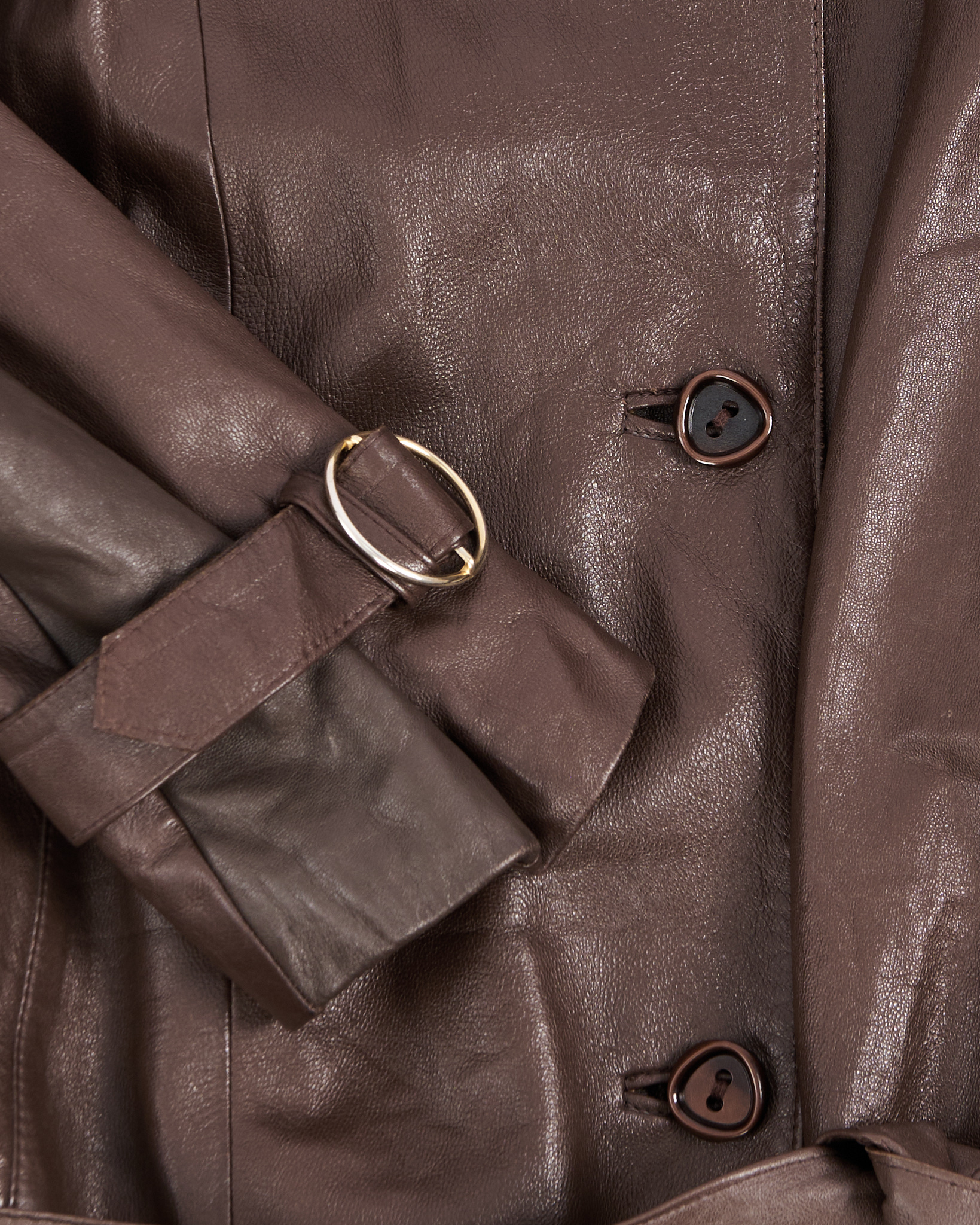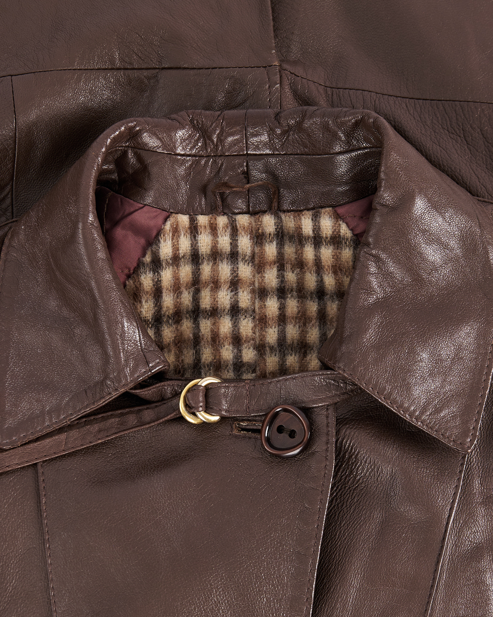 Плащ из 100% плотной натуральной кожи глубокого коричневого оттенка. Посадка приталенная, внутренняя подкладка из шерсти. Ремешки на рукавах и акцентная застежка на воротнике.