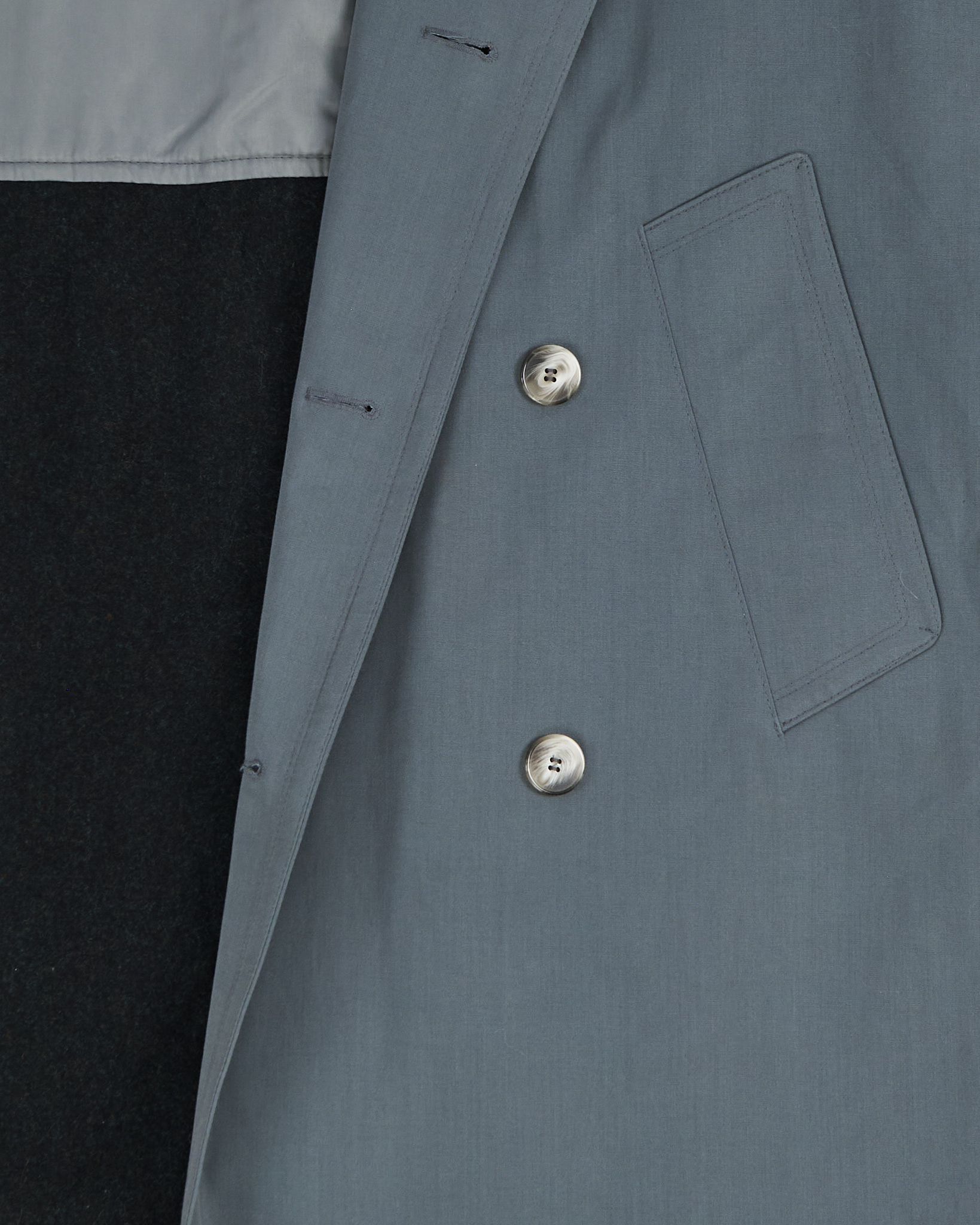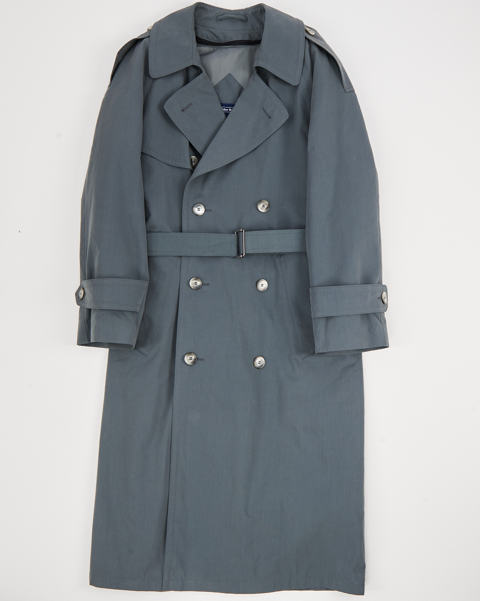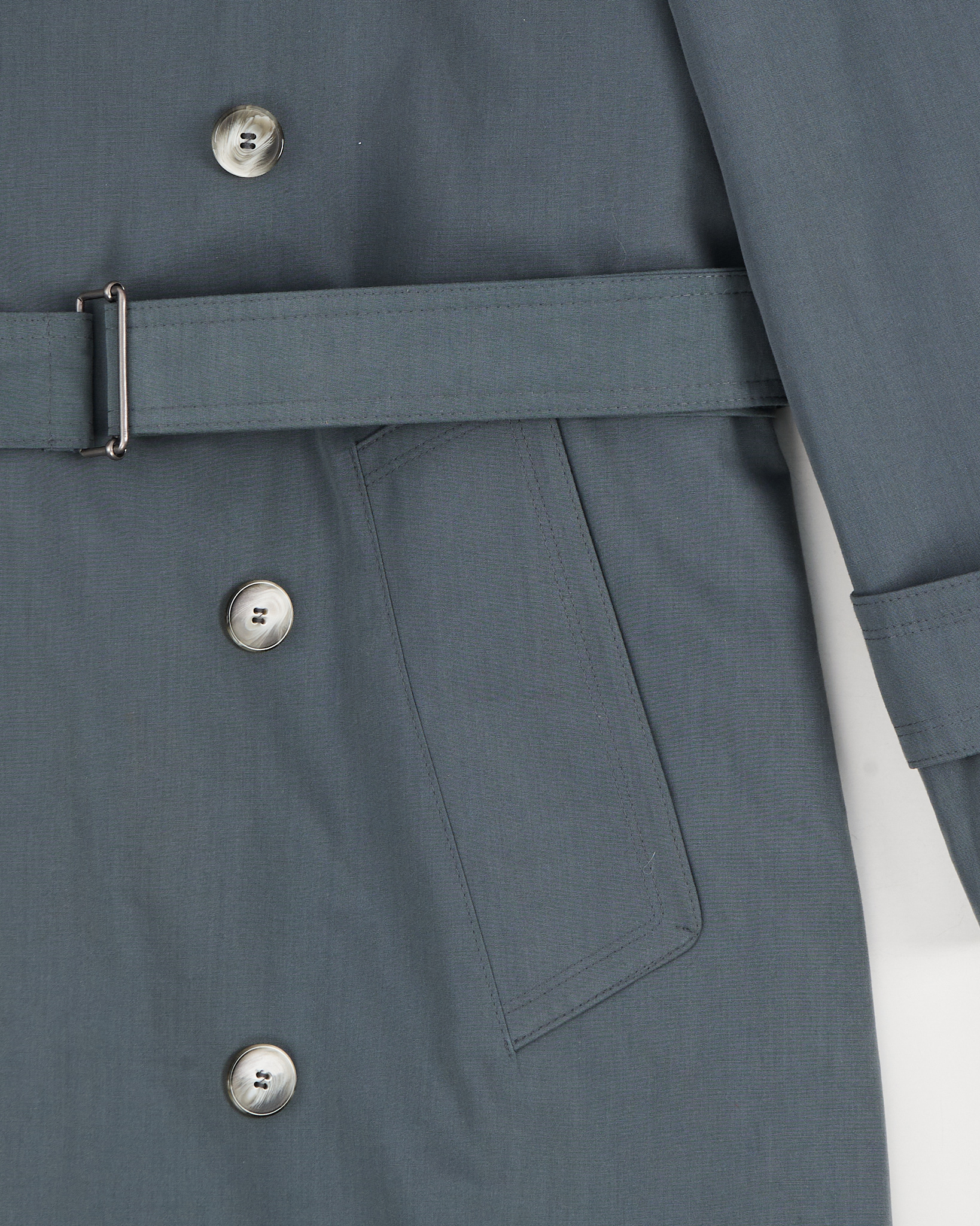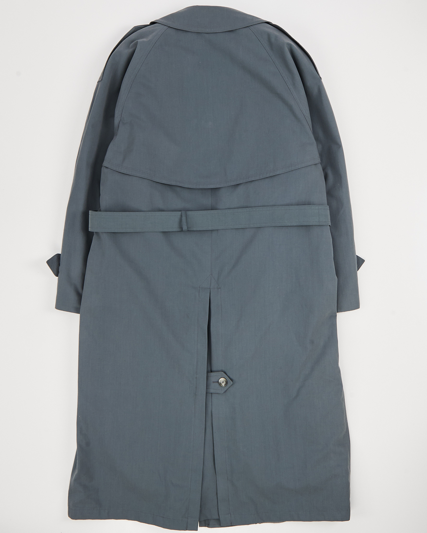 Плащ выполнен из плотной ткани с содержанием хлопка, съемная подкладка на молнии. Прямая посадка с поясом позволяет регулировать силуэт и подчёркивает линию талии. Двубортная застёжка, погоны и защитная кокетка.