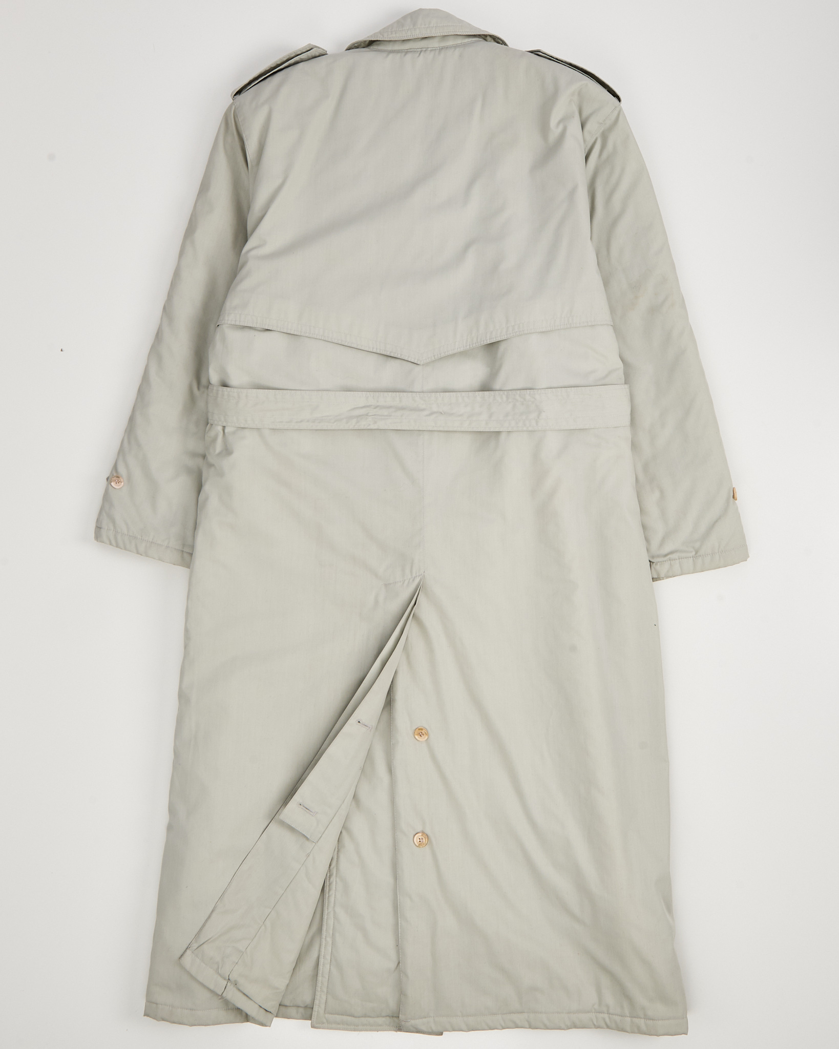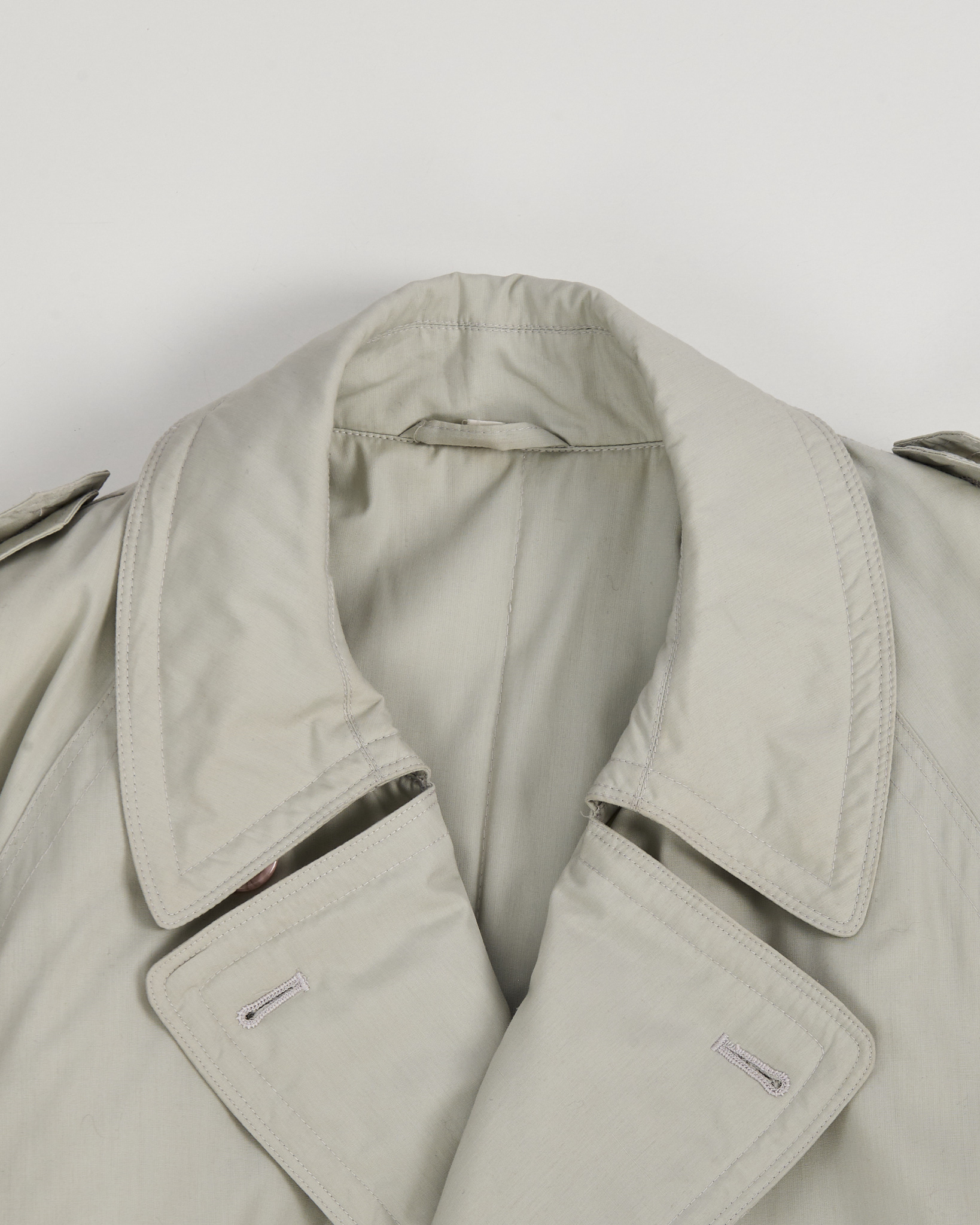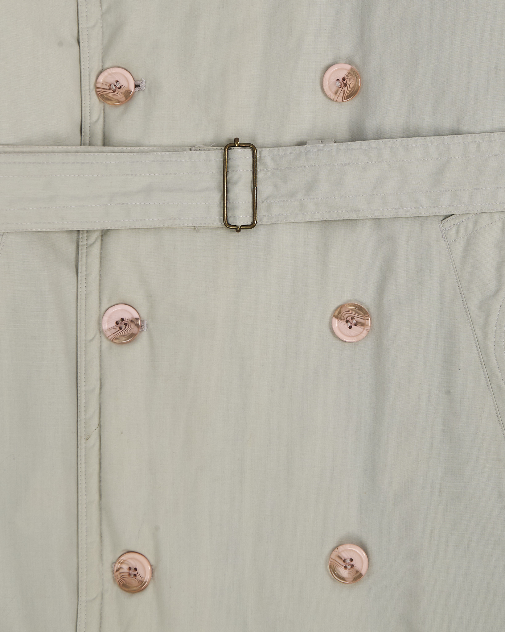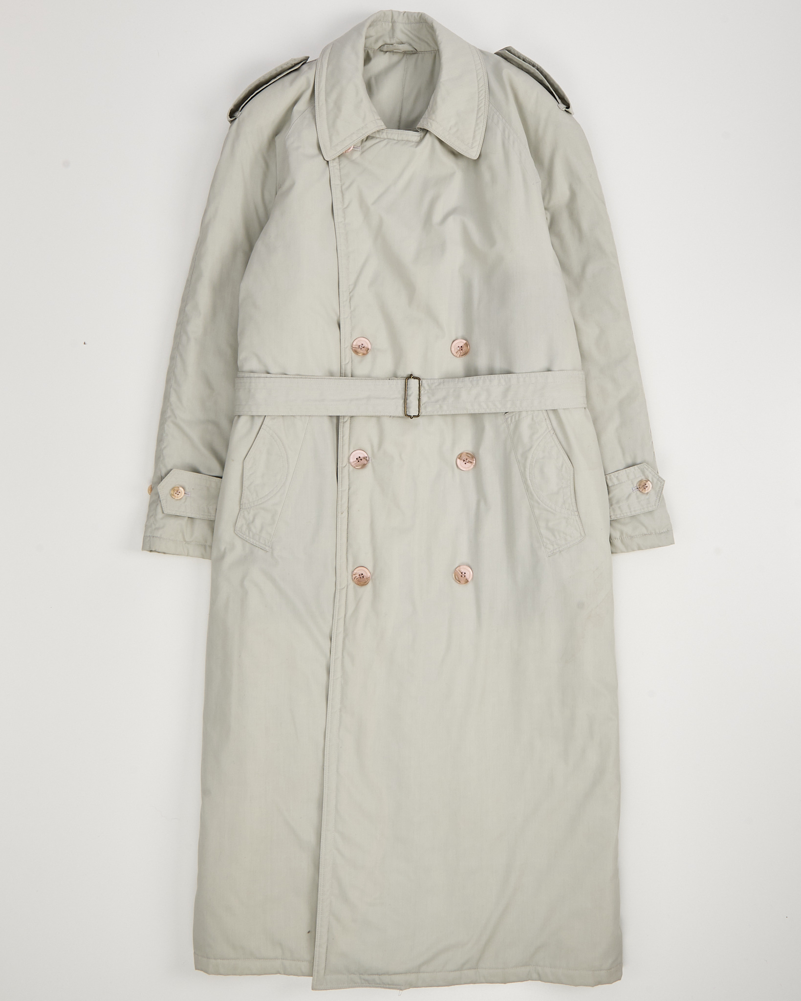 Теплый тренч в светло-бежевом оттенке из плотной ткани с добавлением шерсти. Прямая посадка с поясом позволяет регулировать силуэт. Двубортная застёжка, погоны и глубокие карманы, контрастные пуговицы, функциональные карманы.