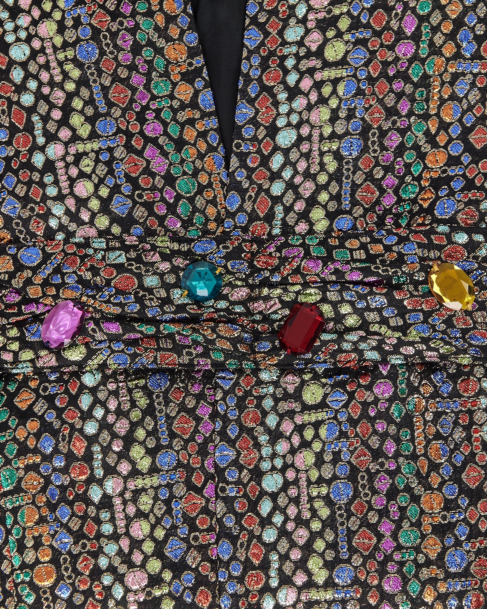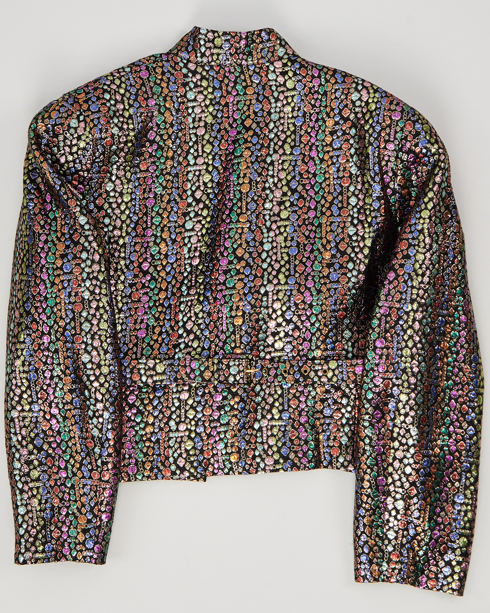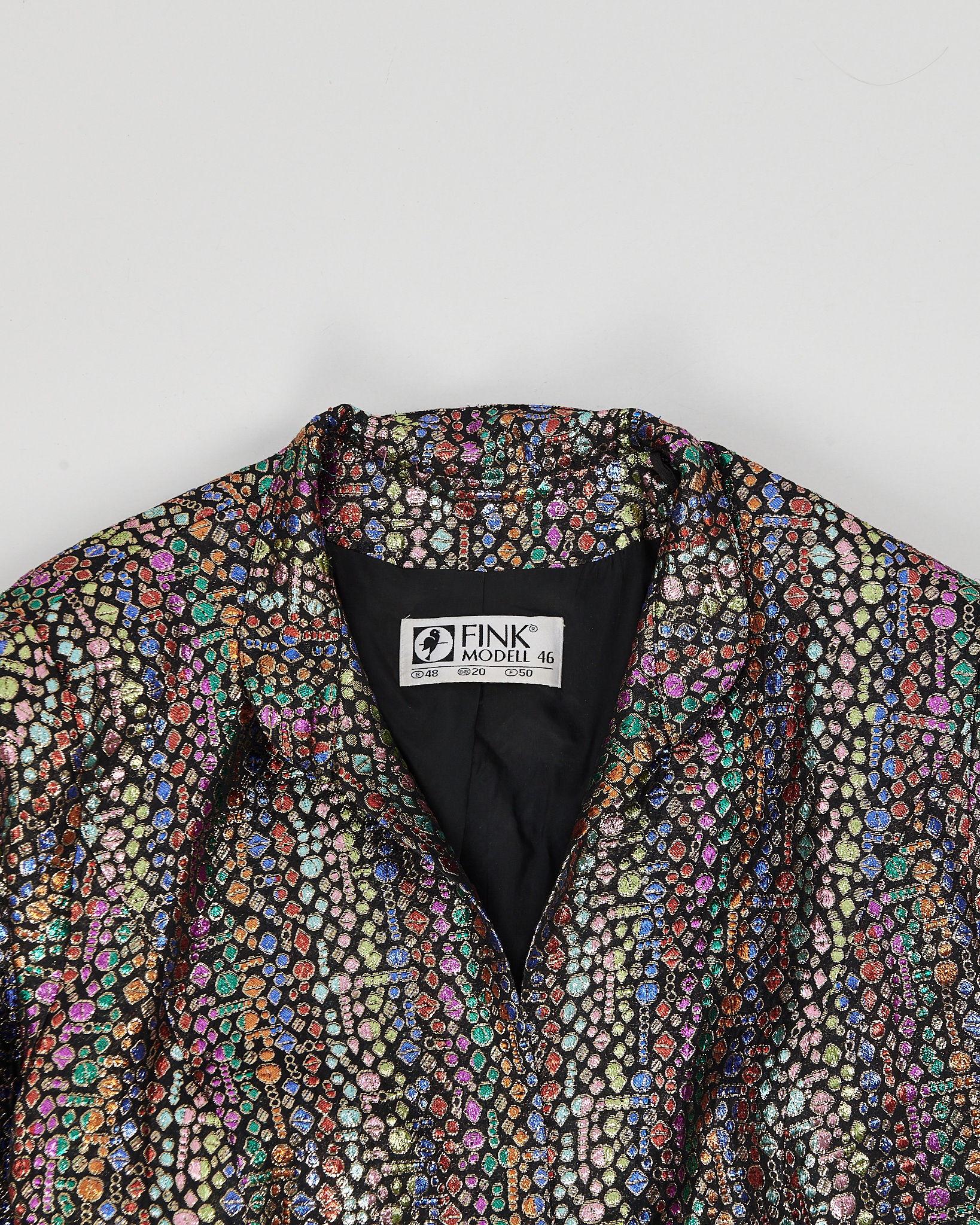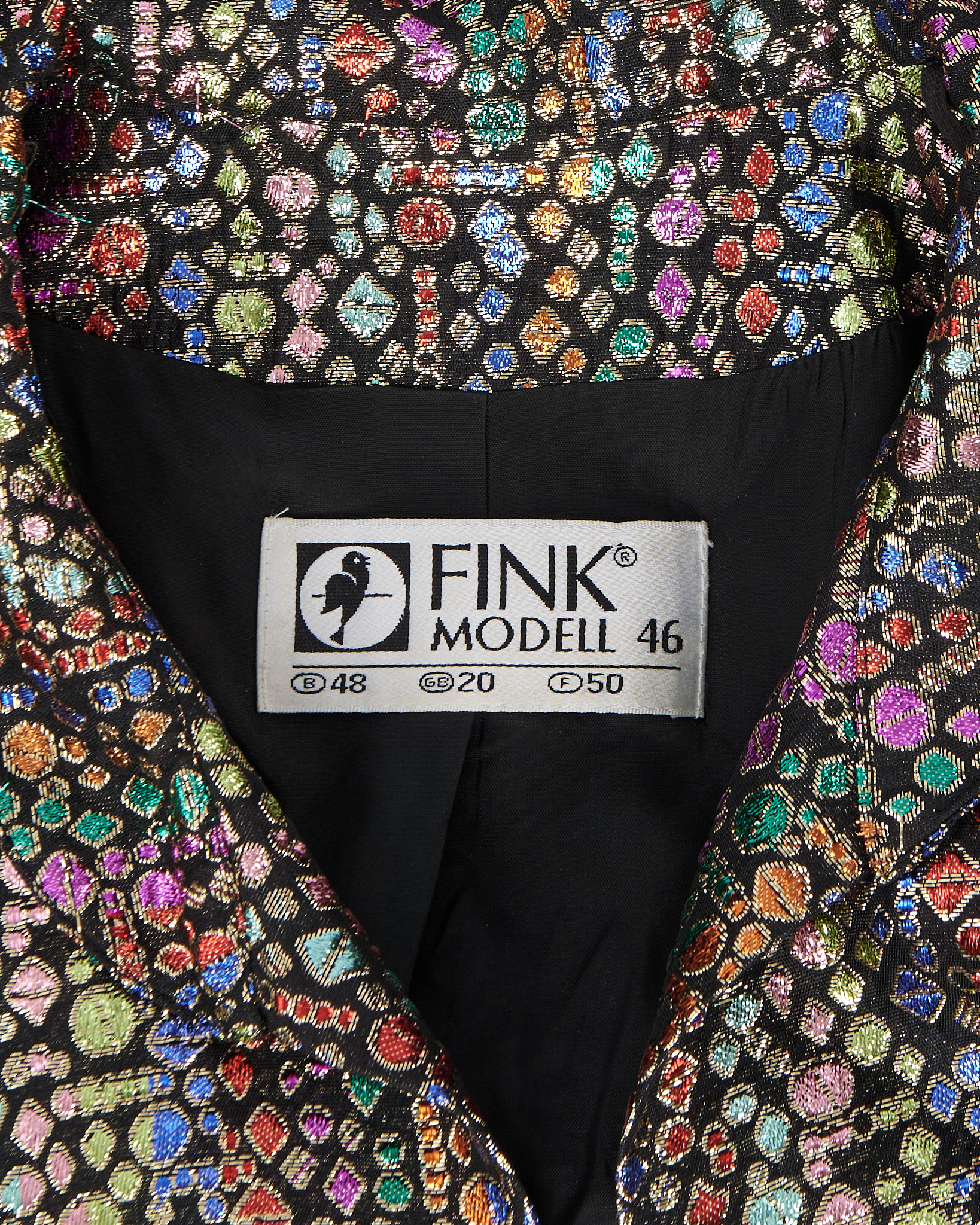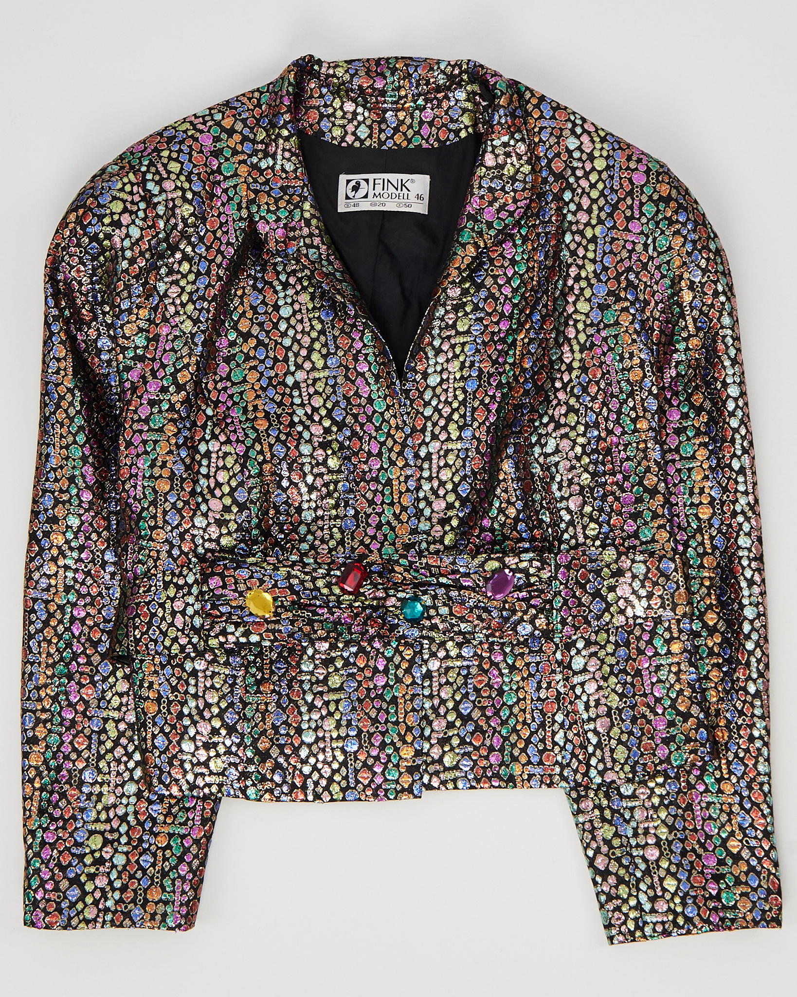 Жакет Fink с декоративным поясом. Фактурный жакет из плотной ткани с мерцающим многоцветным узором. Декоративные камни на поясе добавляют акцент. Вещь отражает характер бренда и редкое исполнение ткани.