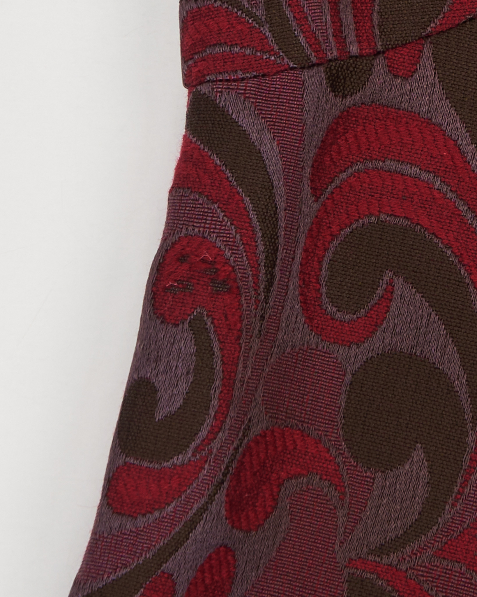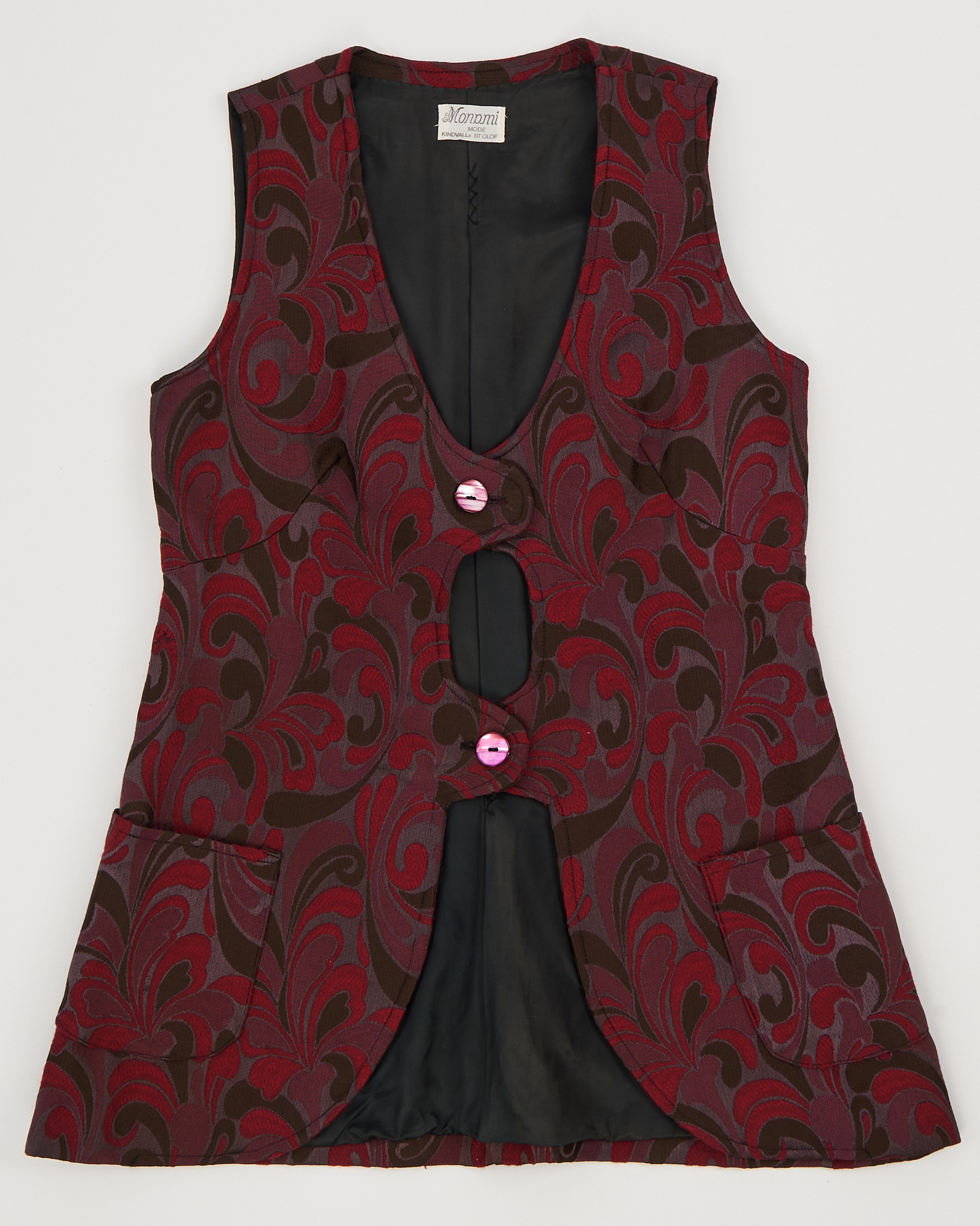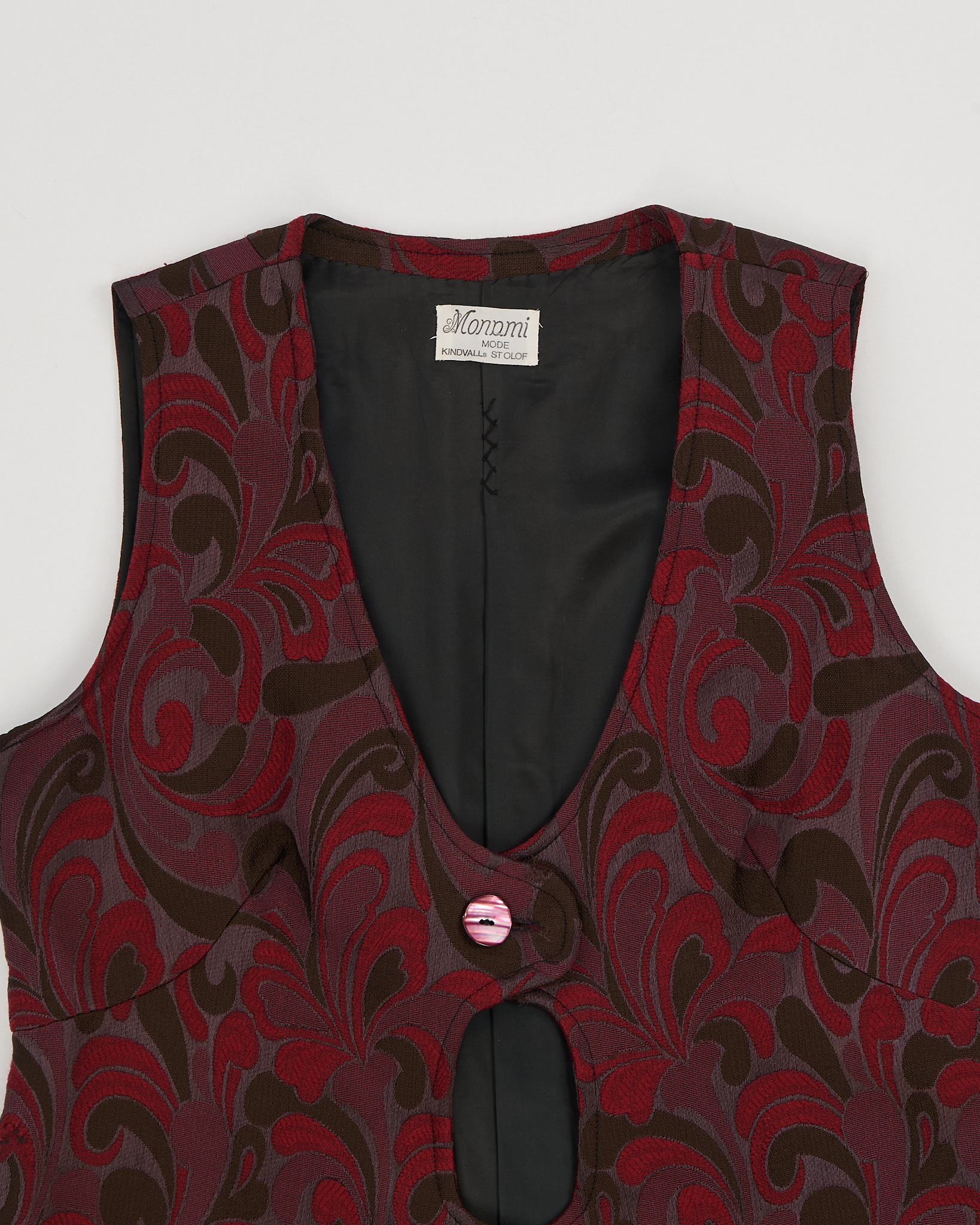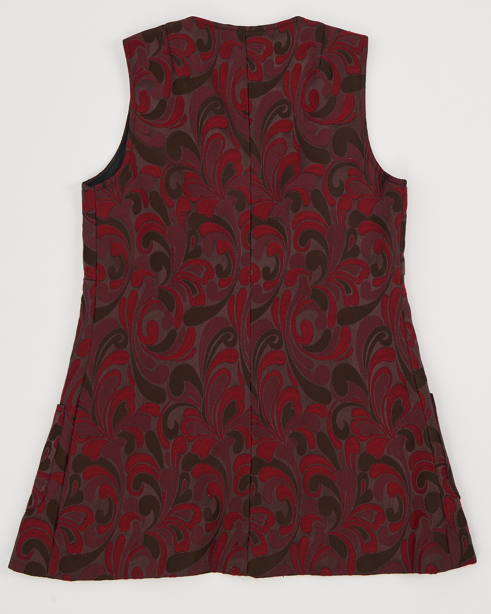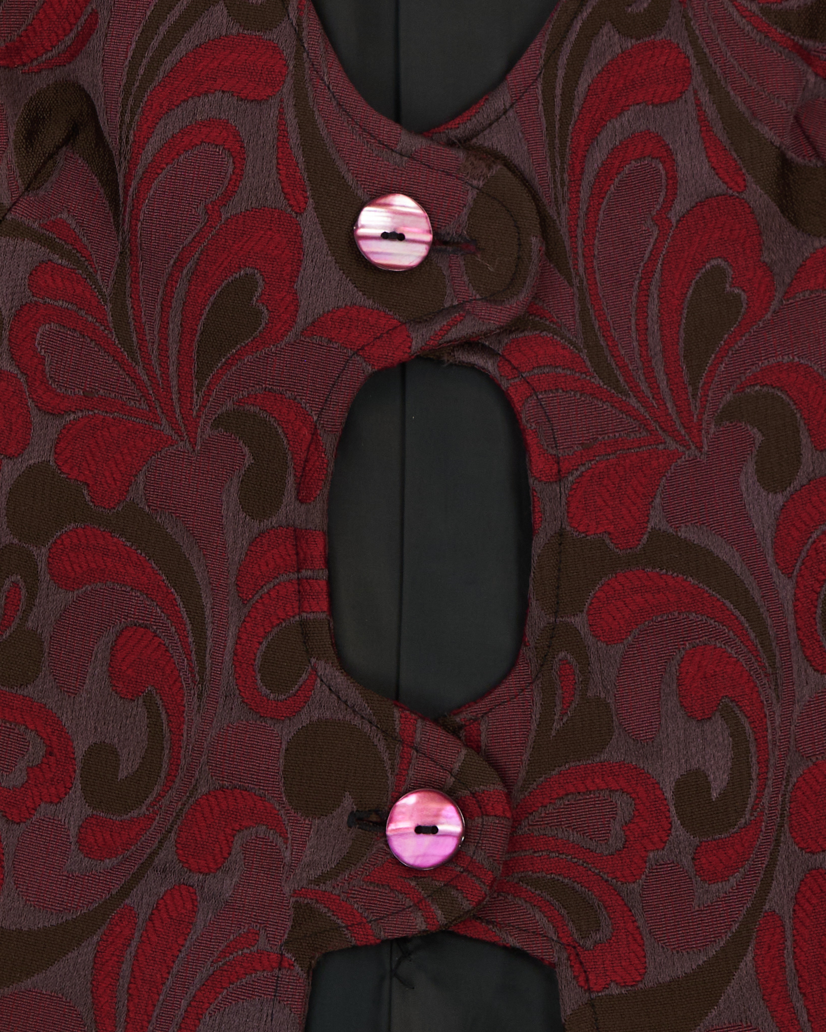 Жилет из плотной жаккардовой ткани в глубоких оттенках бордового и коричневого. Приталенный крой подчёркивает линию талии, декоративные пуговицы и фигурный вырез.