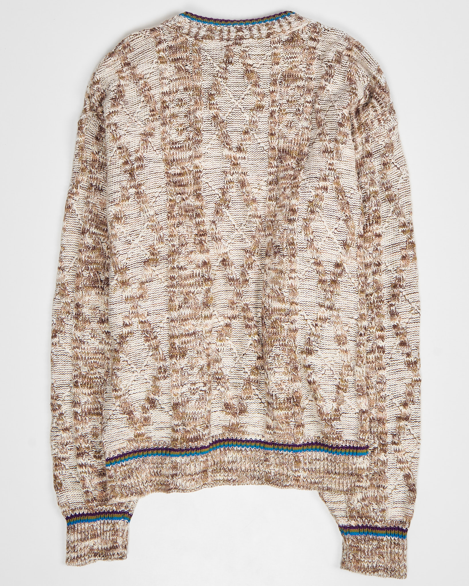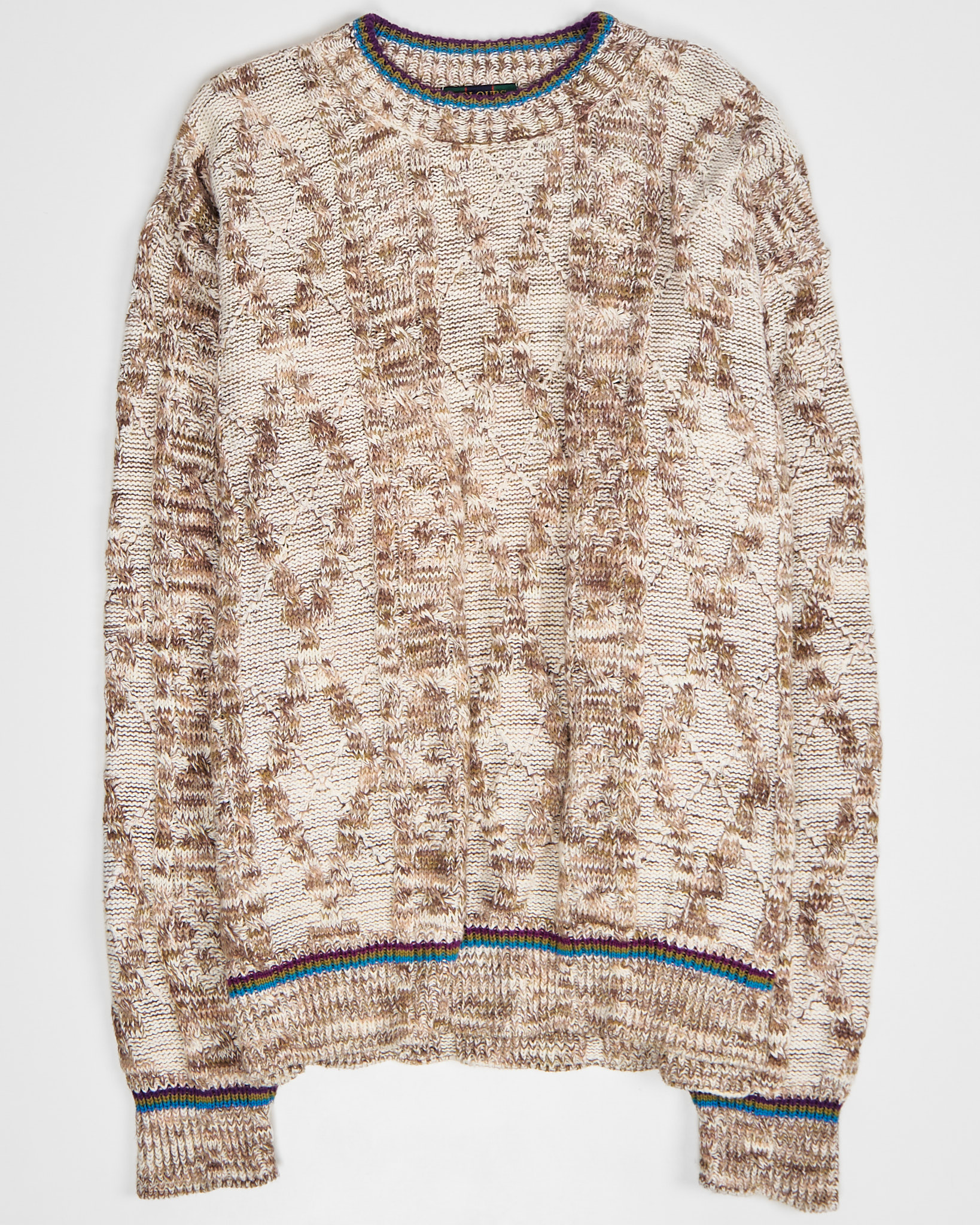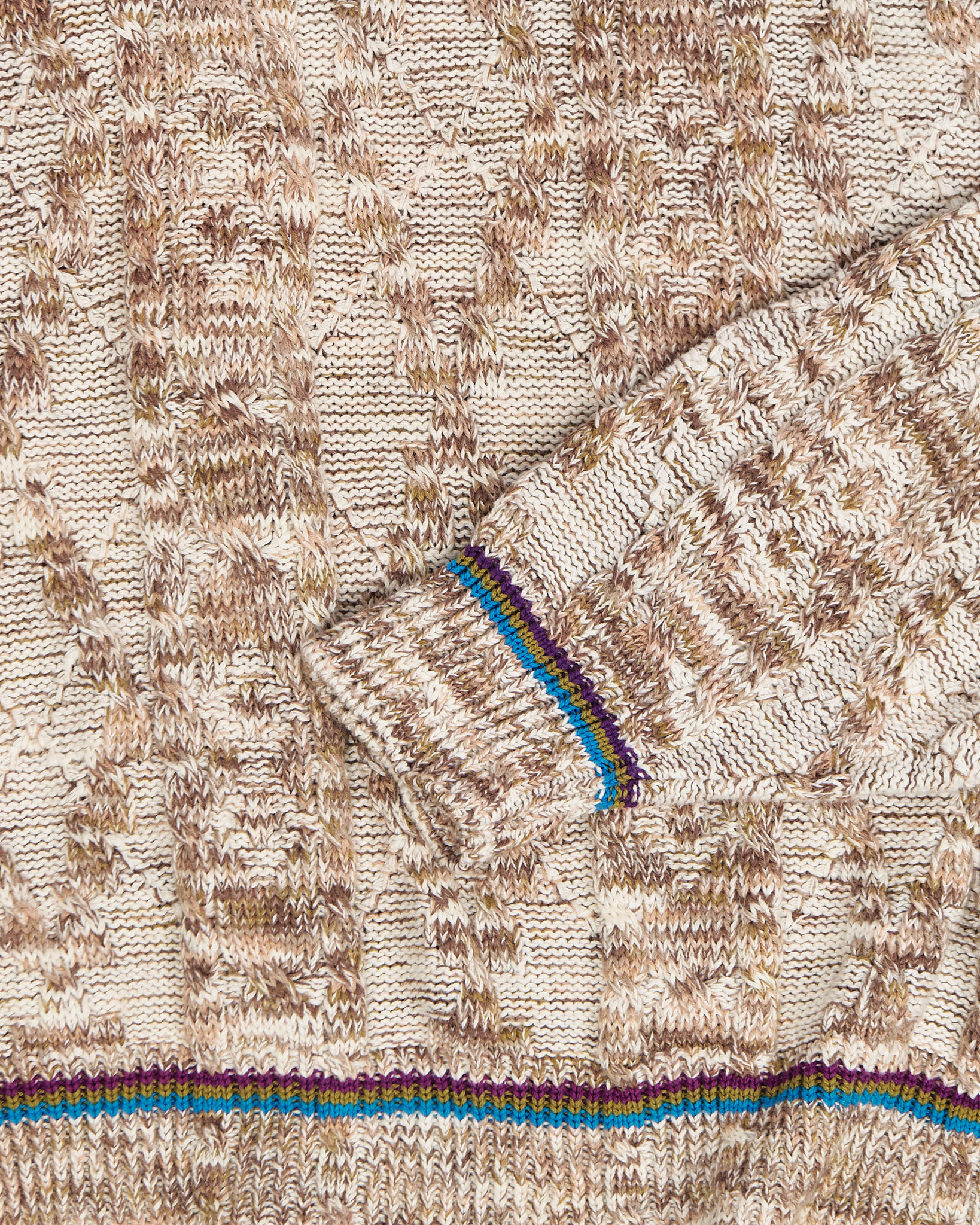 Объёмная посадка, расслабленный силуэт. Контрастная отделка горловины и манжет, сложный рисунок.