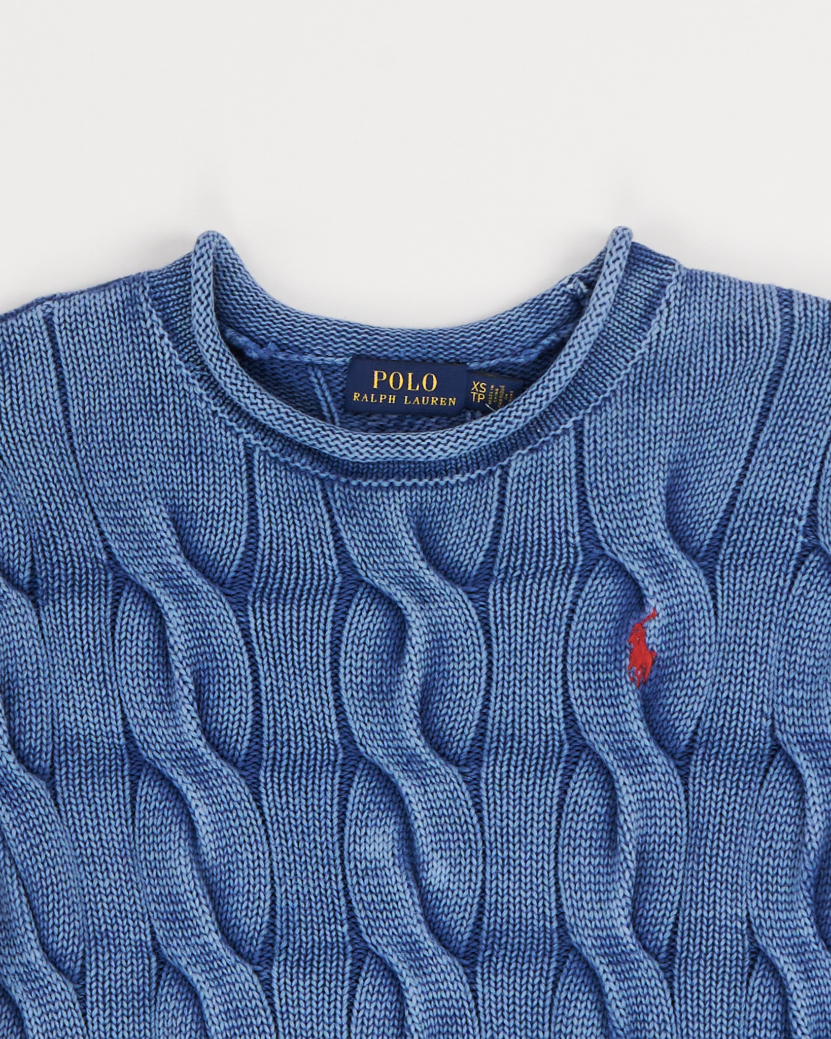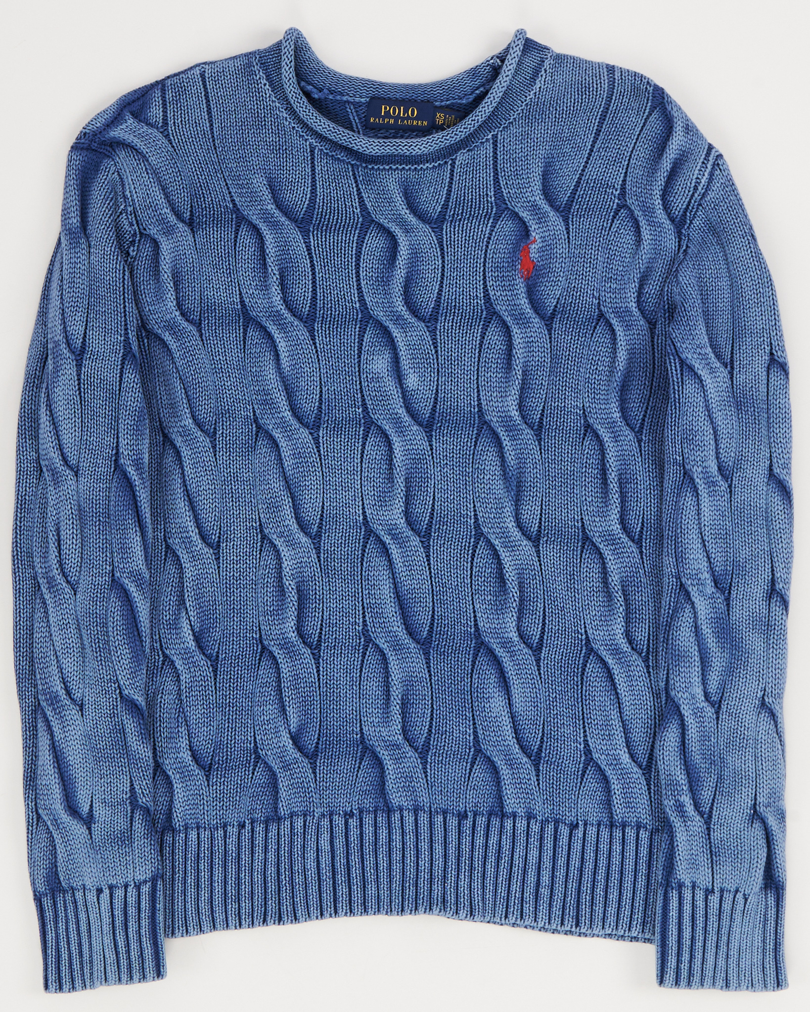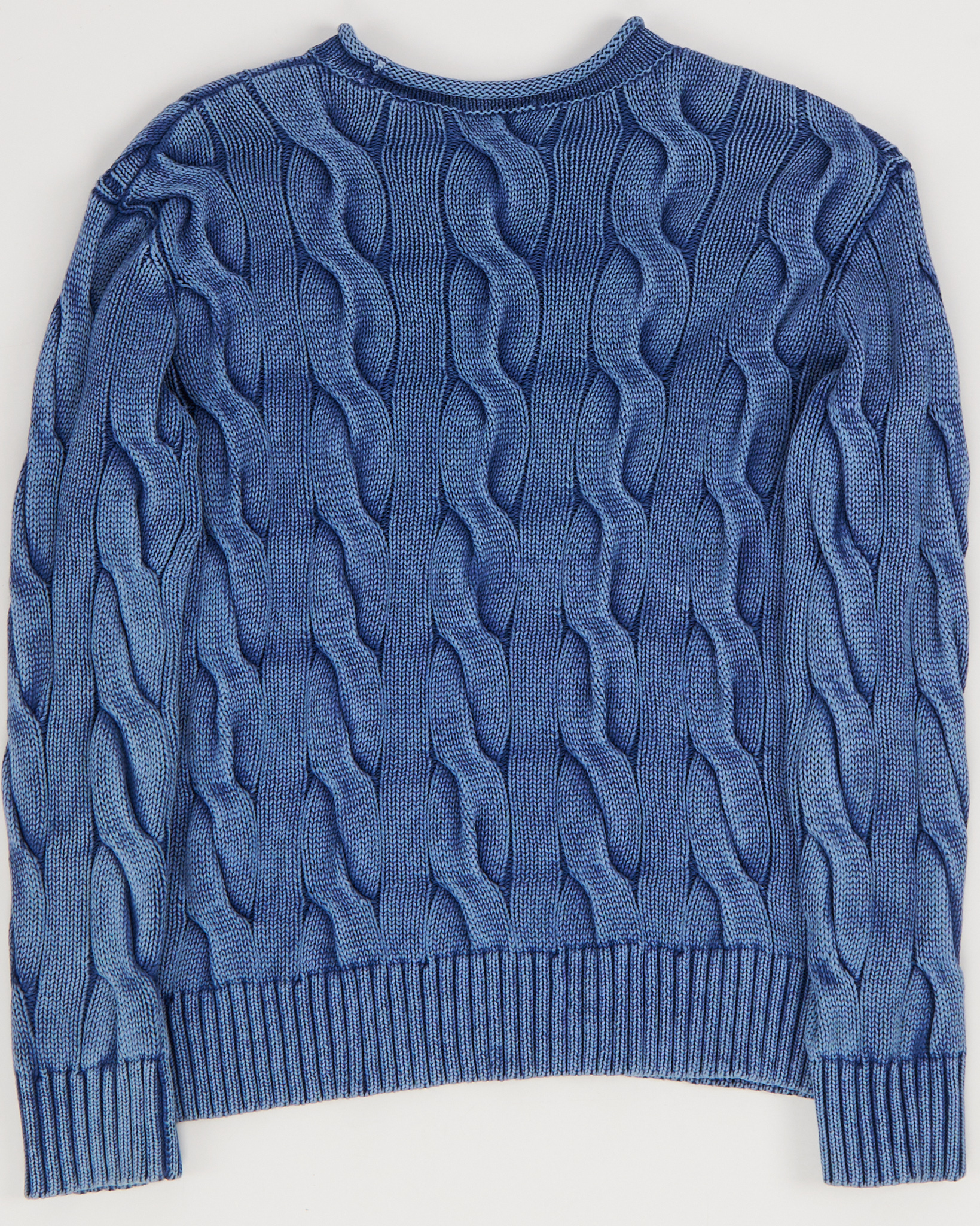 Свитер Polo Ralph Lauren из 100% хлопка голубого оттенка. Материал мягкий и приятный на ощупь, вязка с крупными косами. Посадка по фигуре, плотная резинка на манжетах и по низу. На груди расположен фирменный логотип бренда.