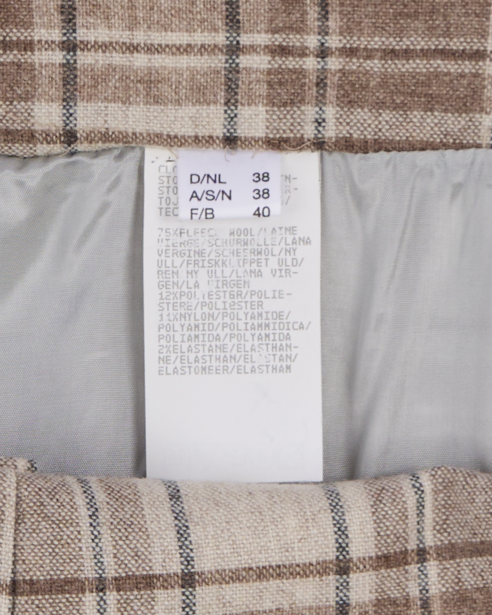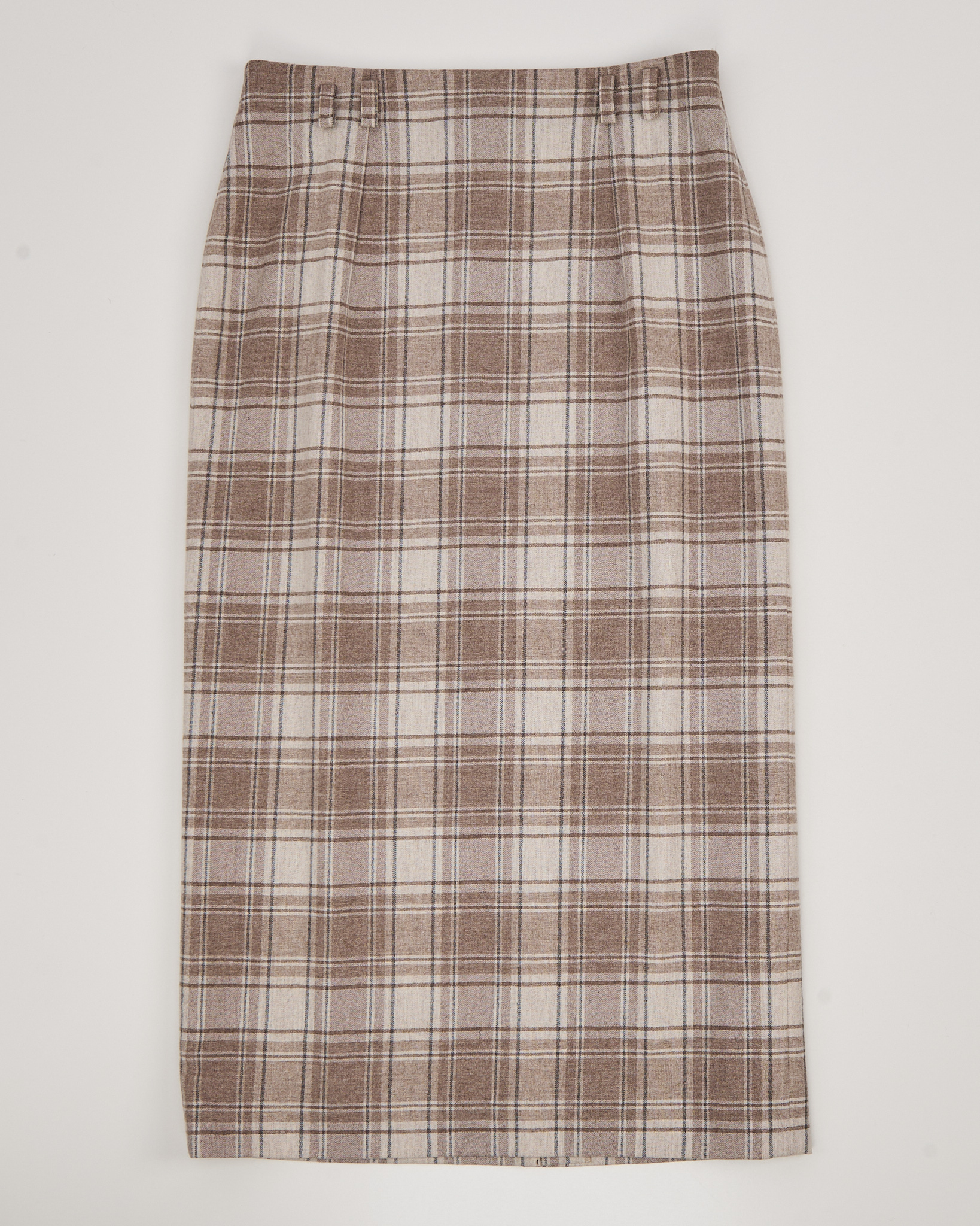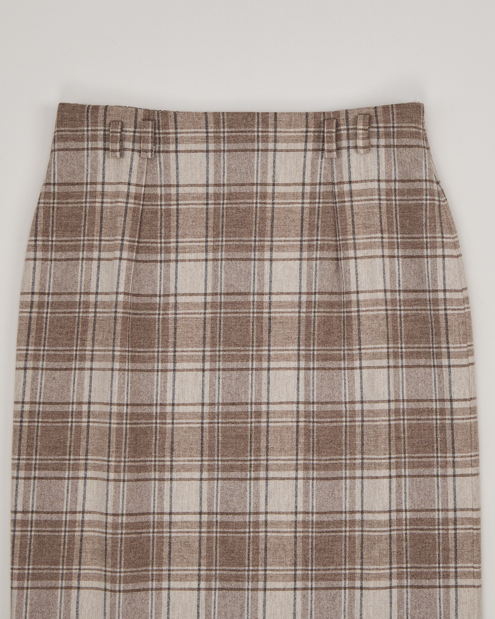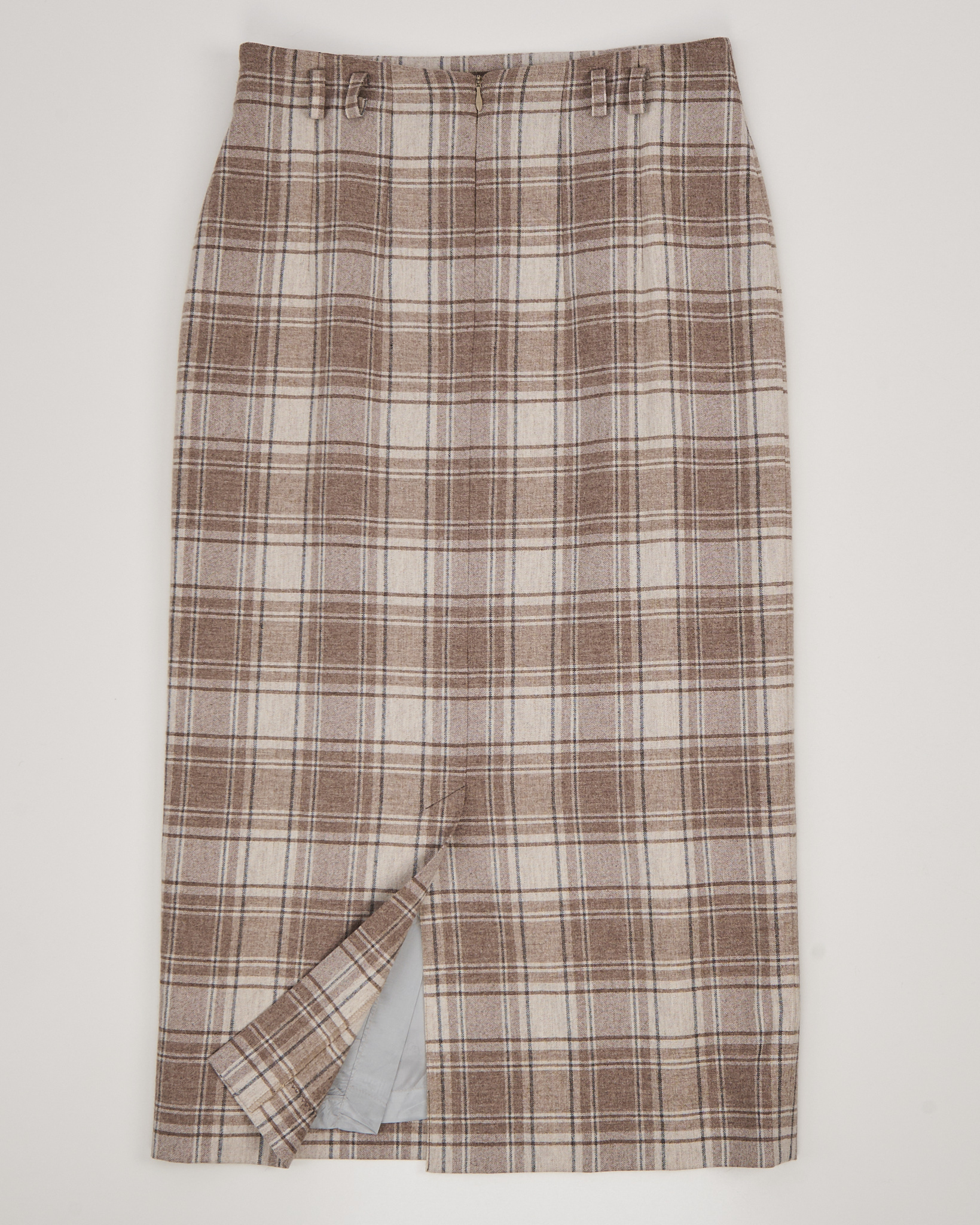 Юбка из шерстяной ткани в бежево-коричневой клетке. Форма-каранадаш с чёткой посадкой по линии талии и бёдер. Сзади акцентный разрез.