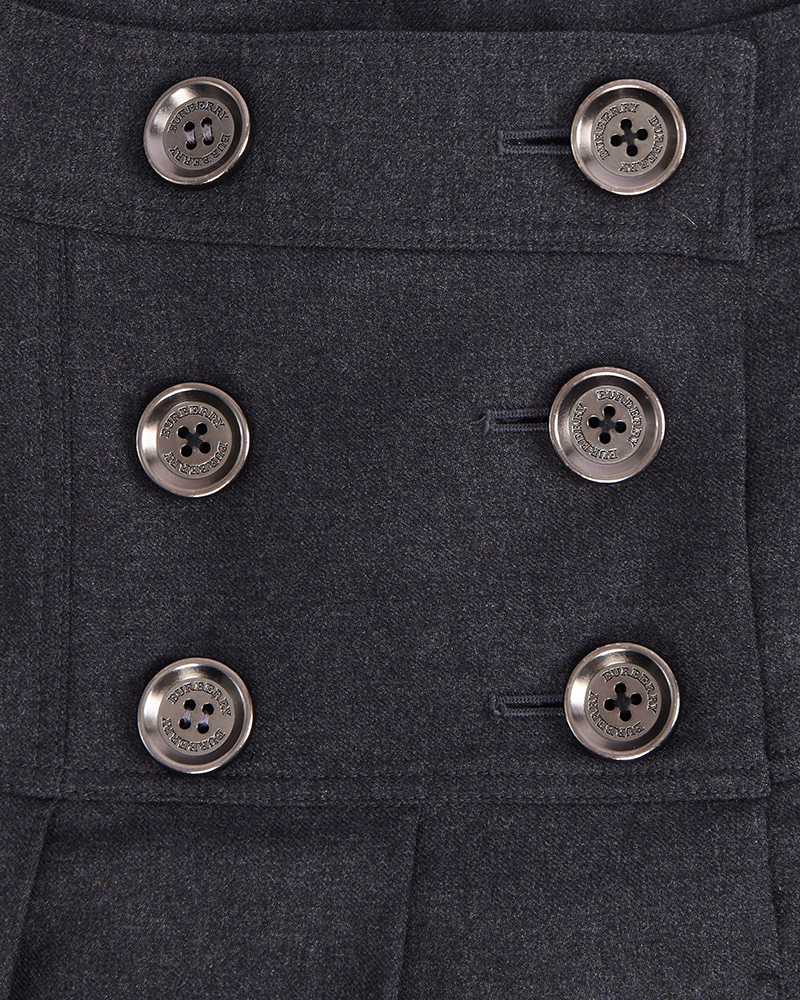 Юбка Burberry выполнена из 100% натуральной шерсти. Трапециевидный крой с глубокими складками спереди. Двубортная застежка с брендированными пуговицами