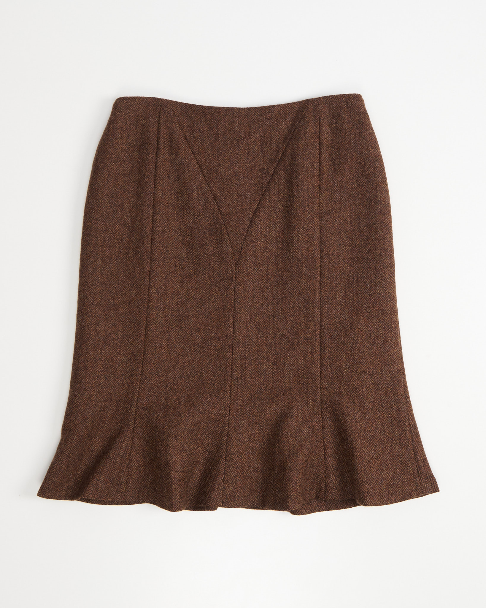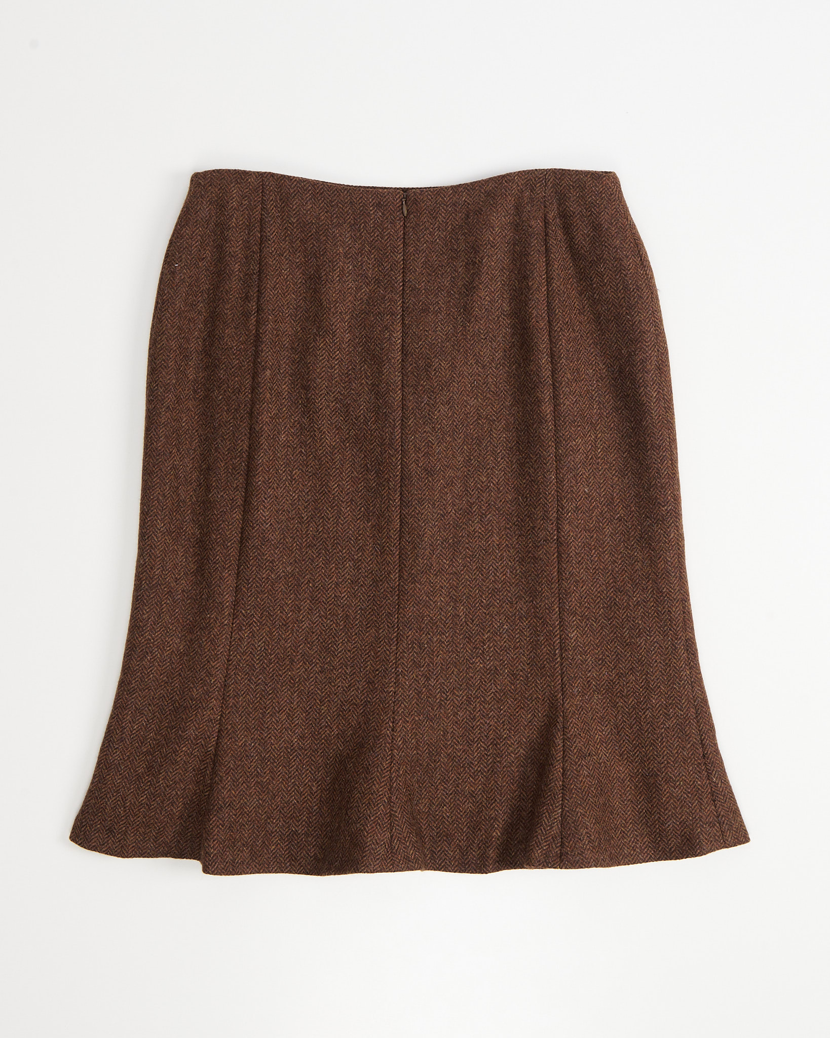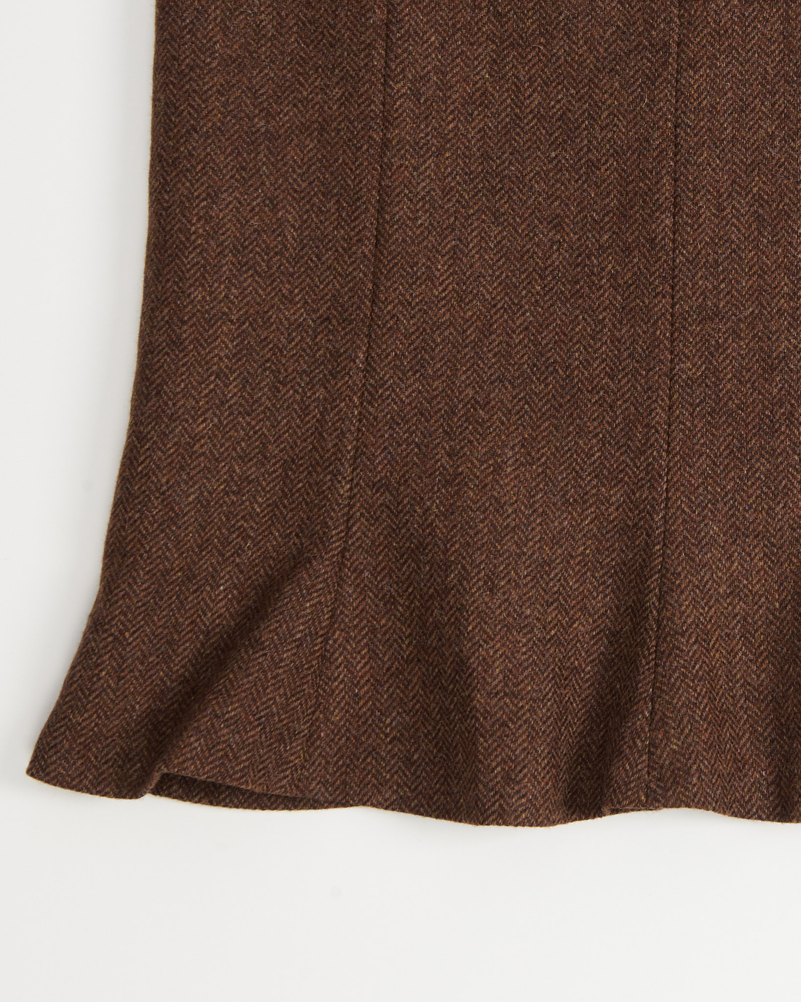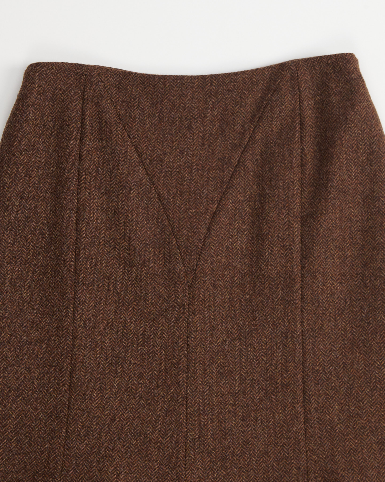 Юбка выполнена из плотной шерсти в глубоких коричневых оттенках. Посадка аккуратная по линии талии, силуэт мягко расширяется к низу и создает ровное, спокойное движение при ходьбе. Конструктивные швы формируют чистую линию и подчеркивают архитектуру кроя.