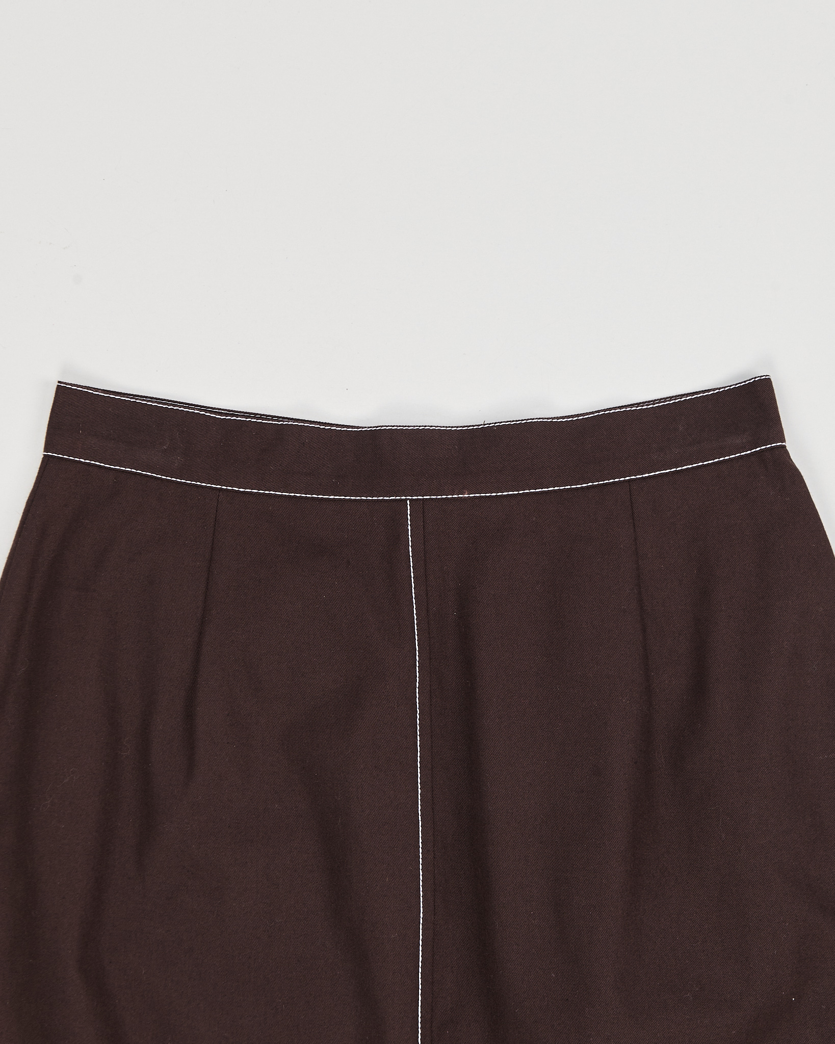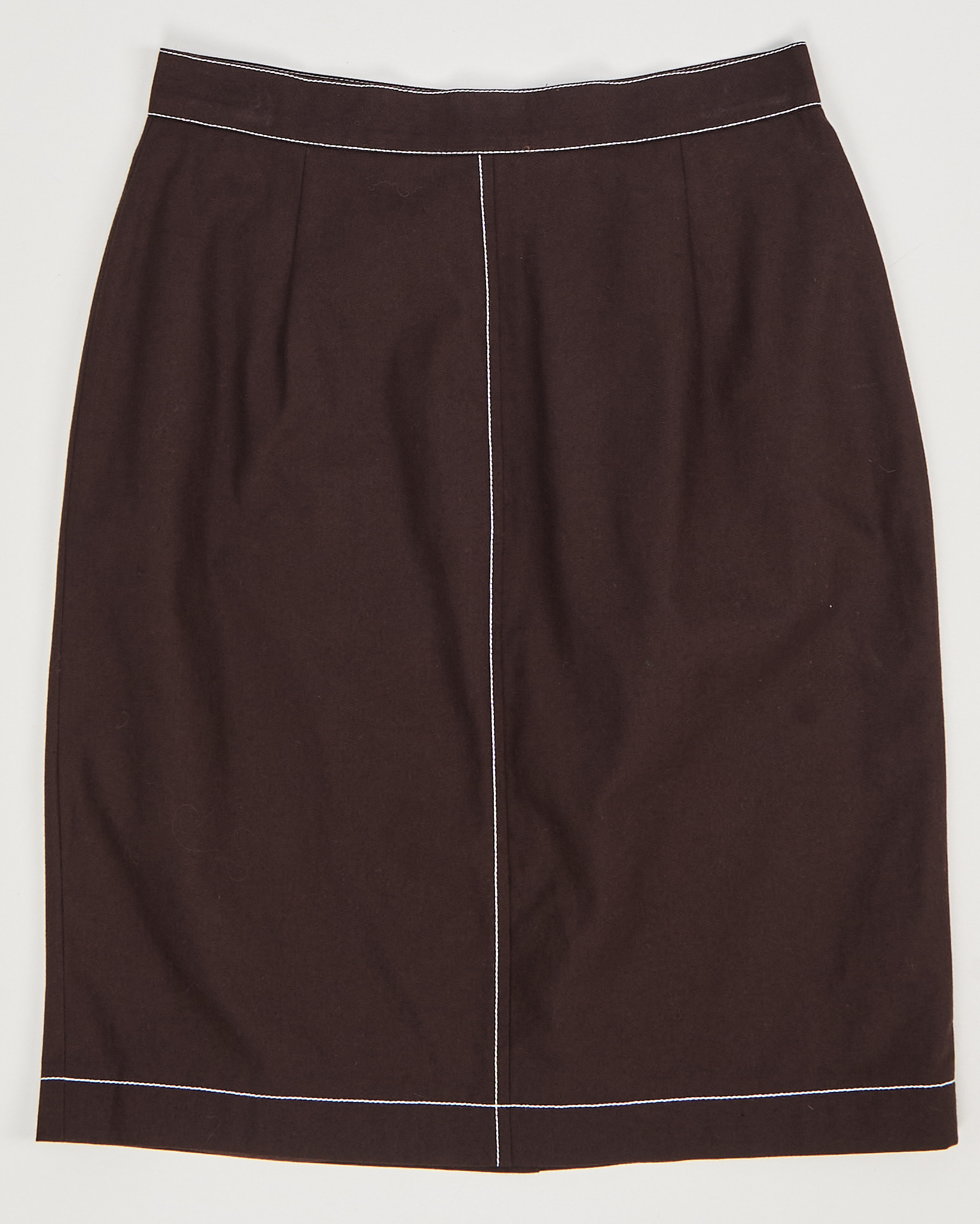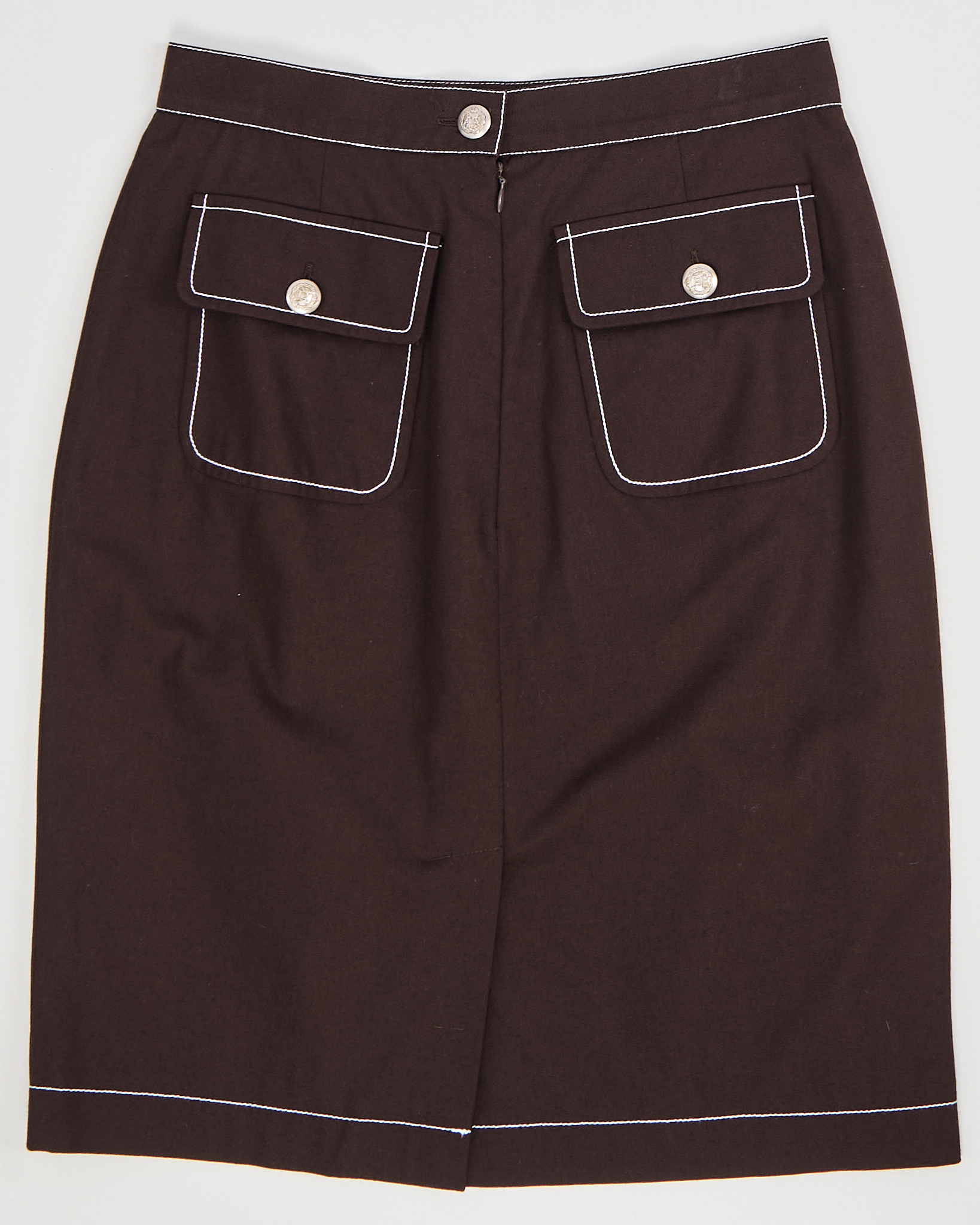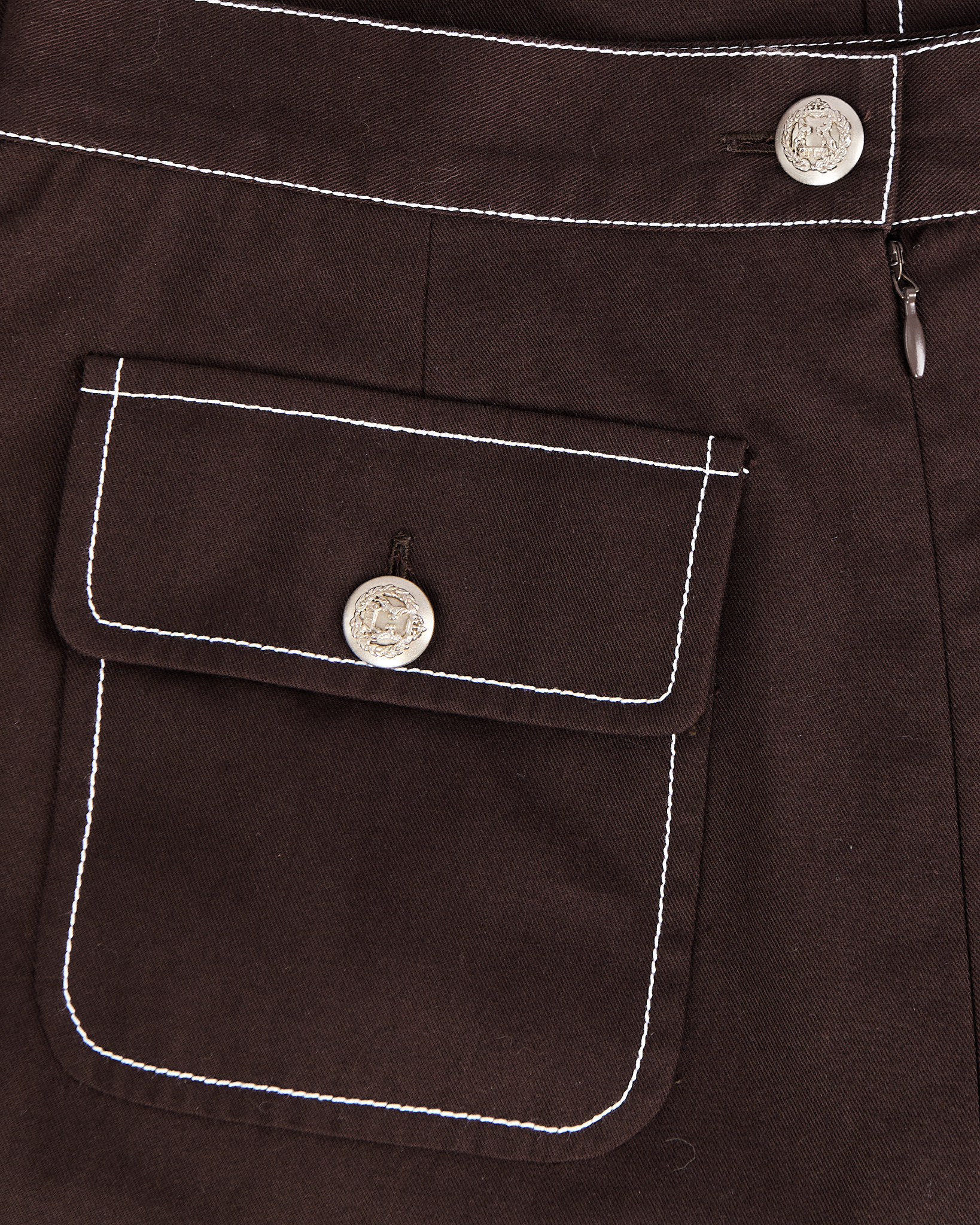 Юбка из 100% хлопка с подкладкой из вискозы. Украшена контрастной белой отстрочкой и декоративными металлическими пуговицами. Акцент на карманах с клапанами и чёткой геометрии.