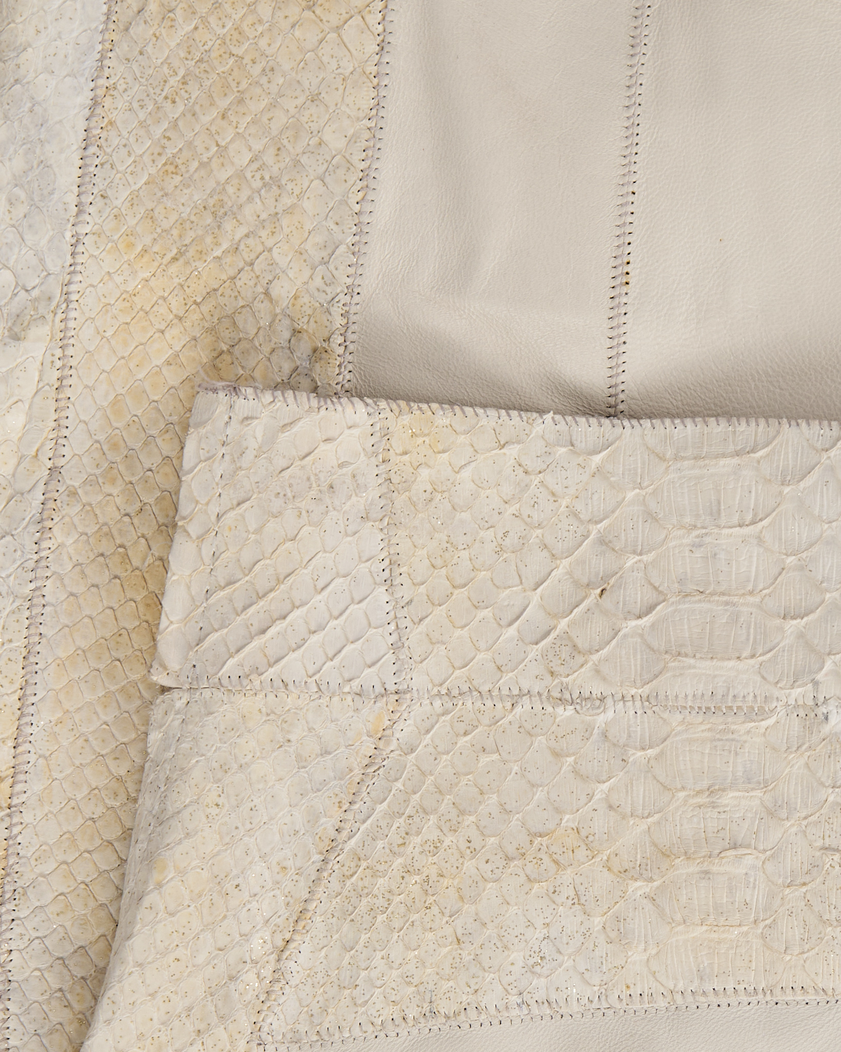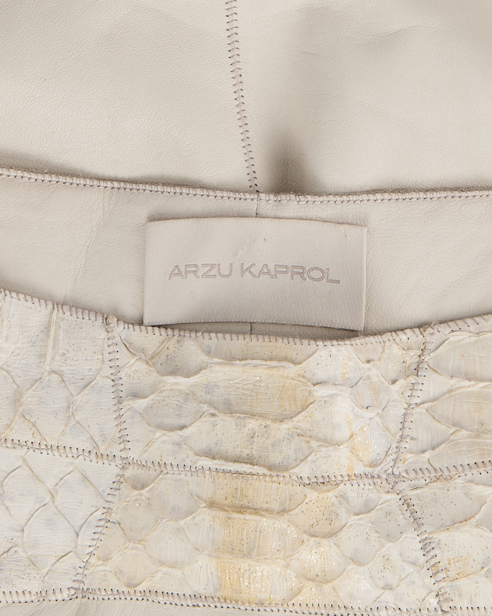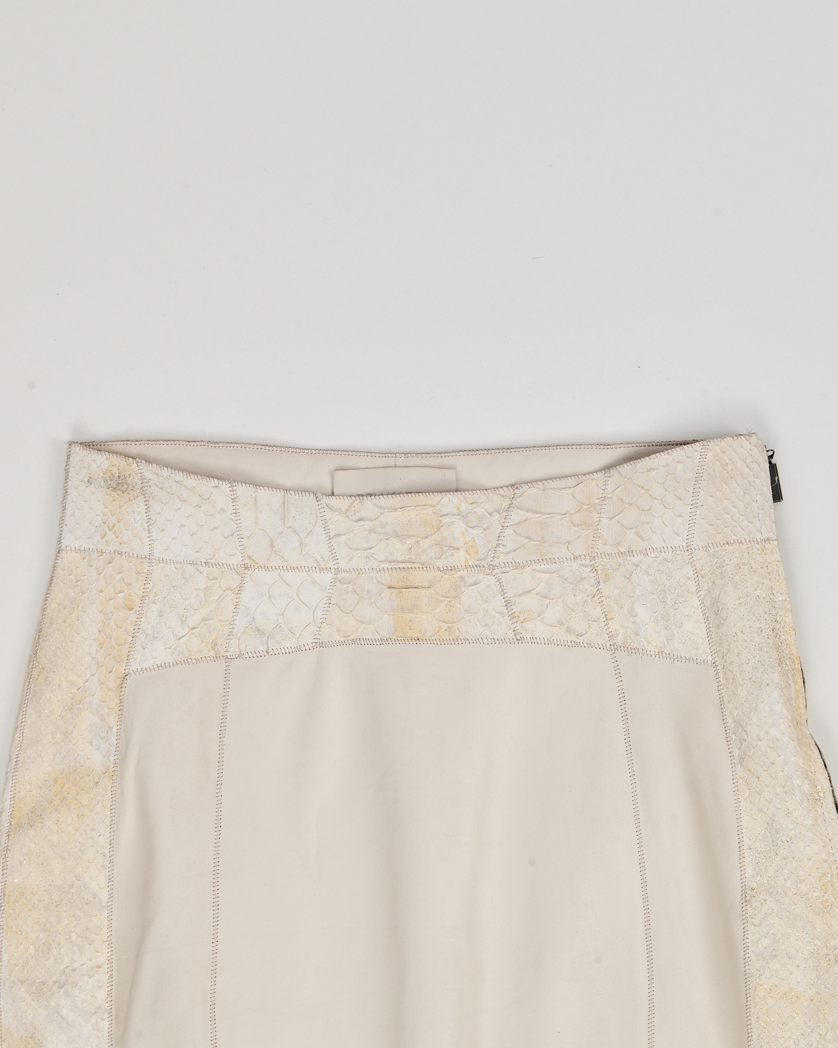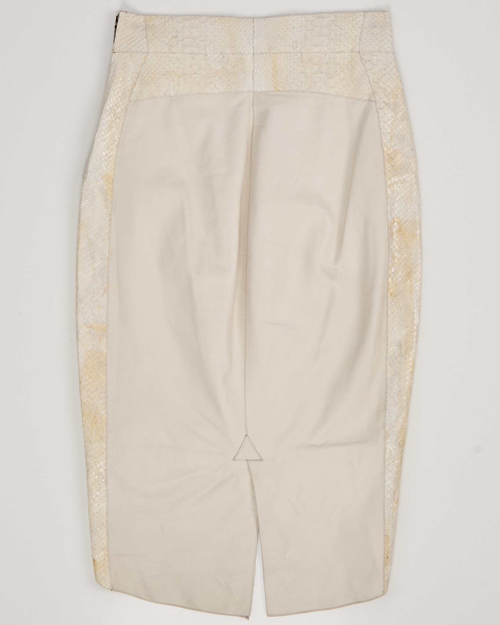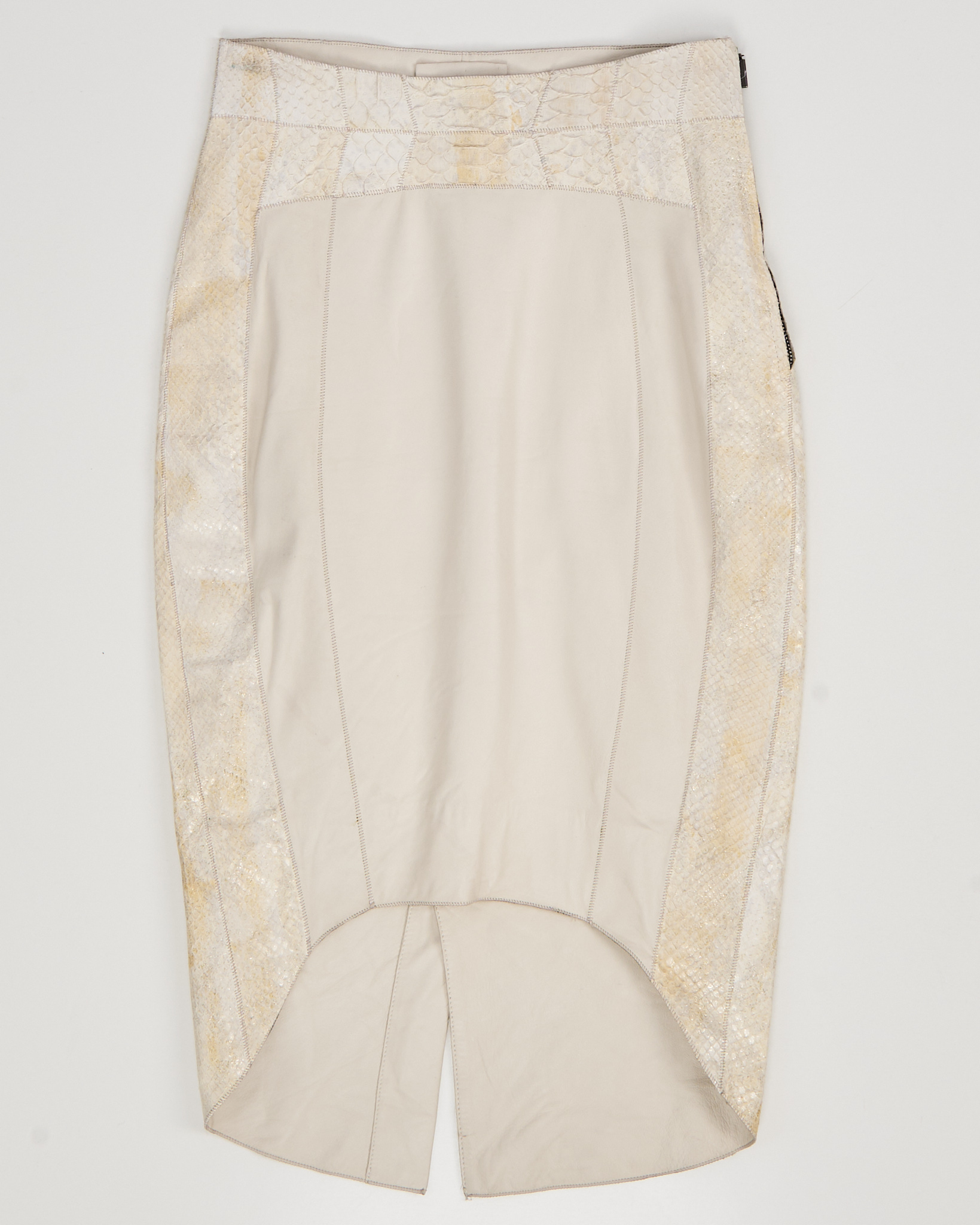 Юбка из 100% натуральной кожи кремового оттенка с контрастными фактурными вставками под рептилию. Материал плотный и гладкий в центральной части, боковые панели имеют рельефную поверхность с выраженным рисунком. Посадка высокая, ассиметричный силуэт, линия низа с разрезом.