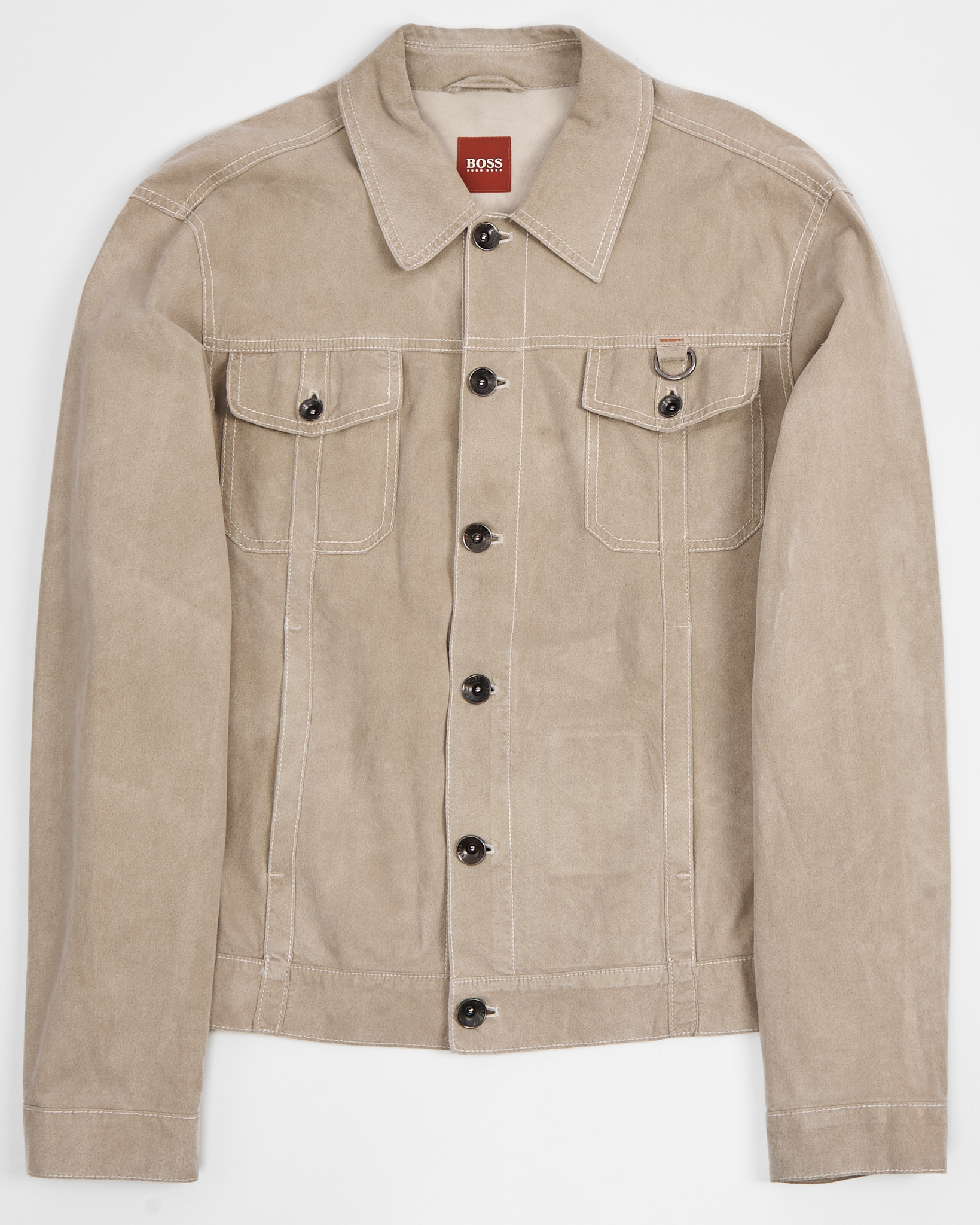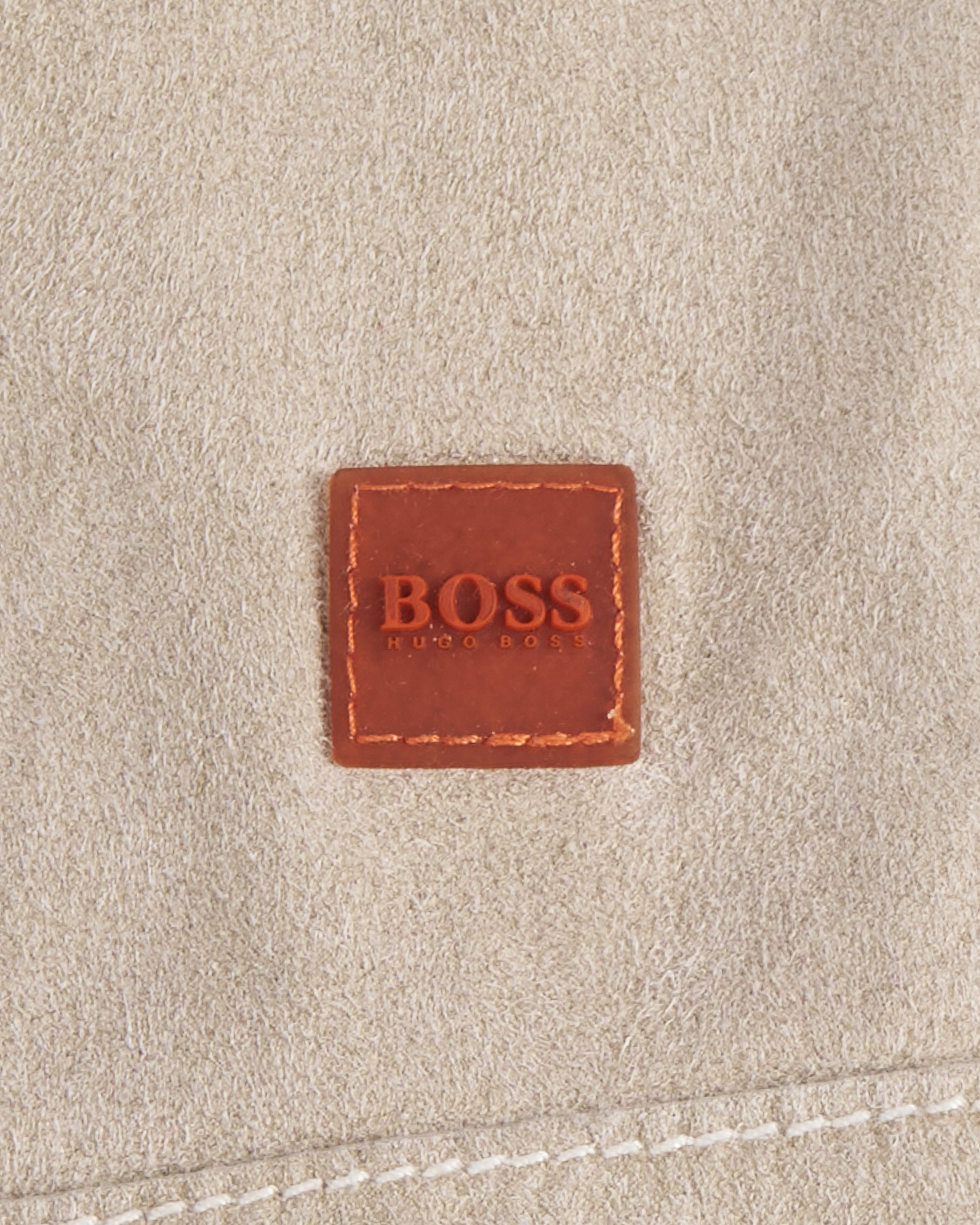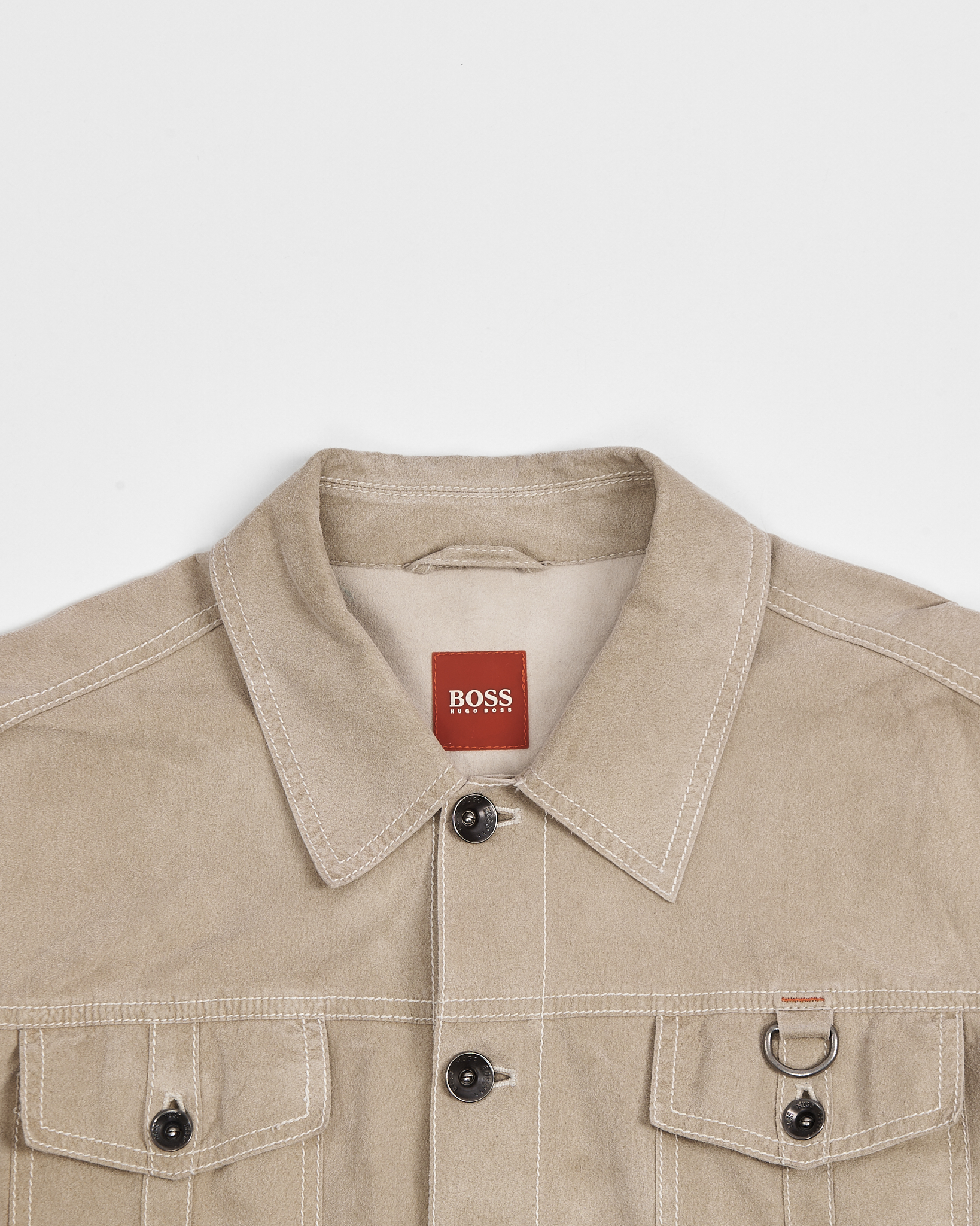 Винтажная куртка Hugo Boss. Куртка из натуральной замши светлого бежевого оттенка с контрастной прострочкой и фирменной фурнитурой. Посадка прямая и собранная, длина комфортная. Функциональные нагрудные карманы.